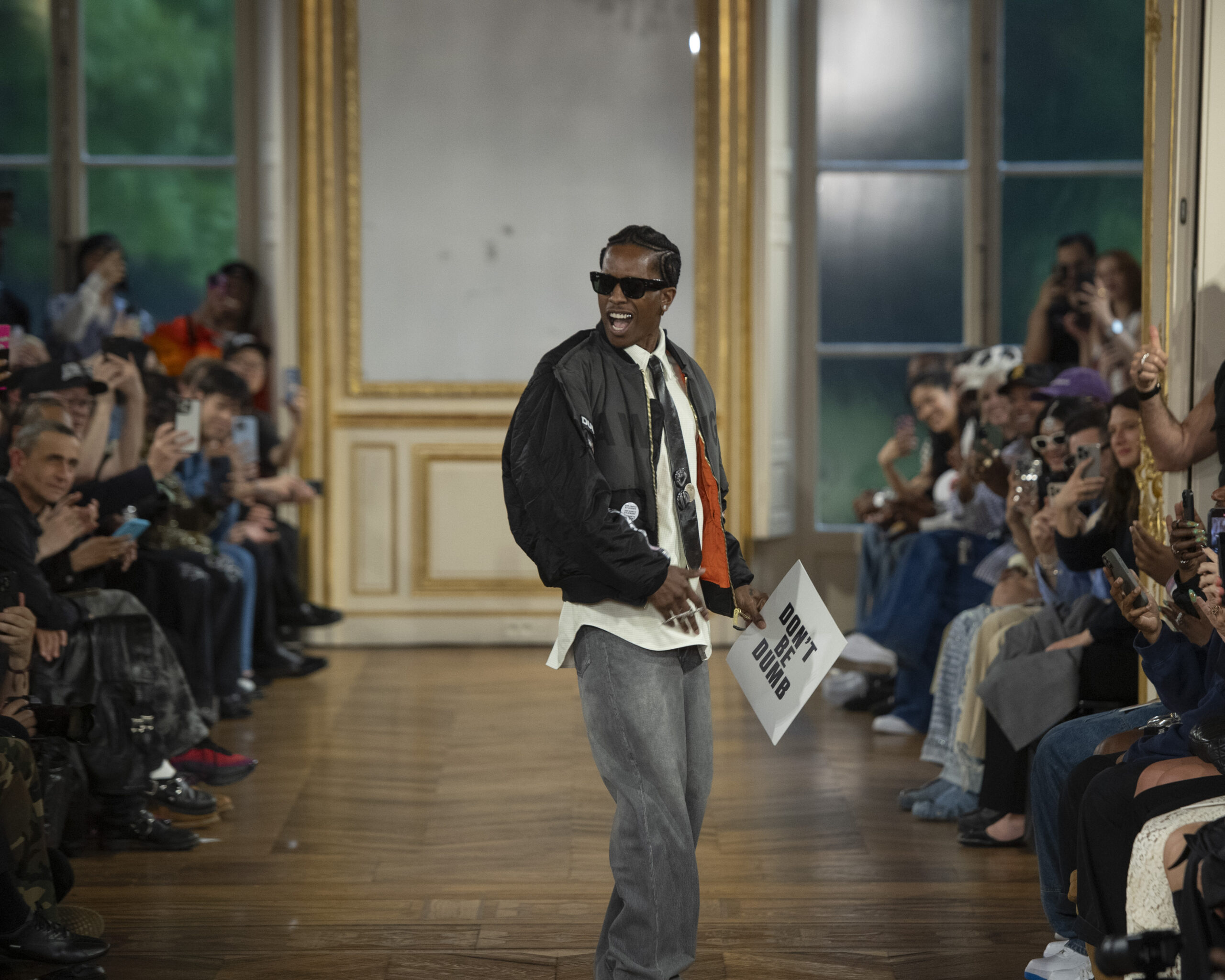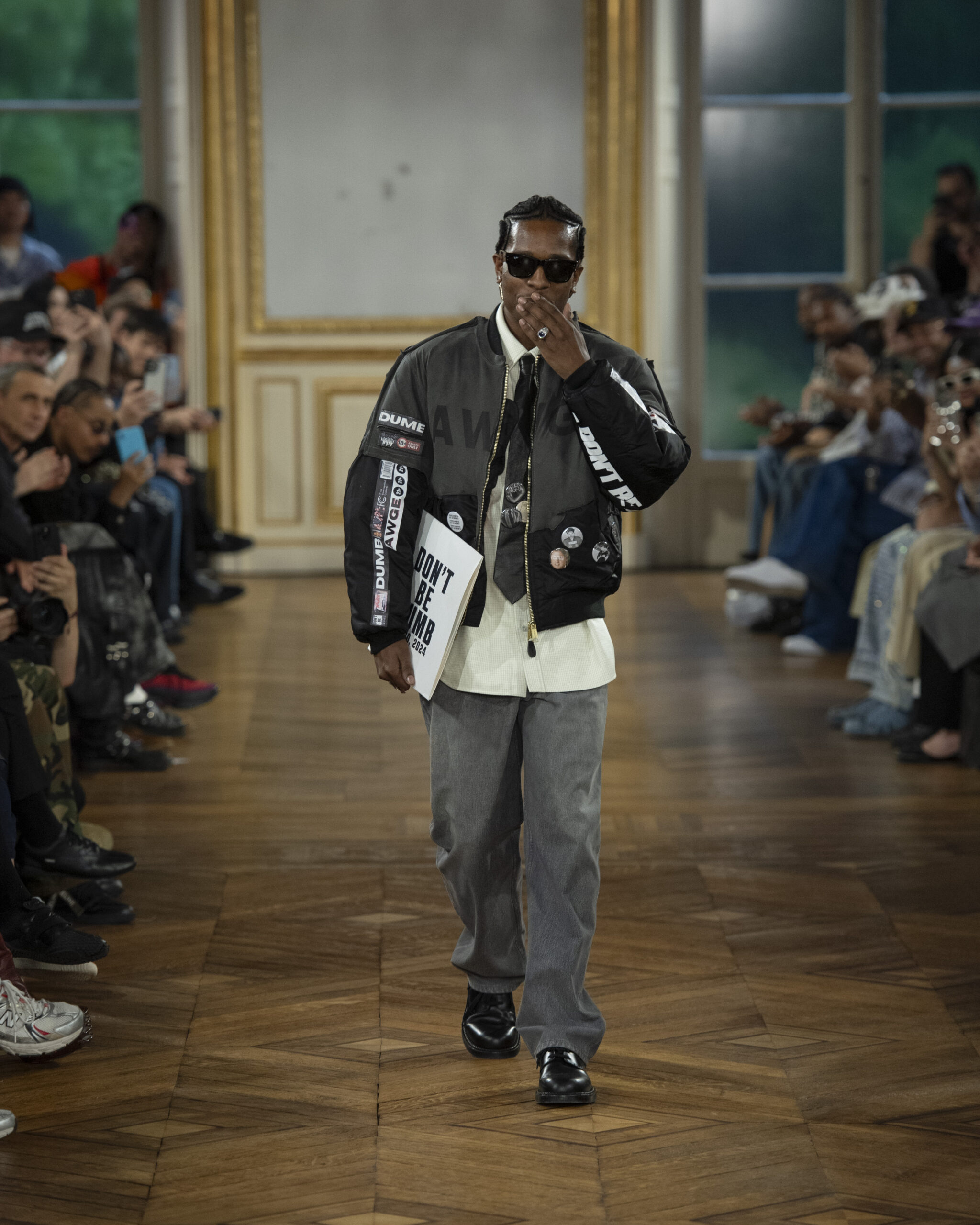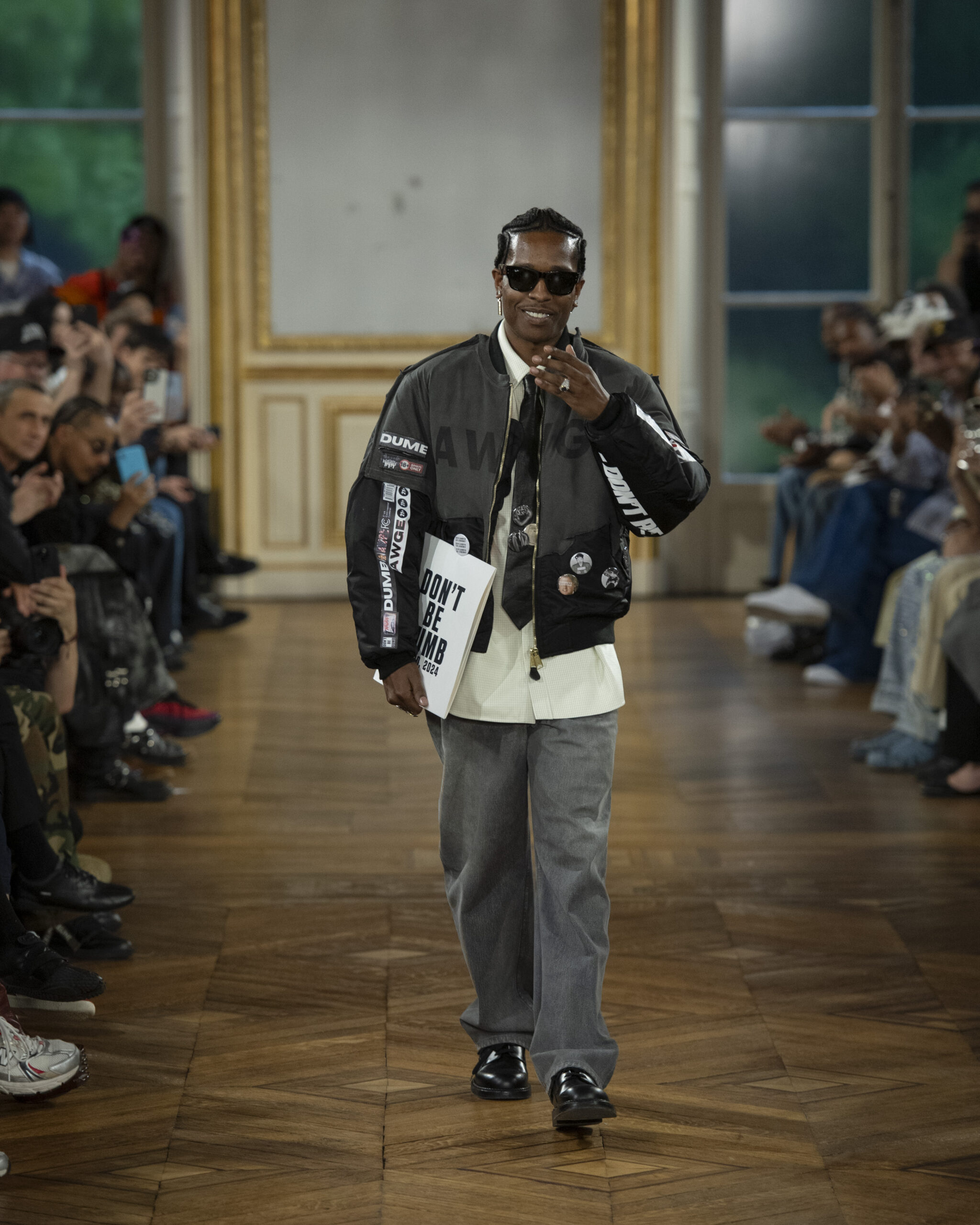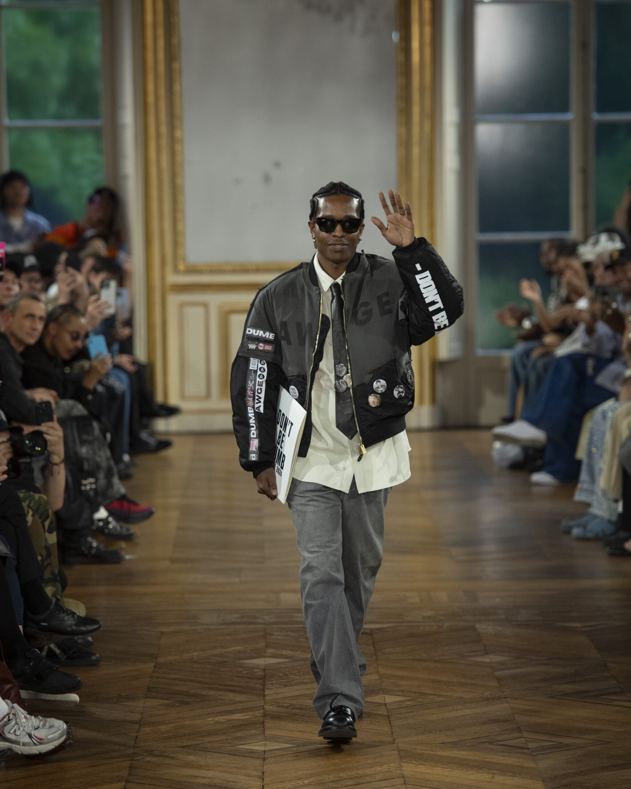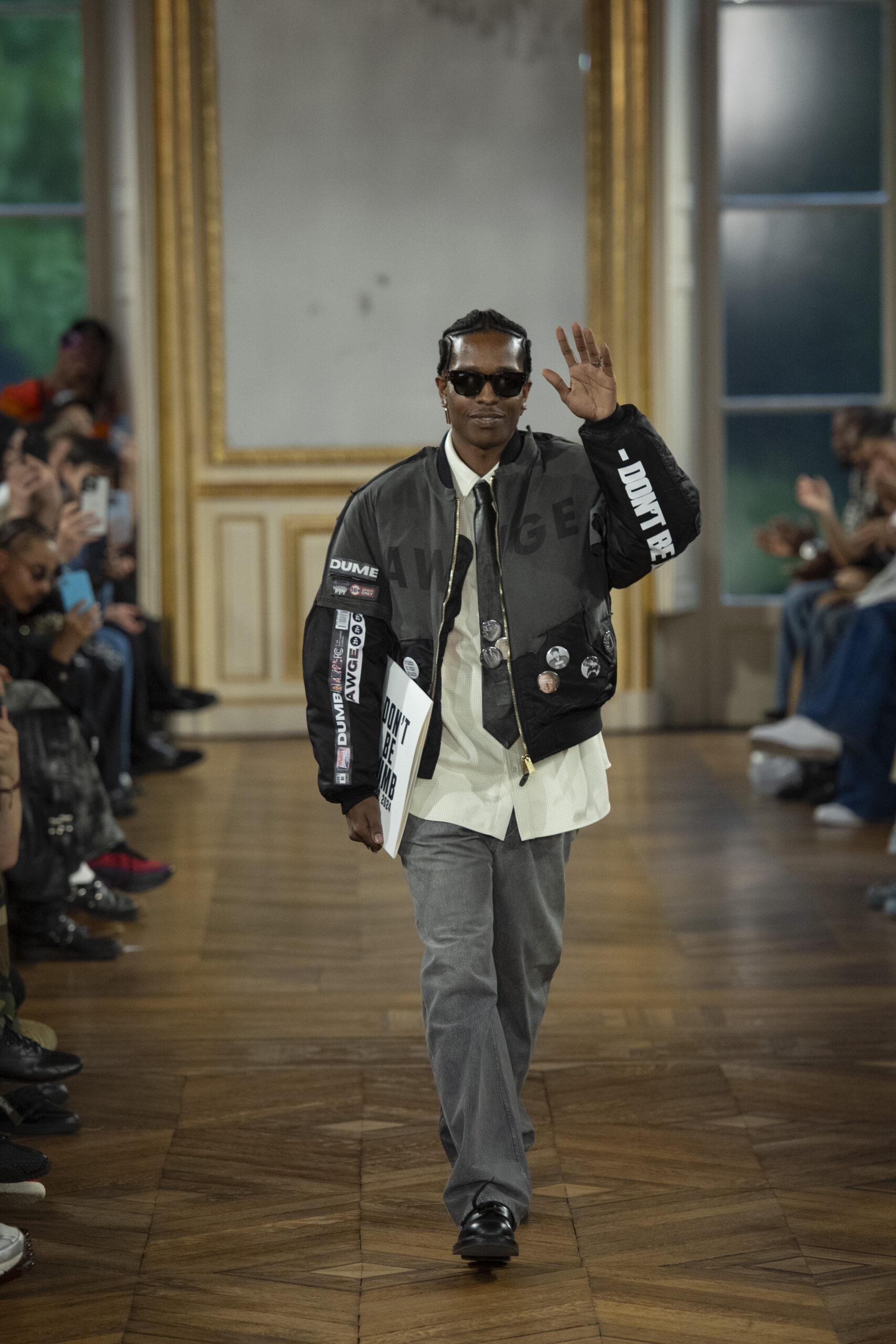Le décor du défilé, comprenant des sacs poubelles transformés en chaises beanbag issues de la marque de mobilier Hommemade, en collaboration avec Crosby Studios, ajoutait une dimension immersive à cette expérience unique. Le défilé a été rythmé par la bande-son du prochain album d’A$AP Rocky, créant une synergie entre mode et musique.