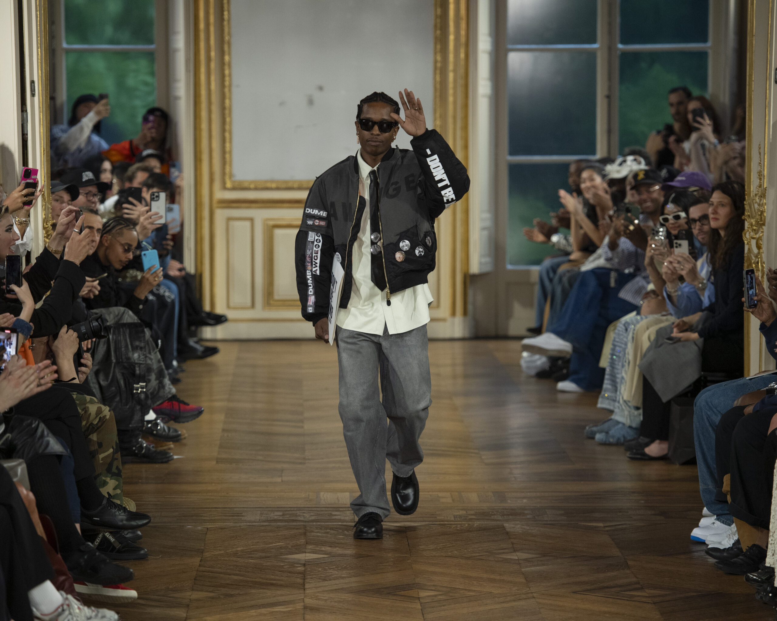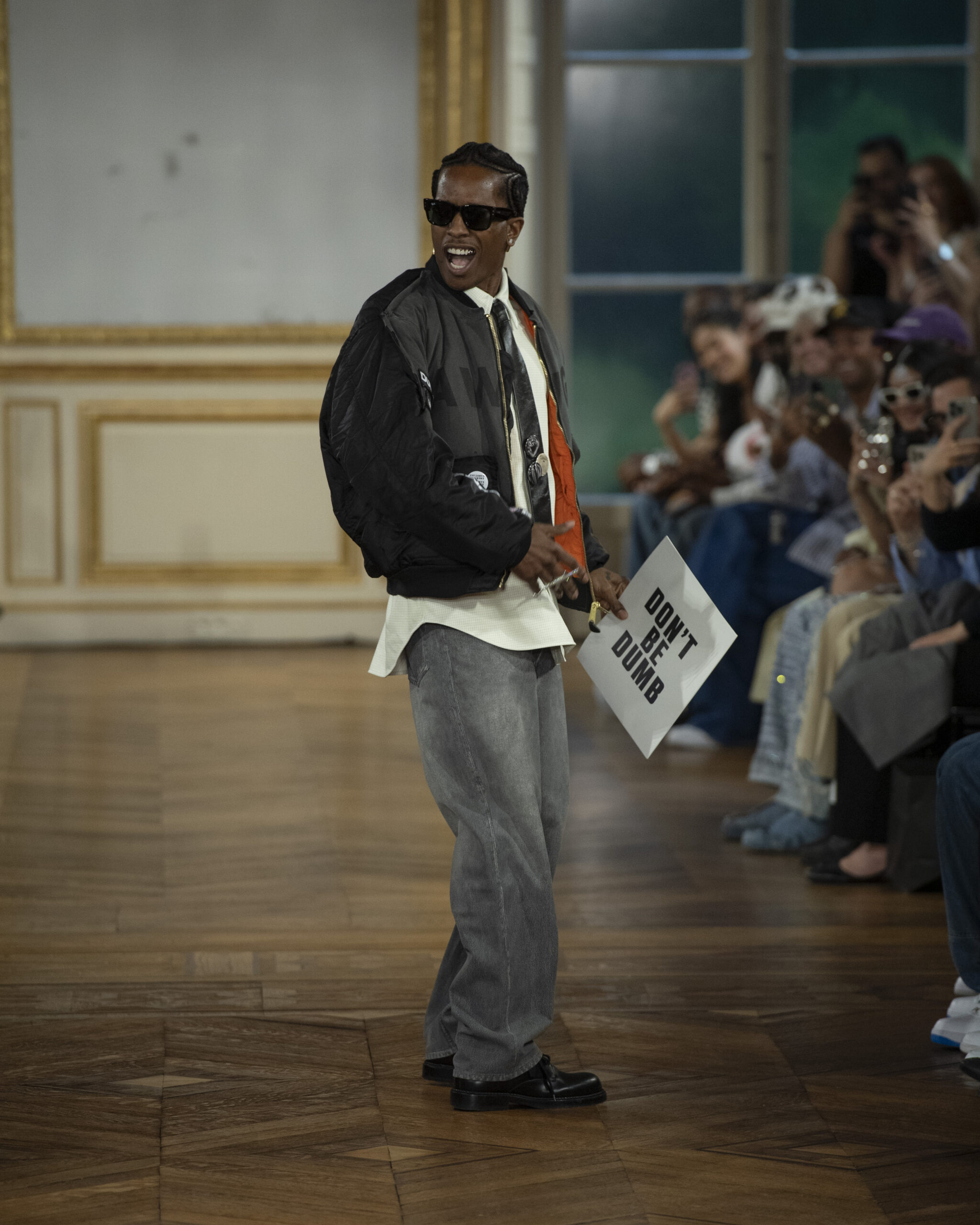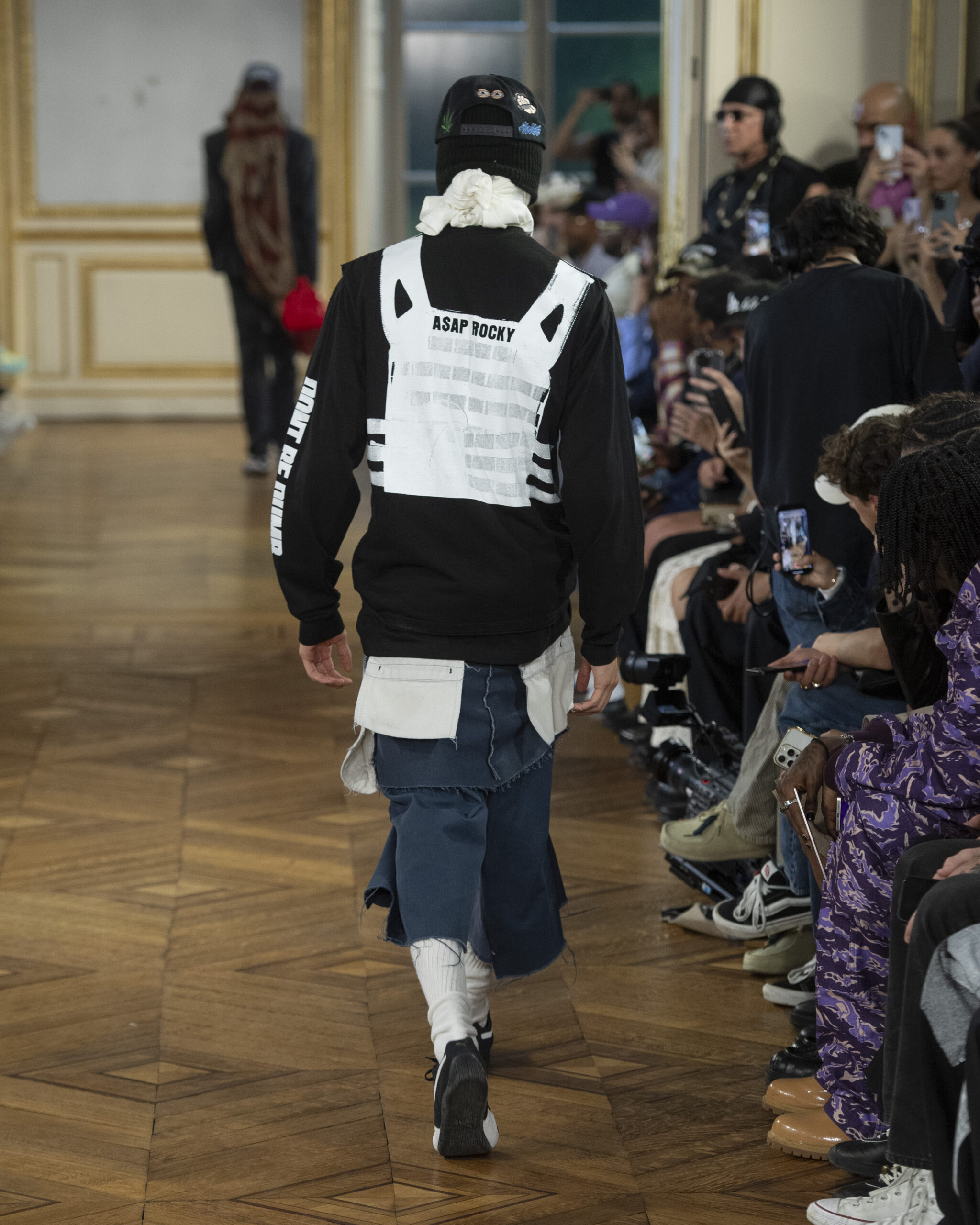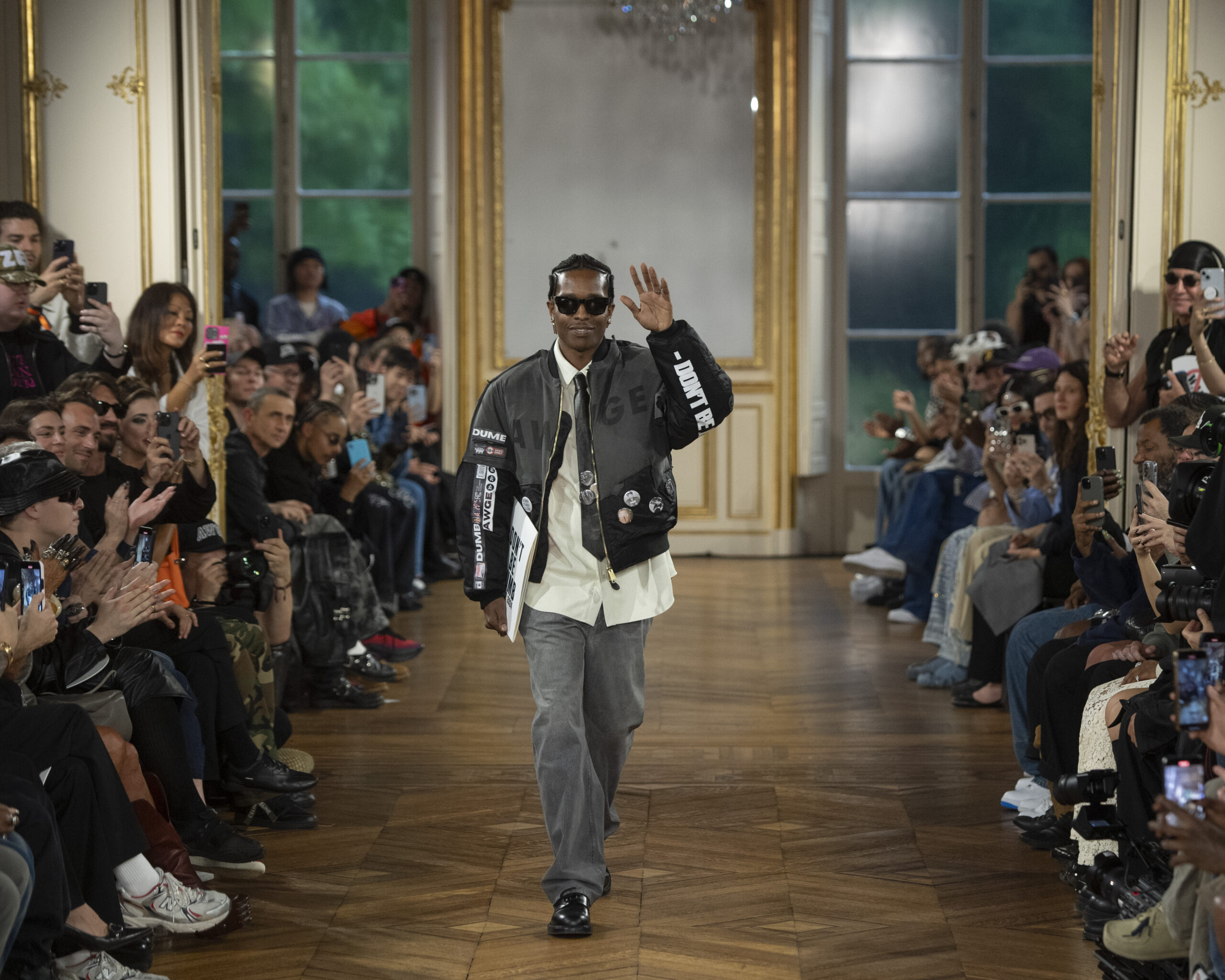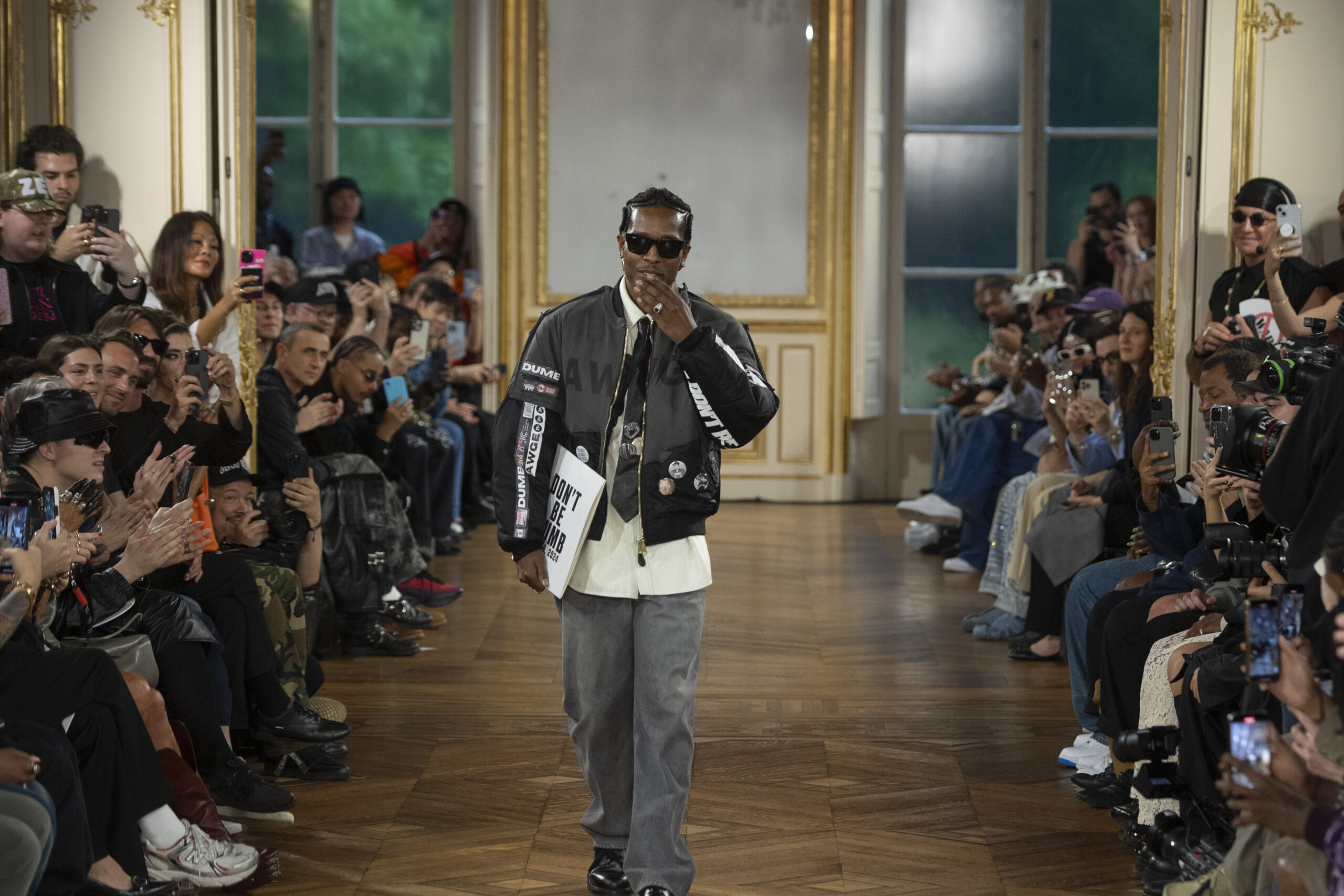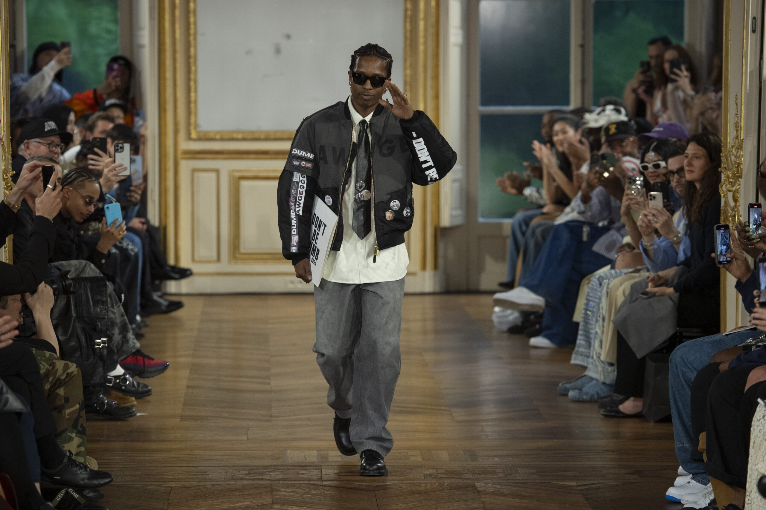 Le décor du défilé, comprenant des sacs poubelles transformés en chaises beanbag issues de la marque de mobilier Hommemade, en collaboration avec Crosby Studios, ajoutait une dimension immersive à cette expérience unique. Le défilé a été rythmé par la bande-son du prochain album d’A$AP Rocky, créant une synergie entre mode et musique.