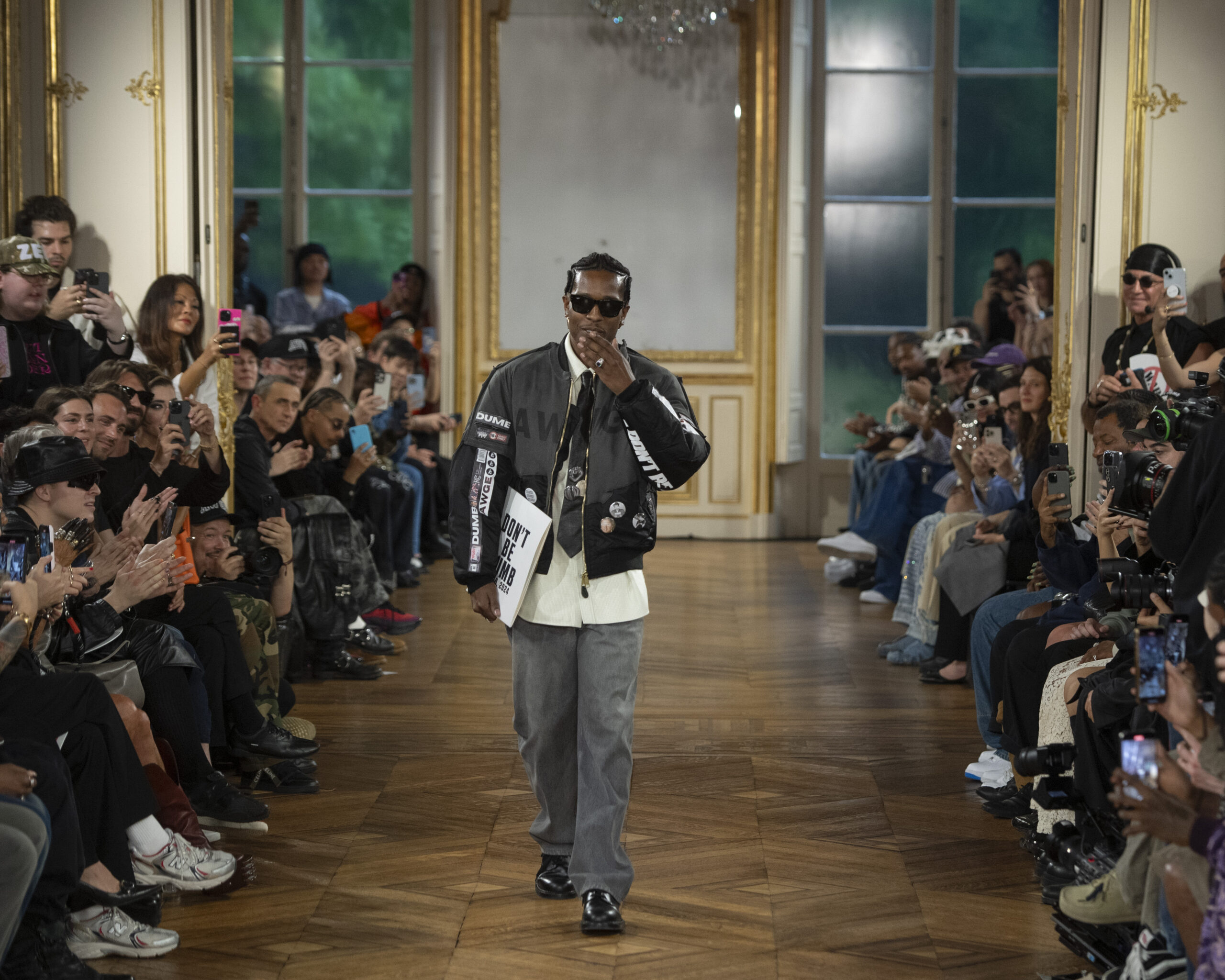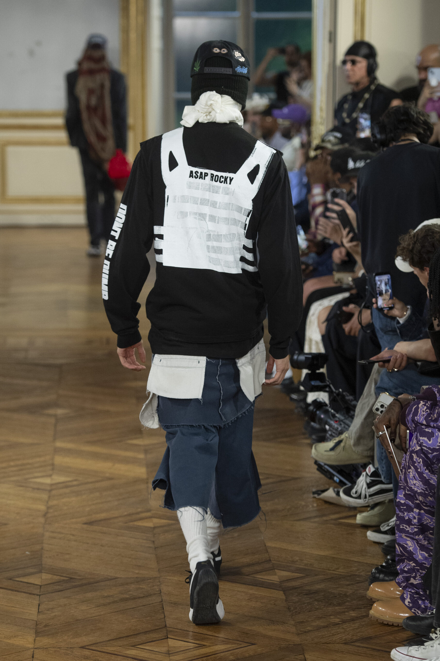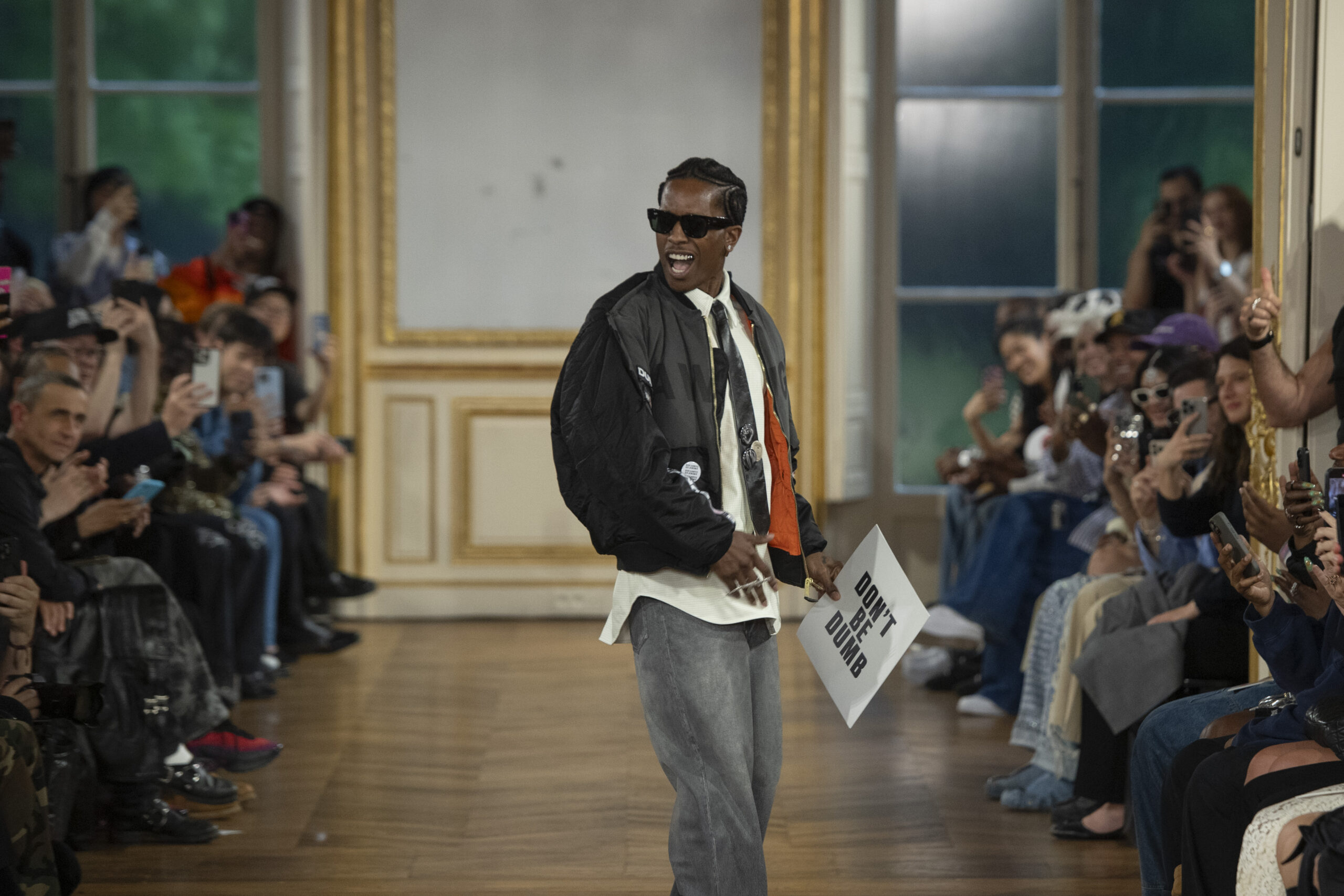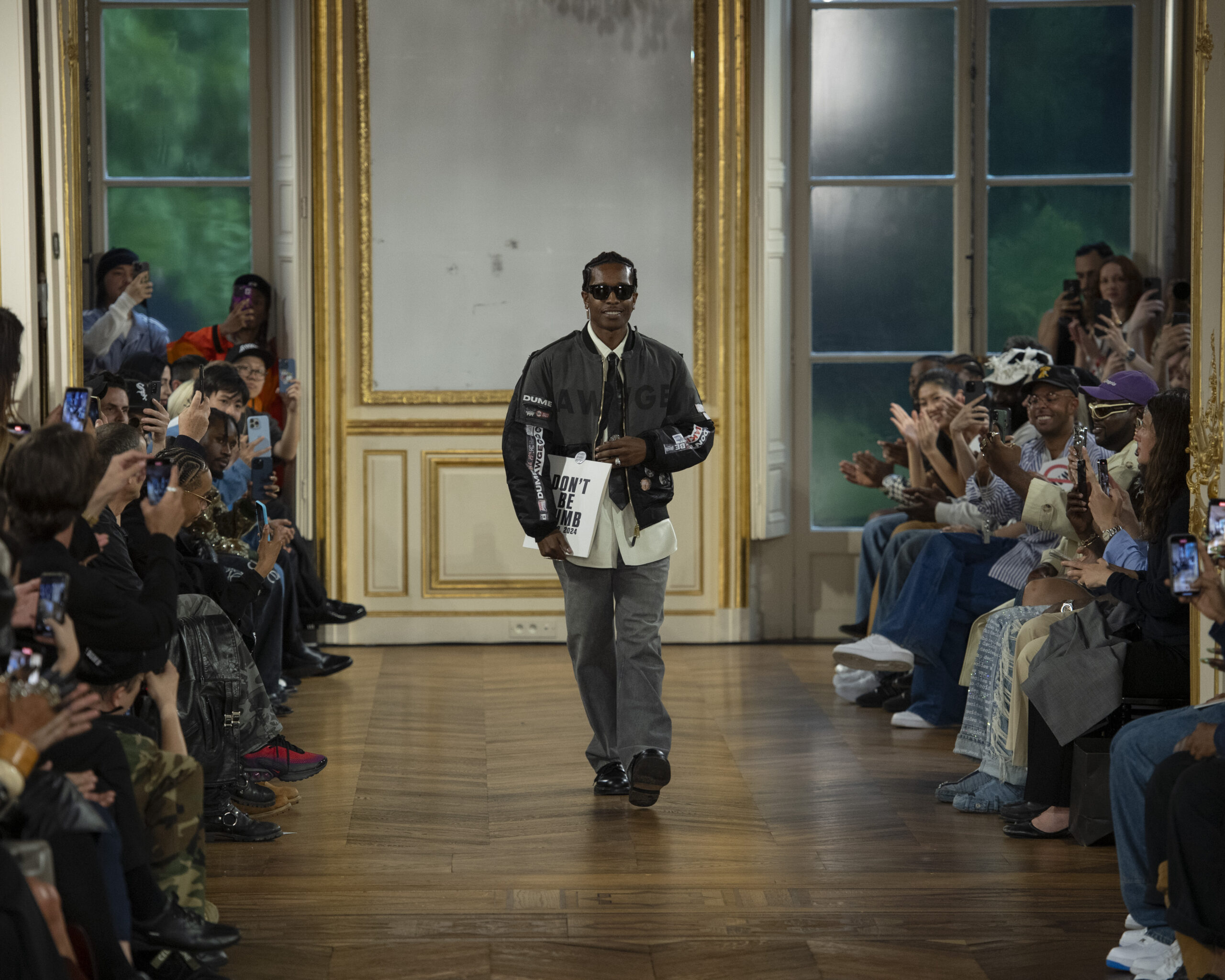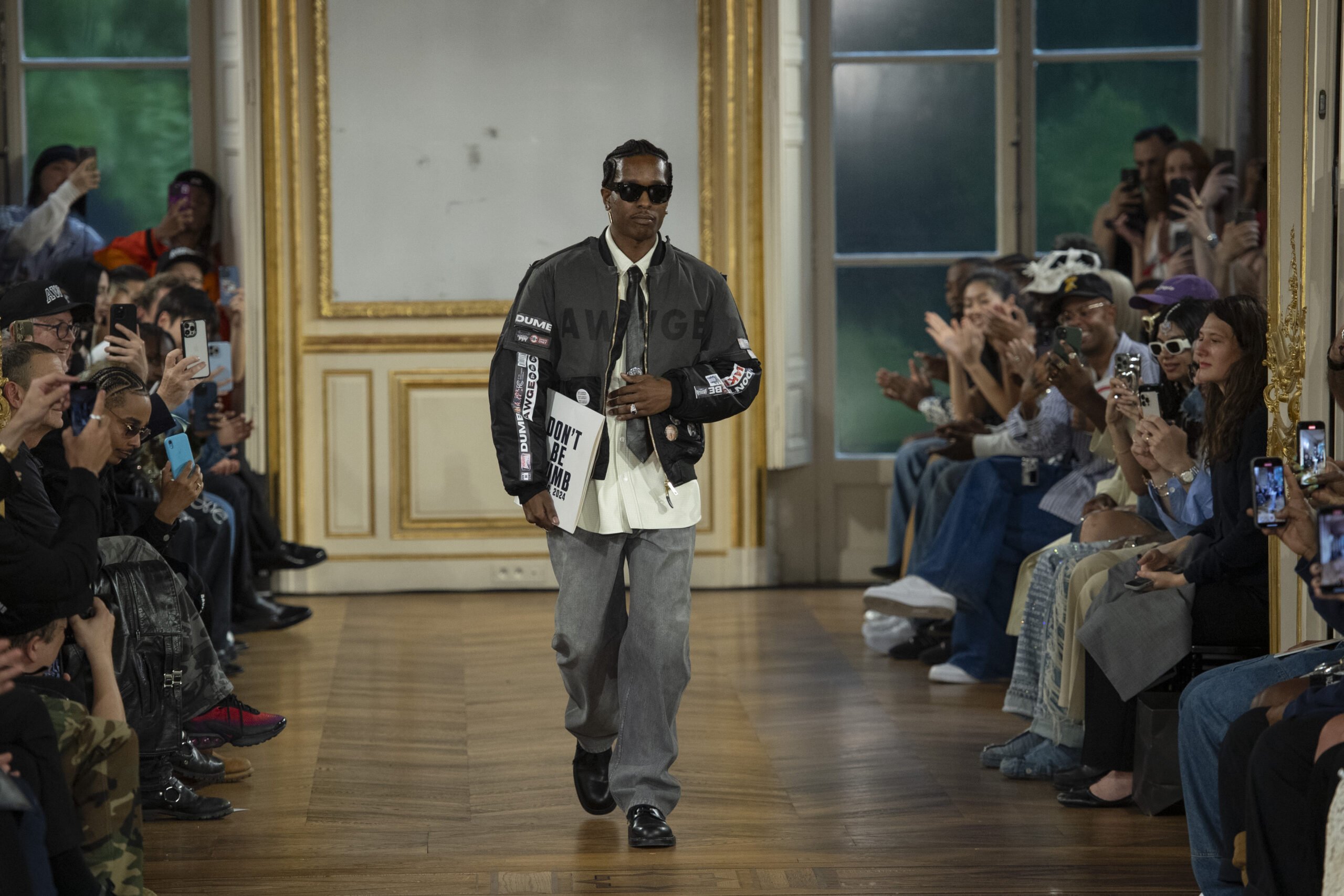 Le décor du défilé, comprenant des sacs poubelles transformés en chaises beanbag issues de la marque de mobilier Hommemade, en collaboration avec Crosby Studios, ajoutait une dimension immersive à cette expérience unique. Le défilé a été rythmé par la bande-son du prochain album d’A$AP Rocky, créant une synergie entre mode et musique.