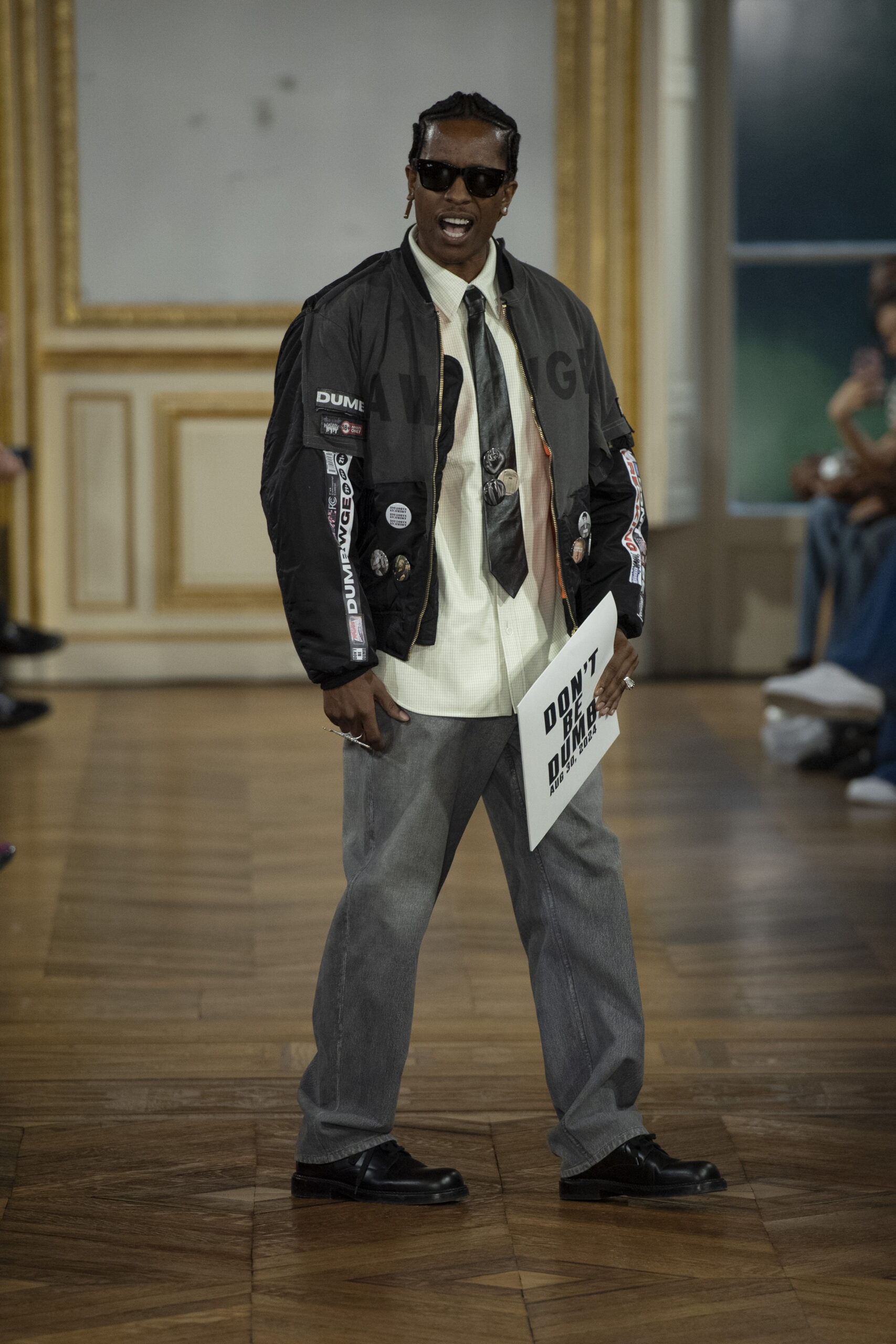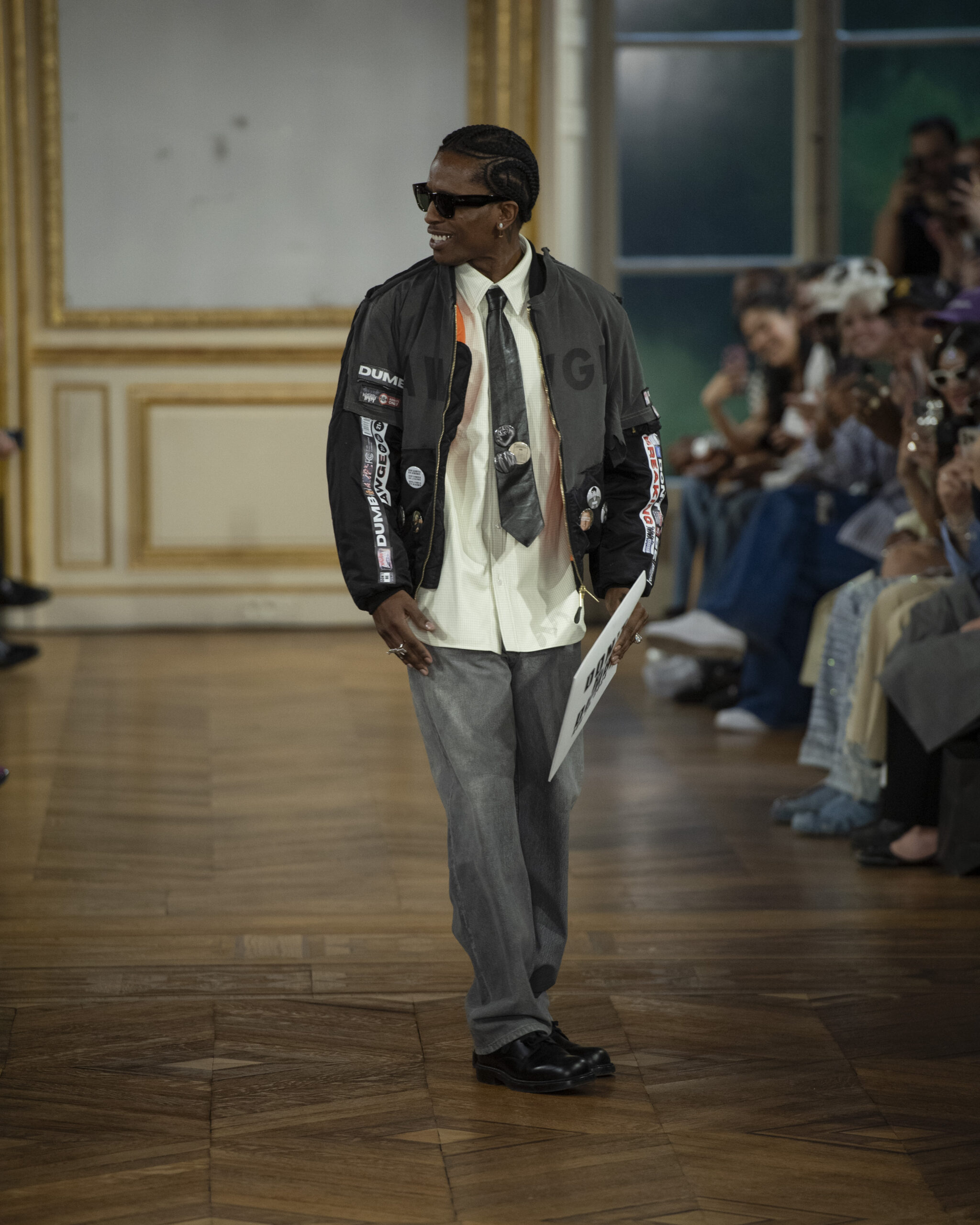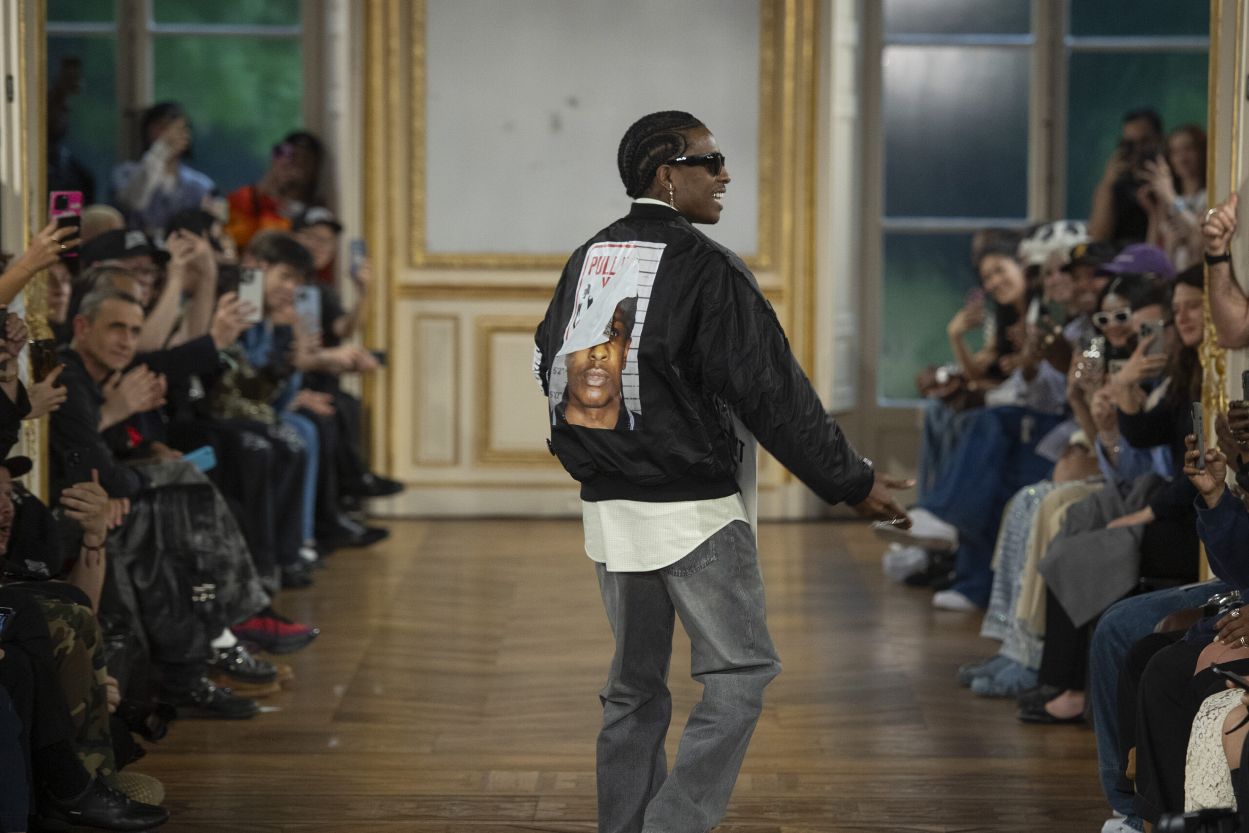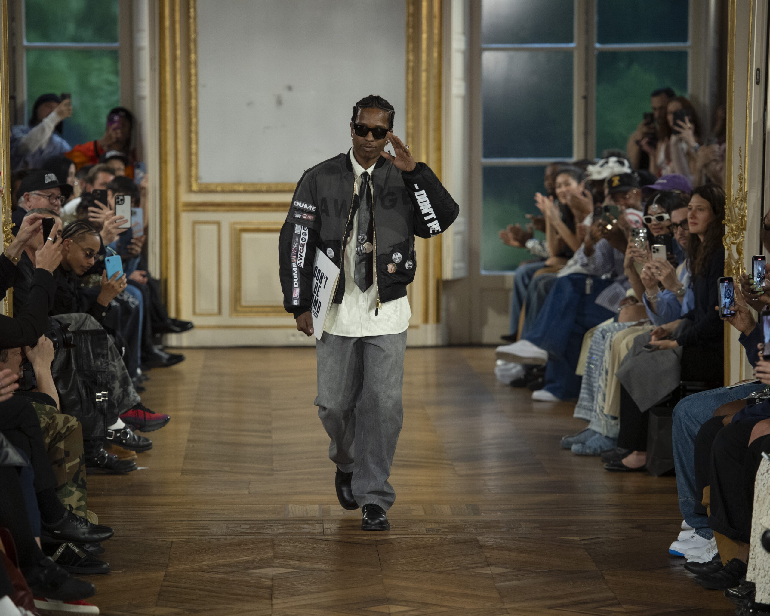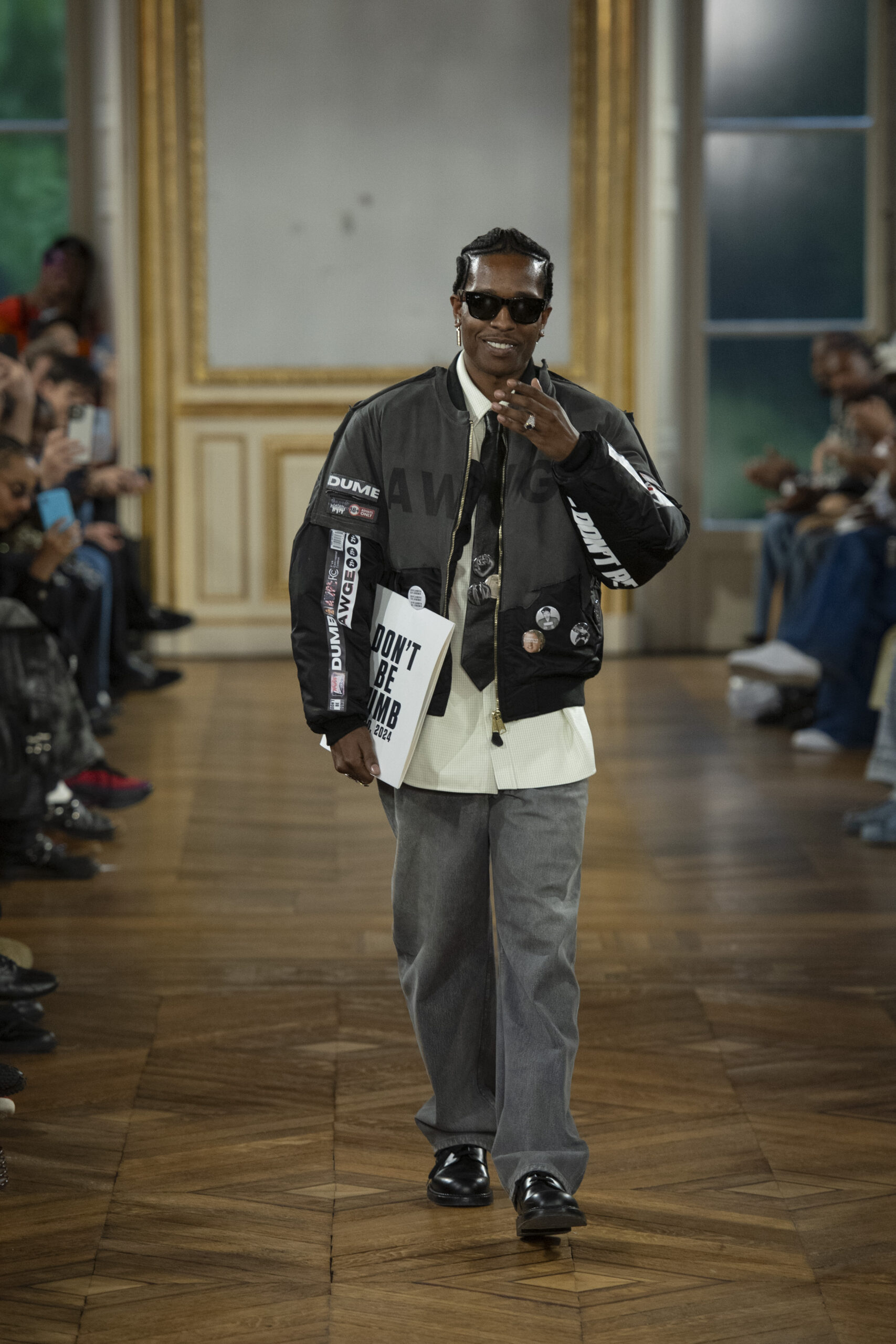 Le décor du défilé, comprenant des sacs poubelles transformés en chaises beanbag issues de la marque de mobilier Hommemade, en collaboration avec Crosby Studios, ajoutait une dimension immersive à cette expérience unique. Le défilé a été rythmé par la bande-son du prochain album d’A$AP Rocky, créant une synergie entre mode et musique.