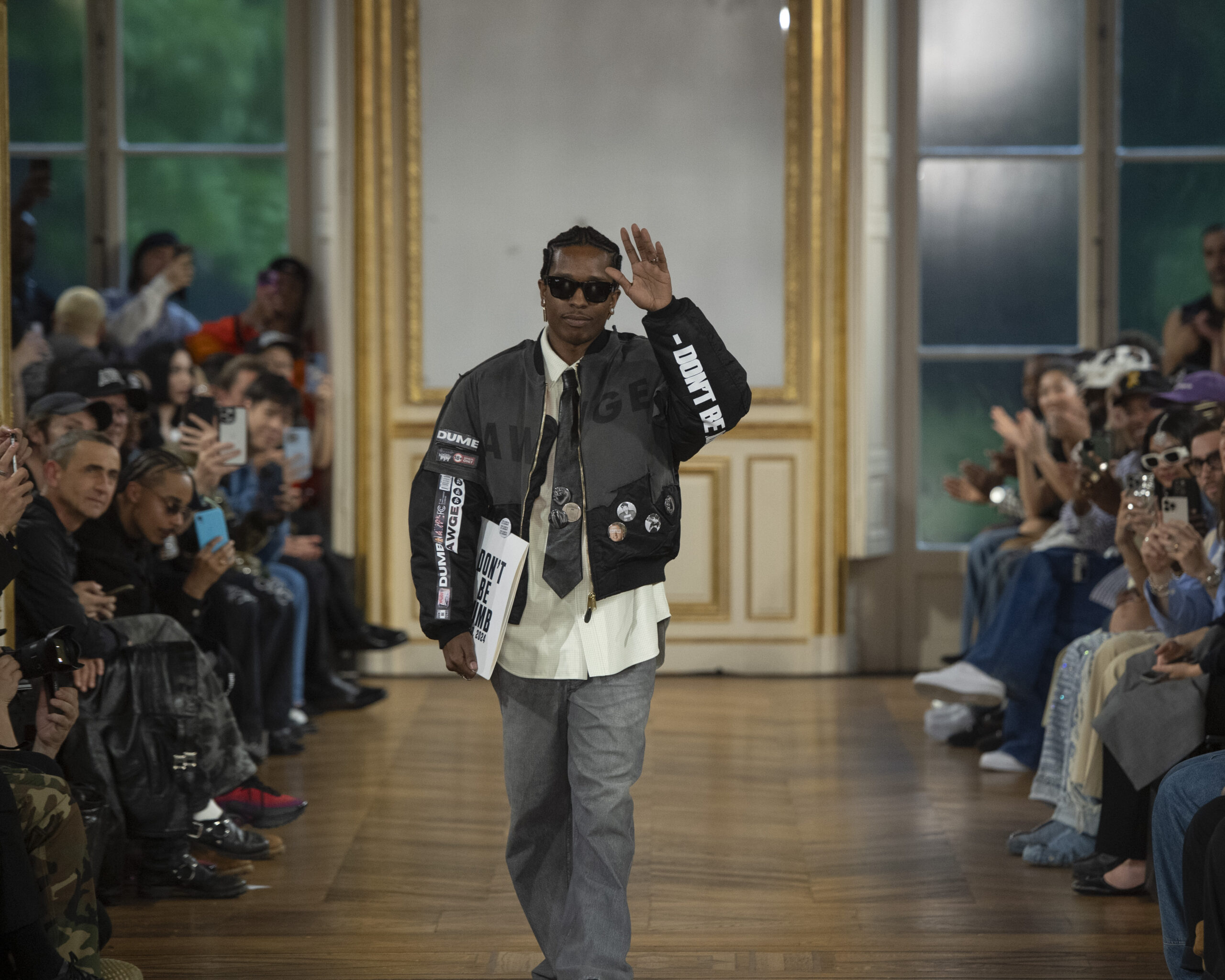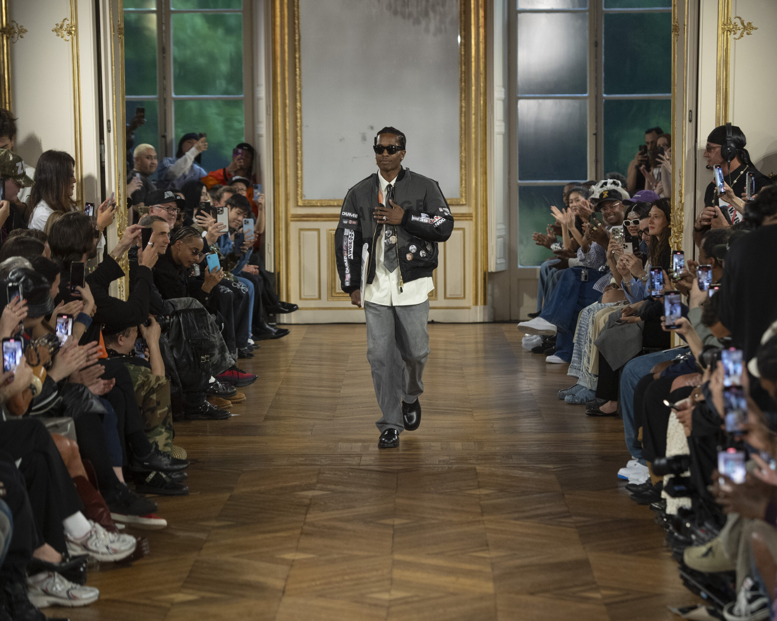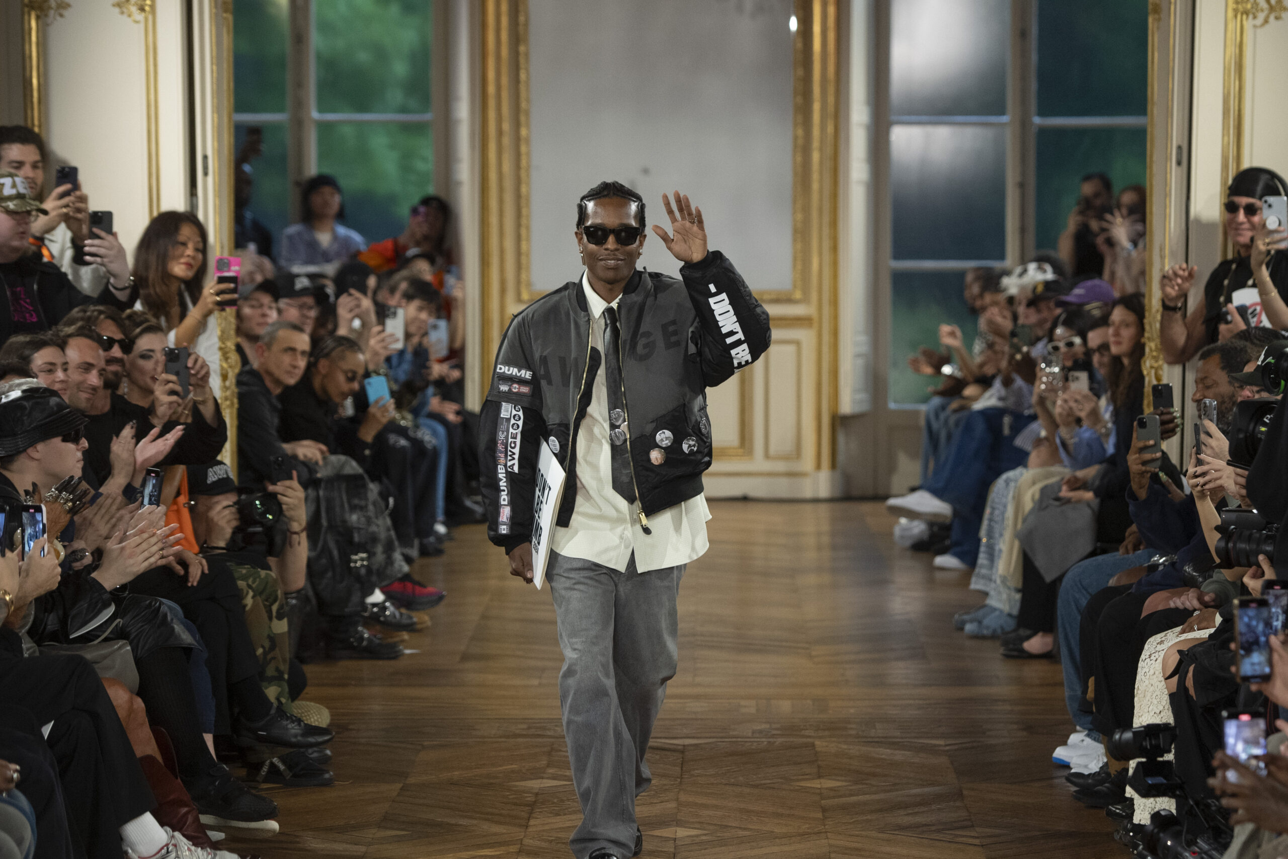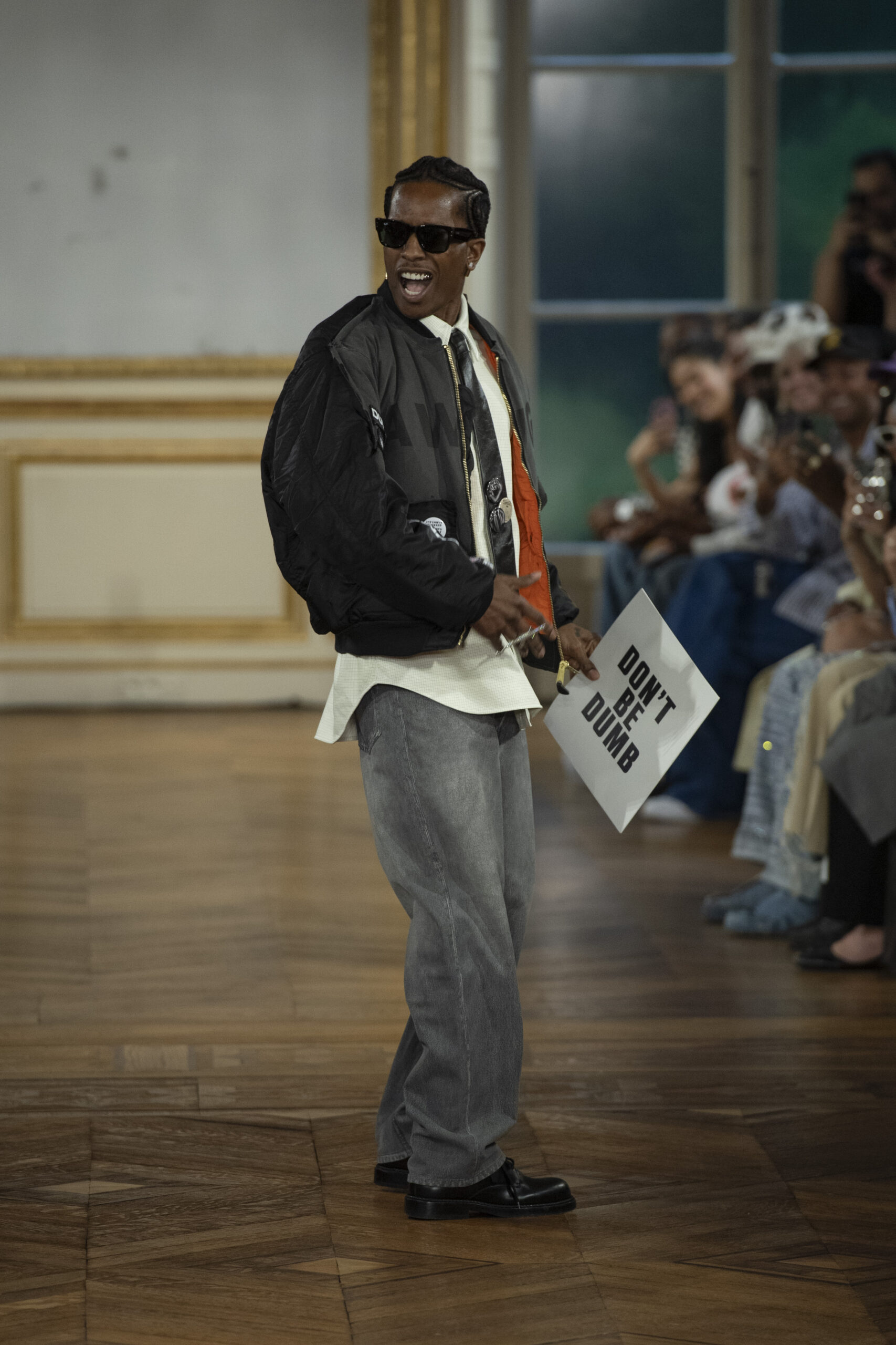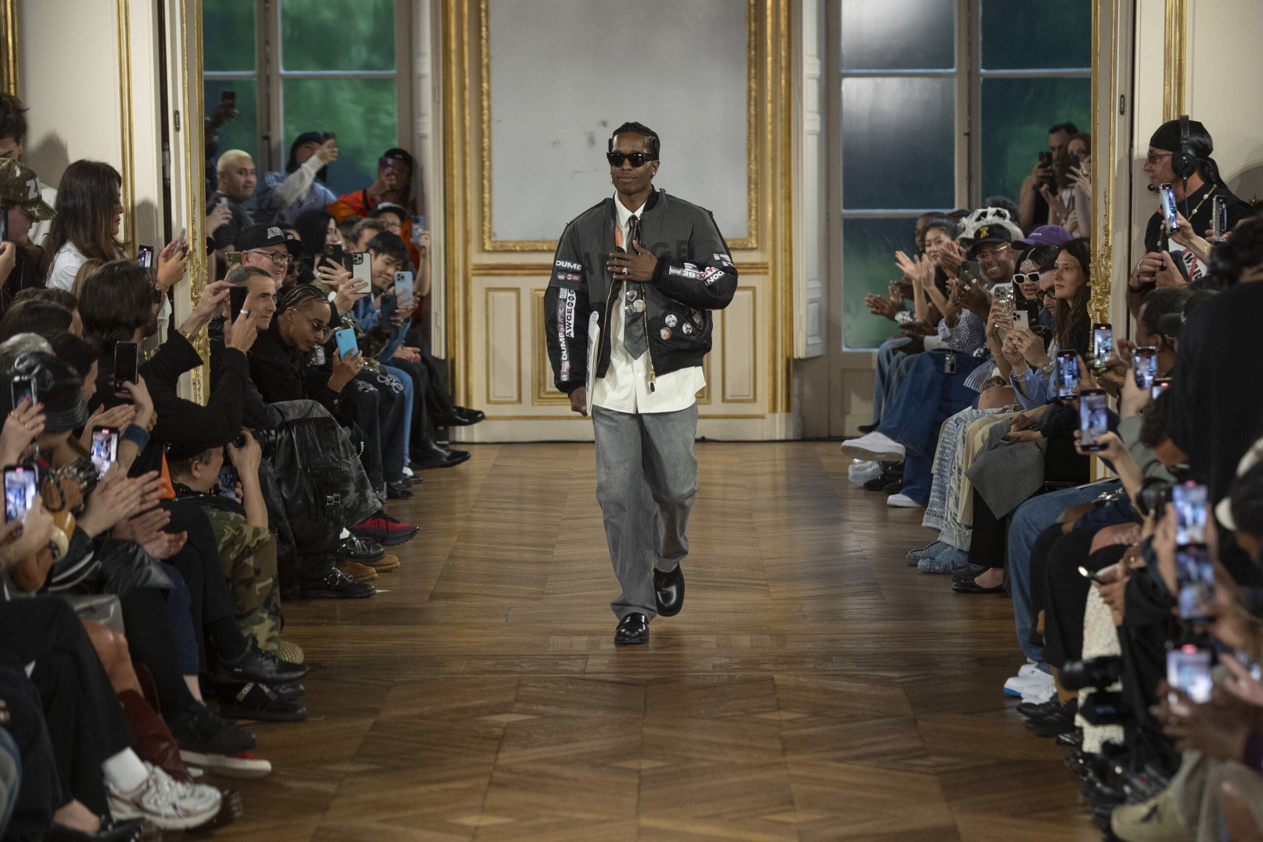 Le décor du défilé, comprenant des sacs poubelles transformés en chaises beanbag issues de la marque de mobilier Hommemade, en collaboration avec Crosby Studios, ajoutait une dimension immersive à cette expérience unique. Le défilé a été rythmé par la bande-son du prochain album d’A$AP Rocky, créant une synergie entre mode et musique.