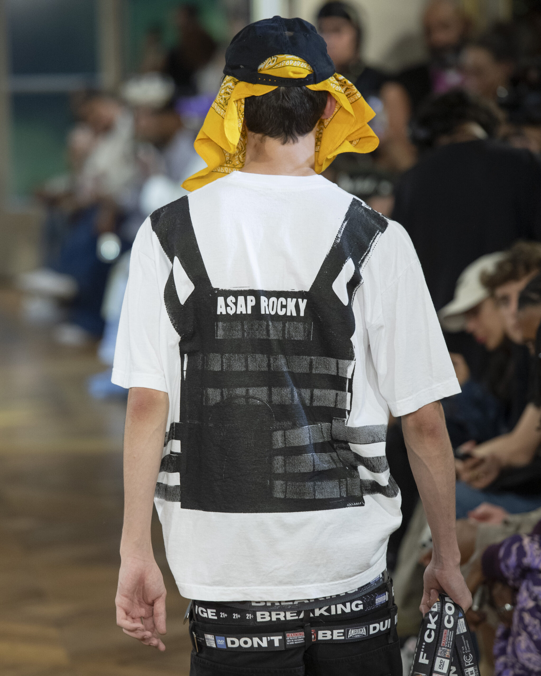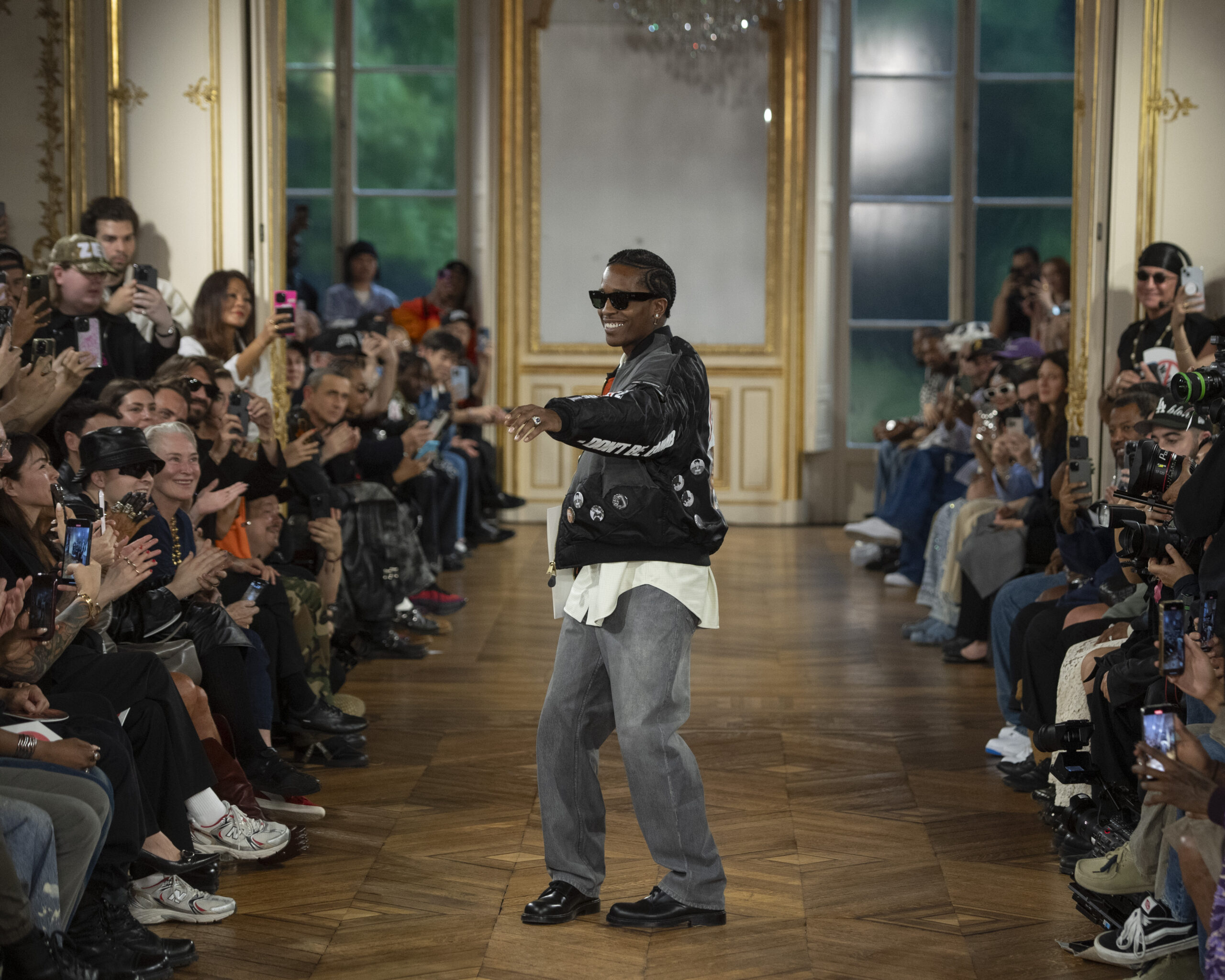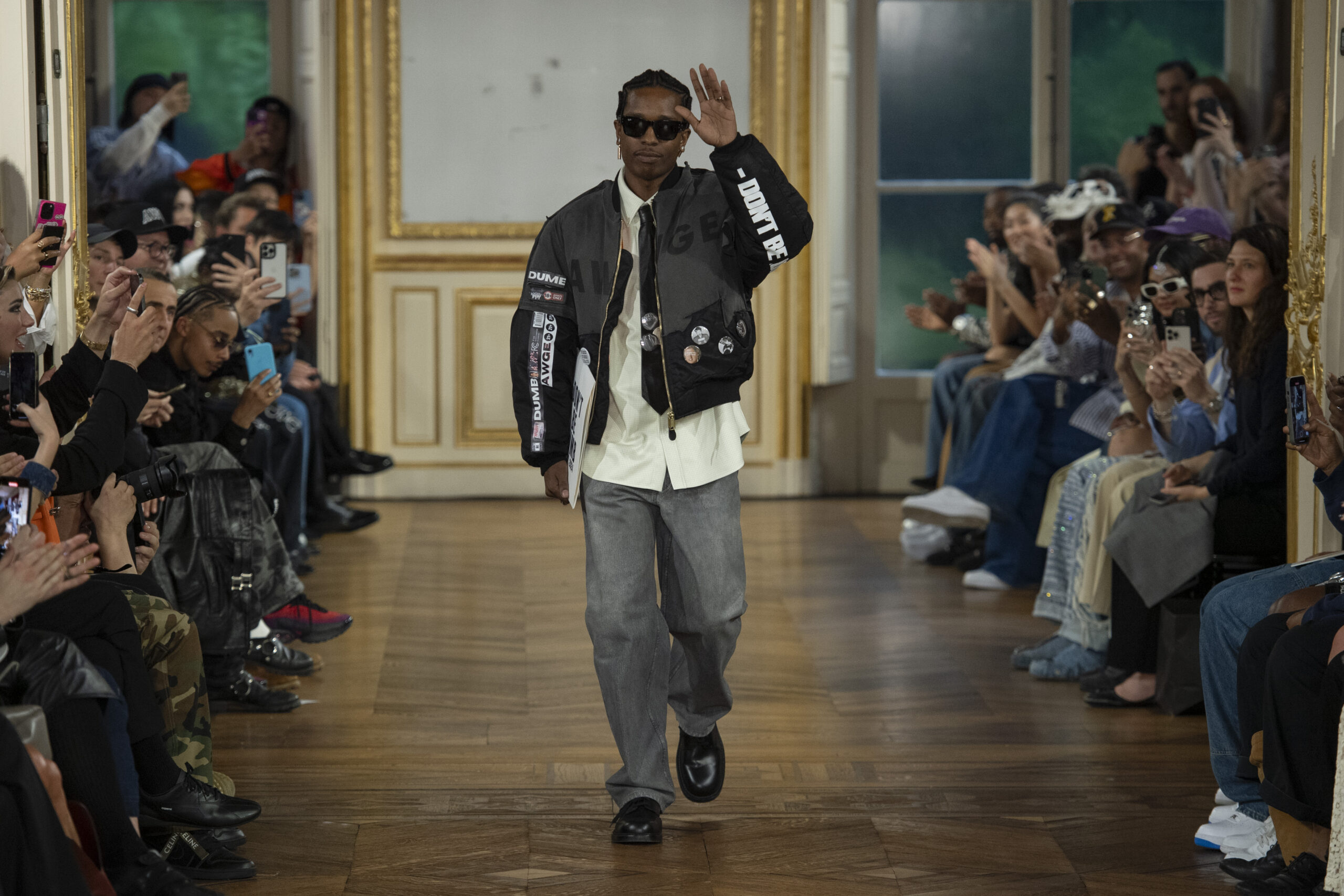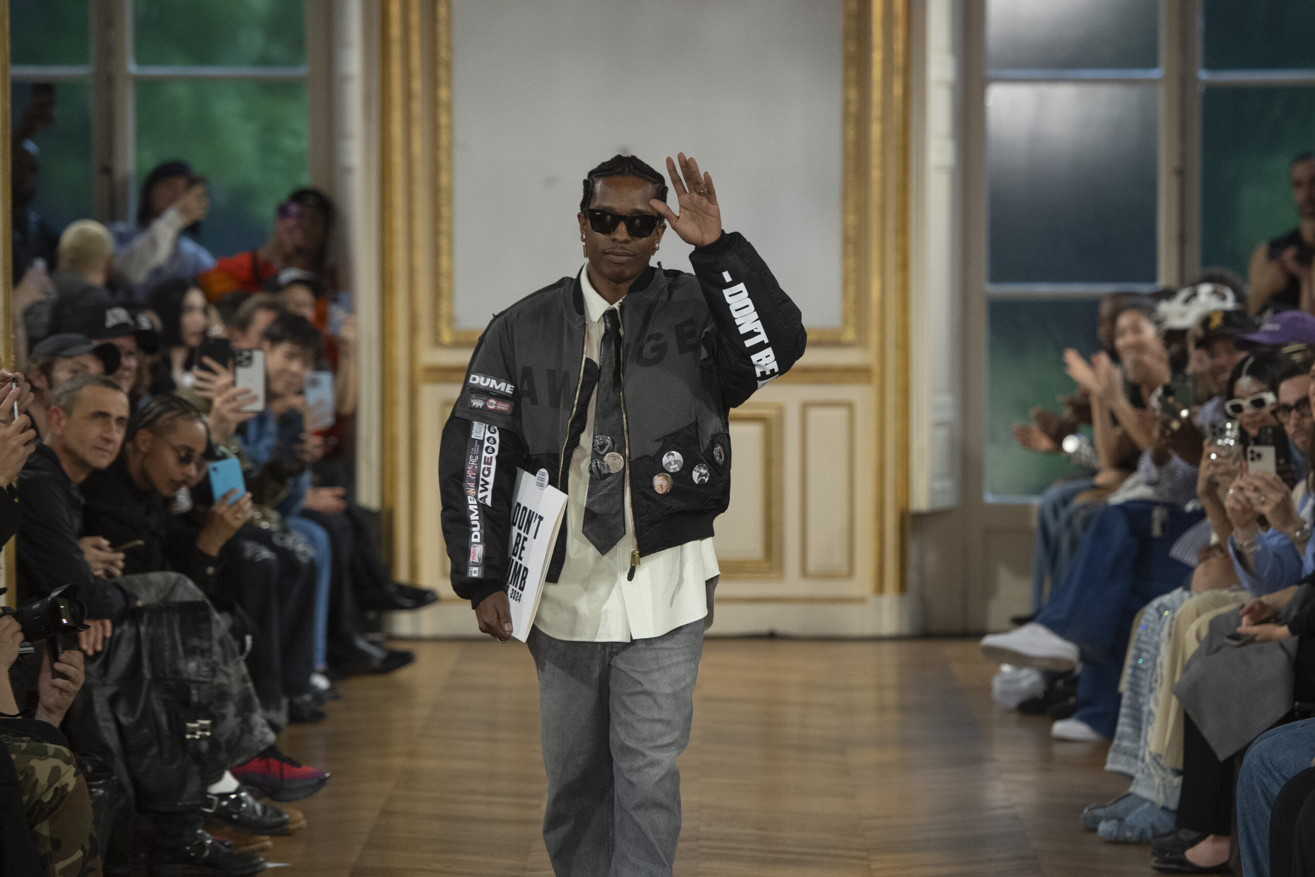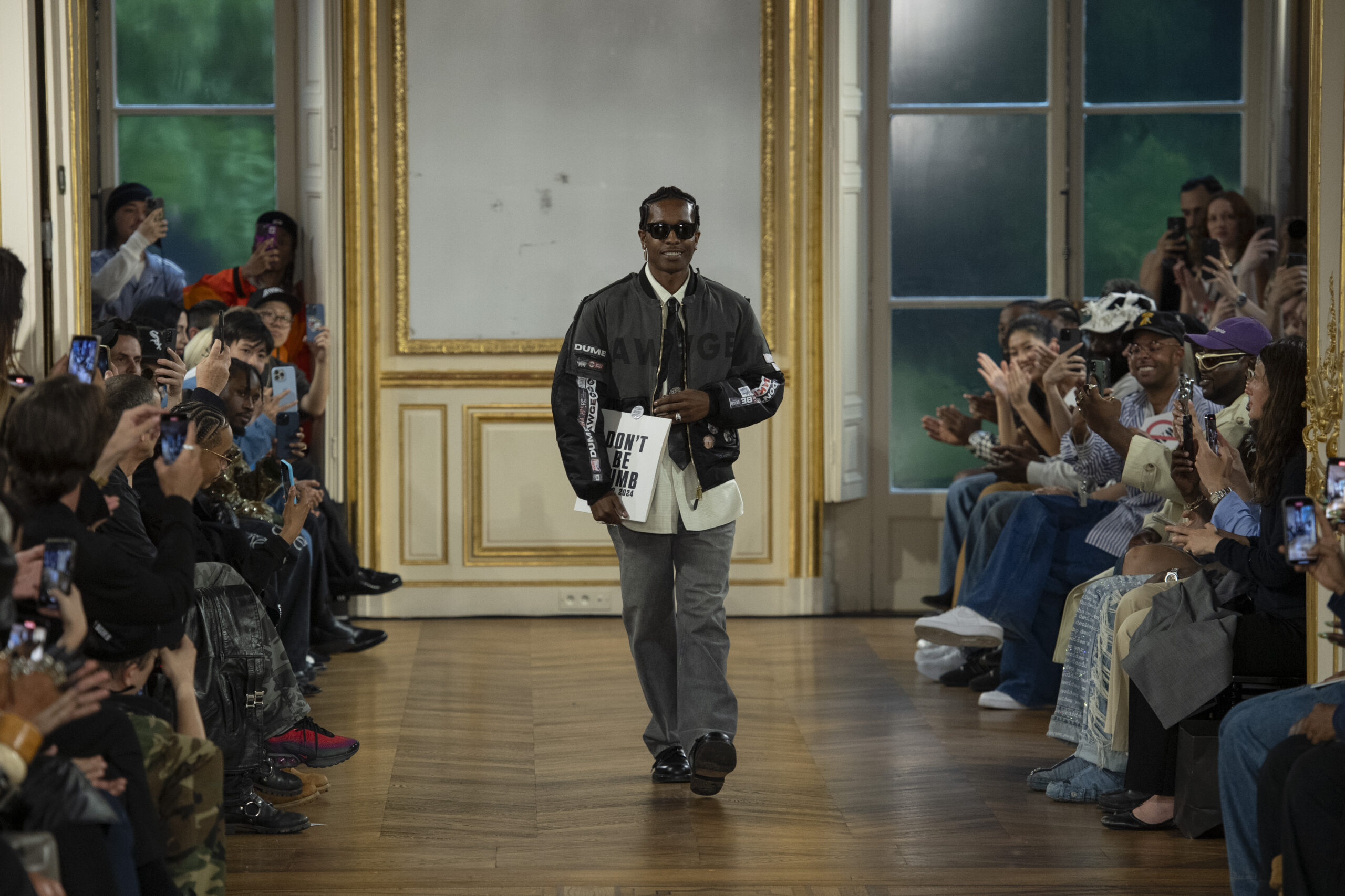 Le décor du défilé, comprenant des sacs poubelles transformés en chaises beanbag issues de la marque de mobilier Hommemade, en collaboration avec Crosby Studios, ajoutait une dimension immersive à cette expérience unique. Le défilé a été rythmé par la bande-son du prochain album d’A$AP Rocky, créant une synergie entre mode et musique.