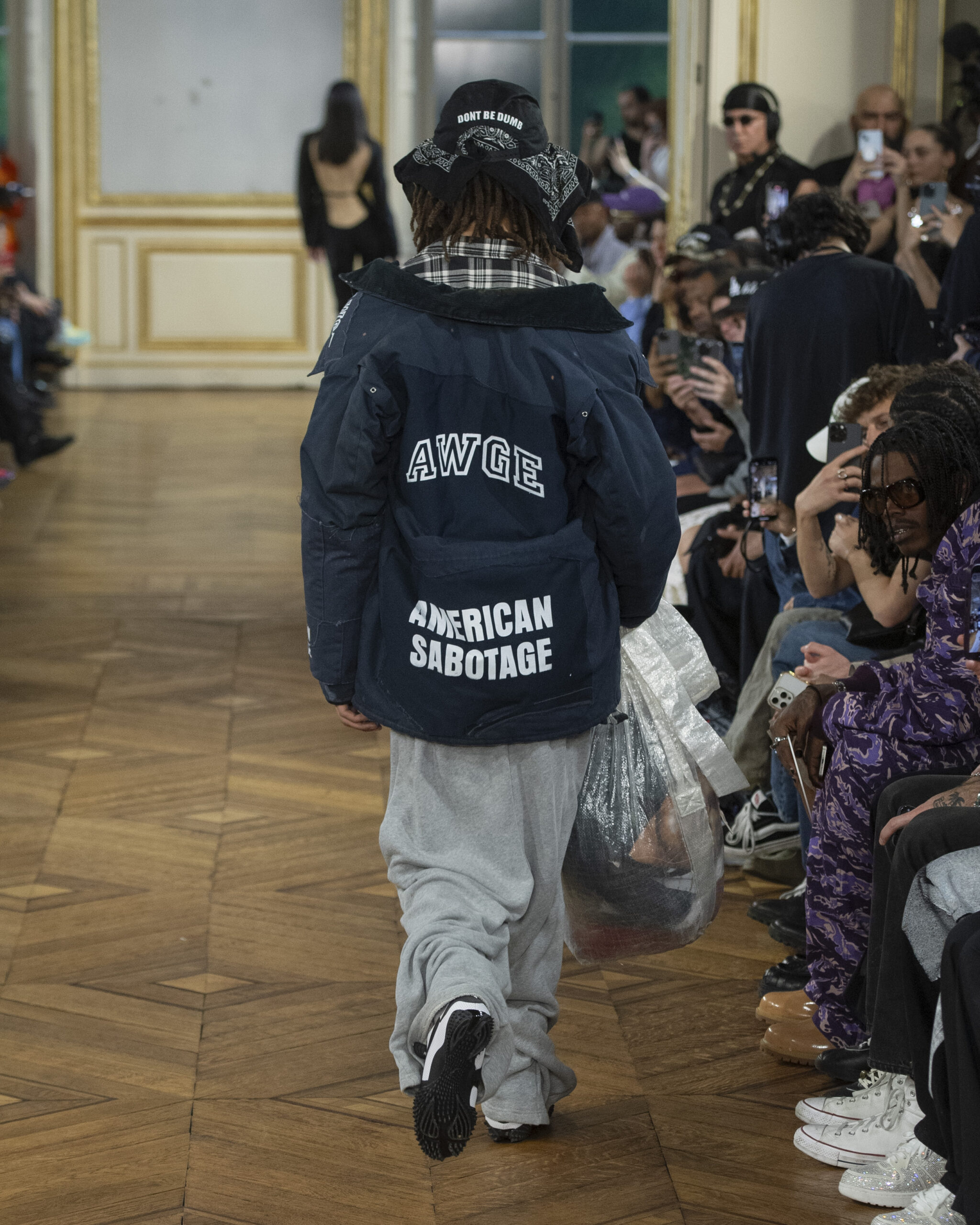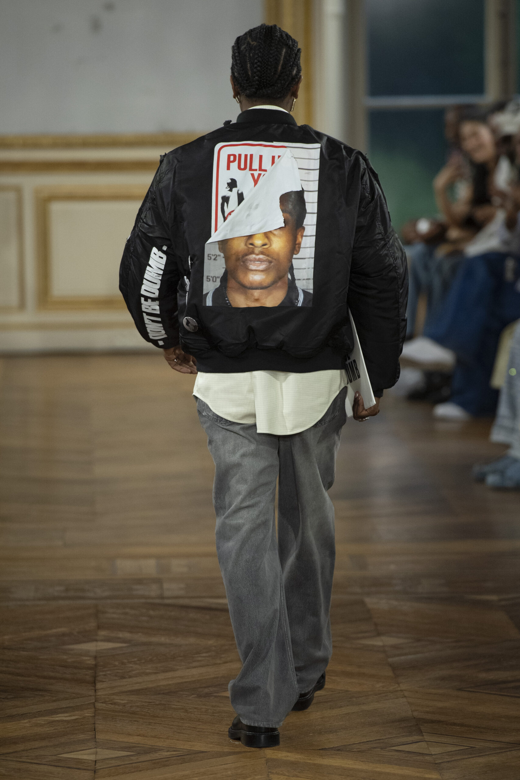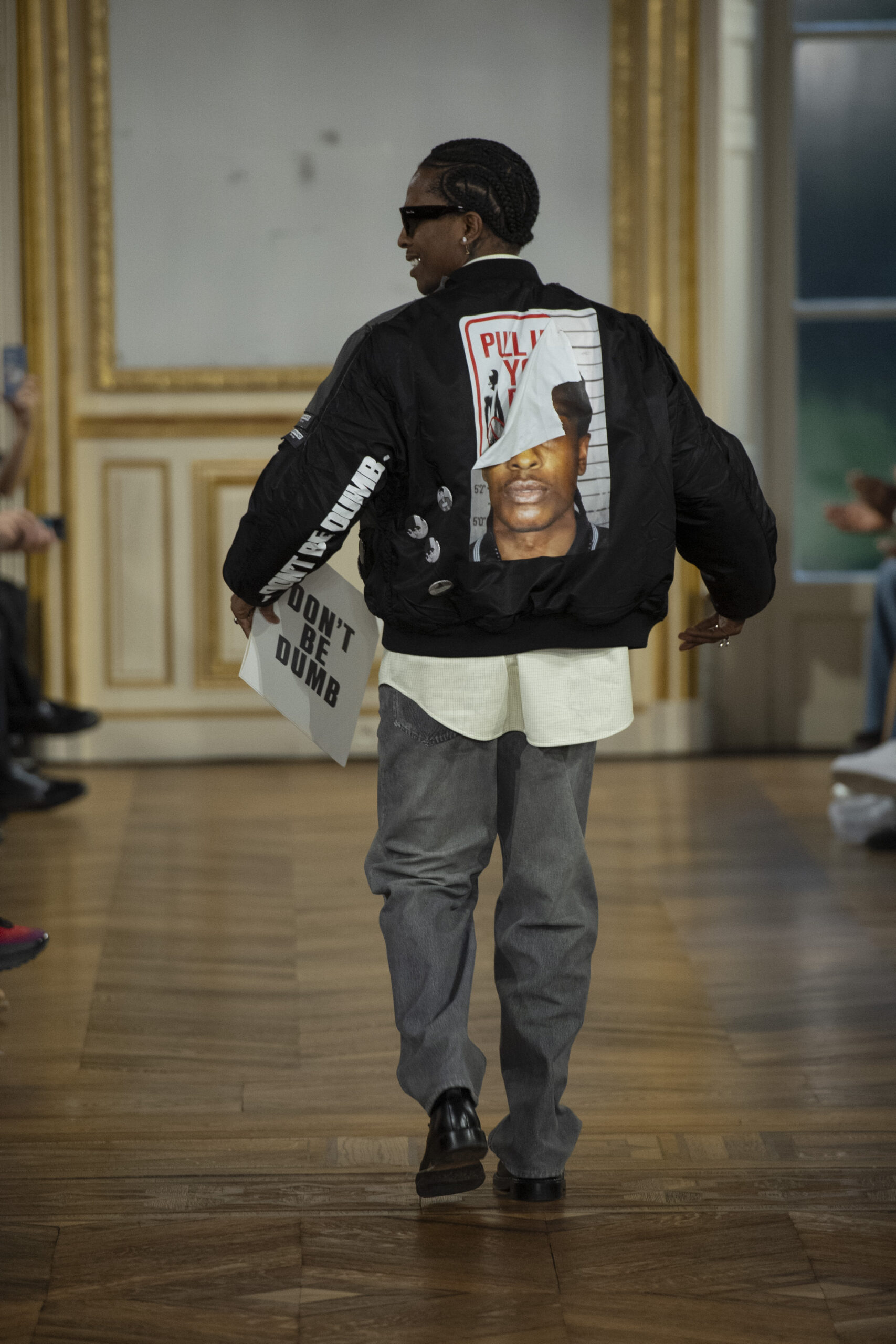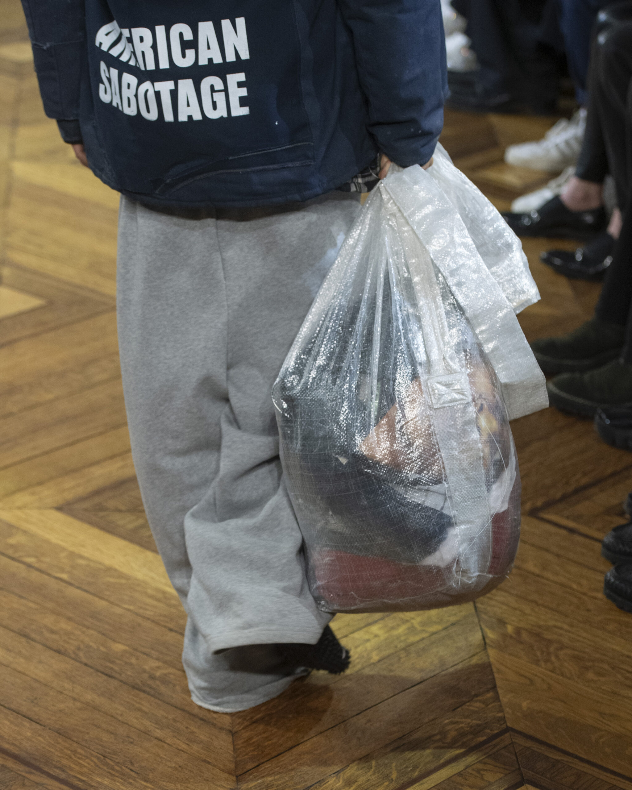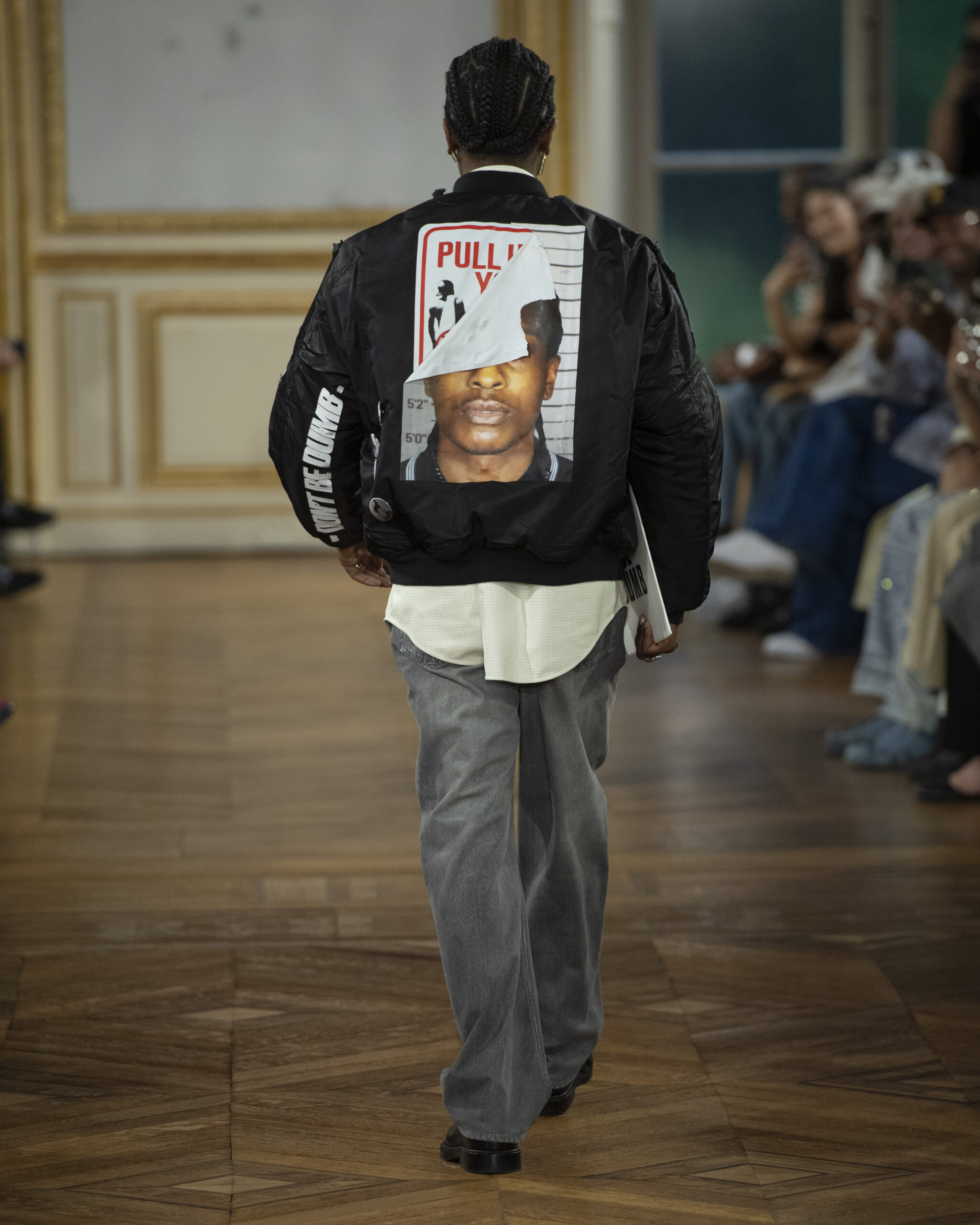 Le décor du défilé, comprenant des sacs poubelles transformés en chaises beanbag issues de la marque de mobilier Hommemade, en collaboration avec Crosby Studios, ajoutait une dimension immersive à cette expérience unique. Le défilé a été rythmé par la bande-son du prochain album d’A$AP Rocky, créant une synergie entre mode et musique.