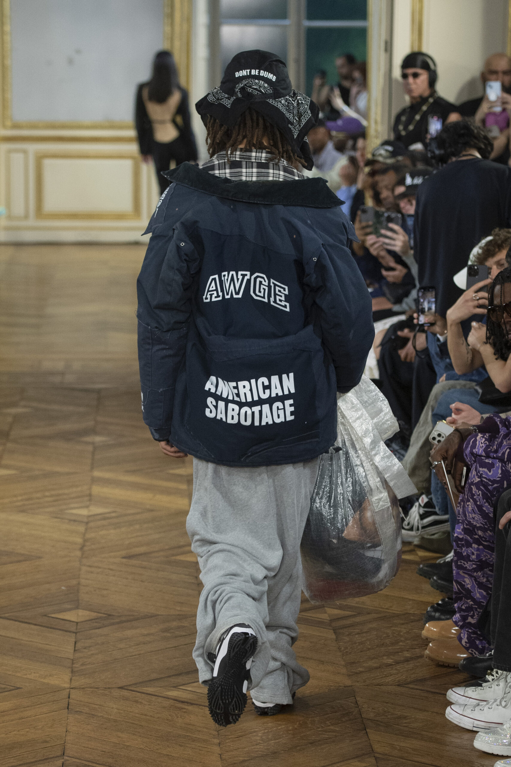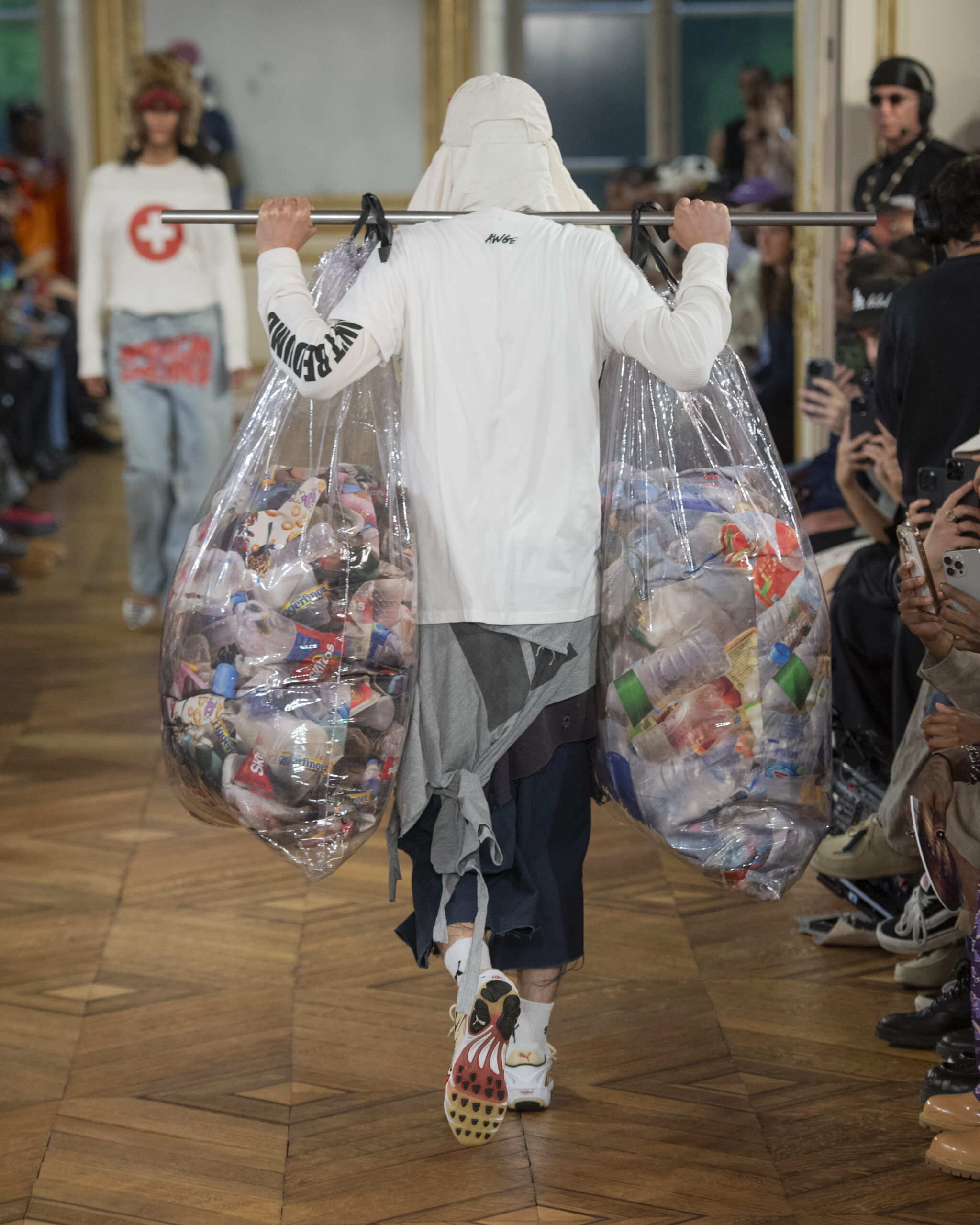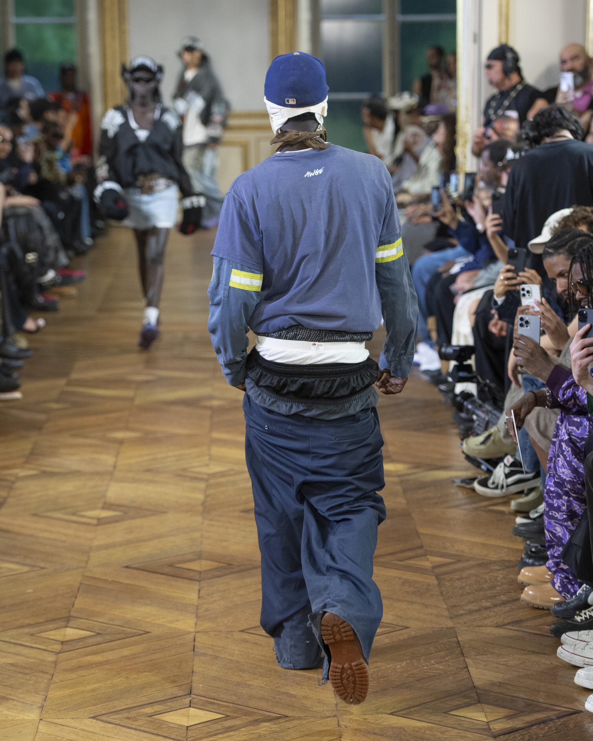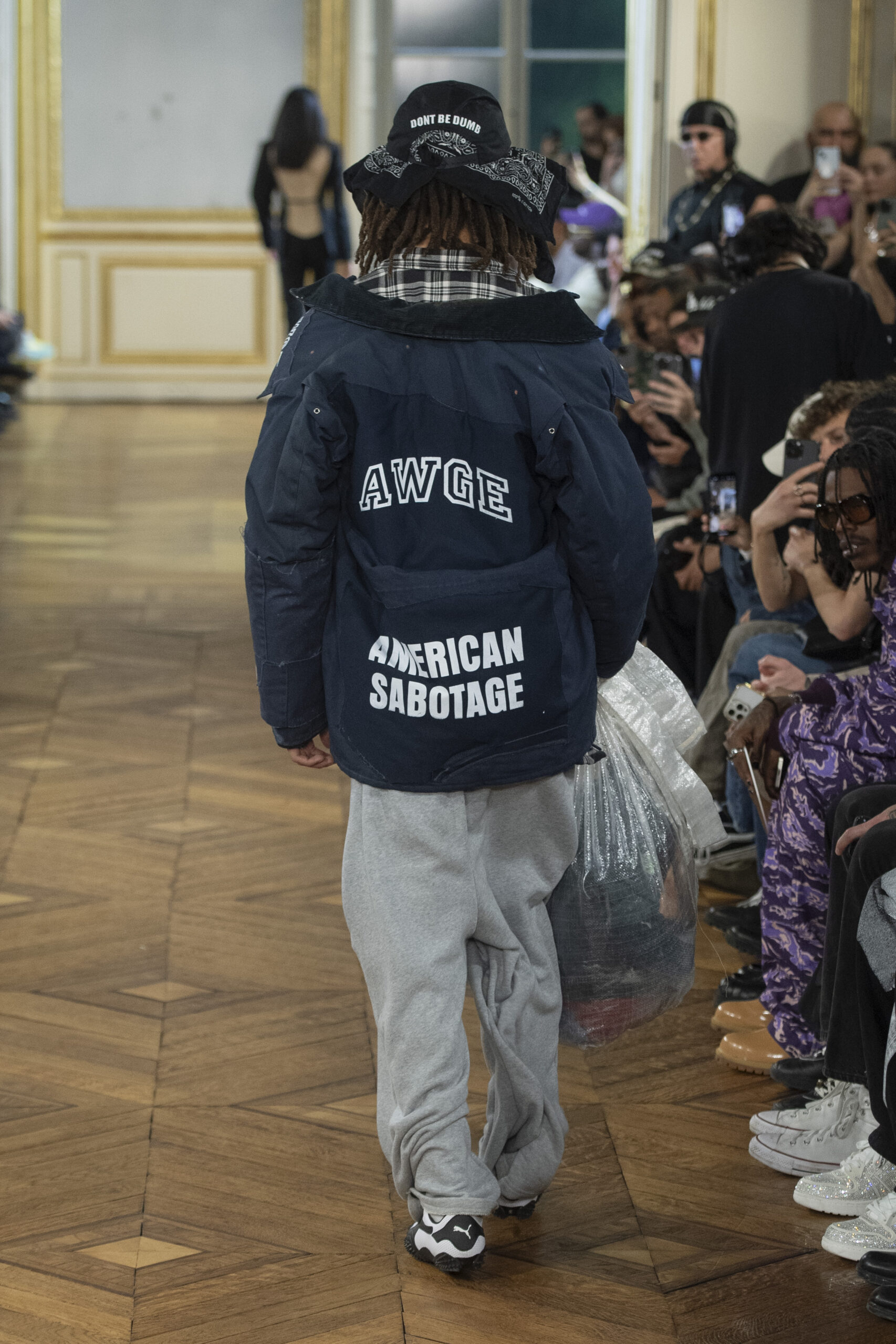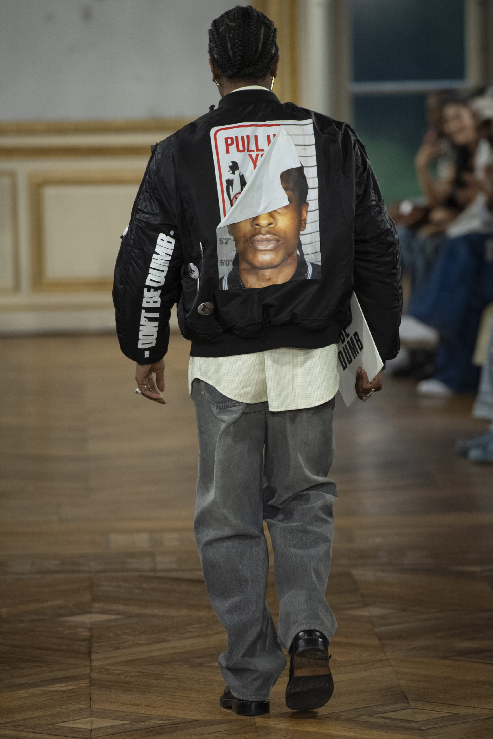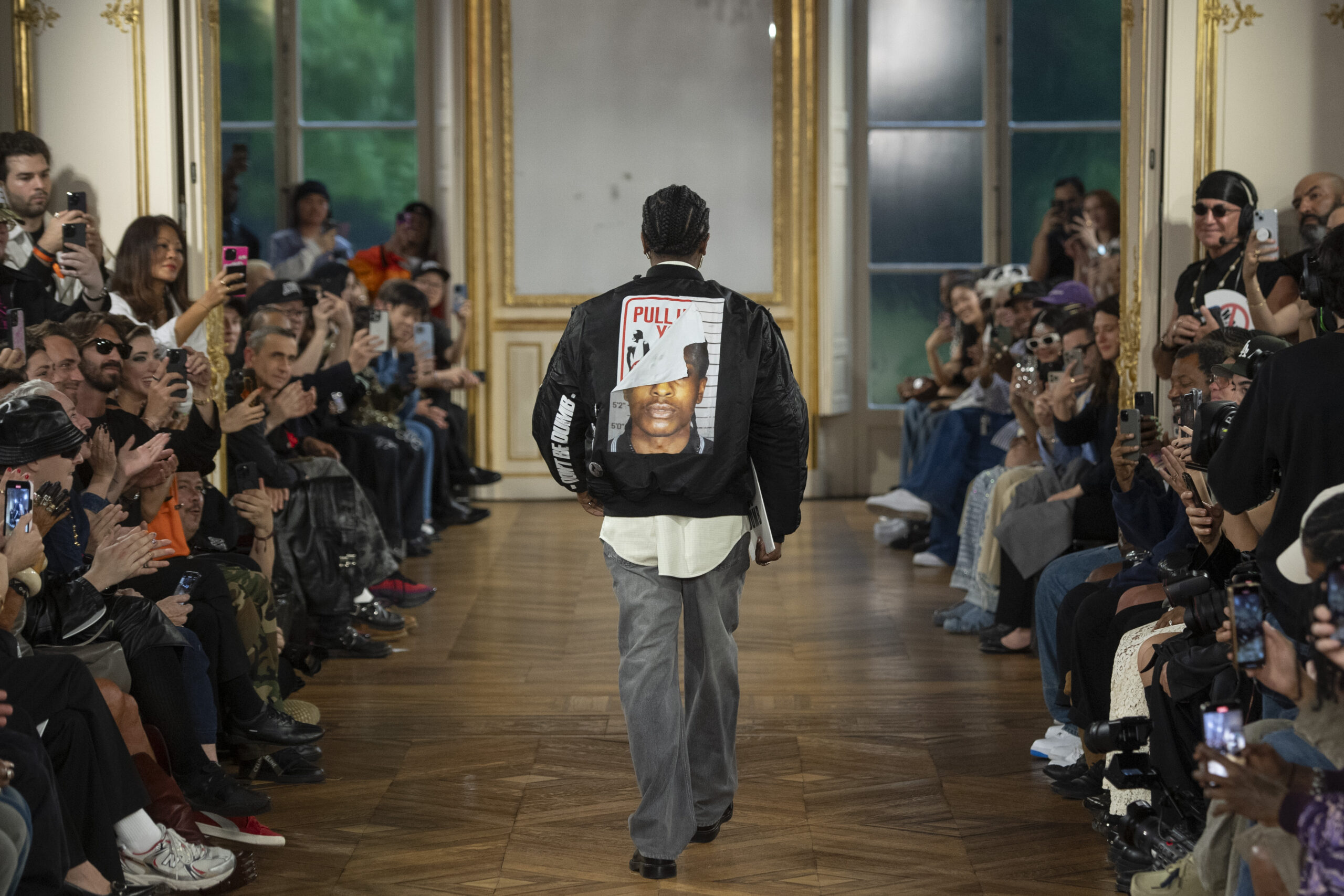Le décor du défilé, comprenant des sacs poubelles transformés en chaises beanbag issues de la marque de mobilier Hommemade, en collaboration avec Crosby Studios, ajoutait une dimension immersive à cette expérience unique. Le défilé a été rythmé par la bande-son du prochain album d’A$AP Rocky, créant une synergie entre mode et musique.