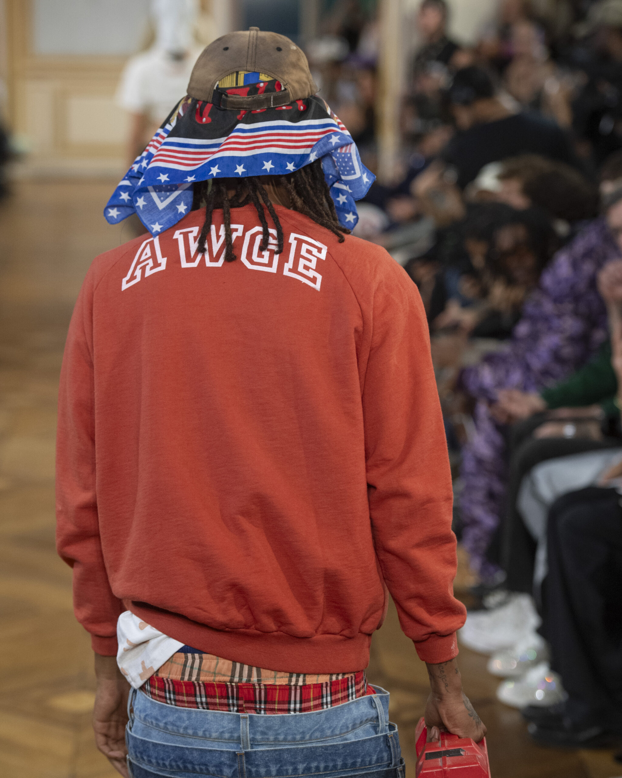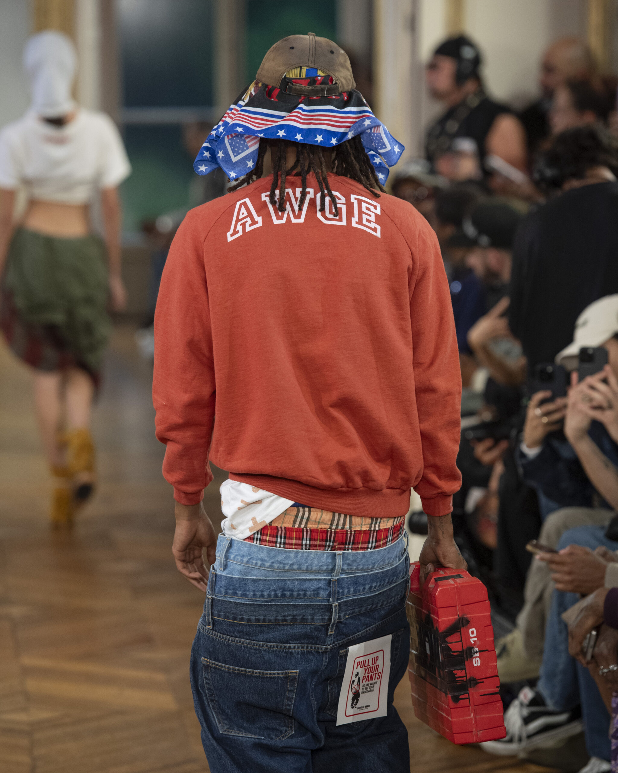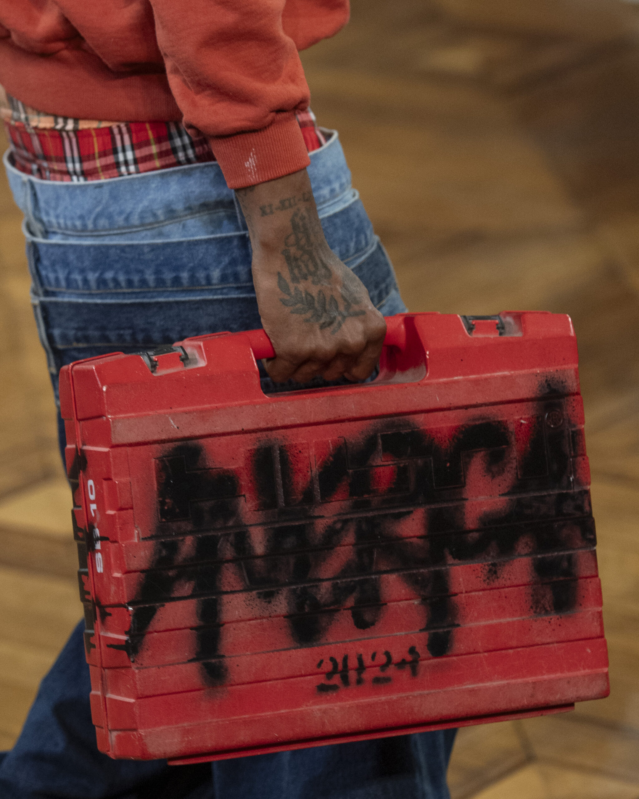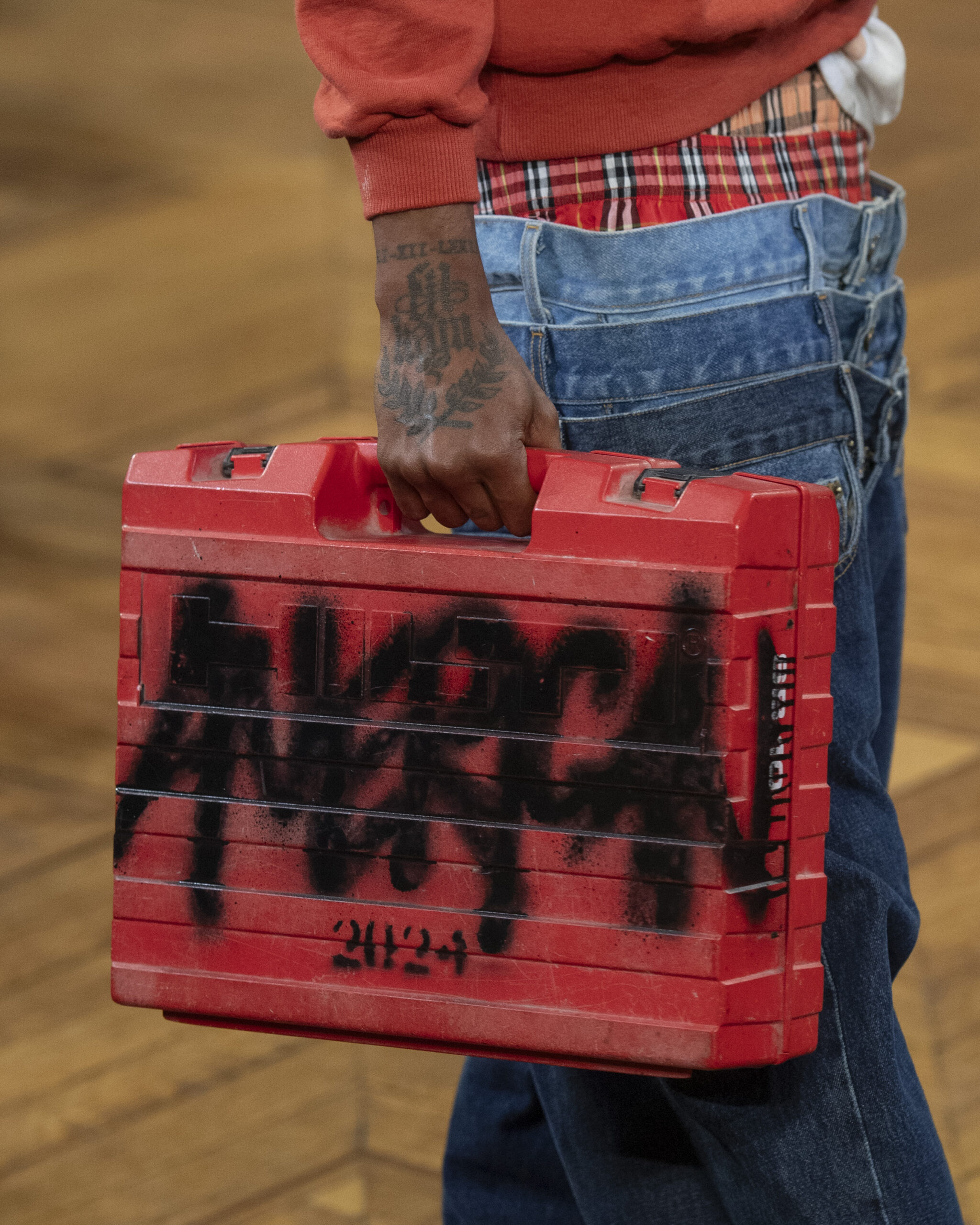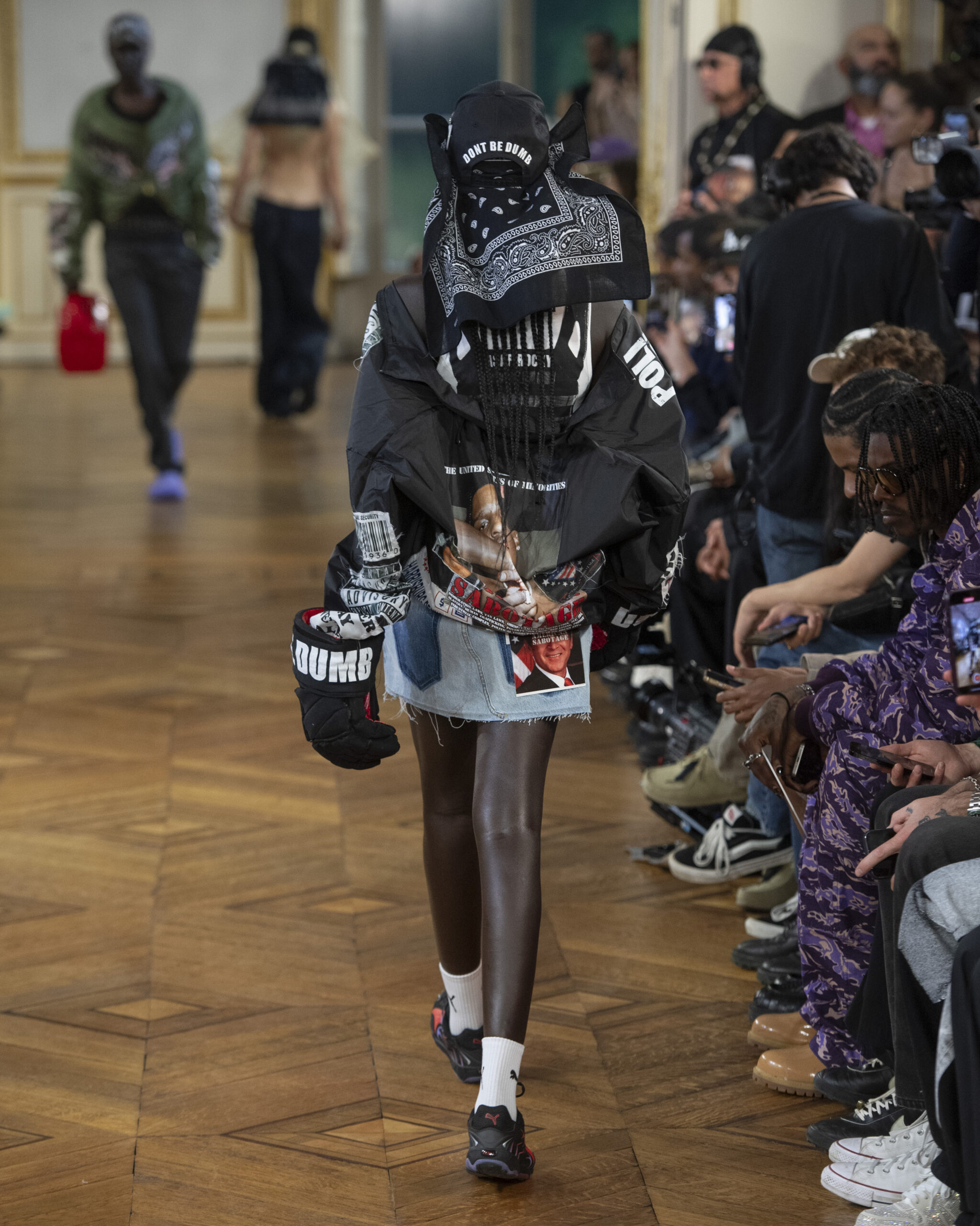 Le décor du défilé, comprenant des sacs poubelles transformés en chaises beanbag issues de la marque de mobilier Hommemade, en collaboration avec Crosby Studios, ajoutait une dimension immersive à cette expérience unique. Le défilé a été rythmé par la bande-son du prochain album d’A$AP Rocky, créant une synergie entre mode et musique.
