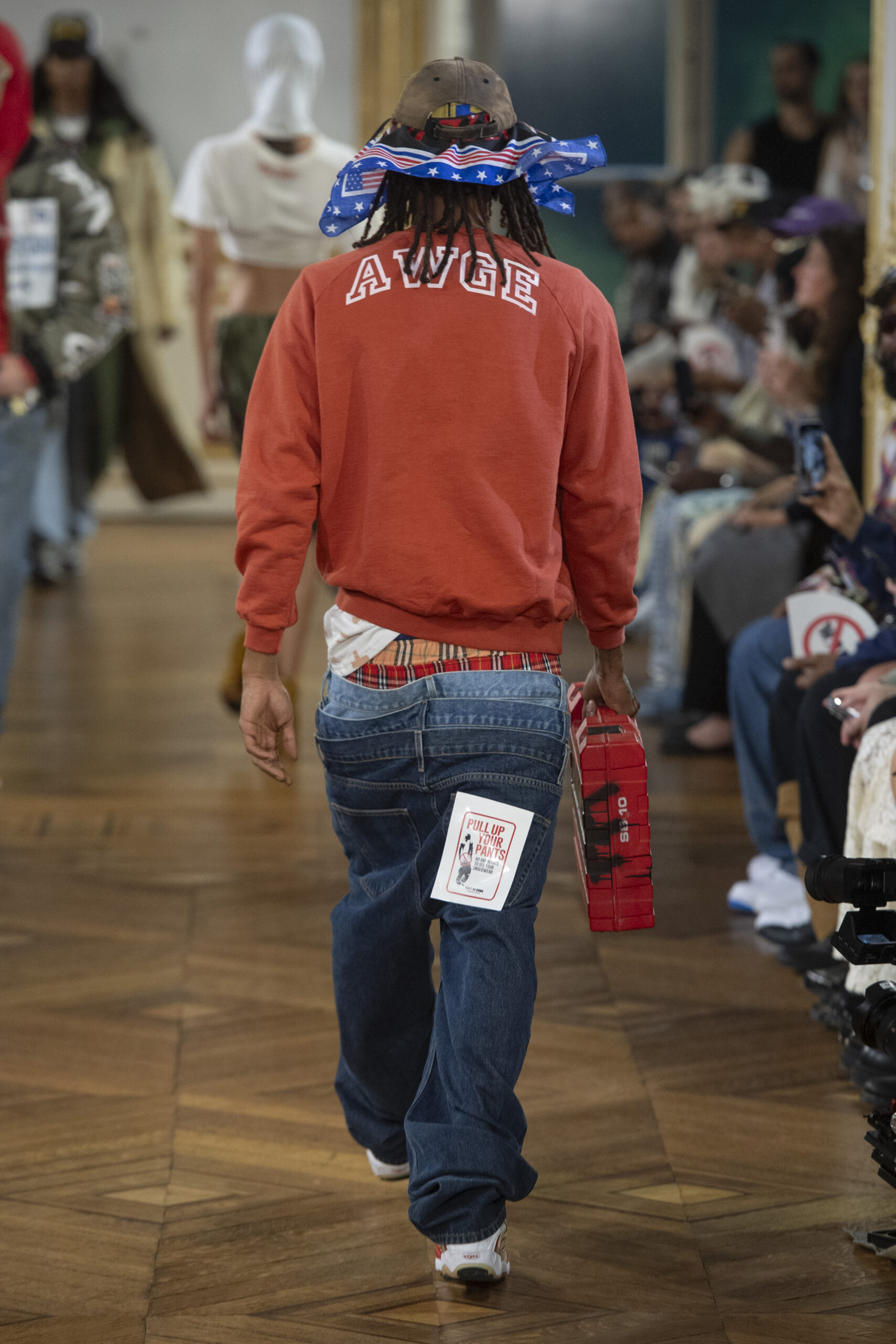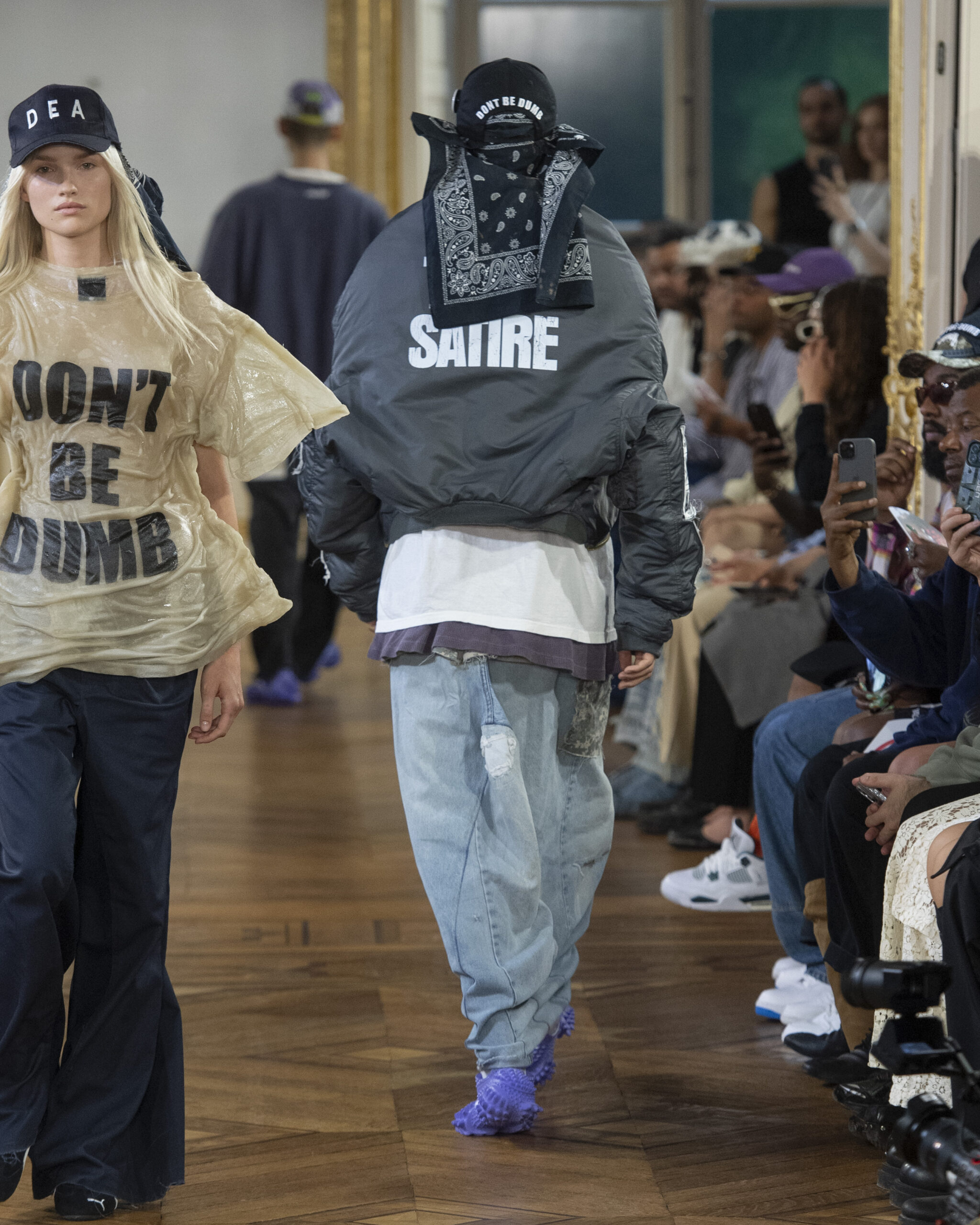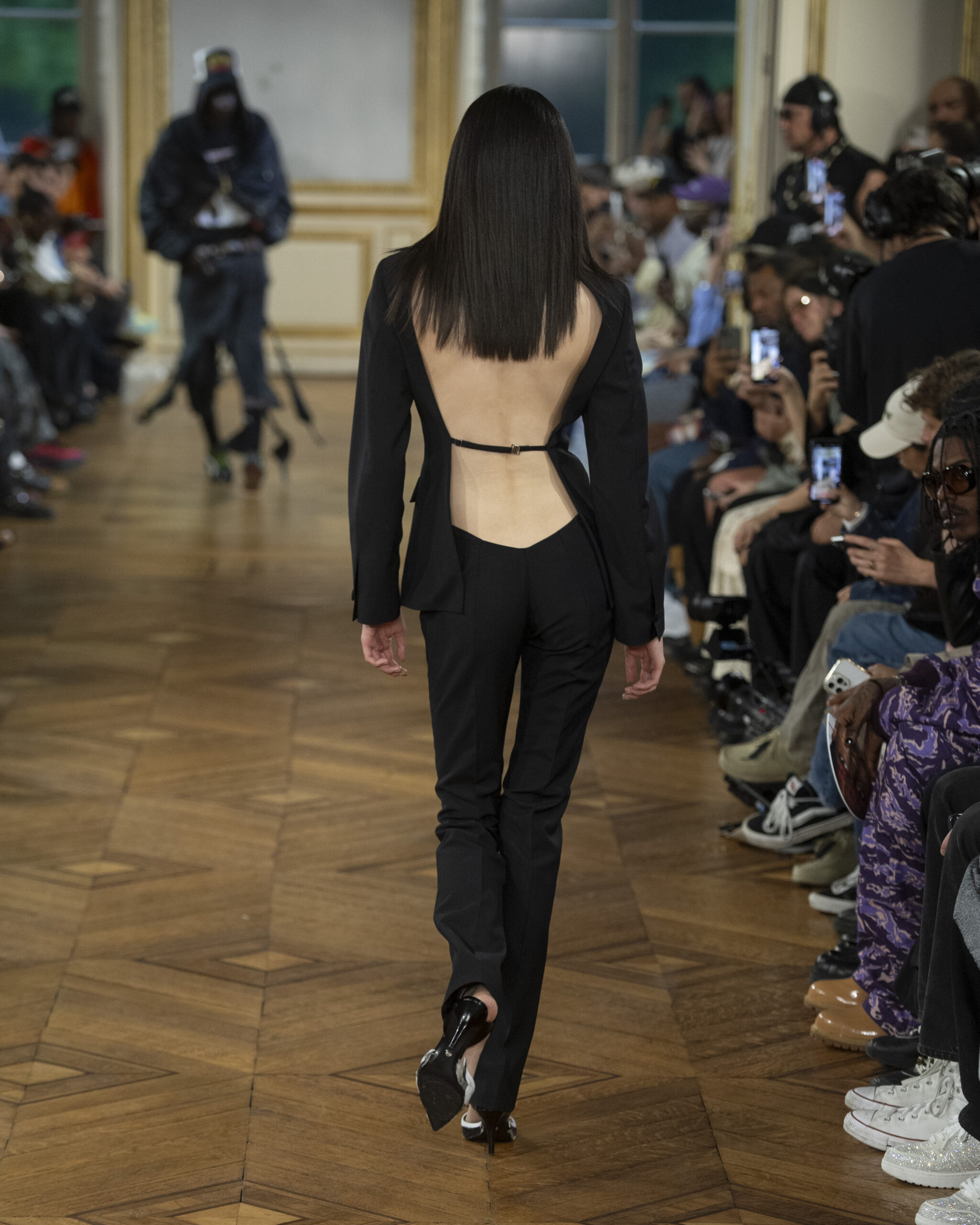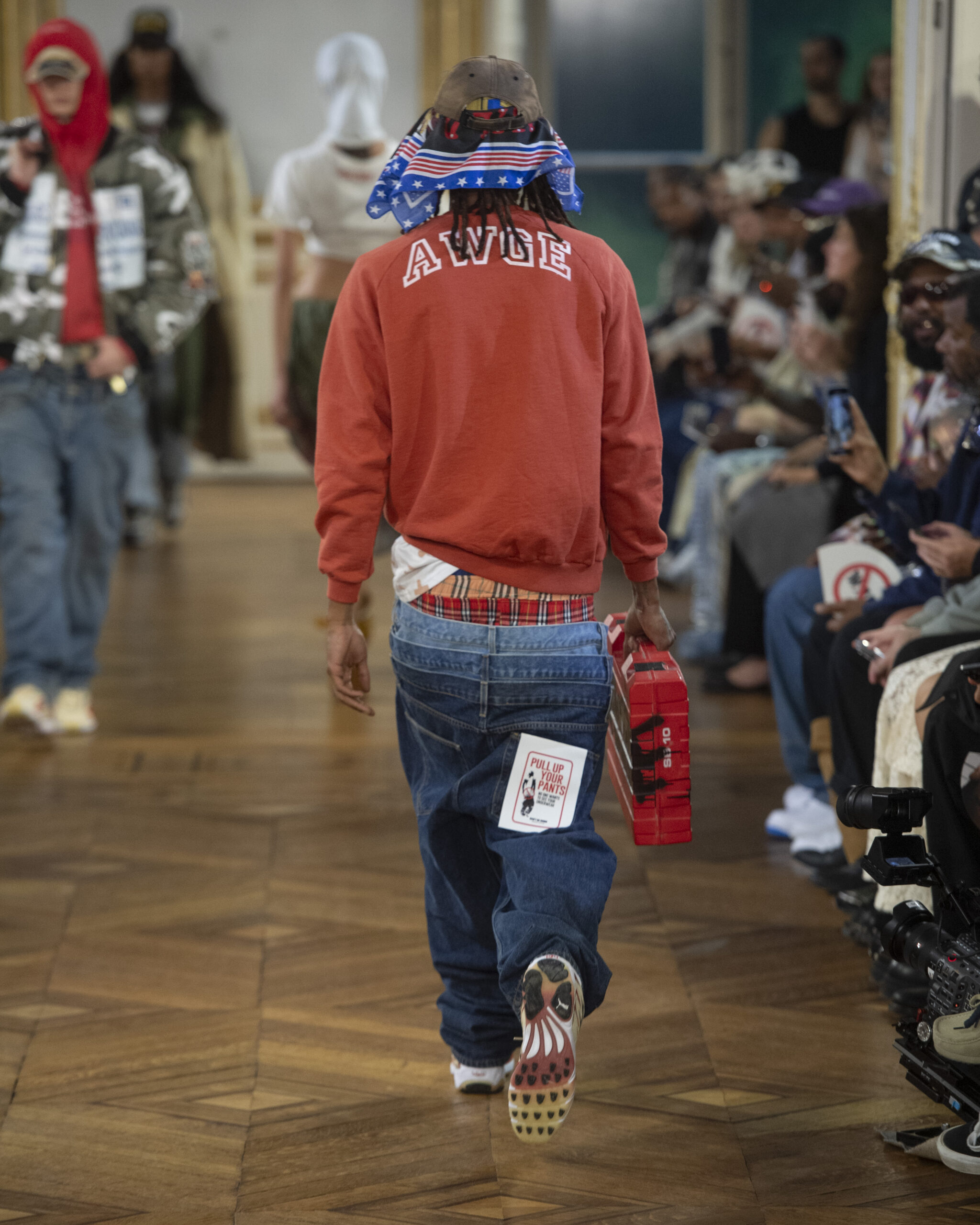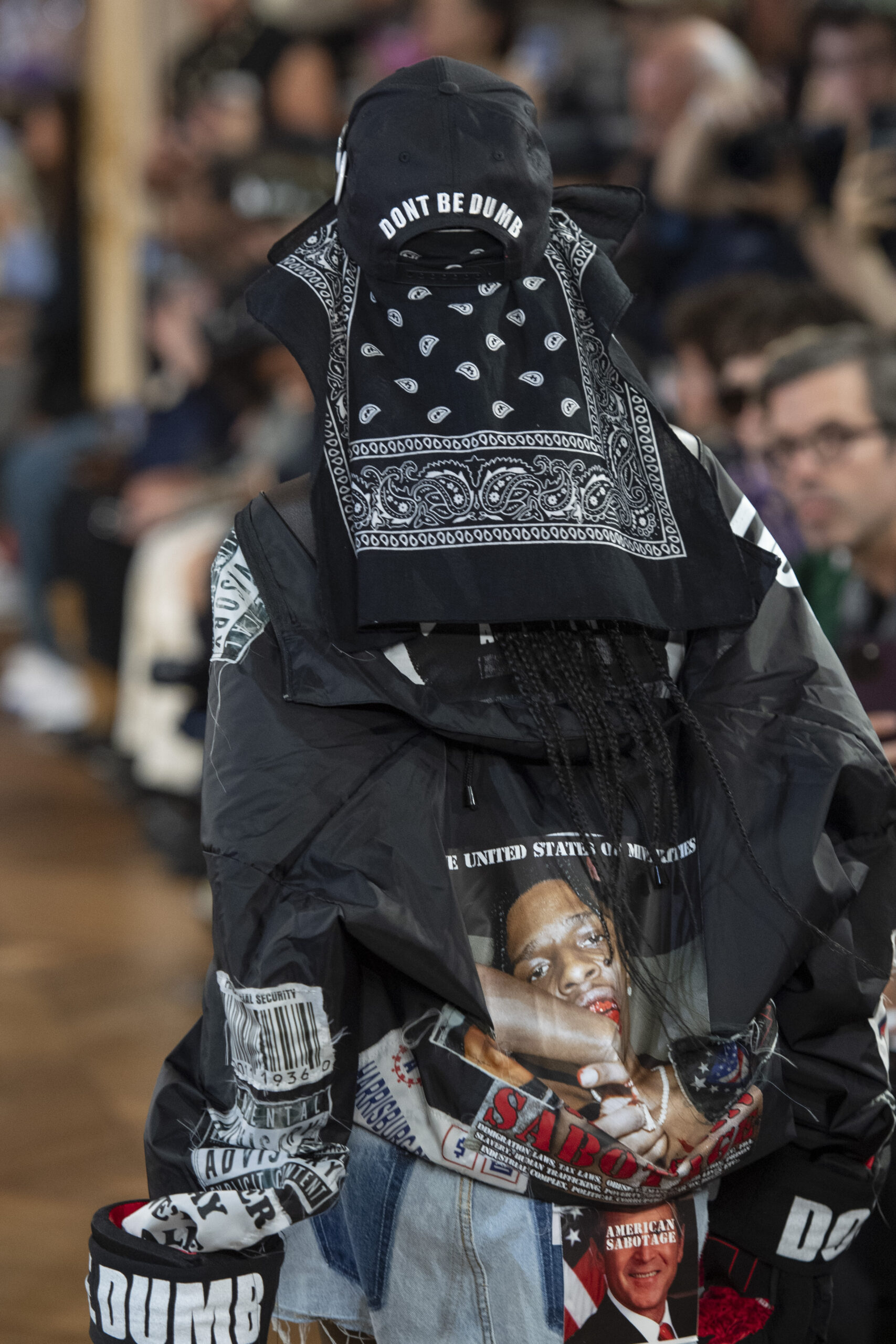 Le décor du défilé, comprenant des sacs poubelles transformés en chaises beanbag issues de la marque de mobilier Hommemade, en collaboration avec Crosby Studios, ajoutait une dimension immersive à cette expérience unique. Le défilé a été rythmé par la bande-son du prochain album d’A$AP Rocky, créant une synergie entre mode et musique.