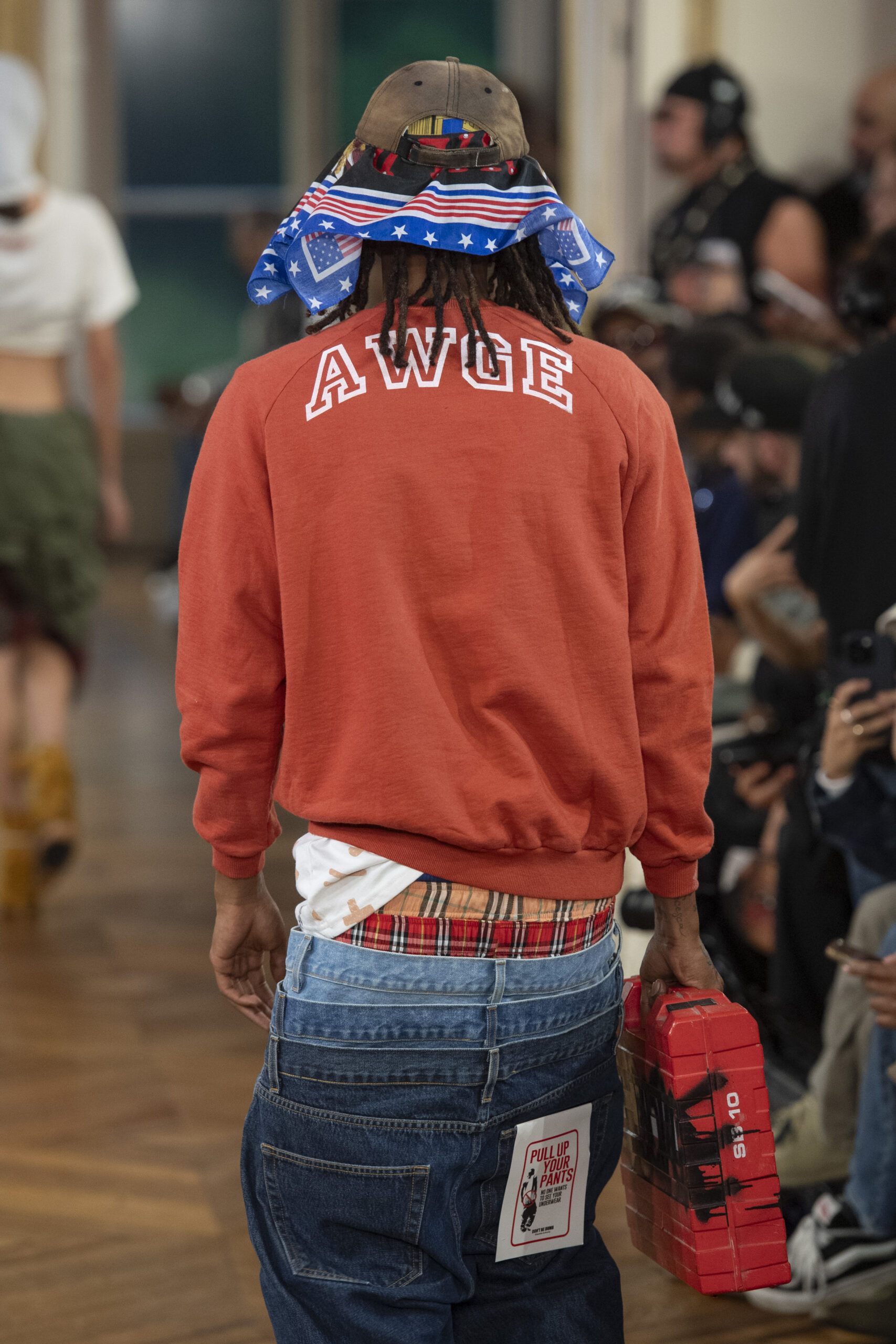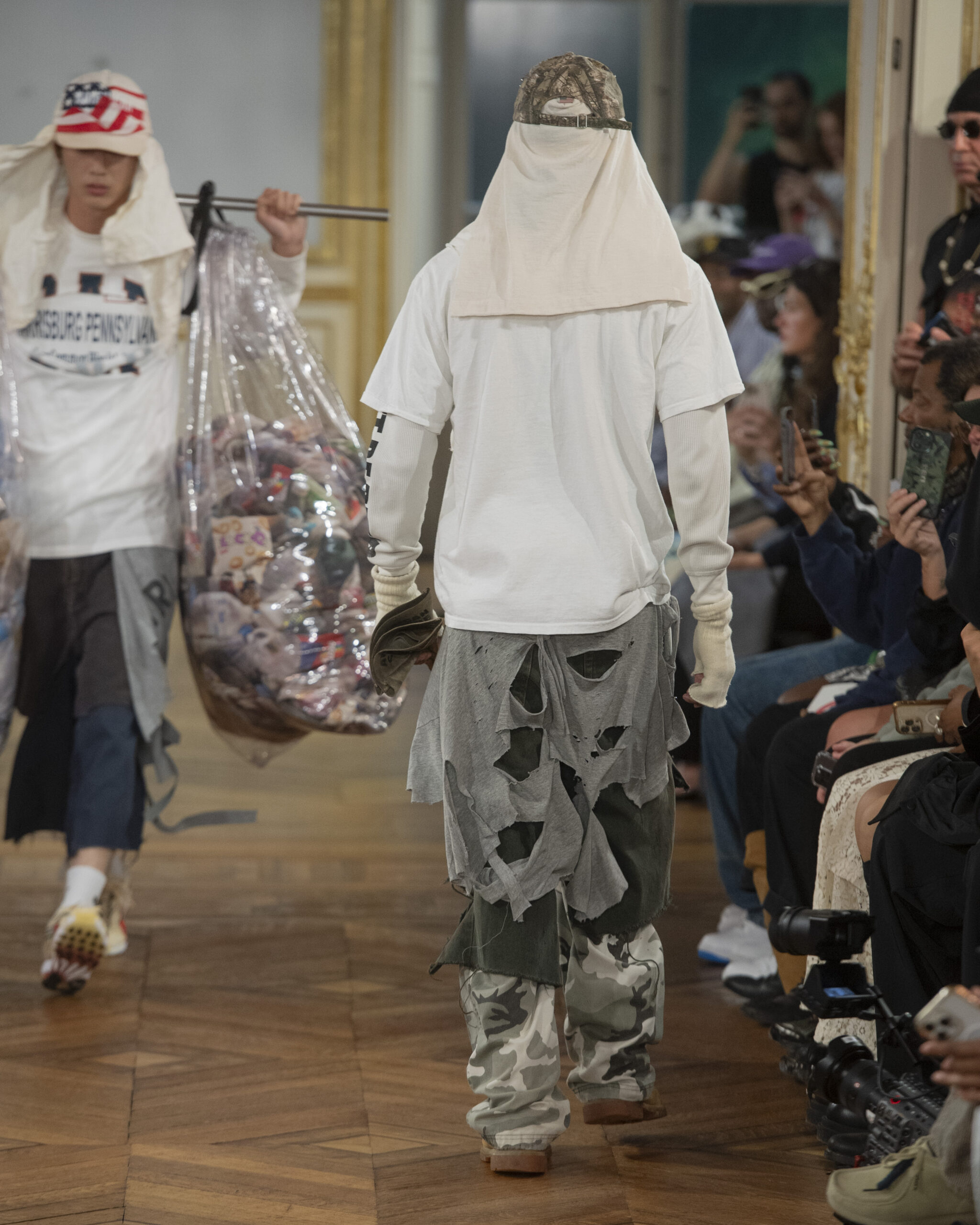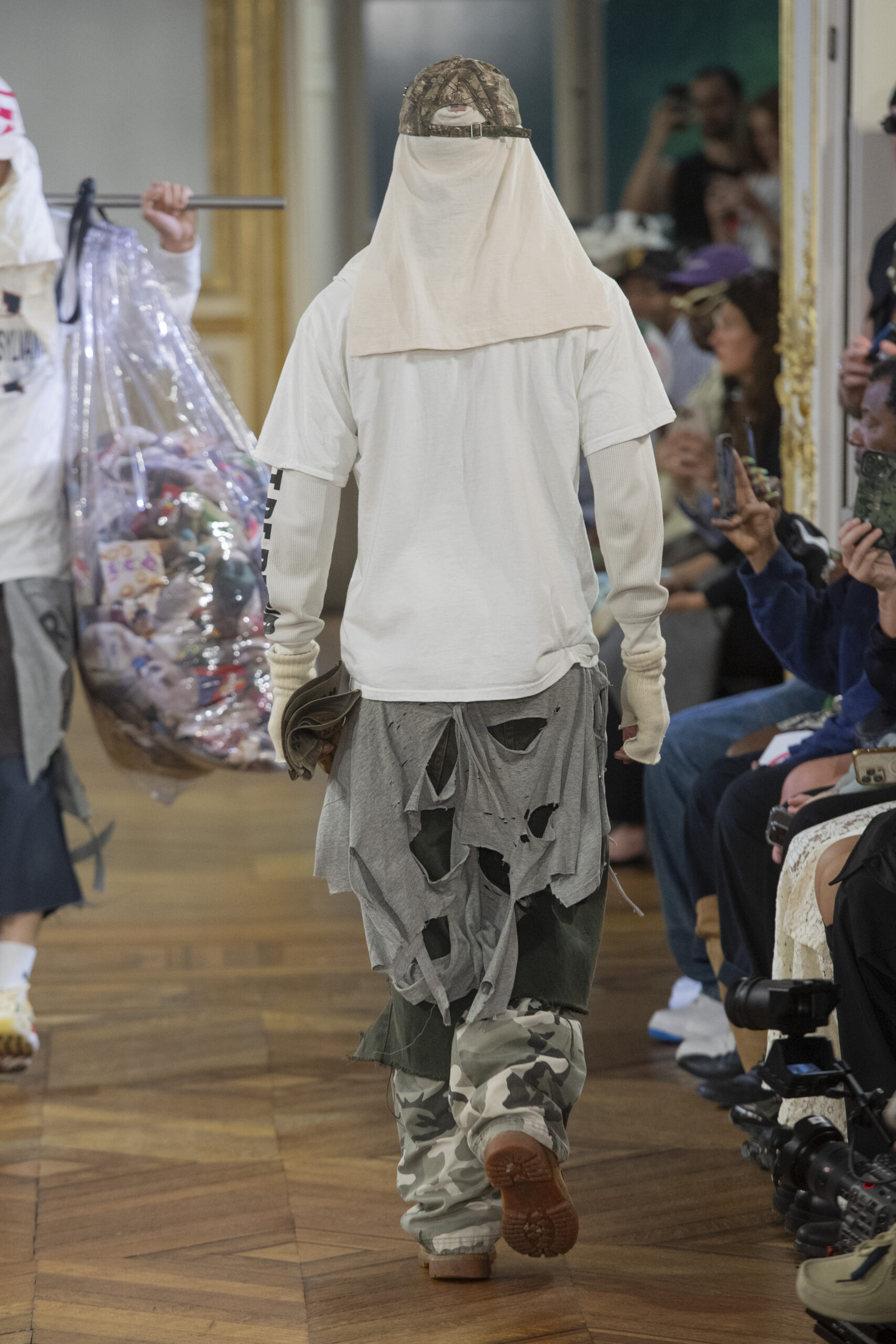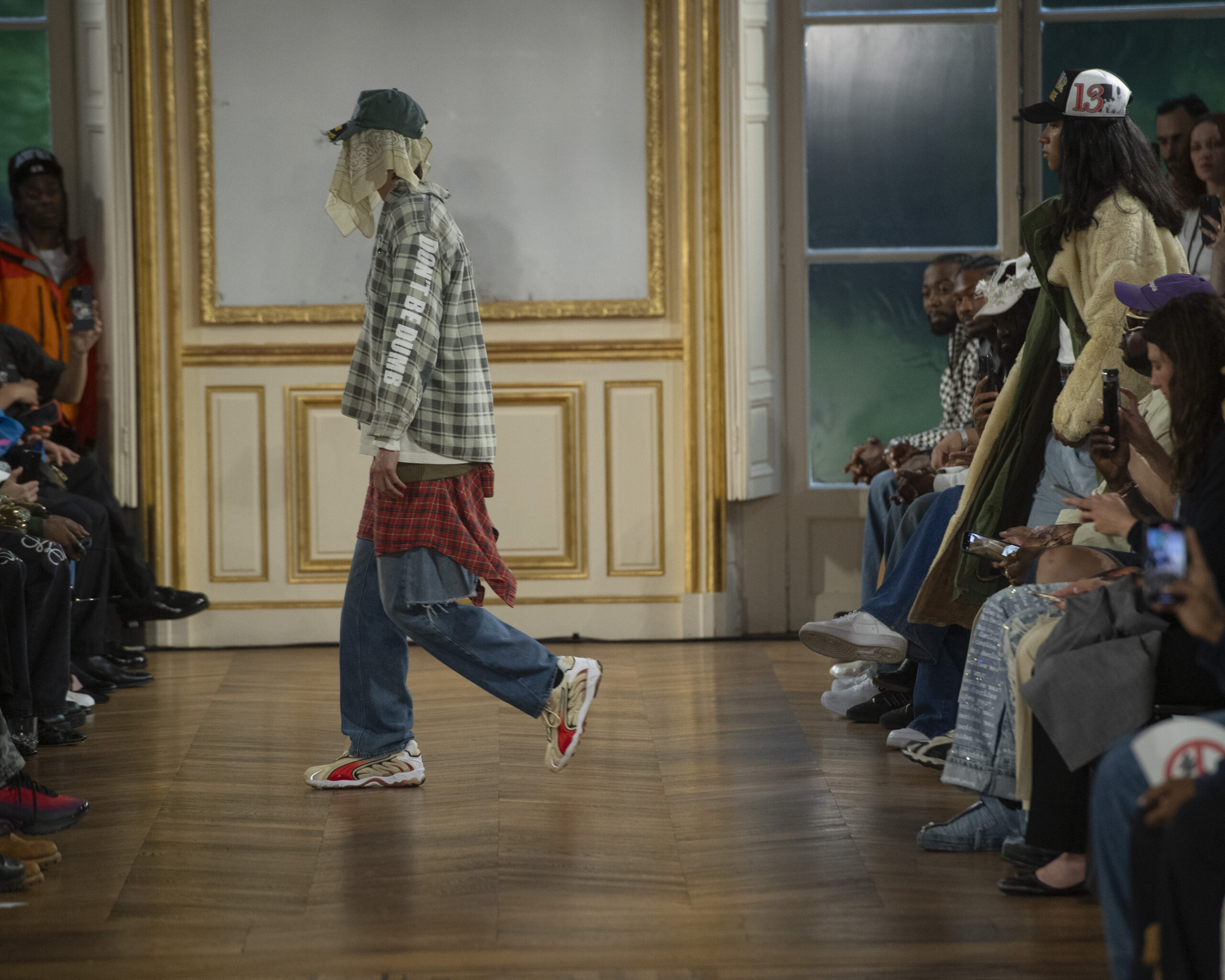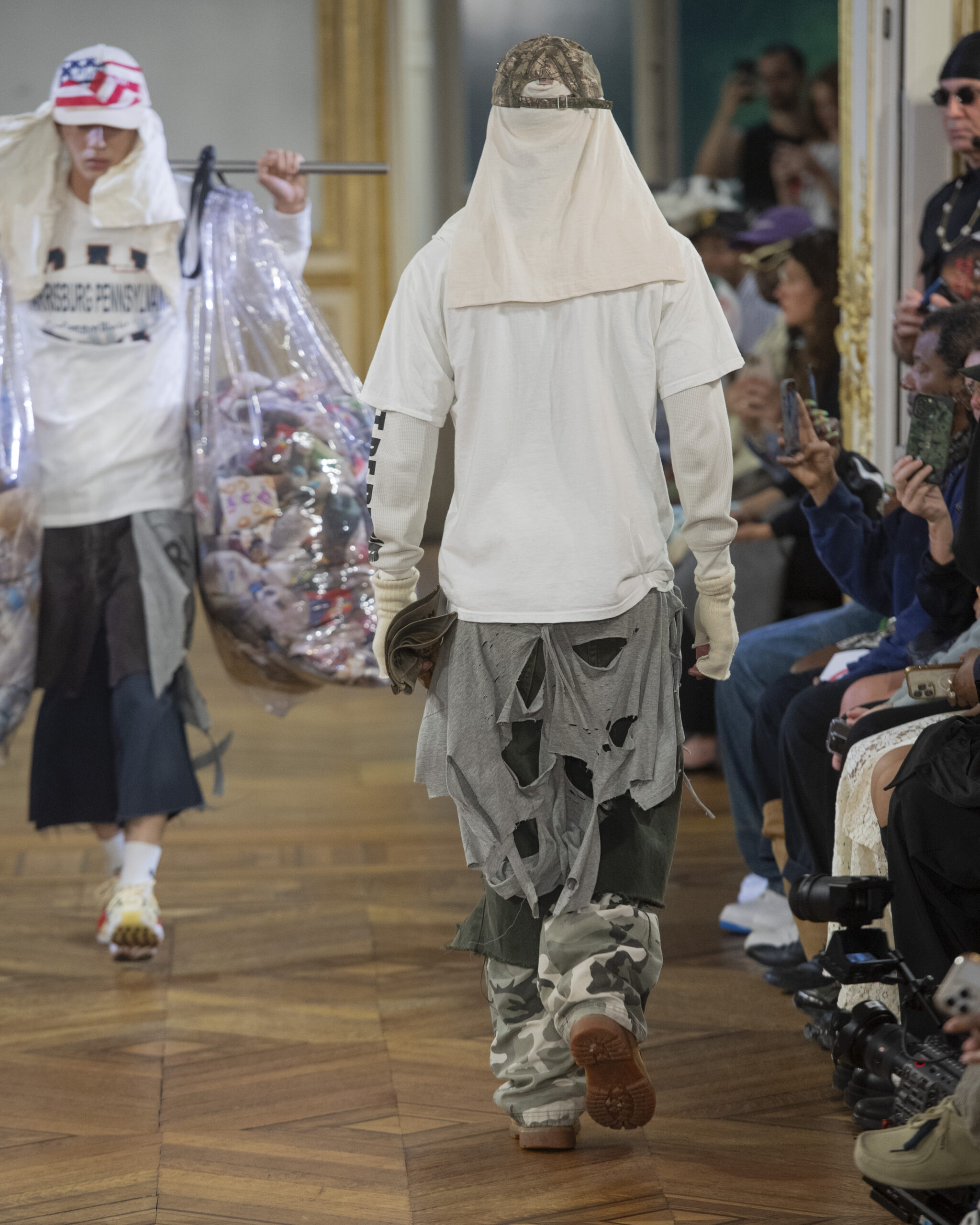 Le décor du défilé, comprenant des sacs poubelles transformés en chaises beanbag issues de la marque de mobilier Hommemade, en collaboration avec Crosby Studios, ajoutait une dimension immersive à cette expérience unique. Le défilé a été rythmé par la bande-son du prochain album d’A$AP Rocky, créant une synergie entre mode et musique.