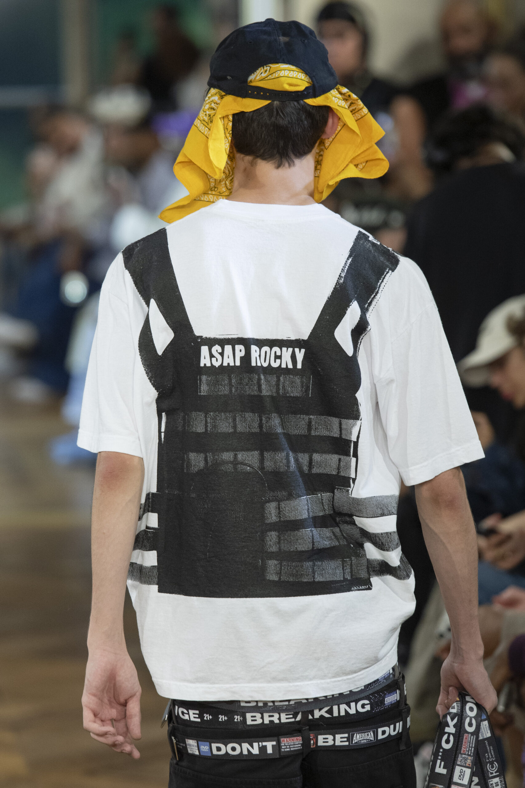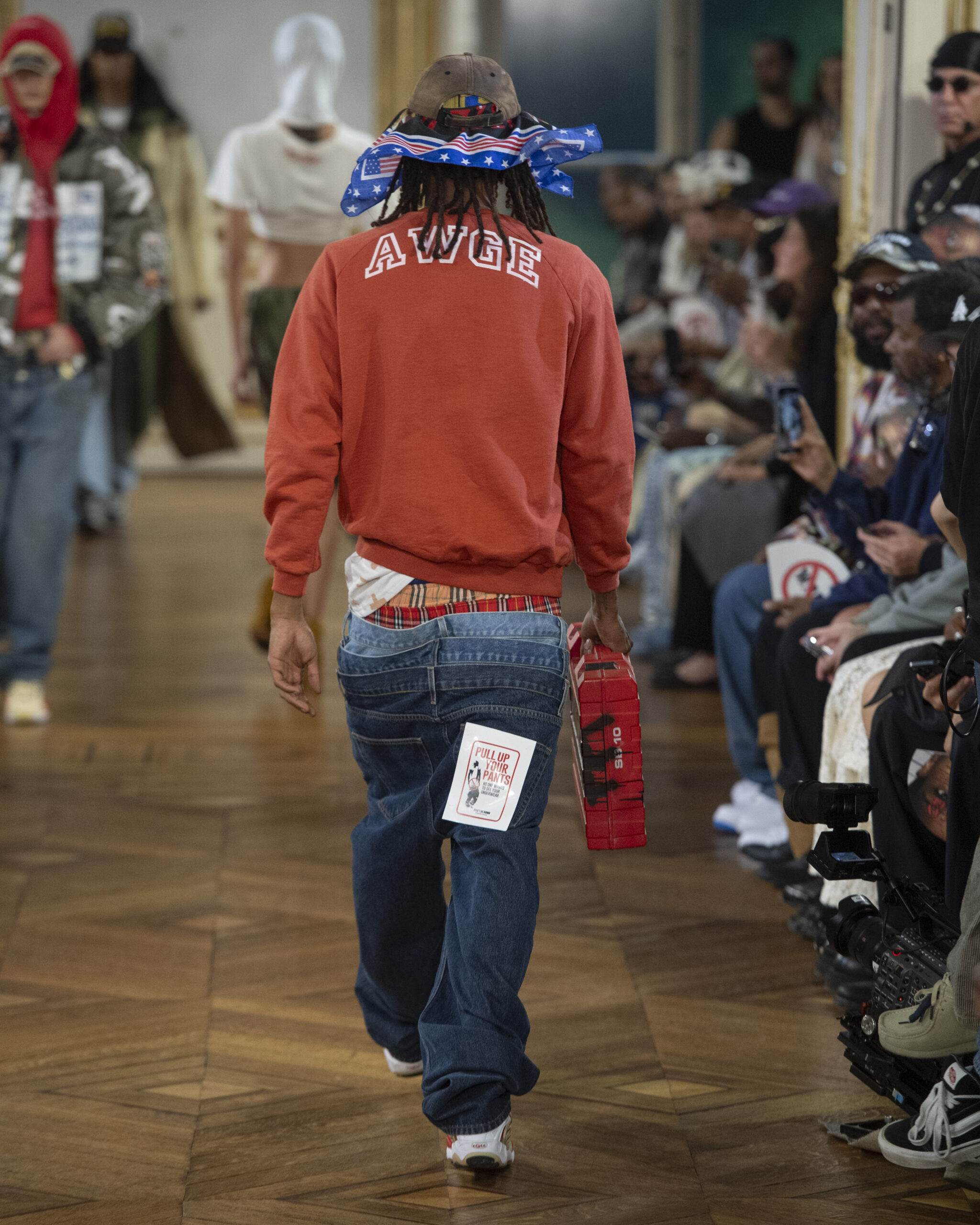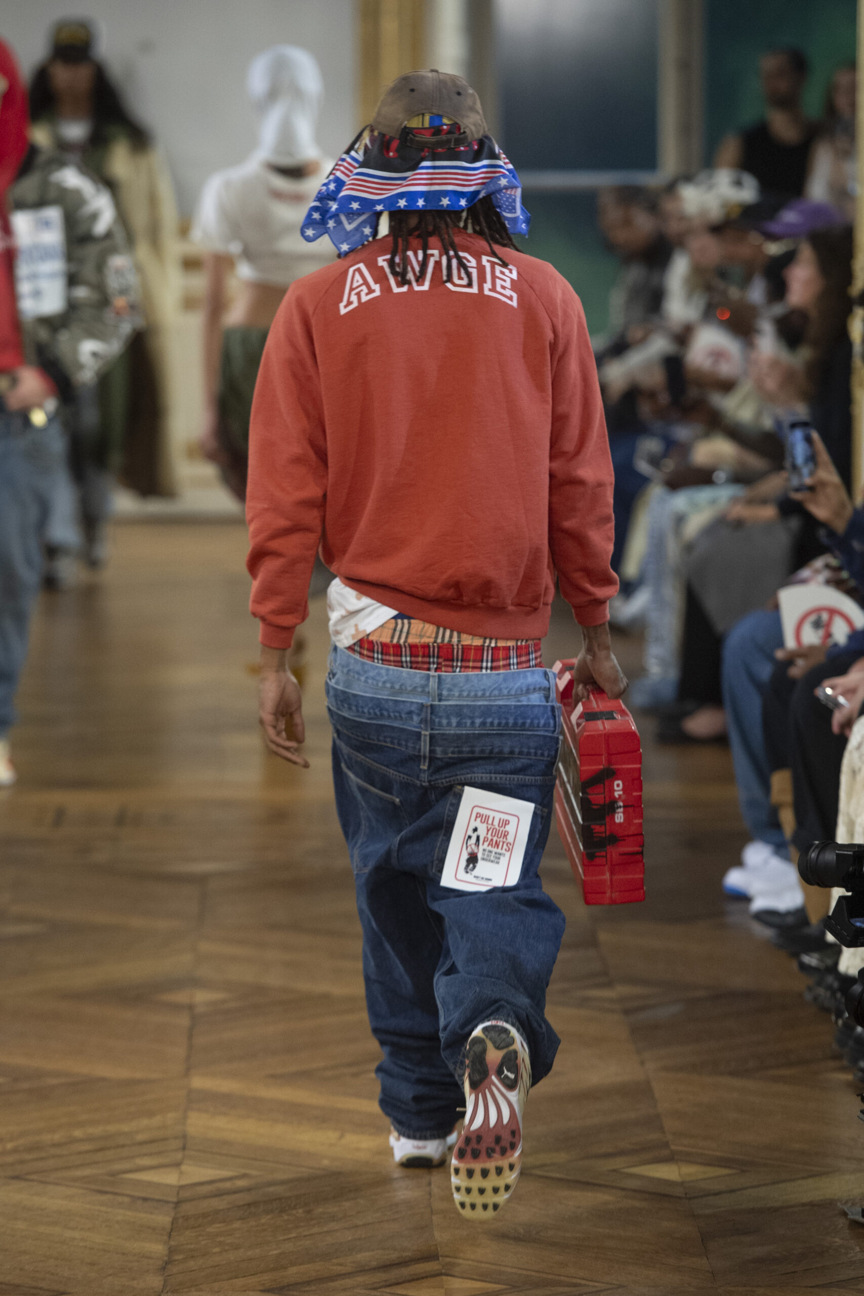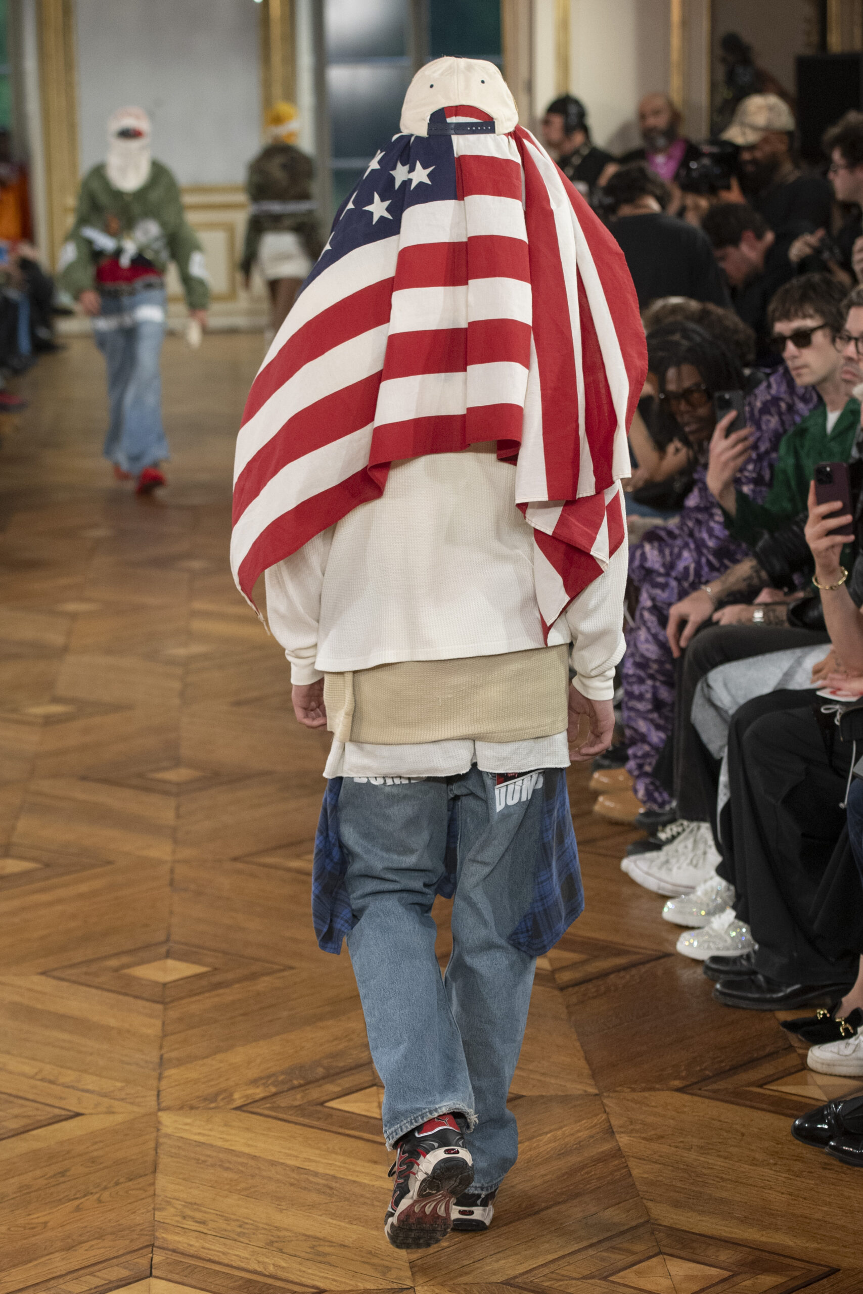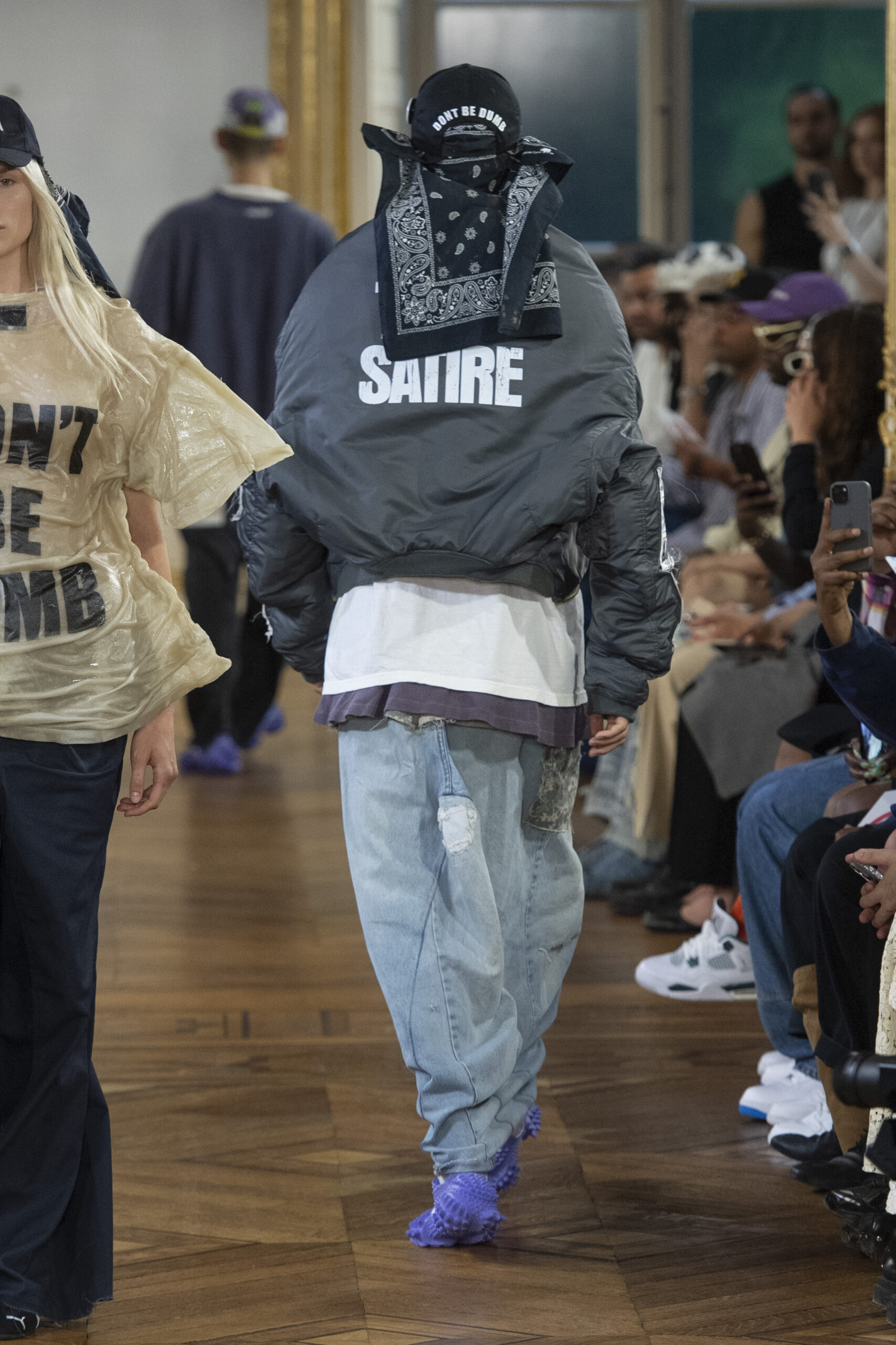 Le décor du défilé, comprenant des sacs poubelles transformés en chaises beanbag issues de la marque de mobilier Hommemade, en collaboration avec Crosby Studios, ajoutait une dimension immersive à cette expérience unique. Le défilé a été rythmé par la bande-son du prochain album d’A$AP Rocky, créant une synergie entre mode et musique.