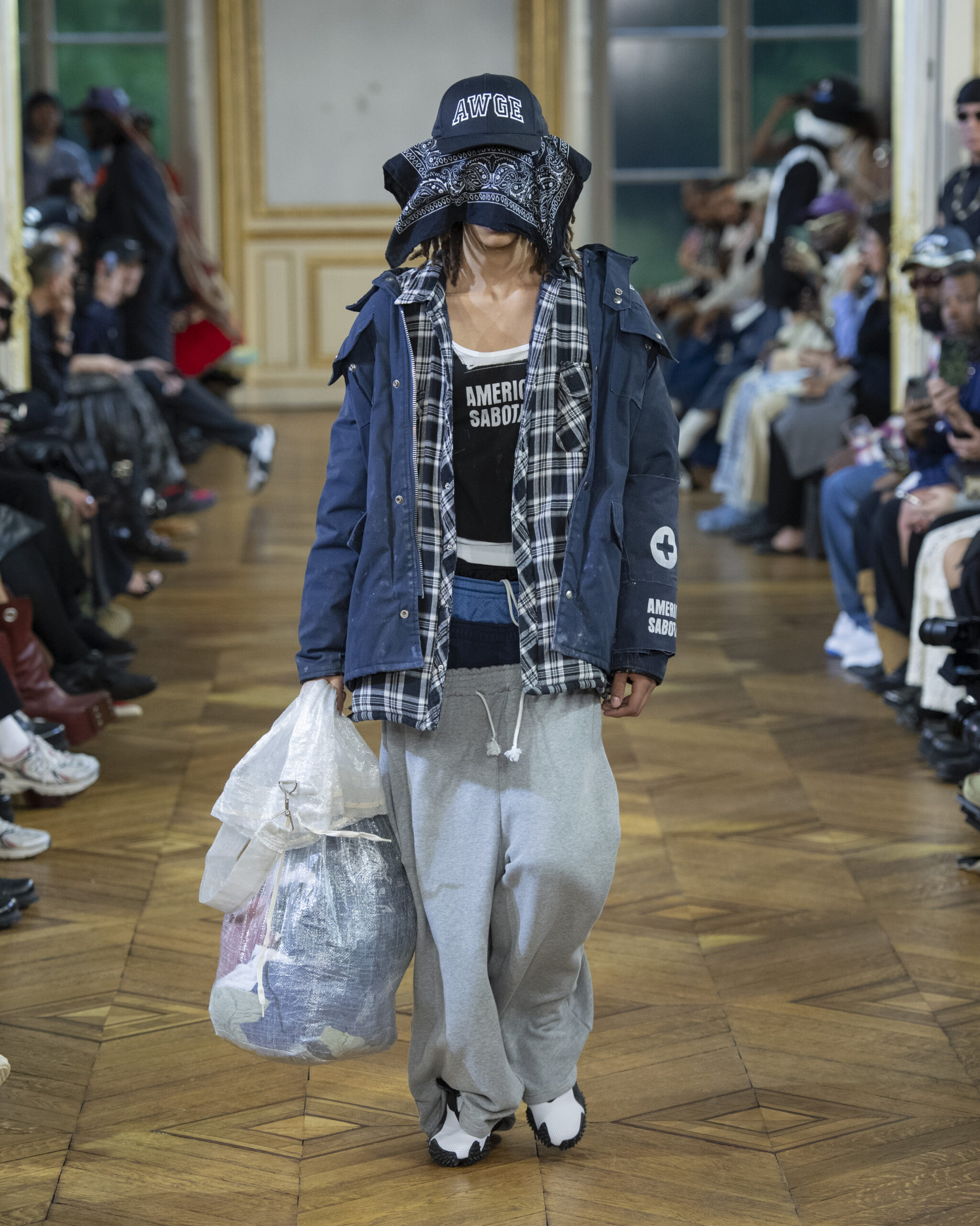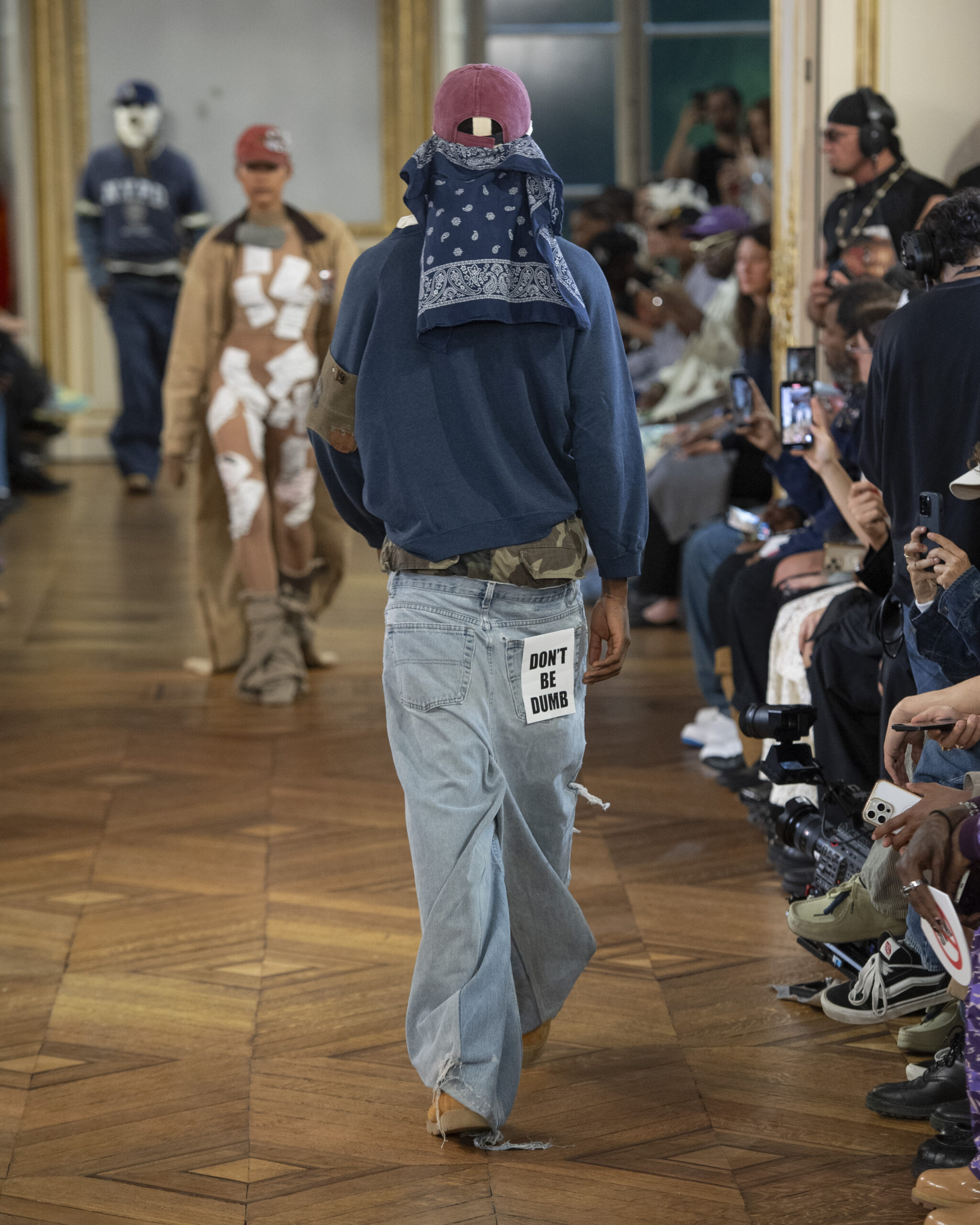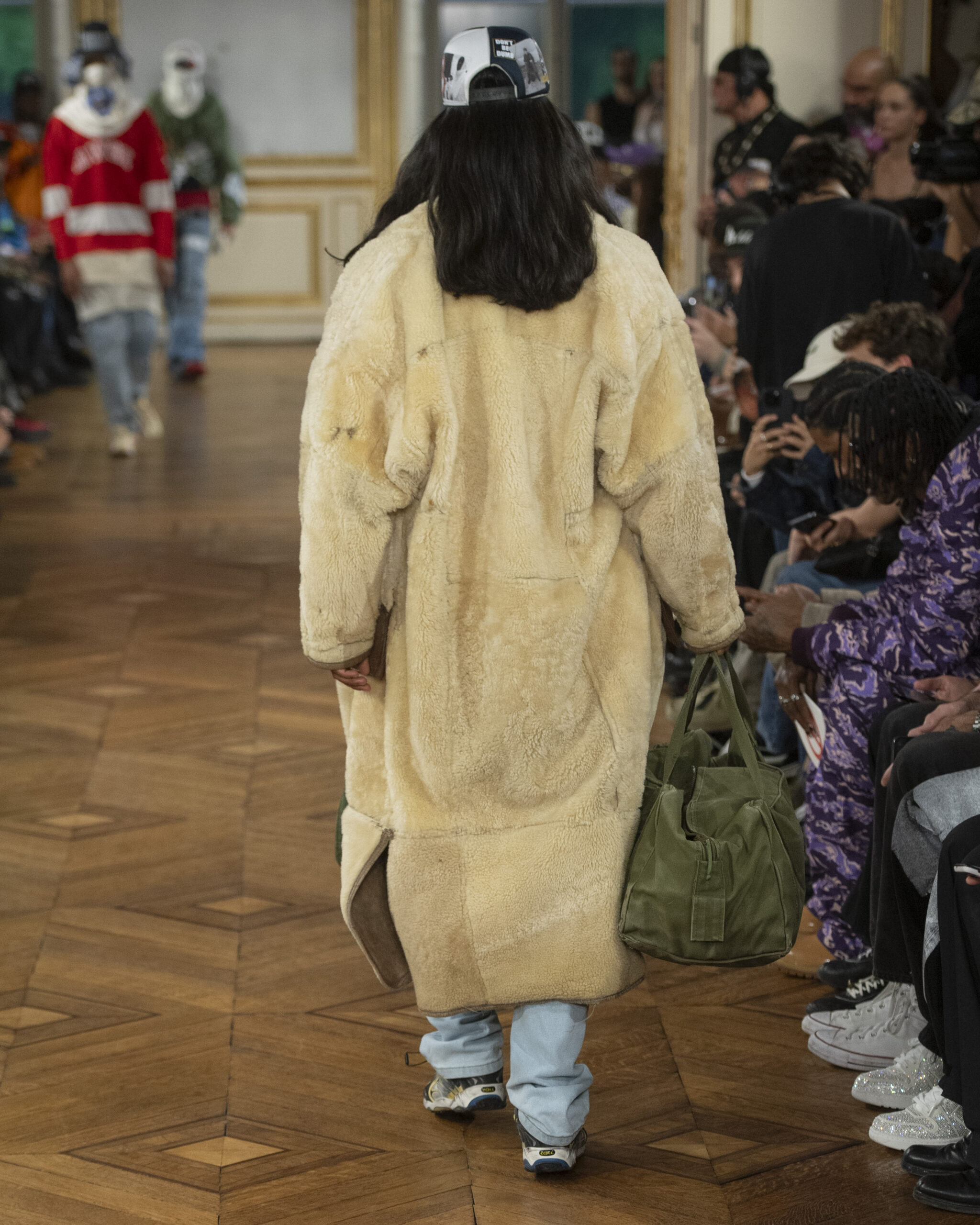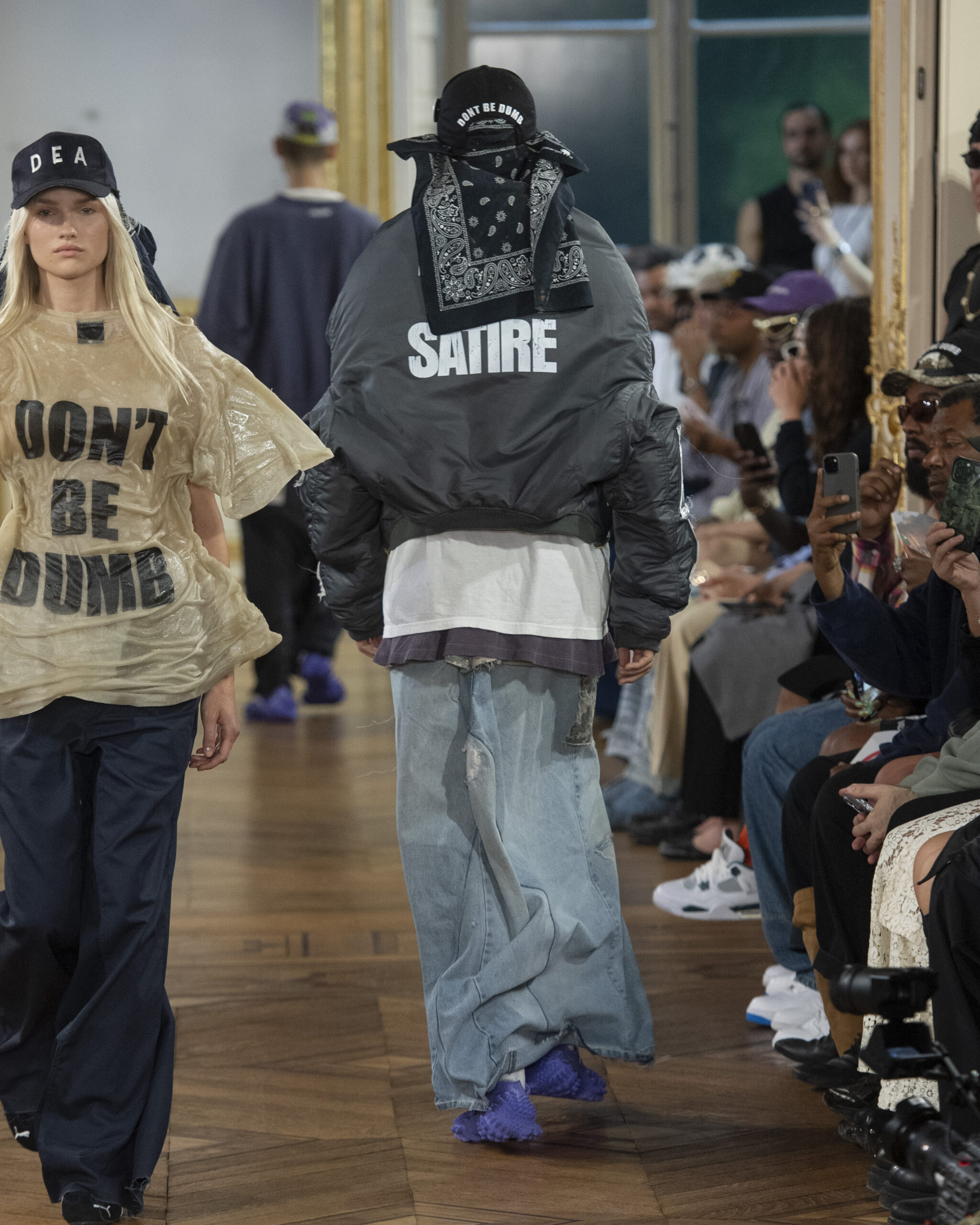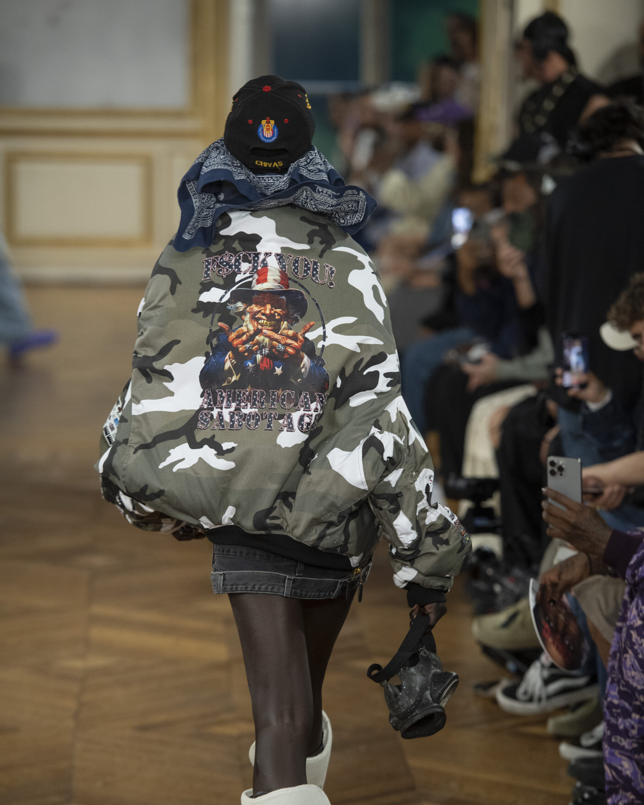 Le décor du défilé, comprenant des sacs poubelles transformés en chaises beanbag issues de la marque de mobilier Hommemade, en collaboration avec Crosby Studios, ajoutait une dimension immersive à cette expérience unique. Le défilé a été rythmé par la bande-son du prochain album d’A$AP Rocky, créant une synergie entre mode et musique.