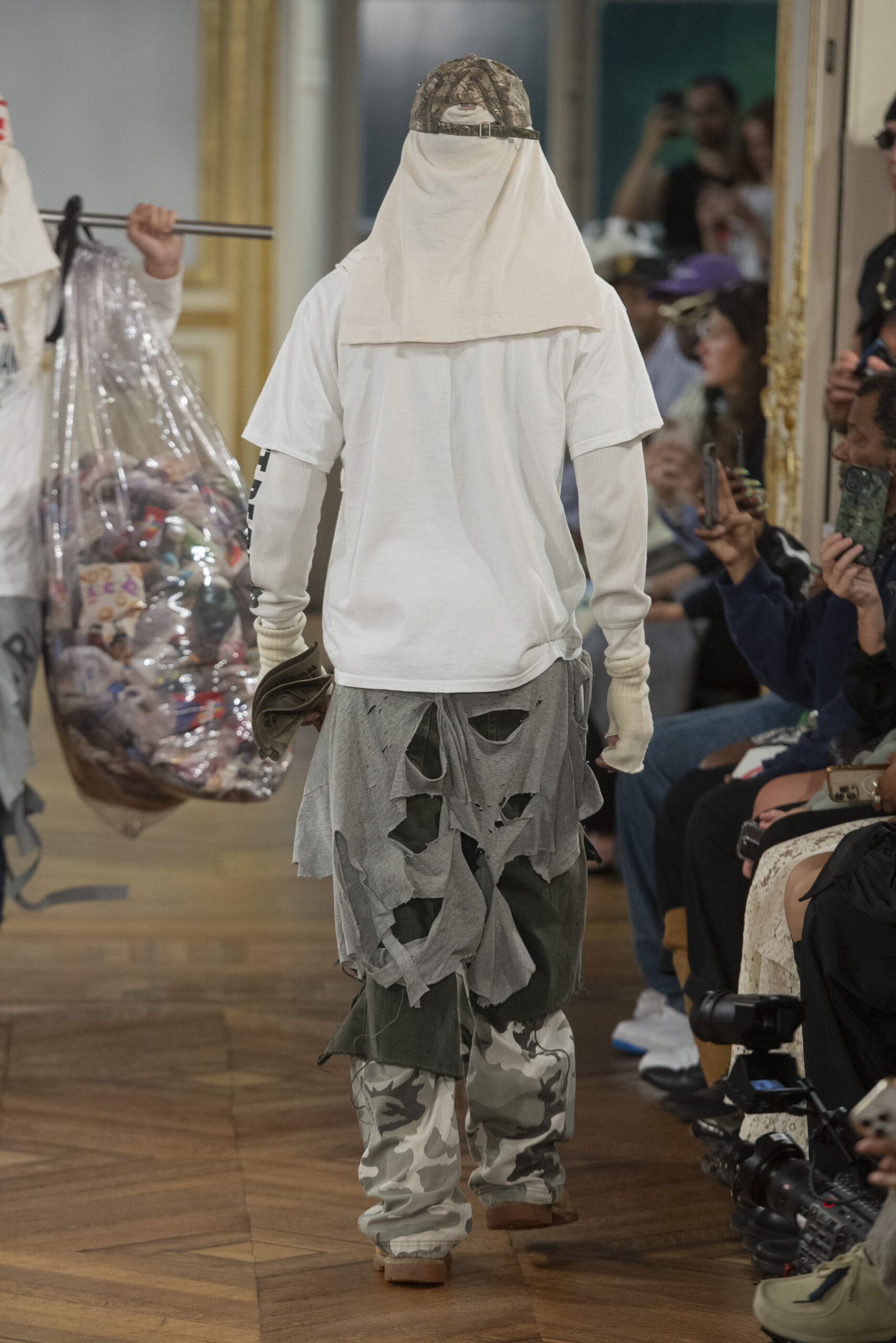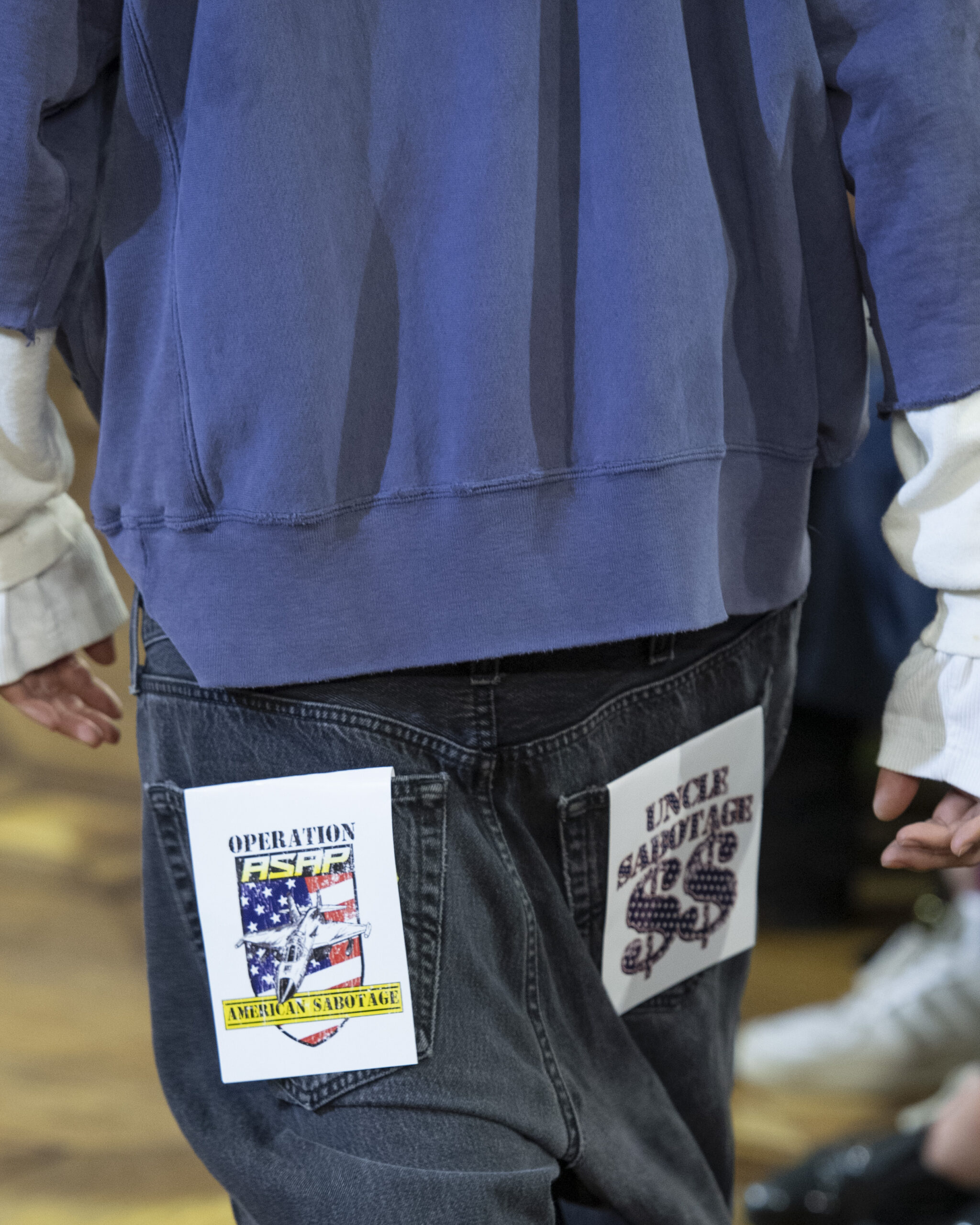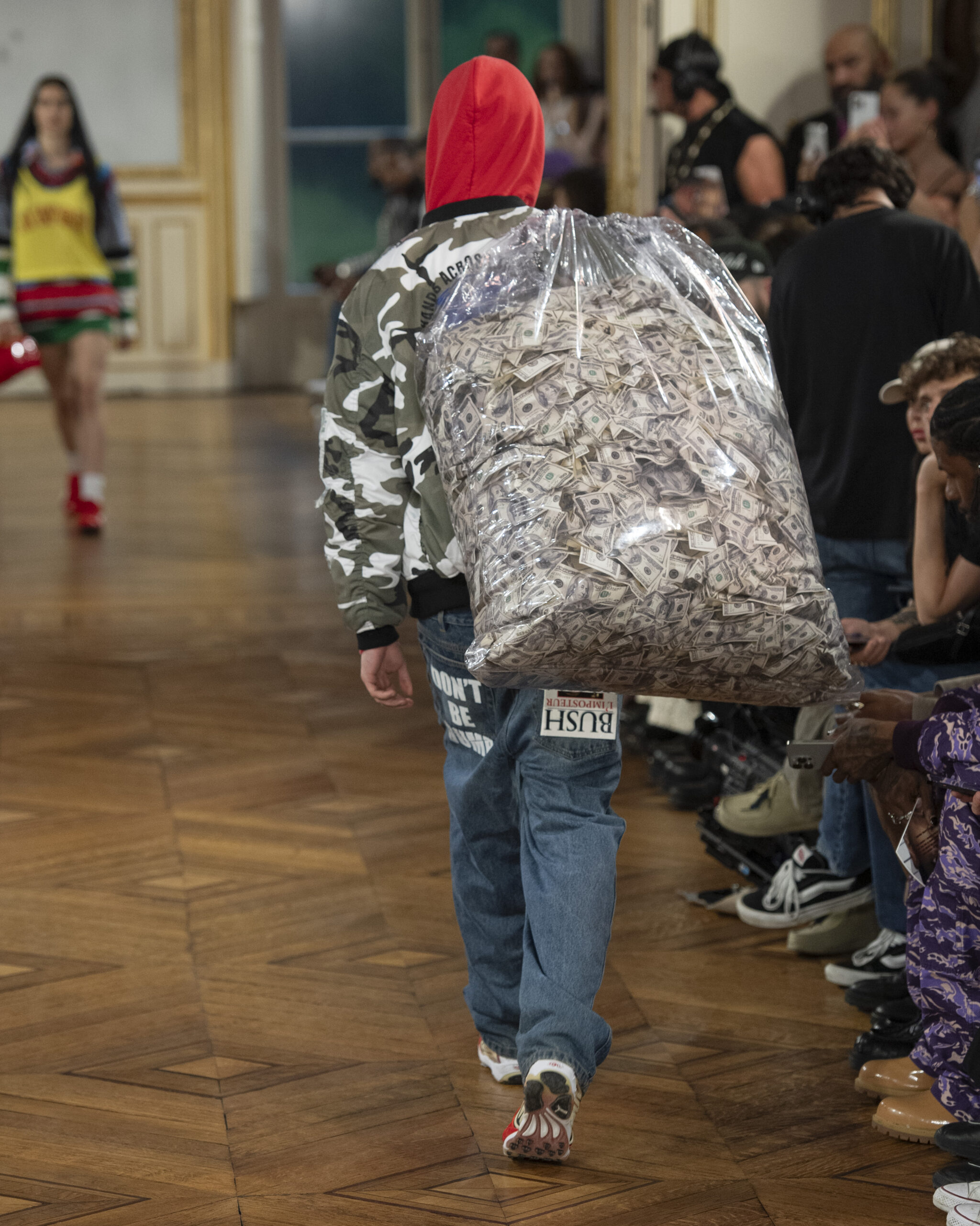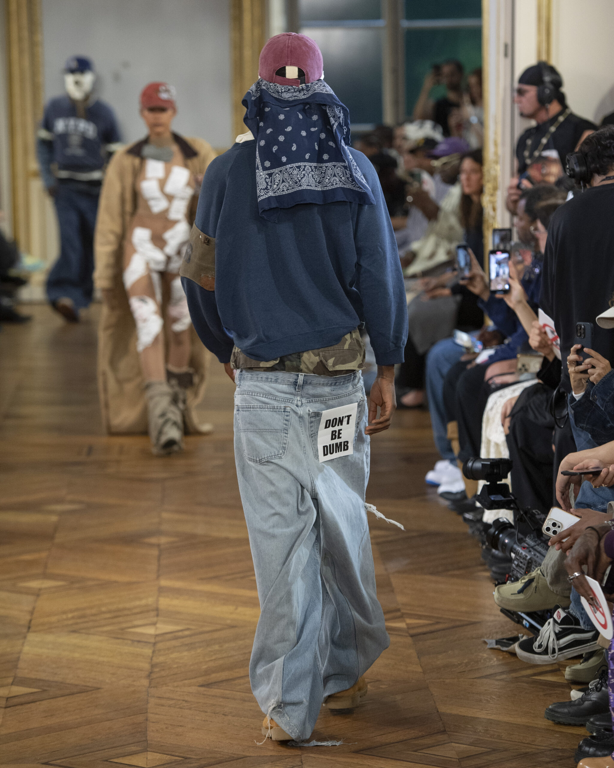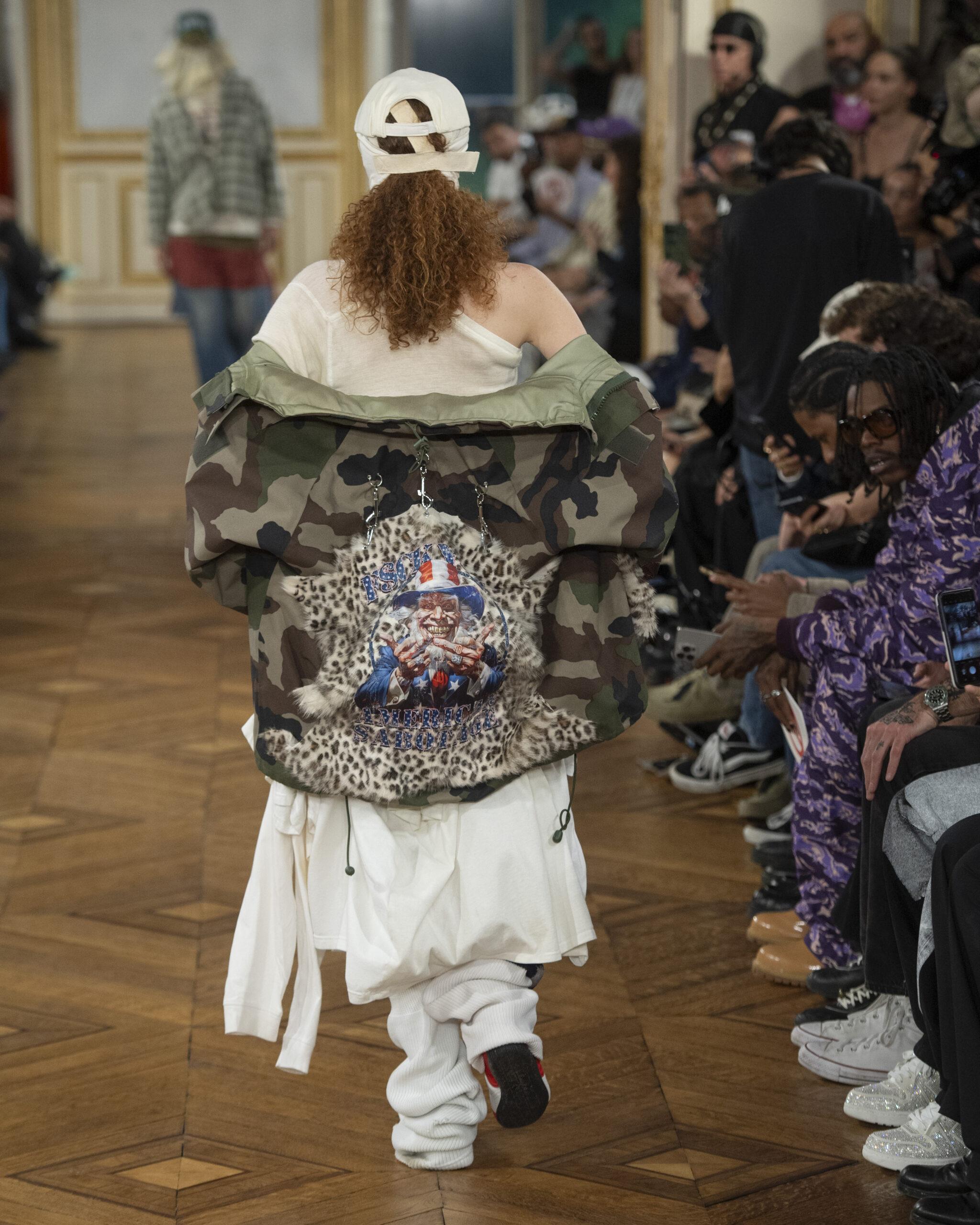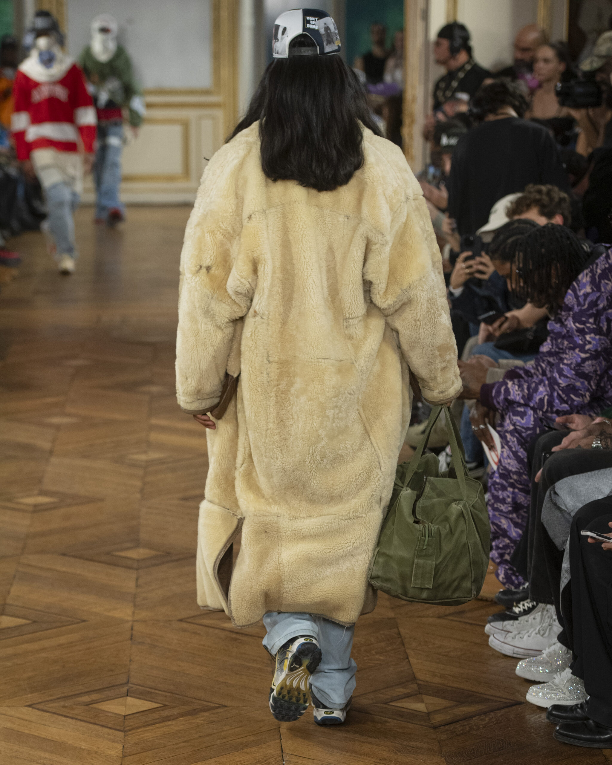Le décor du défilé, comprenant des sacs poubelles transformés en chaises beanbag issues de la marque de mobilier Hommemade, en collaboration avec Crosby Studios, ajoutait une dimension immersive à cette expérience unique. Le défilé a été rythmé par la bande-son du prochain album d’A$AP Rocky, créant une synergie entre mode et musique.