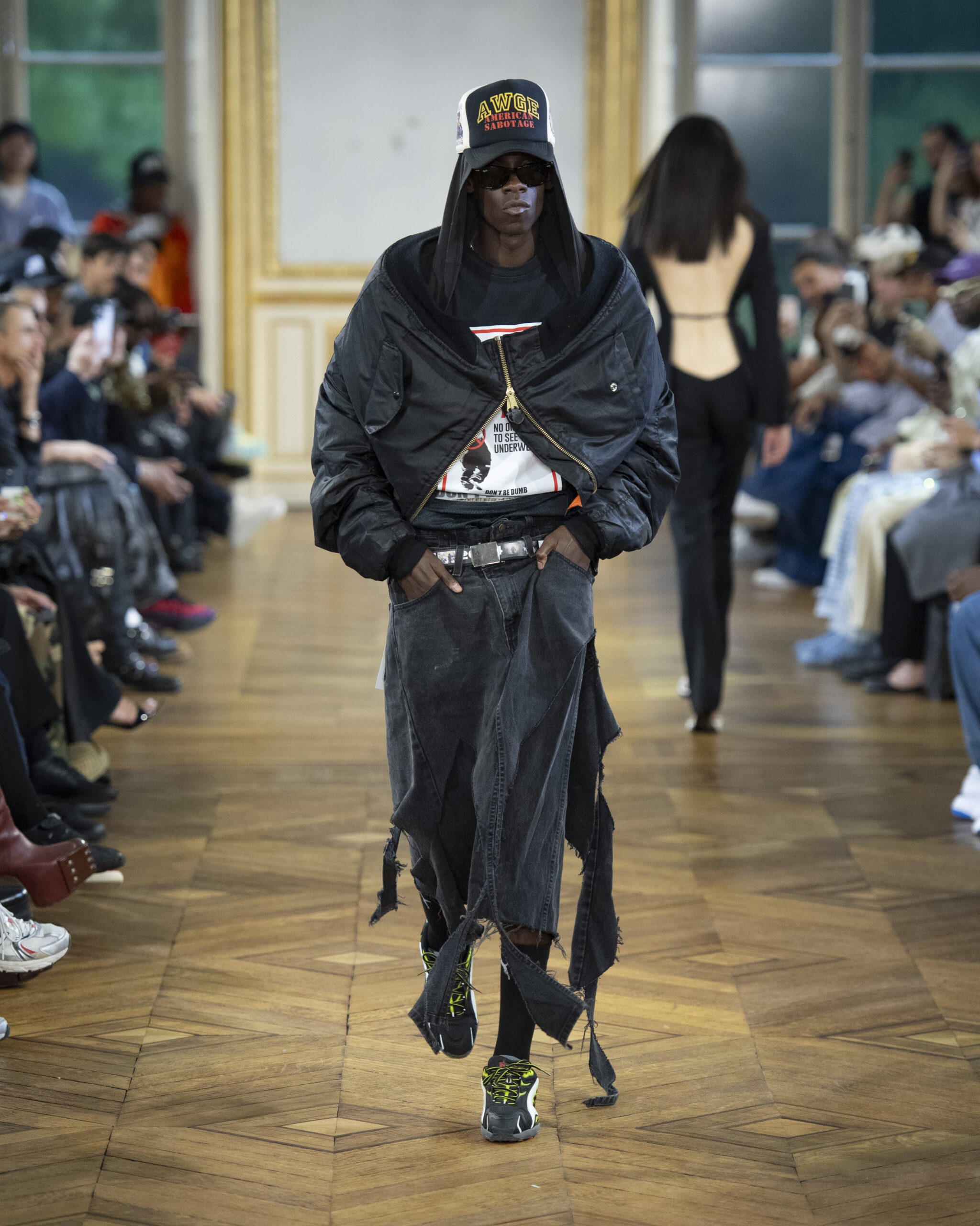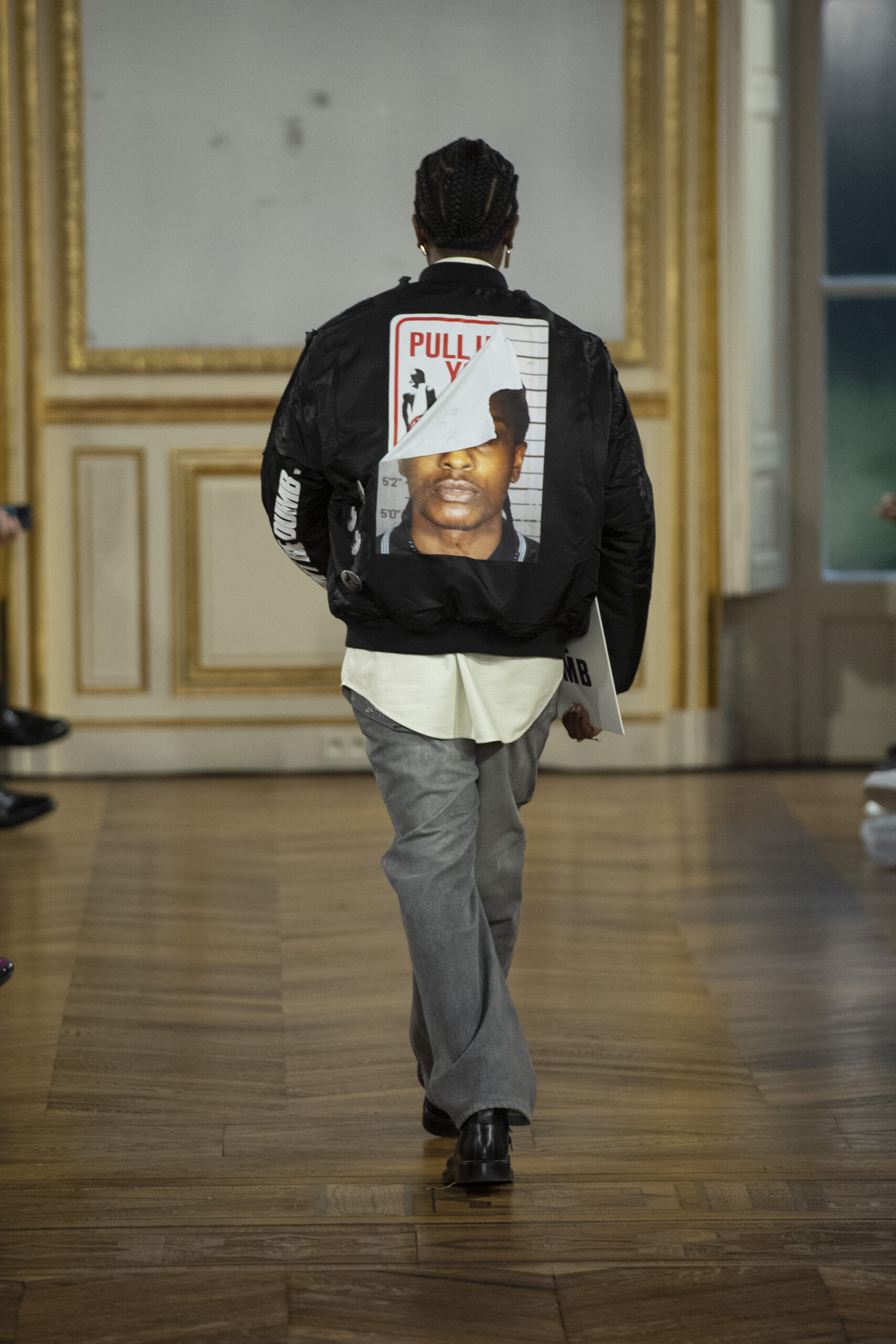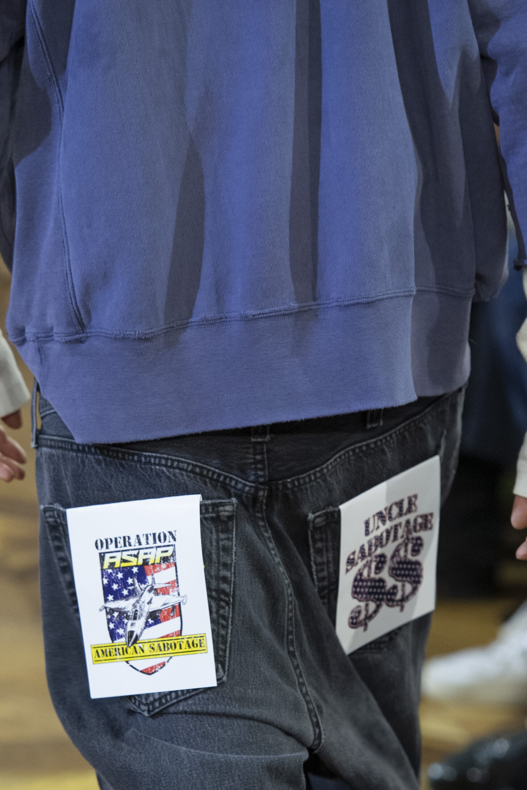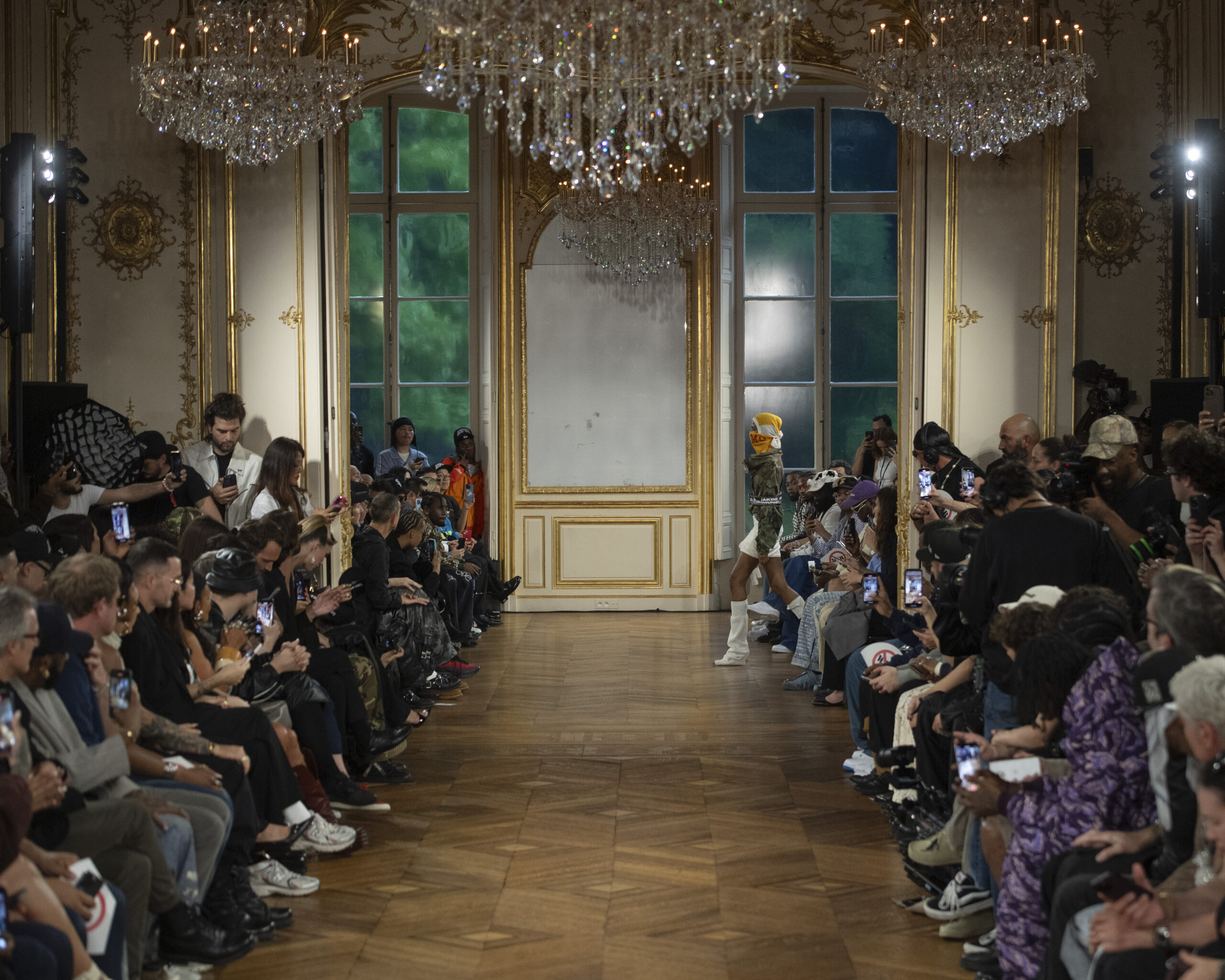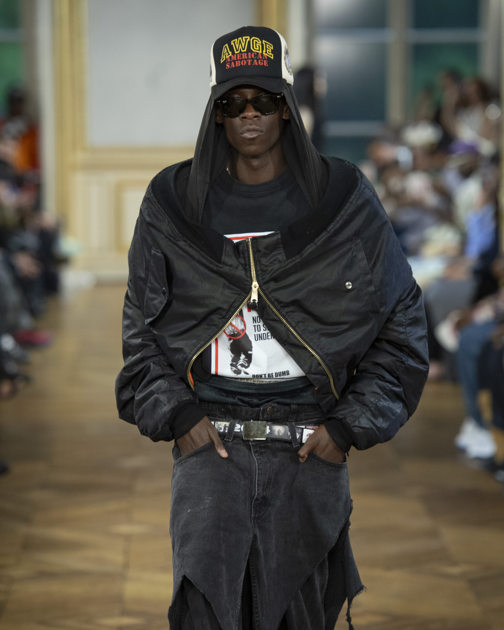 Le décor du défilé, comprenant des sacs poubelles transformés en chaises beanbag issues de la marque de mobilier Hommemade, en collaboration avec Crosby Studios, ajoutait une dimension immersive à cette expérience unique. Le défilé a été rythmé par la bande-son du prochain album d’A$AP Rocky, créant une synergie entre mode et musique.