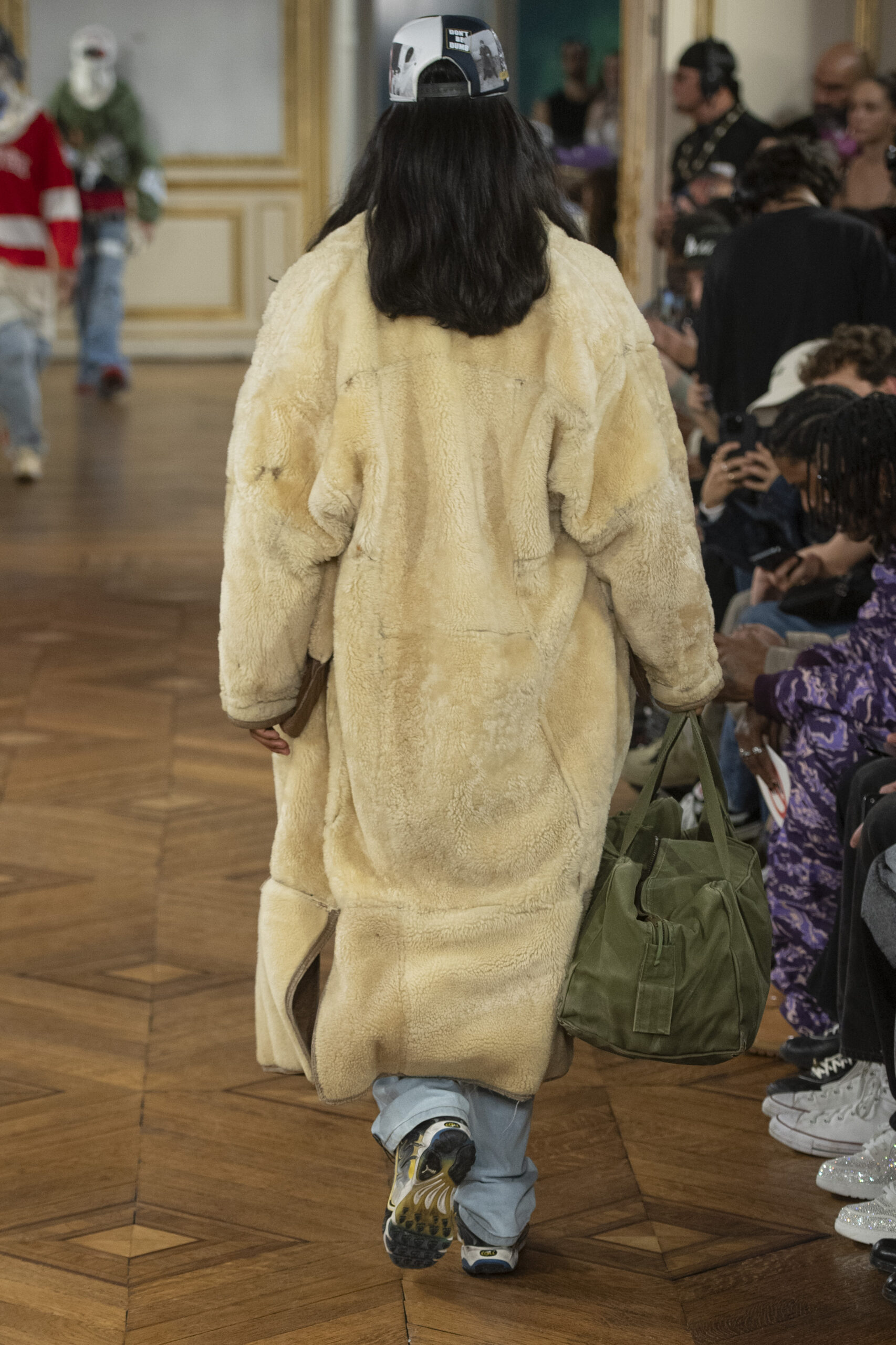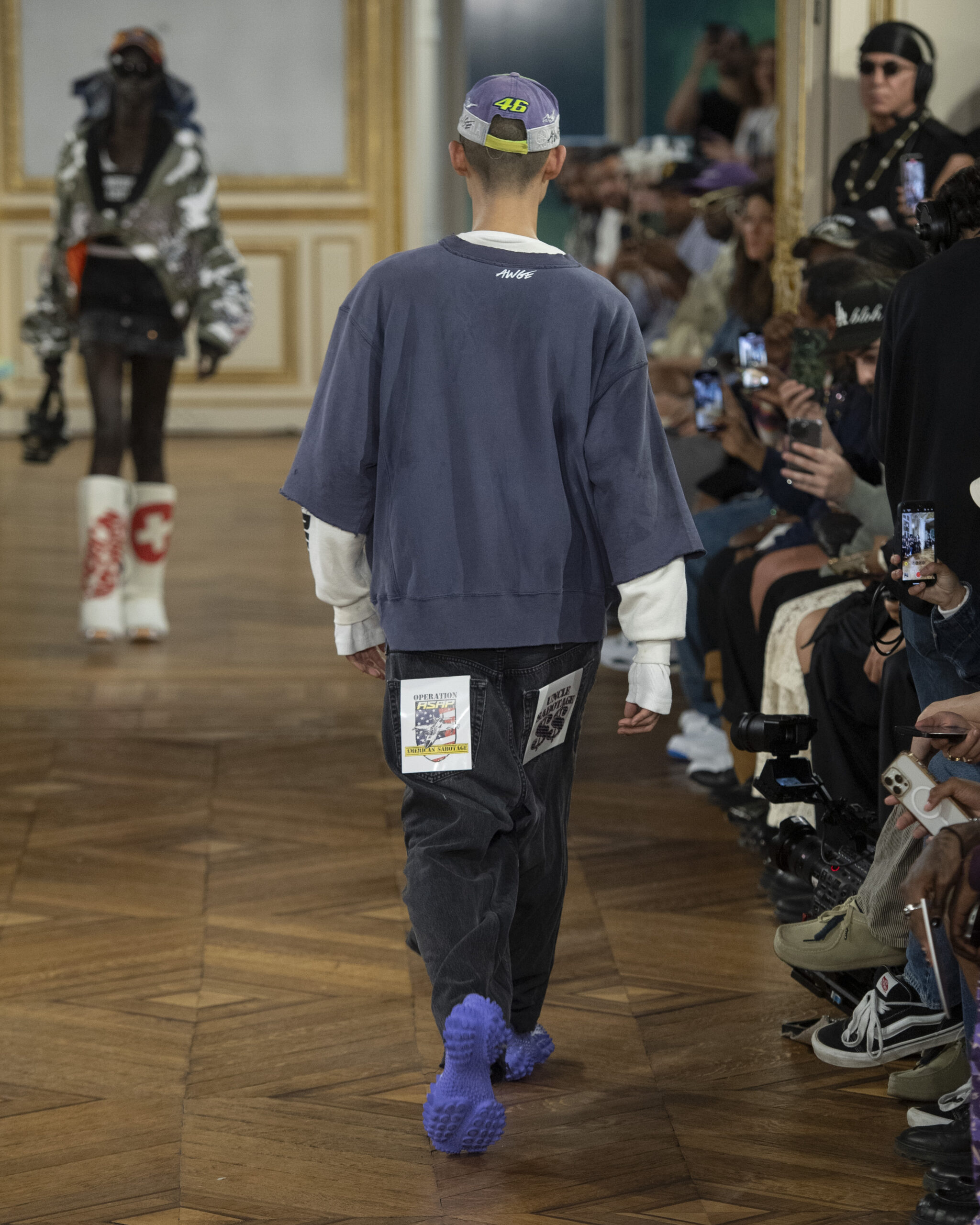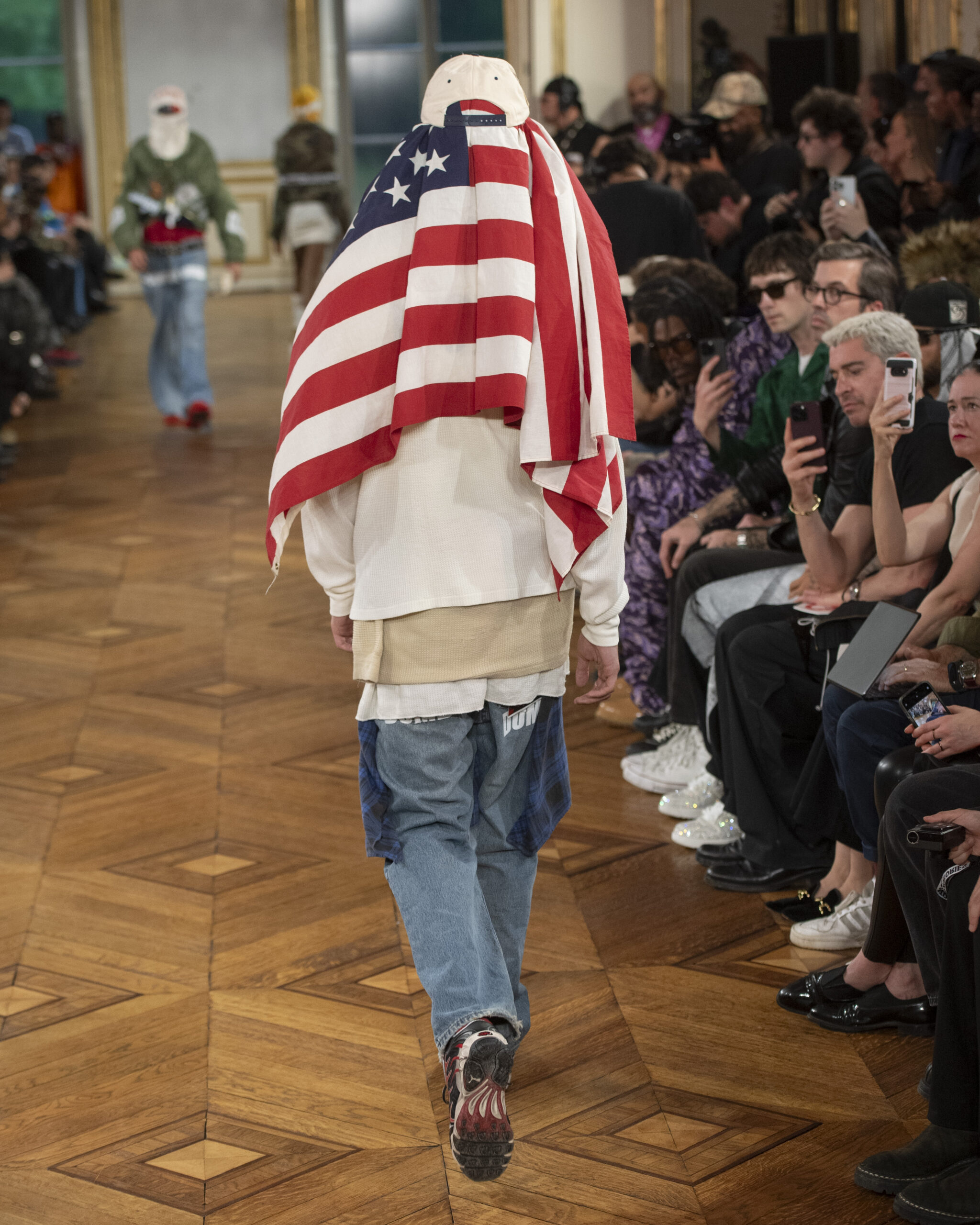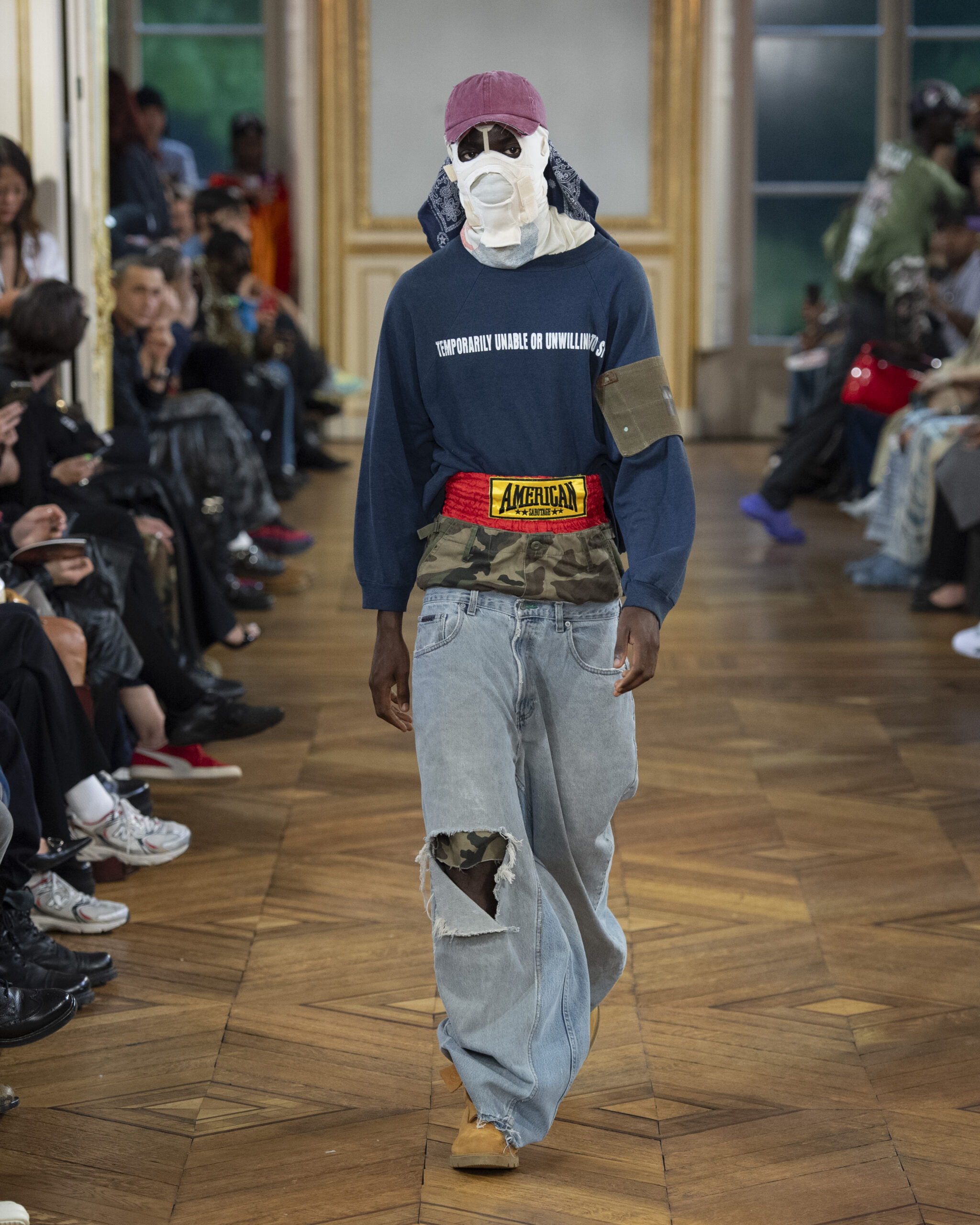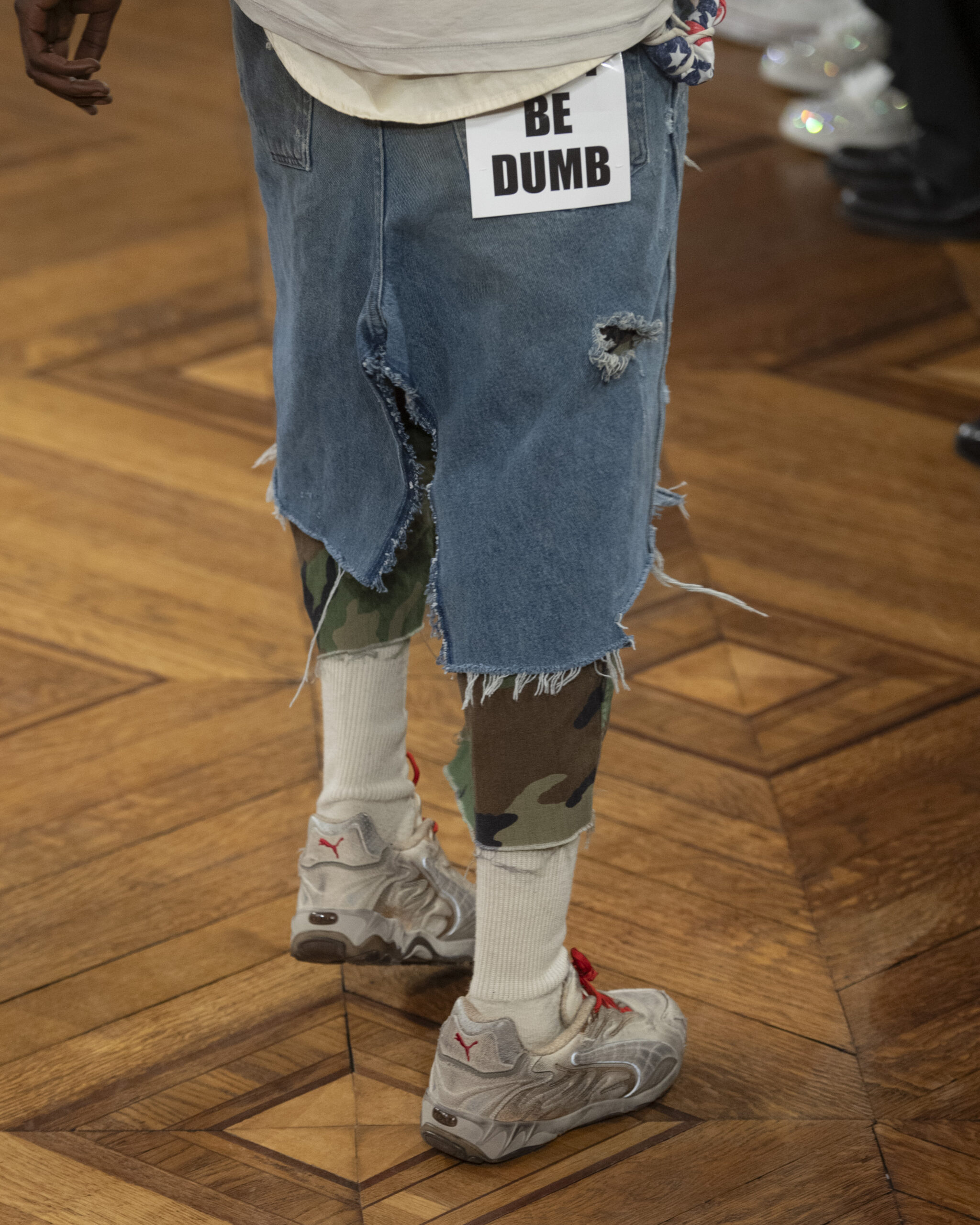 Le décor du défilé, comprenant des sacs poubelles transformés en chaises beanbag issues de la marque de mobilier Hommemade, en collaboration avec Crosby Studios, ajoutait une dimension immersive à cette expérience unique. Le défilé a été rythmé par la bande-son du prochain album d’A$AP Rocky, créant une synergie entre mode et musique.