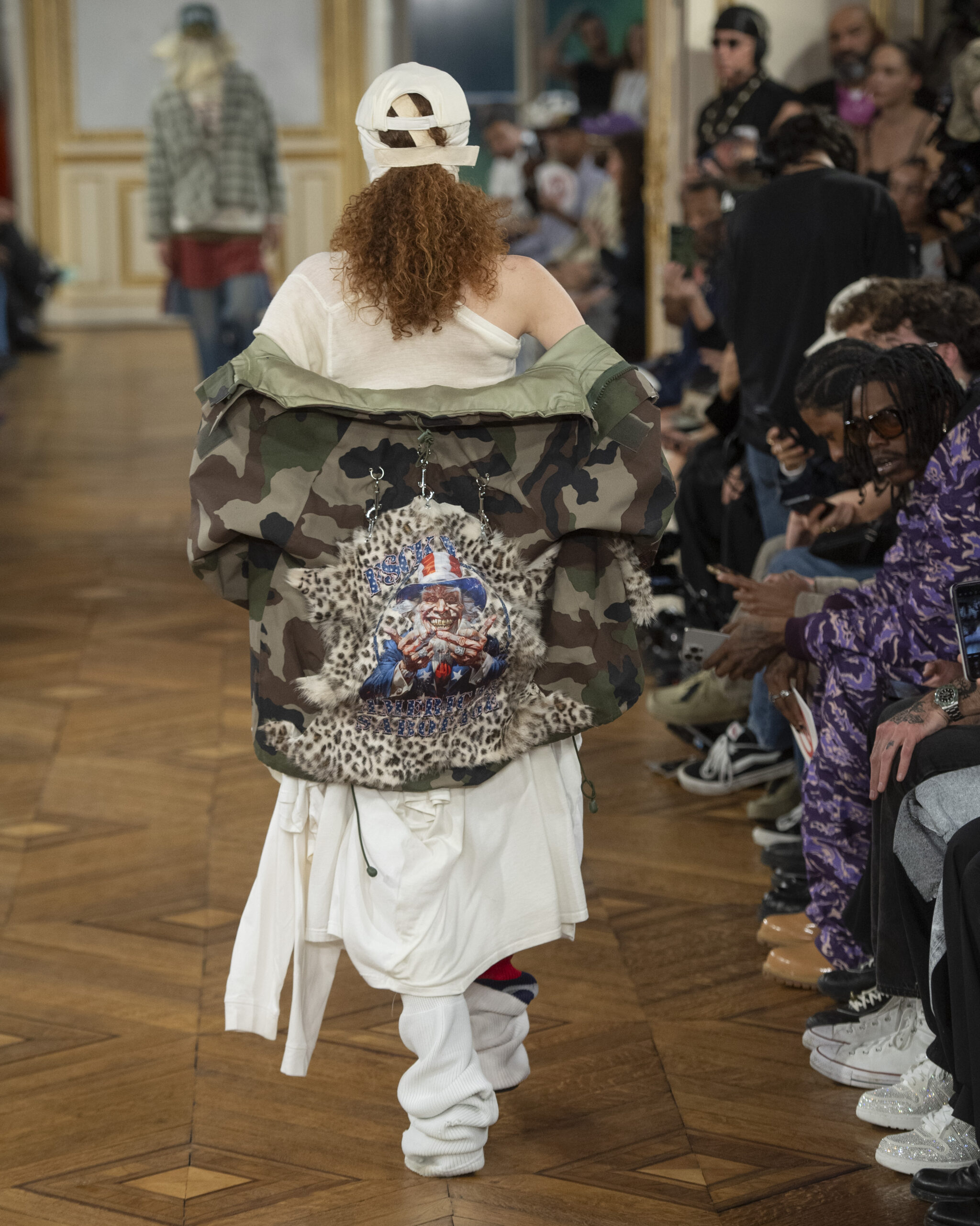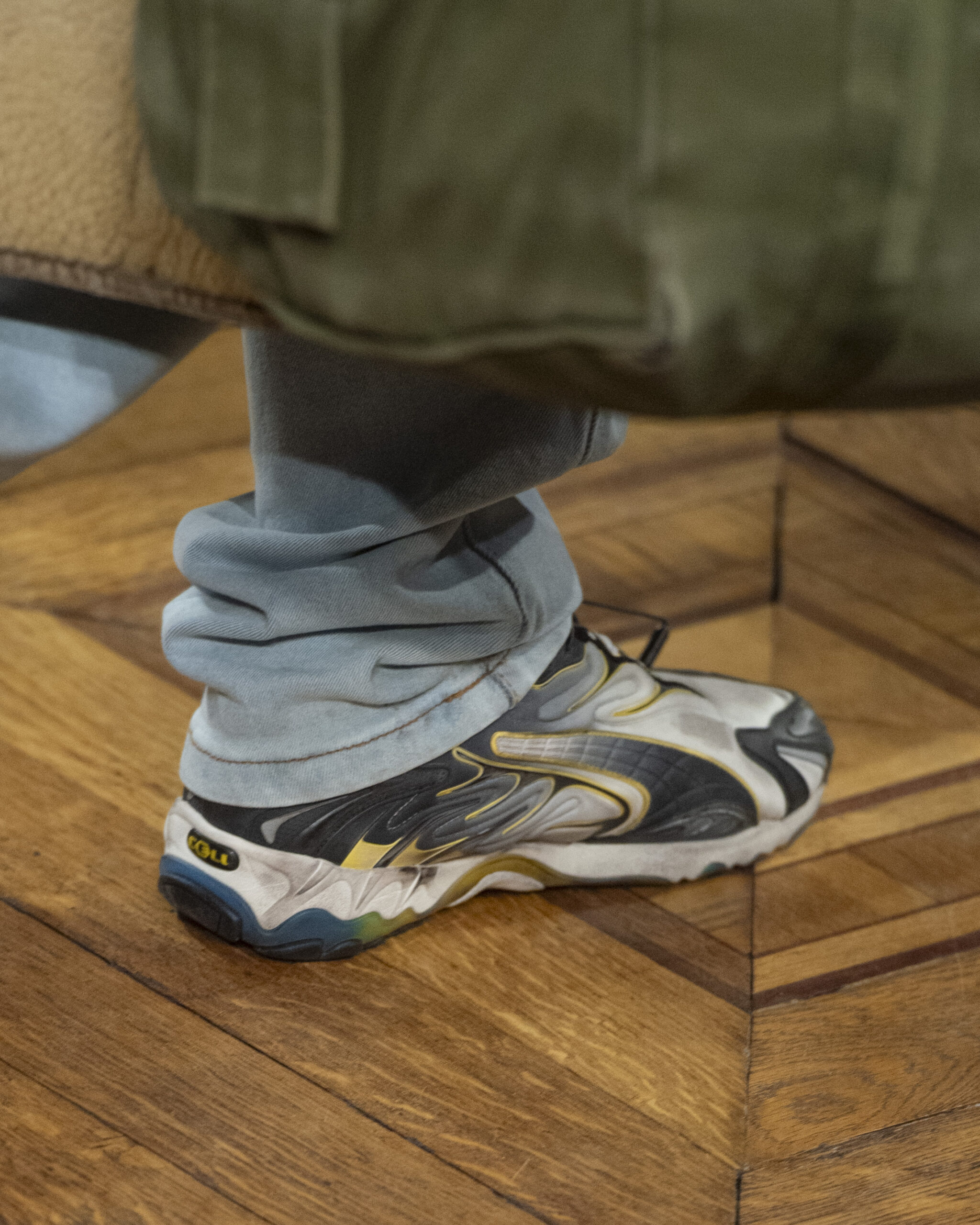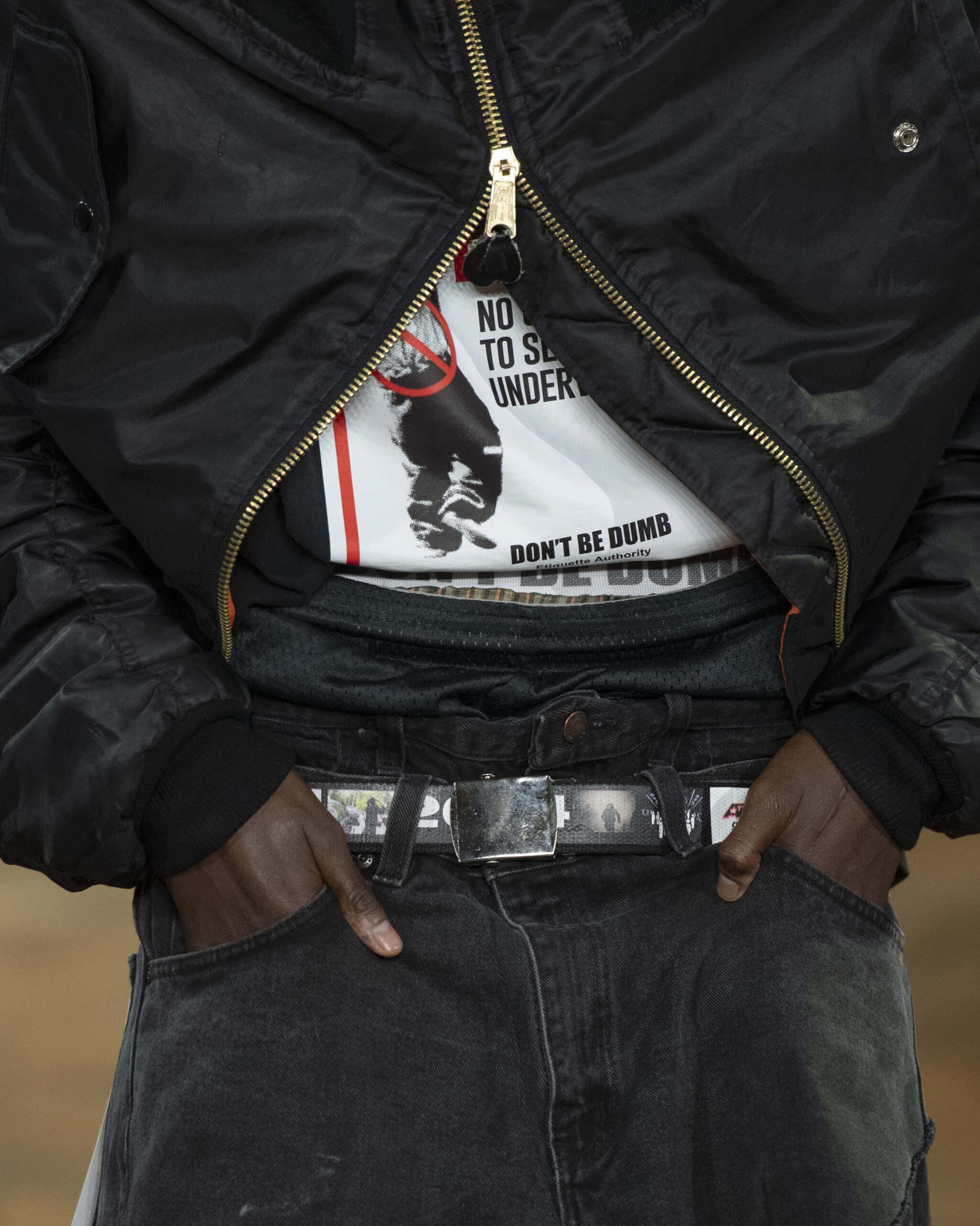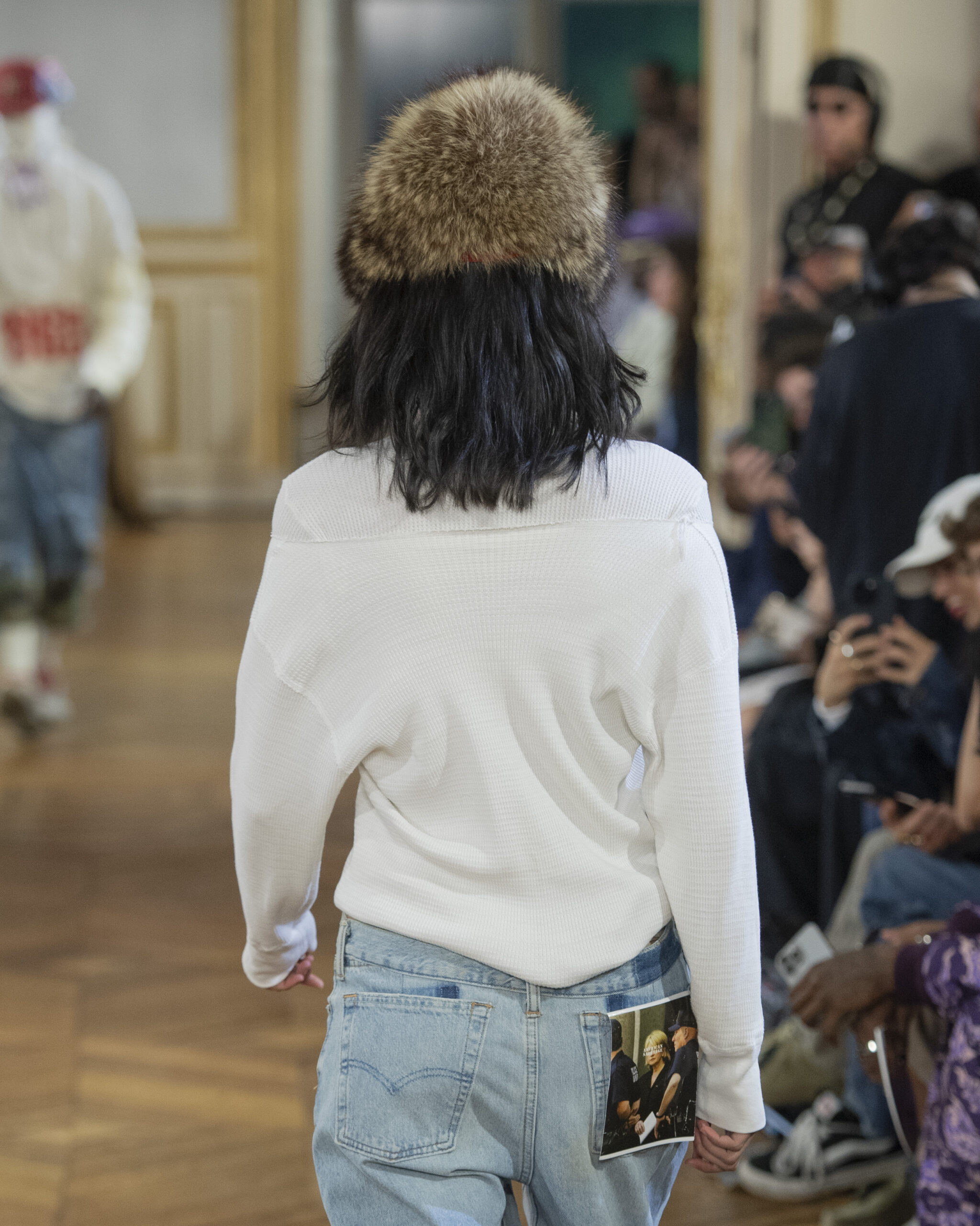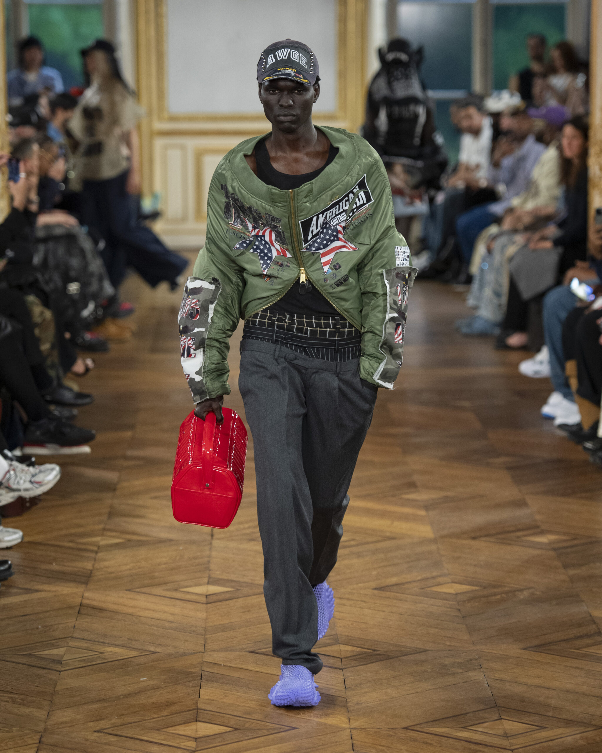 Le décor du défilé, comprenant des sacs poubelles transformés en chaises beanbag issues de la marque de mobilier Hommemade, en collaboration avec Crosby Studios, ajoutait une dimension immersive à cette expérience unique. Le défilé a été rythmé par la bande-son du prochain album d’A$AP Rocky, créant une synergie entre mode et musique.