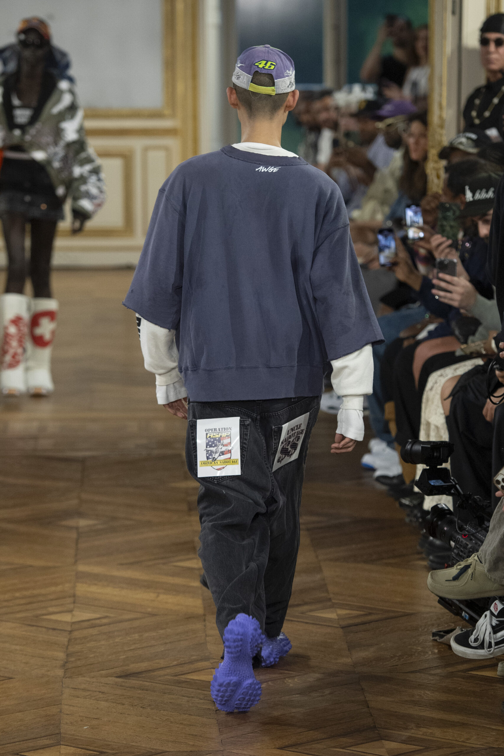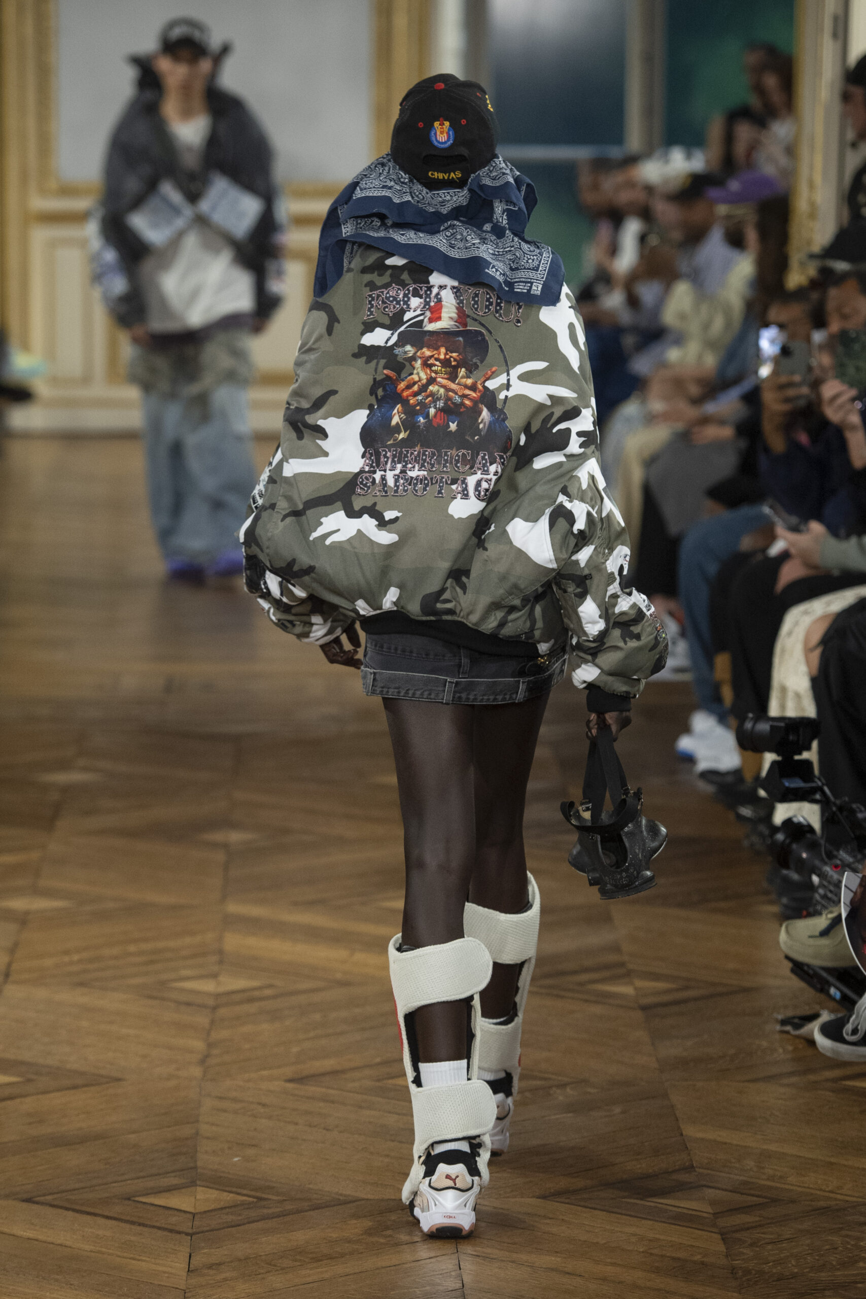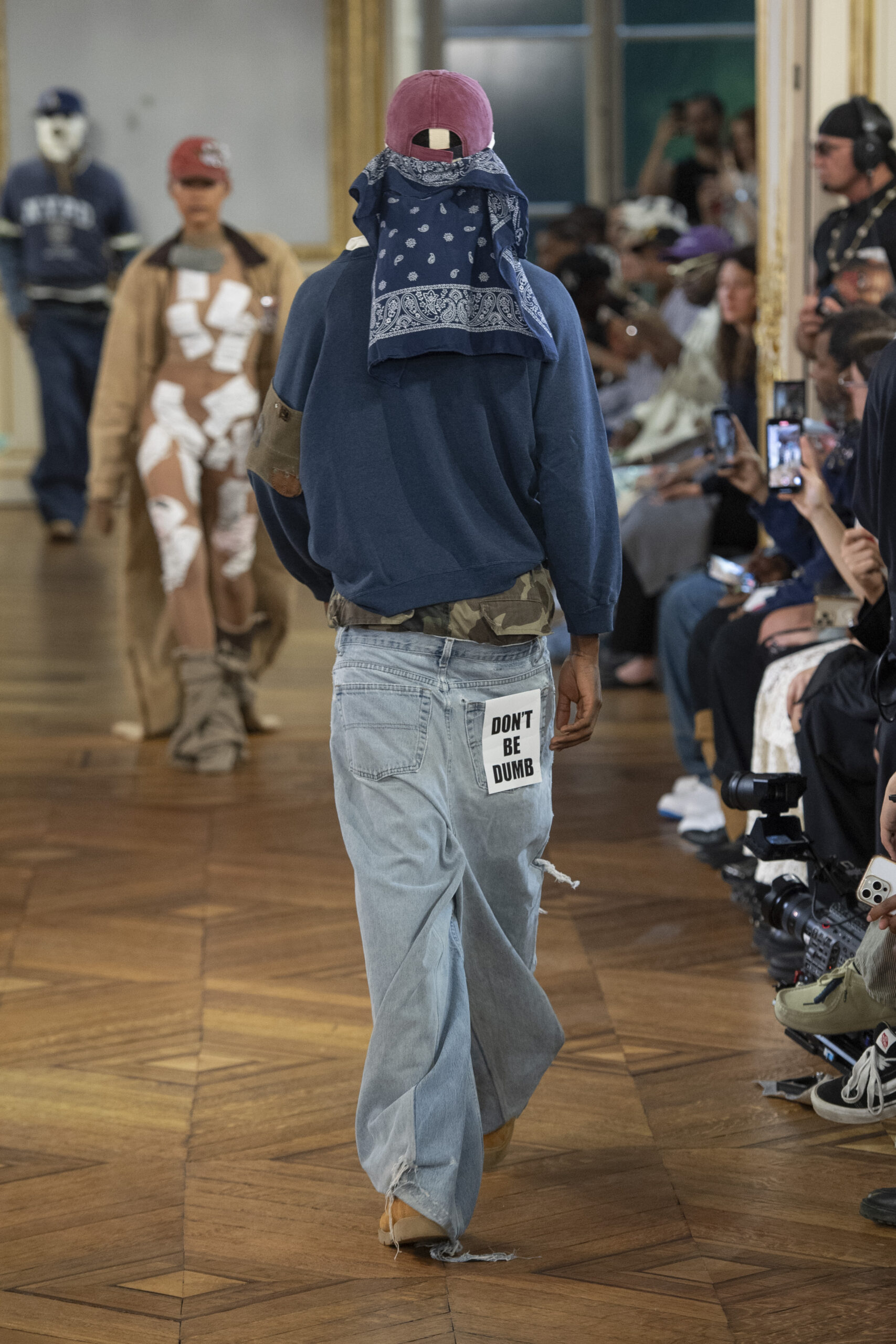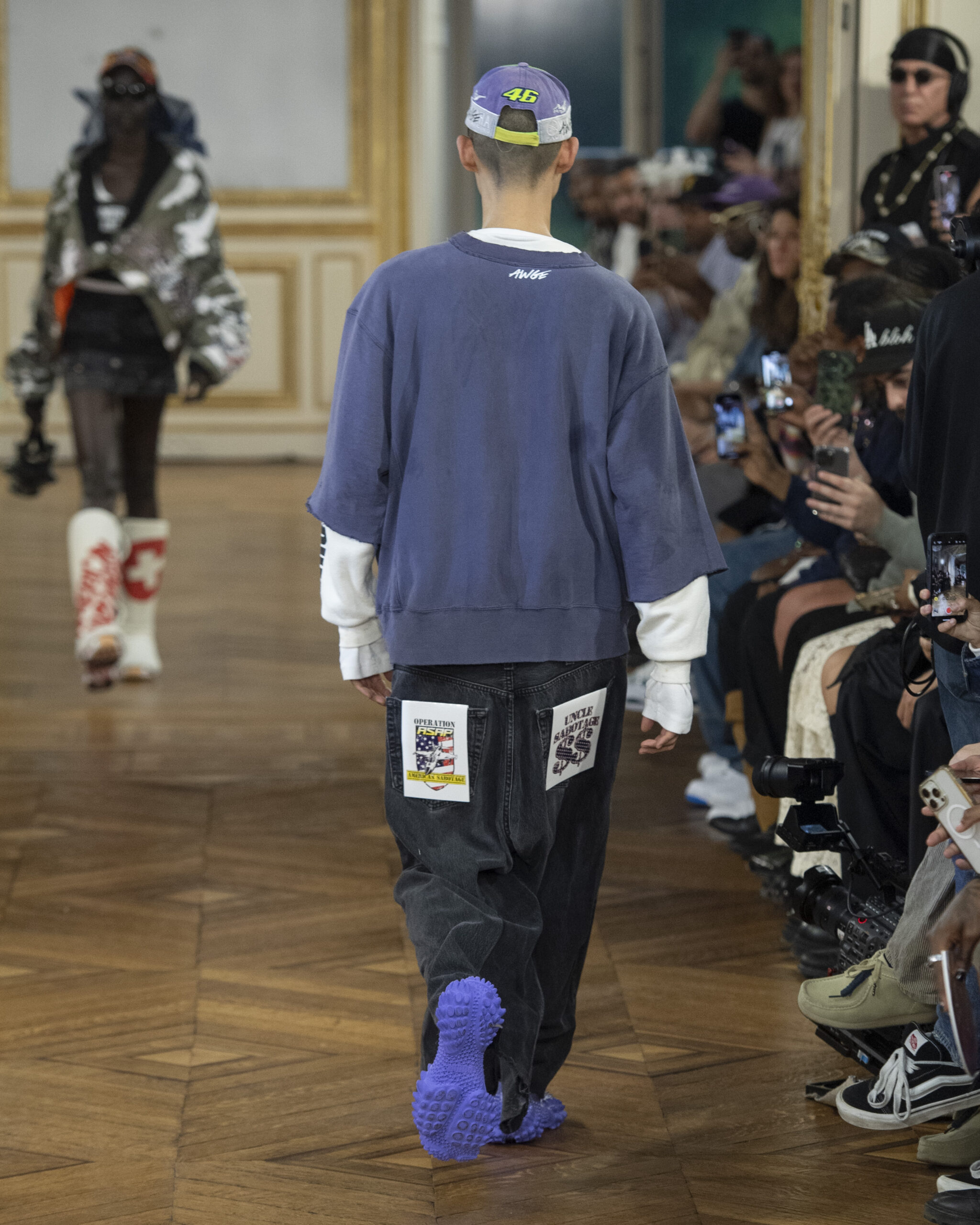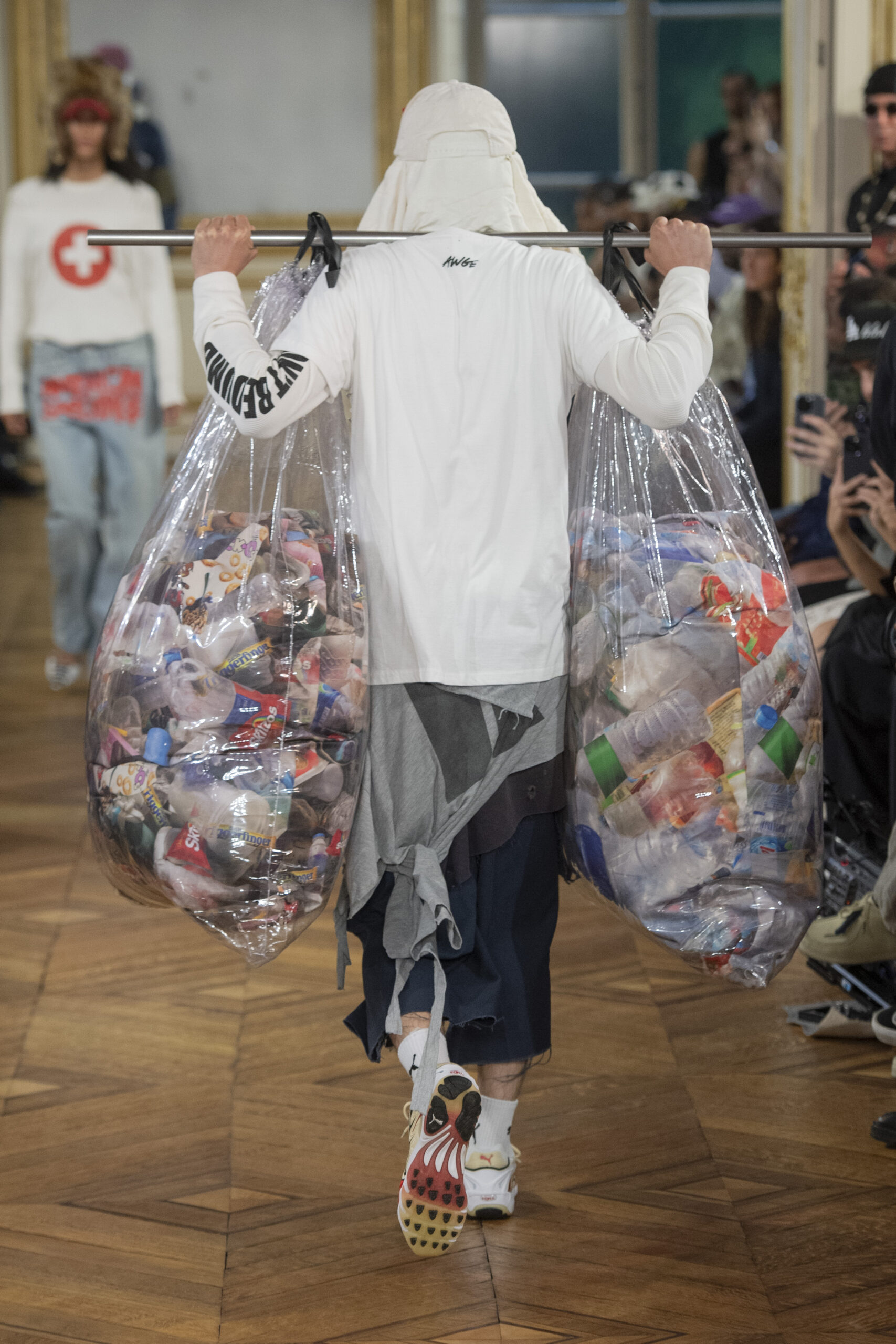 Le décor du défilé, comprenant des sacs poubelles transformés en chaises beanbag issues de la marque de mobilier Hommemade, en collaboration avec Crosby Studios, ajoutait une dimension immersive à cette expérience unique. Le défilé a été rythmé par la bande-son du prochain album d’A$AP Rocky, créant une synergie entre mode et musique.