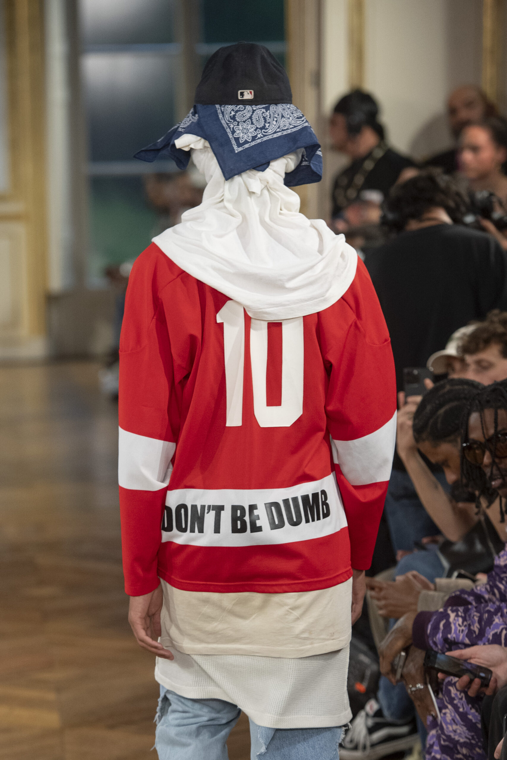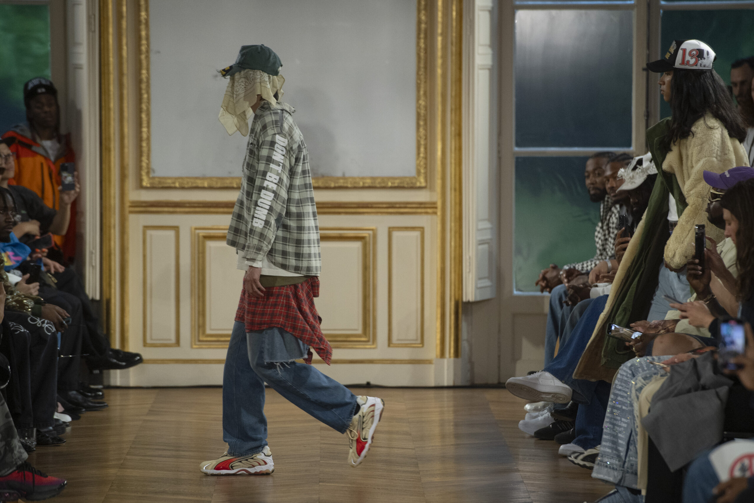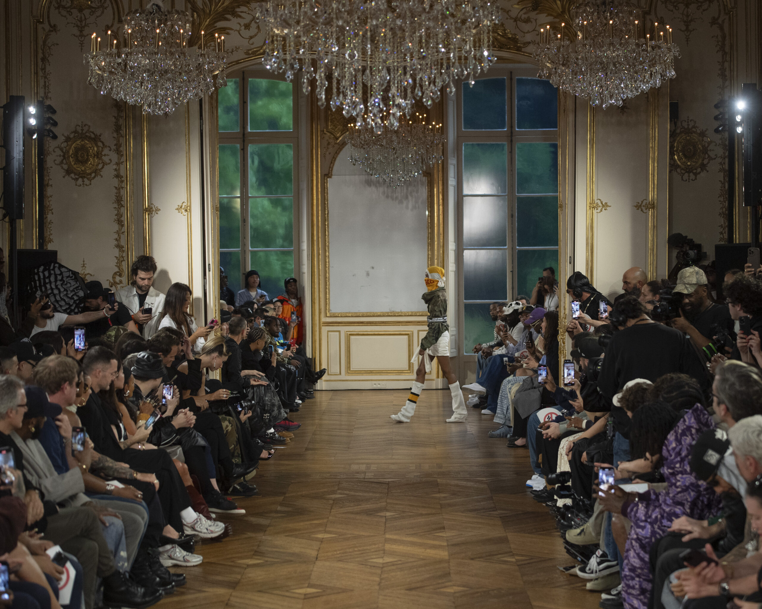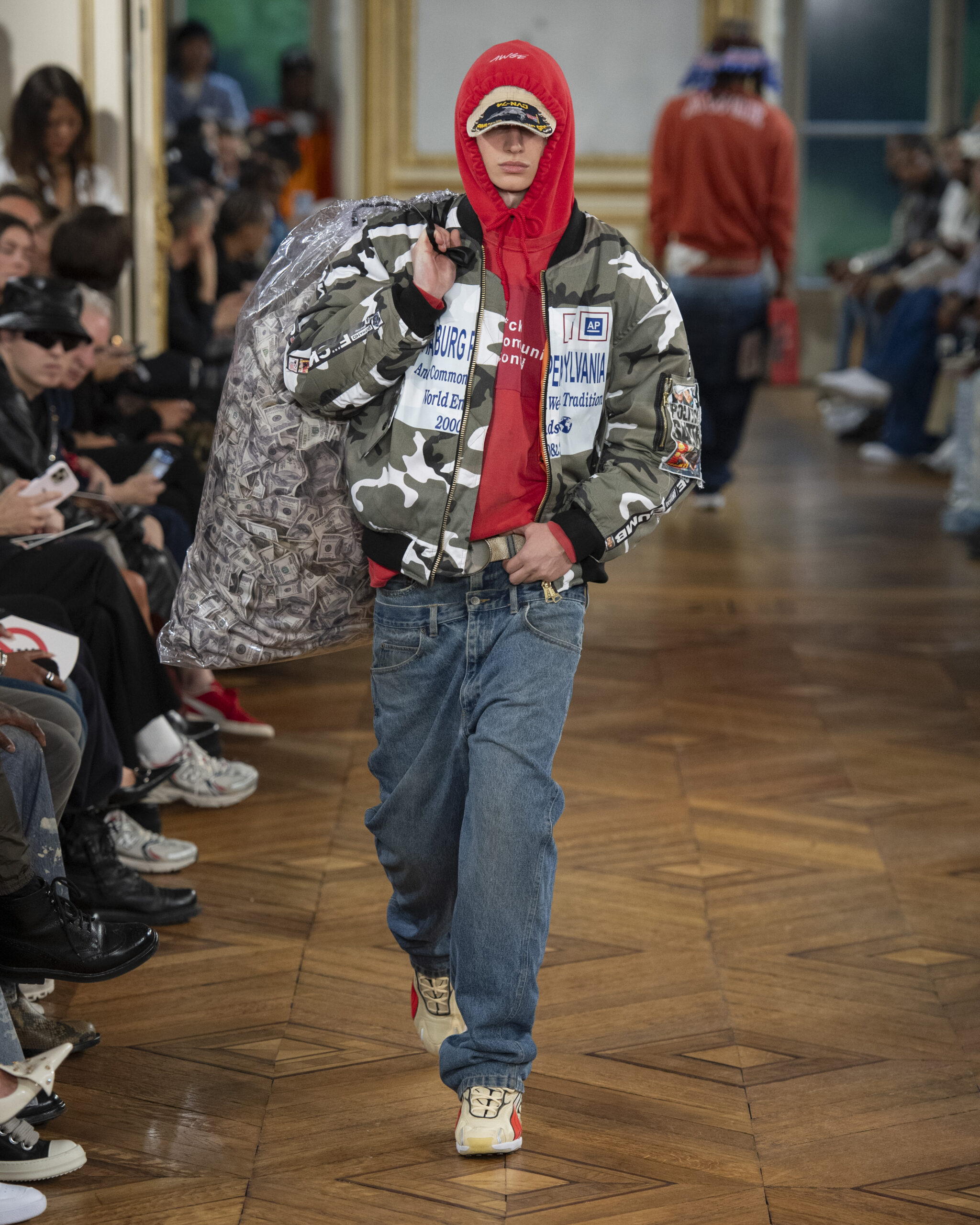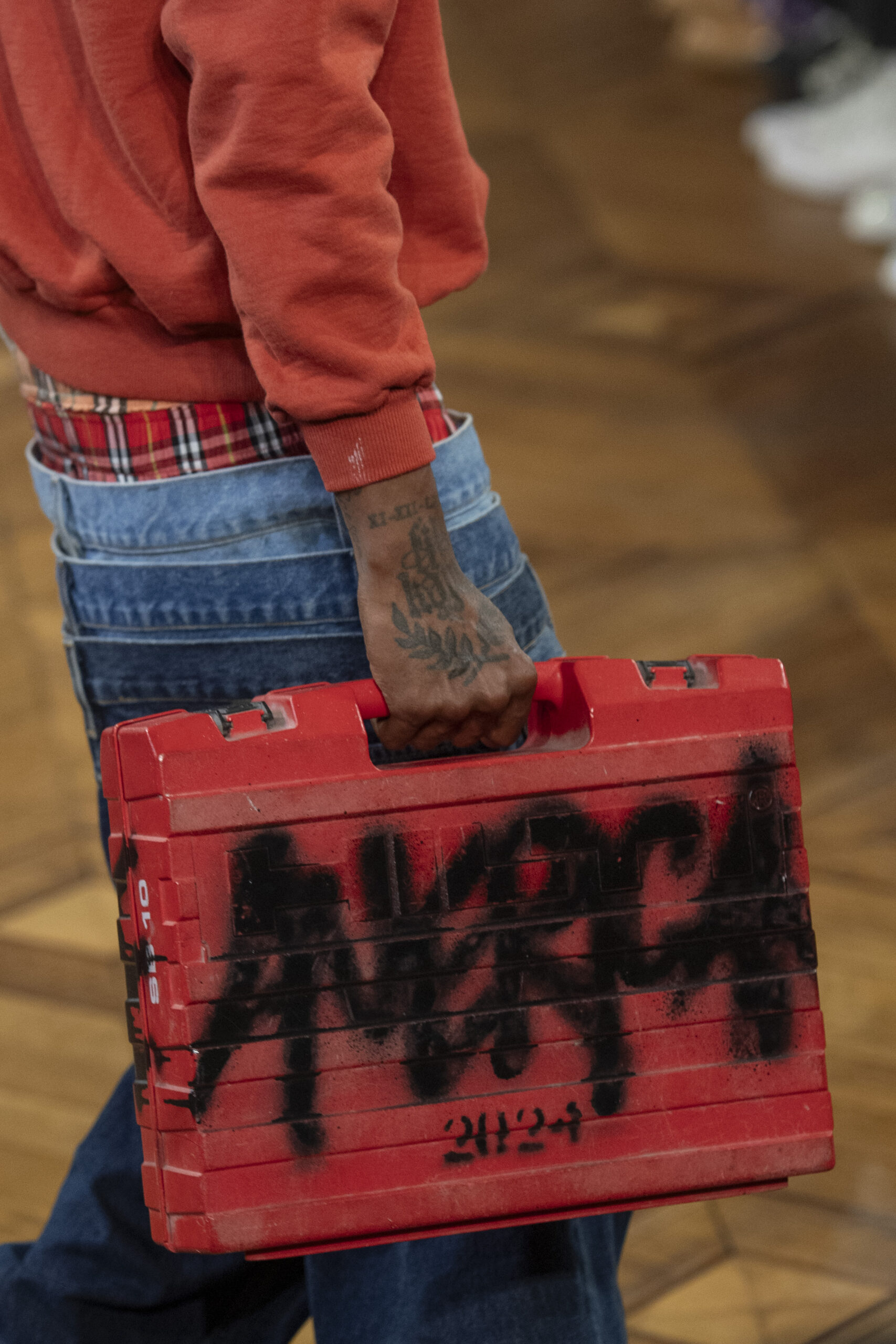 Le décor du défilé, comprenant des sacs poubelles transformés en chaises beanbag issues de la marque de mobilier Hommemade, en collaboration avec Crosby Studios, ajoutait une dimension immersive à cette expérience unique. Le défilé a été rythmé par la bande-son du prochain album d’A$AP Rocky, créant une synergie entre mode et musique.