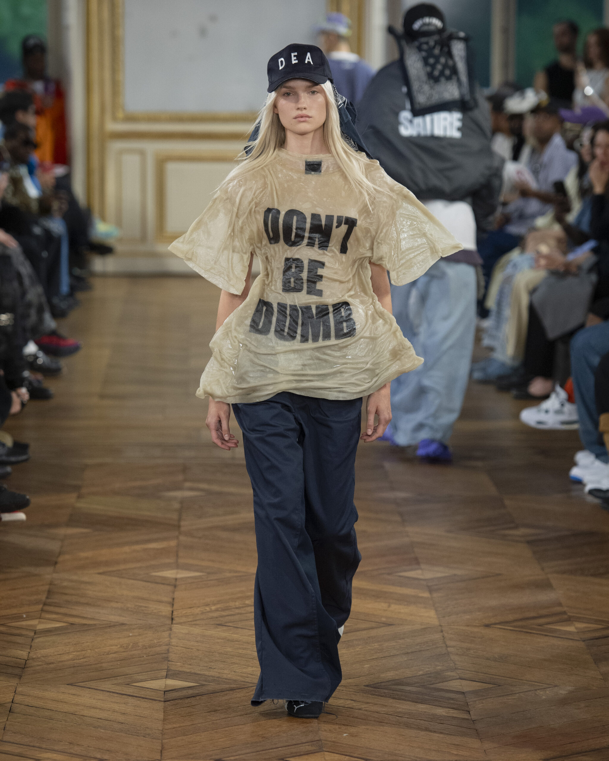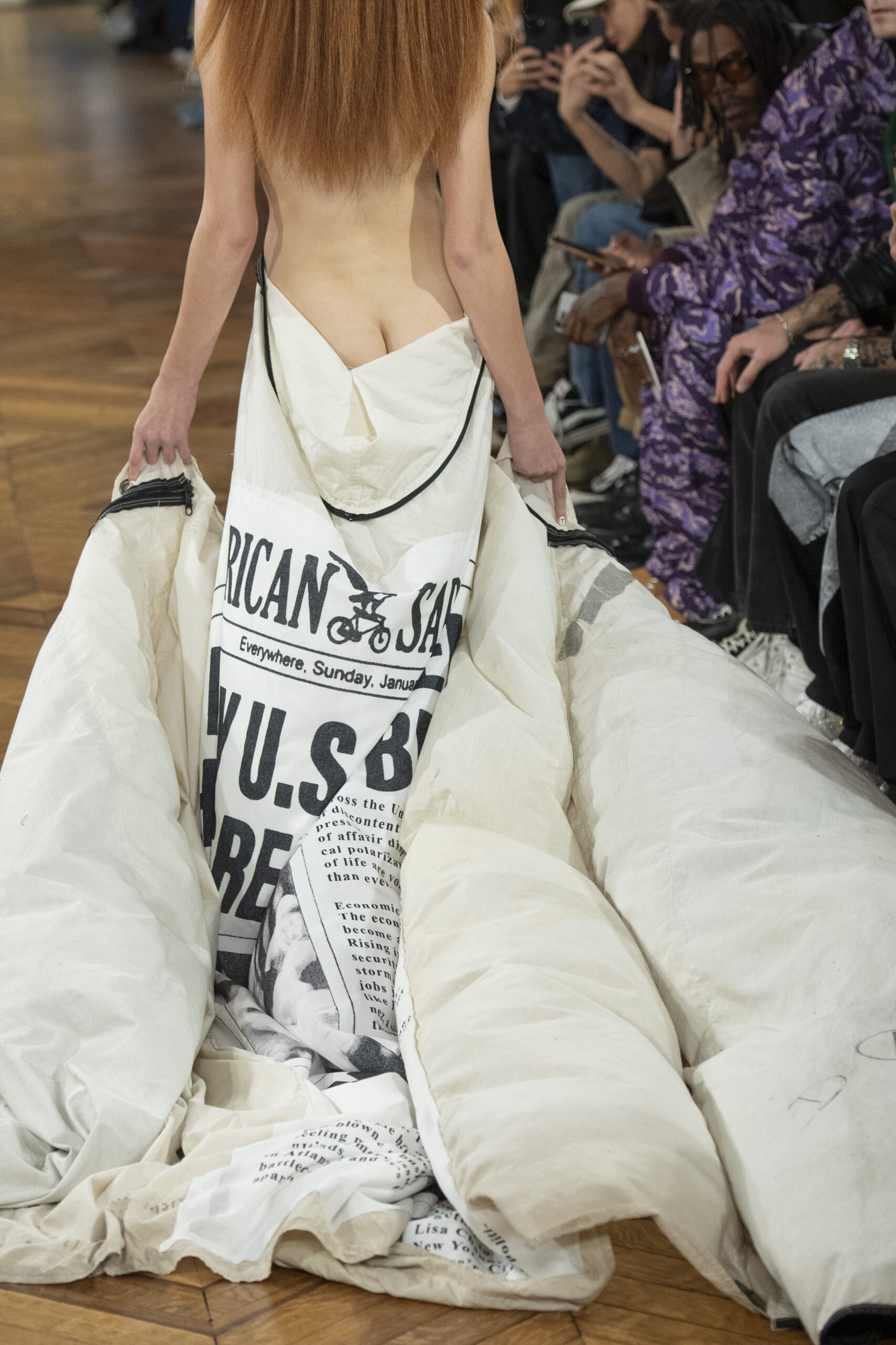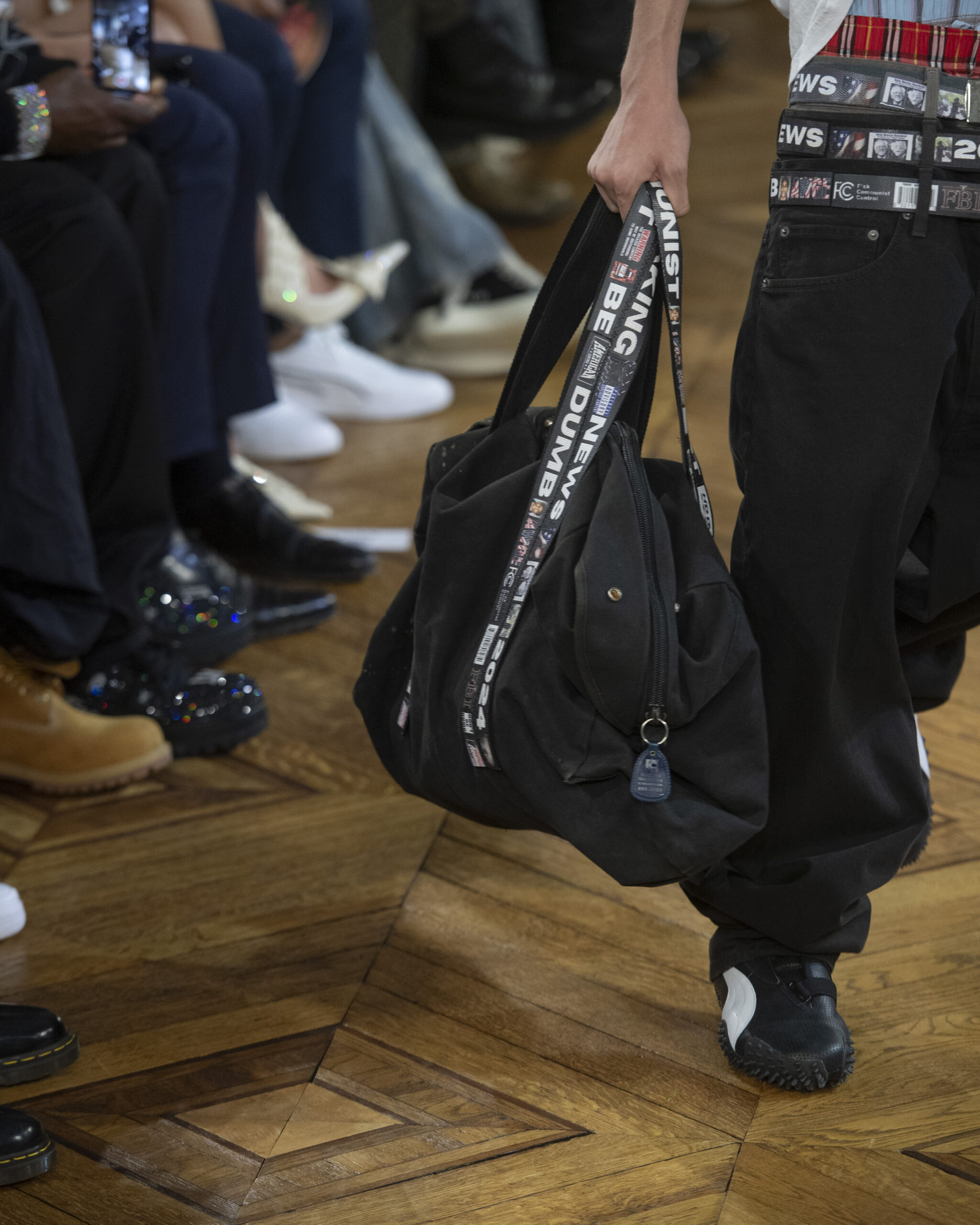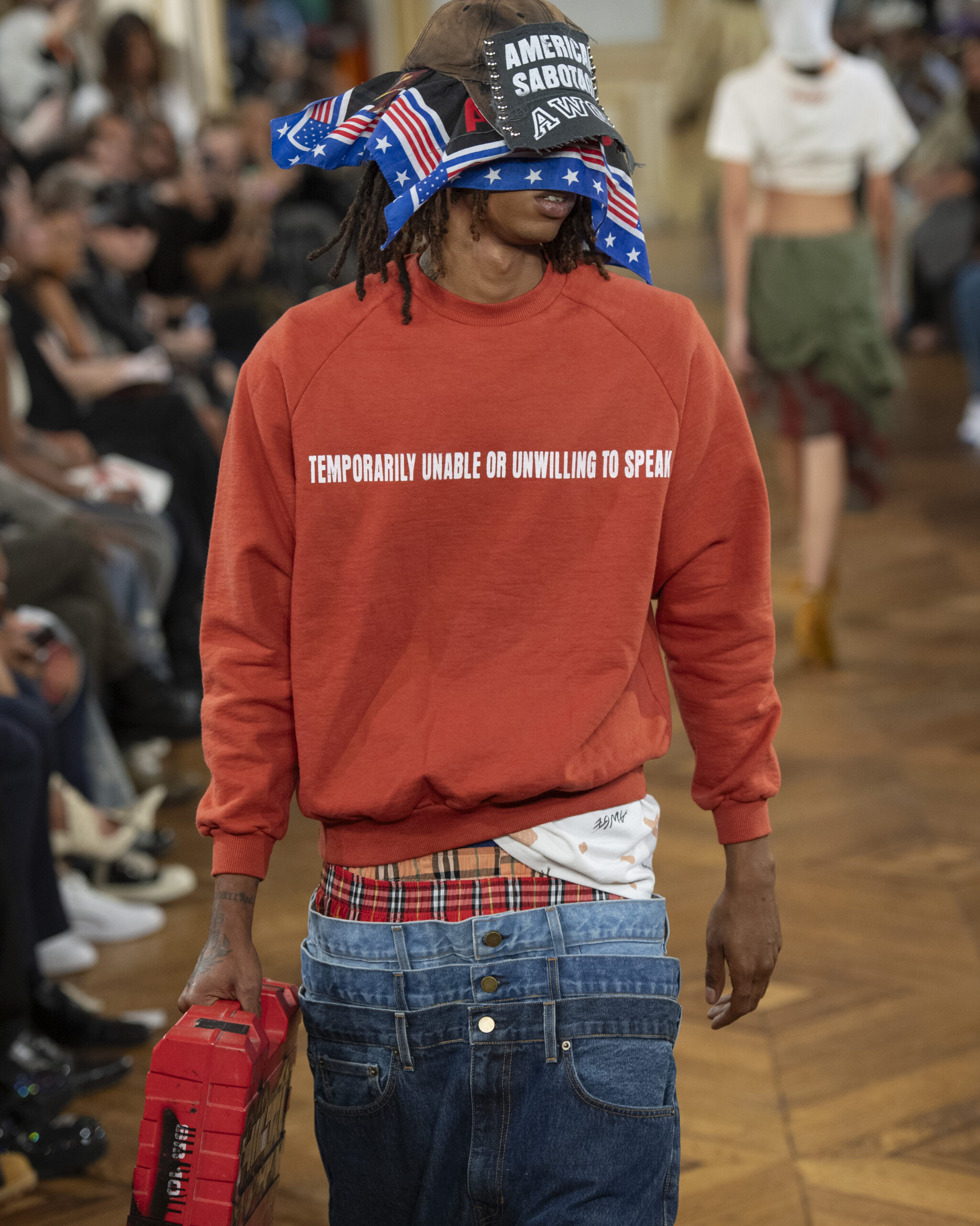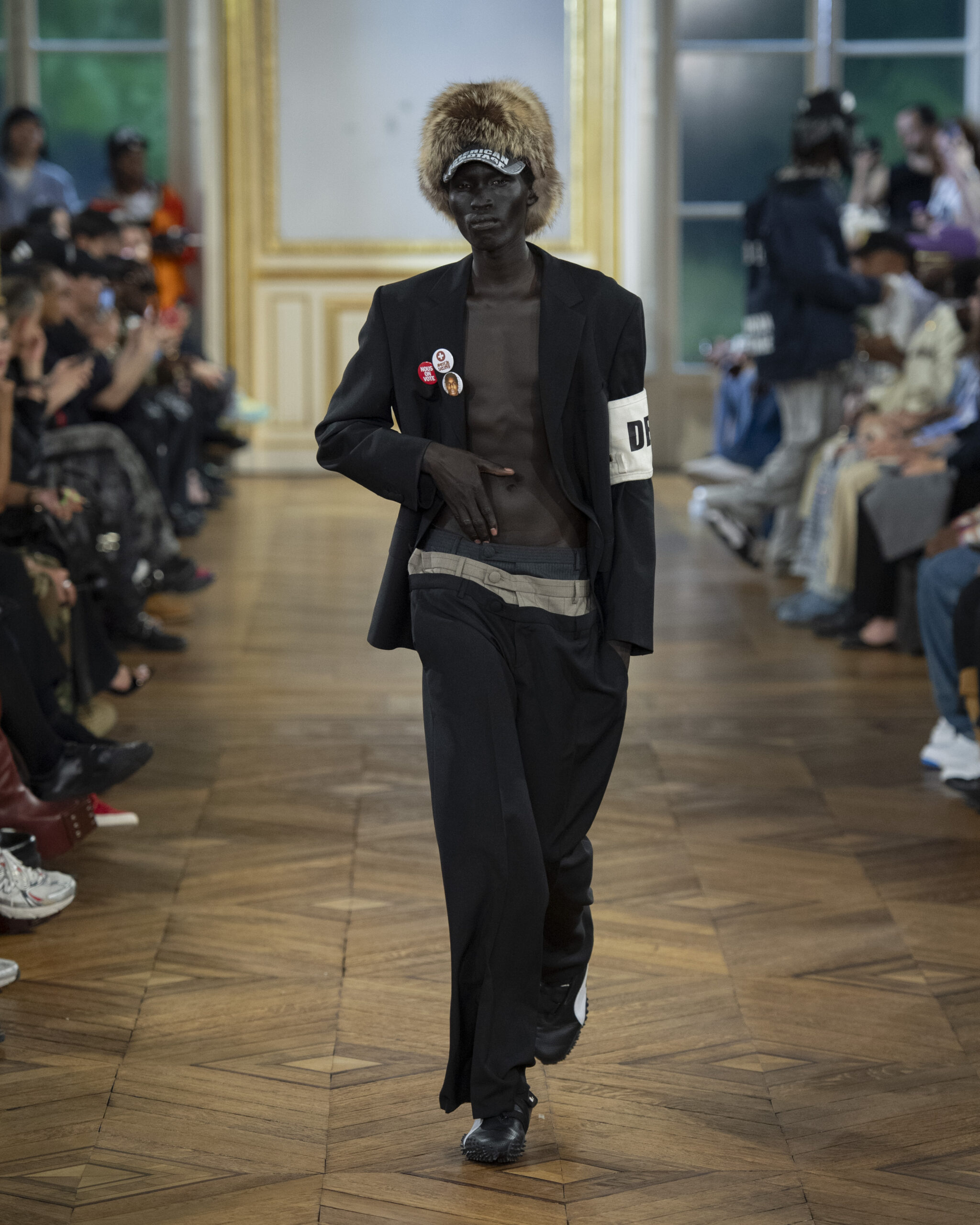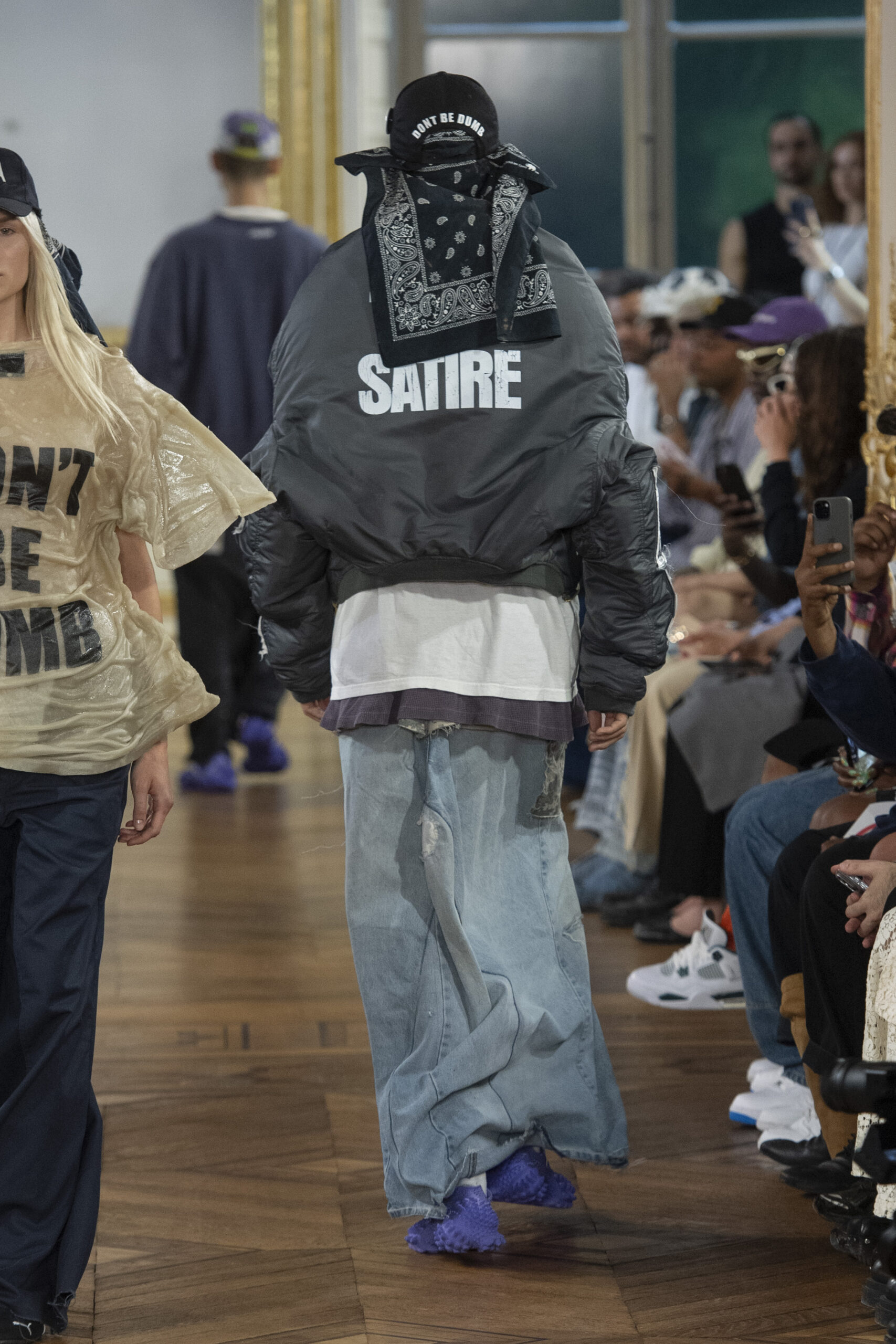 Le décor du défilé, comprenant des sacs poubelles transformés en chaises beanbag issues de la marque de mobilier Hommemade, en collaboration avec Crosby Studios, ajoutait une dimension immersive à cette expérience unique. Le défilé a été rythmé par la bande-son du prochain album d’A$AP Rocky, créant une synergie entre mode et musique.