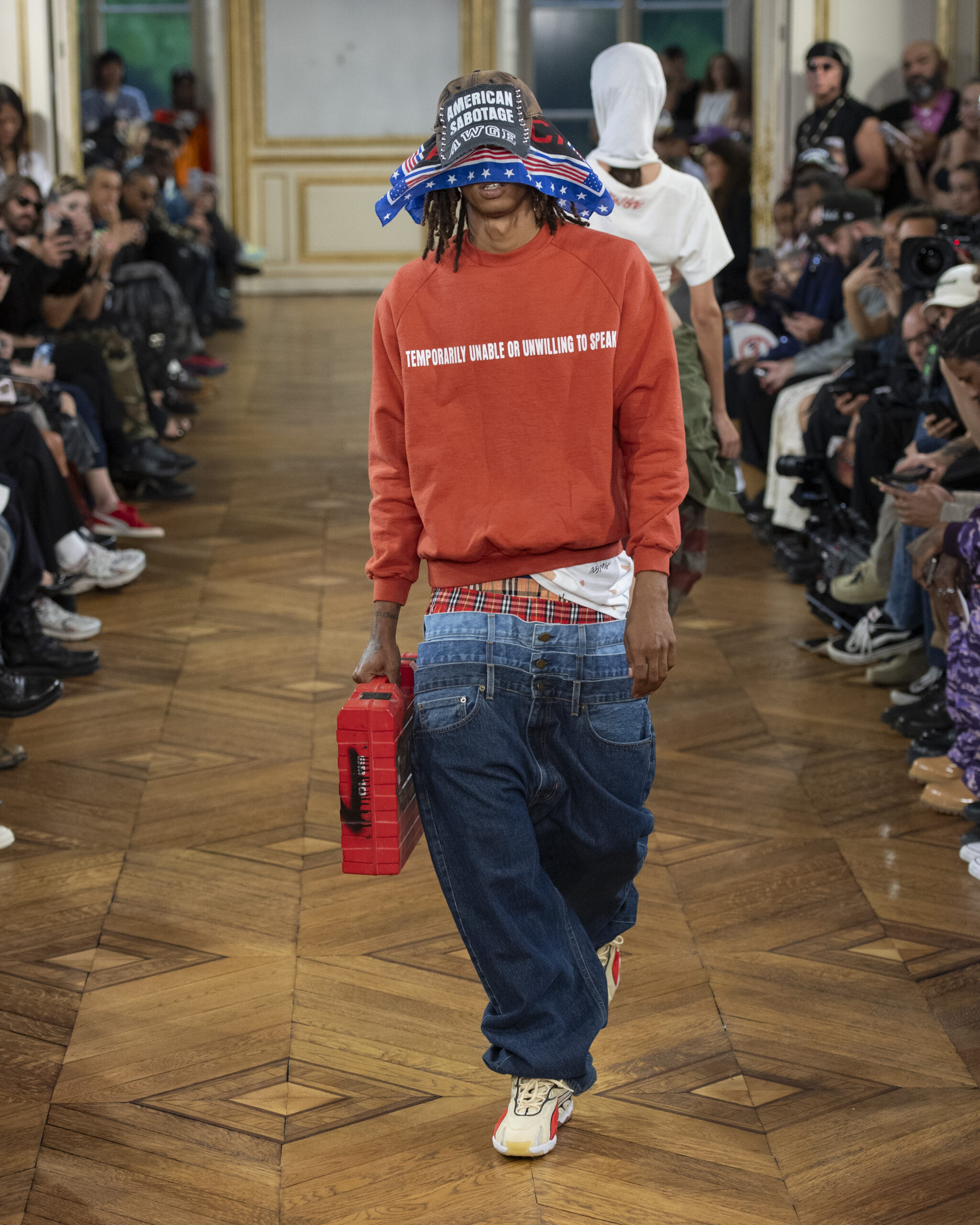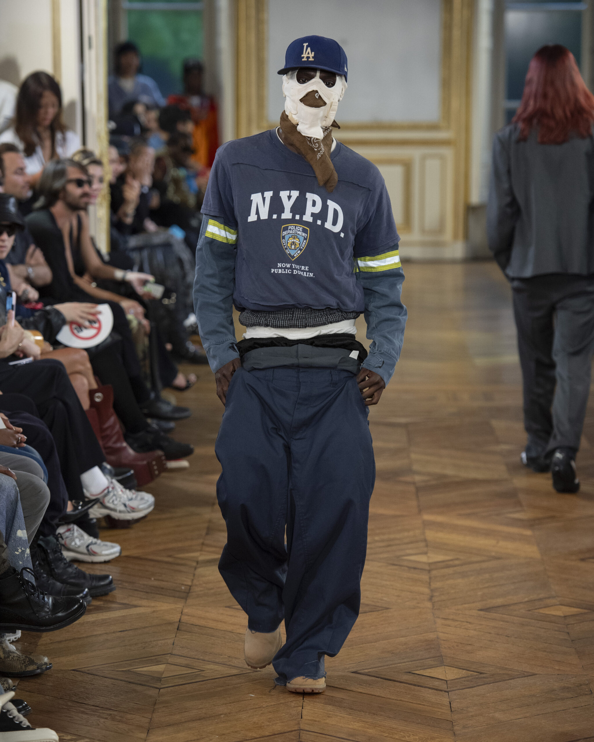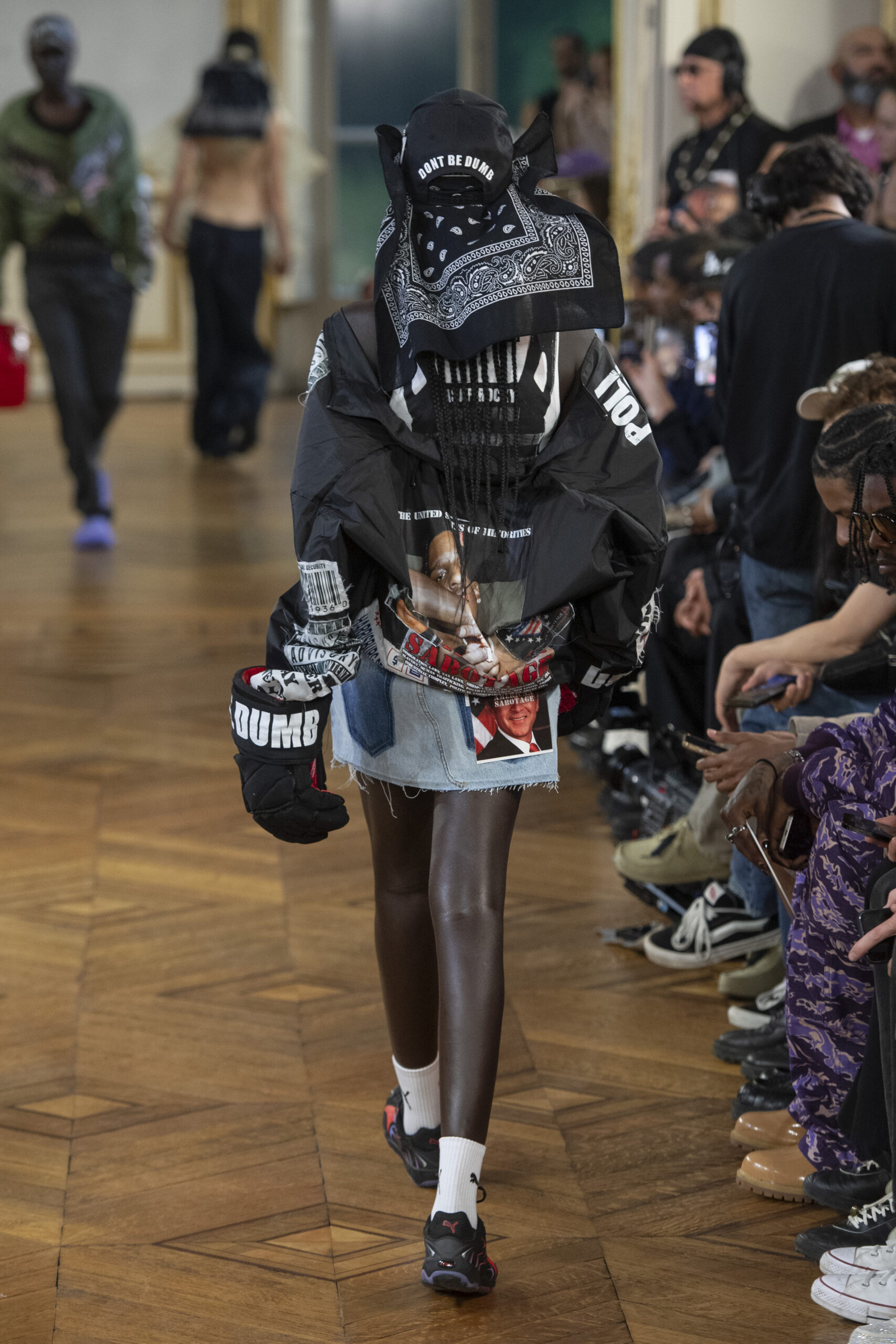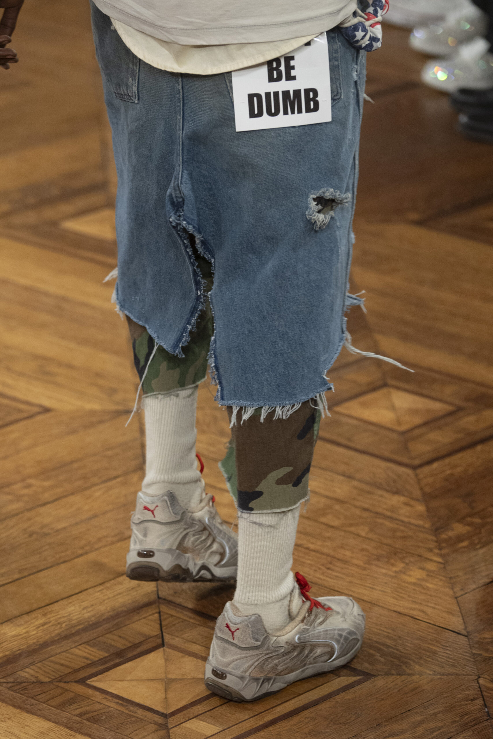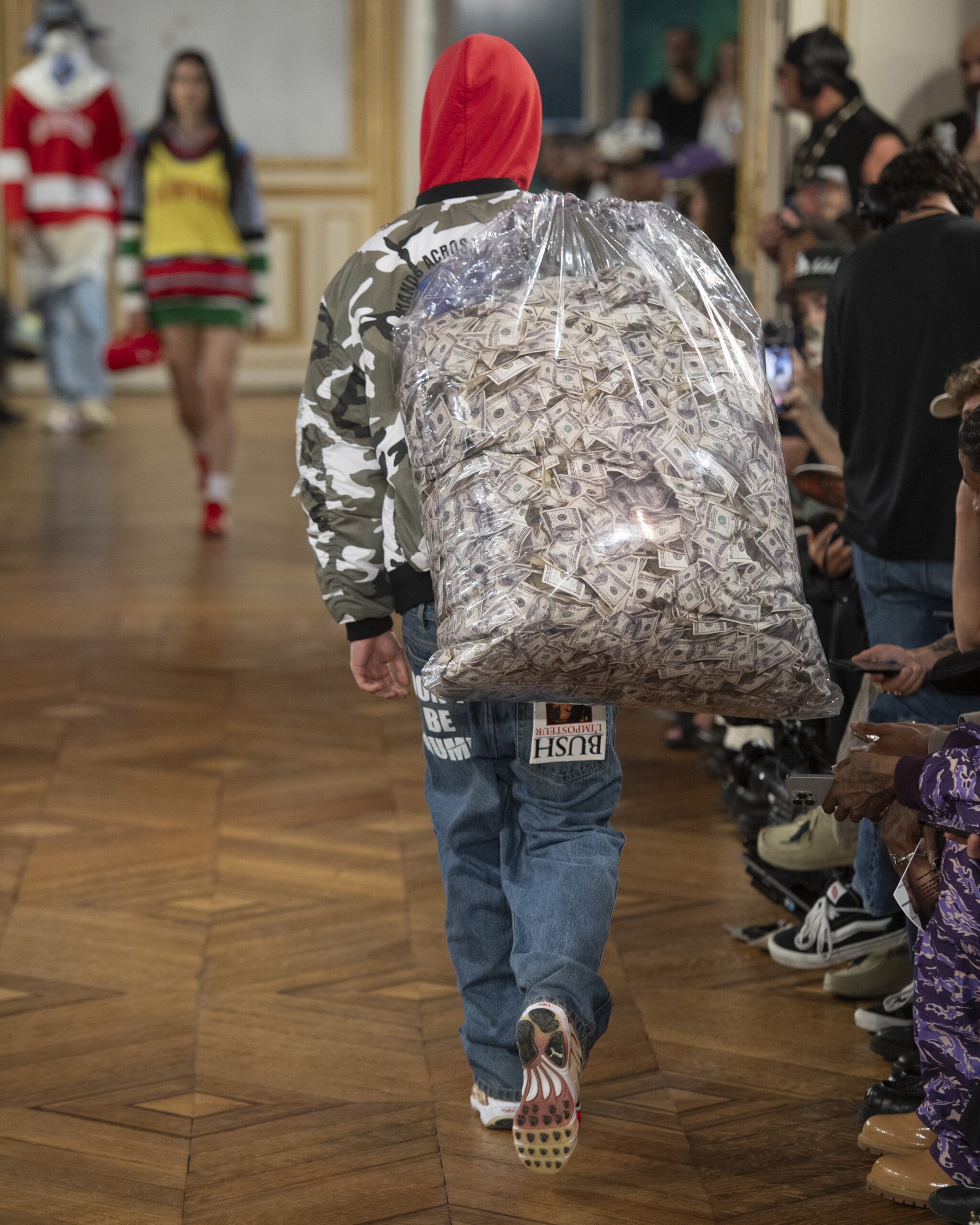 Le décor du défilé, comprenant des sacs poubelles transformés en chaises beanbag issues de la marque de mobilier Hommemade, en collaboration avec Crosby Studios, ajoutait une dimension immersive à cette expérience unique. Le défilé a été rythmé par la bande-son du prochain album d’A$AP Rocky, créant une synergie entre mode et musique.
