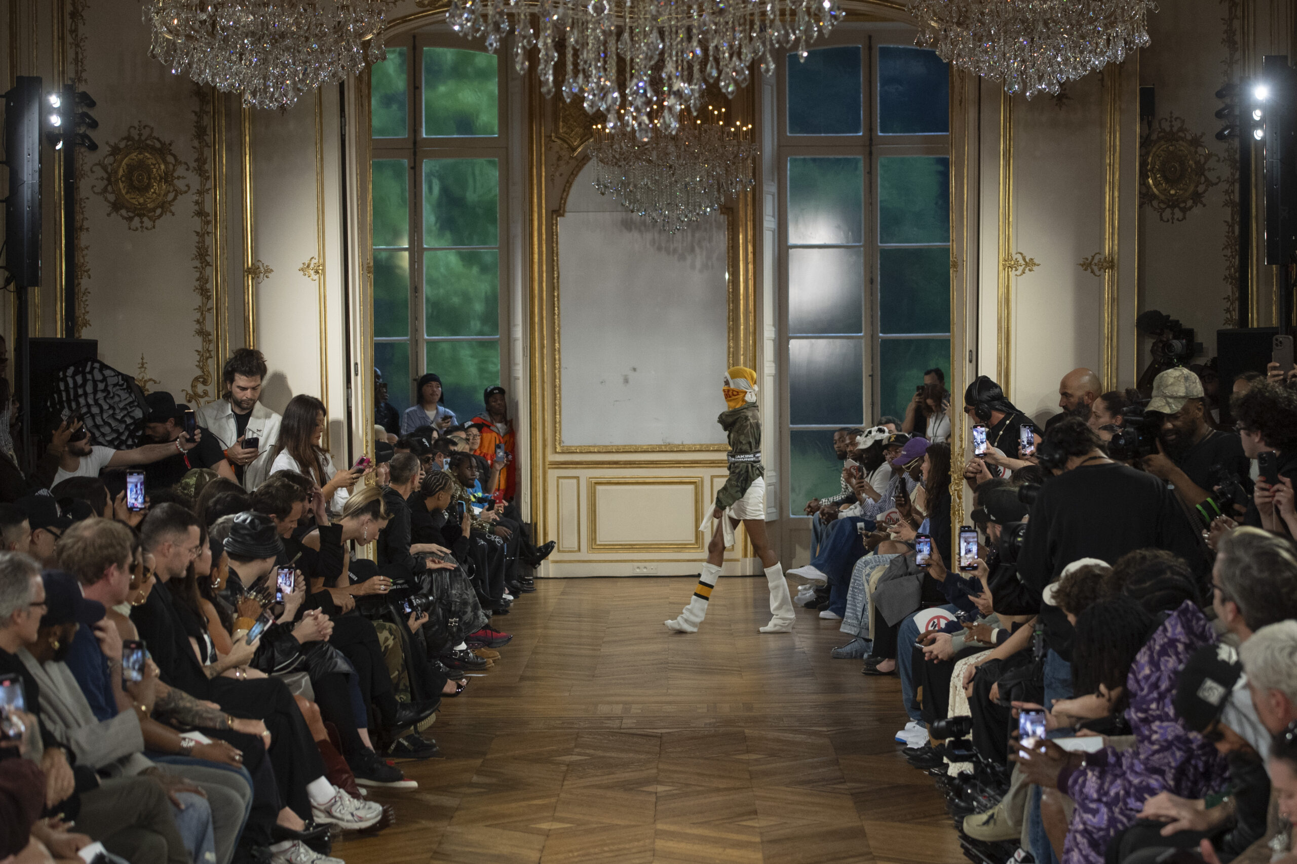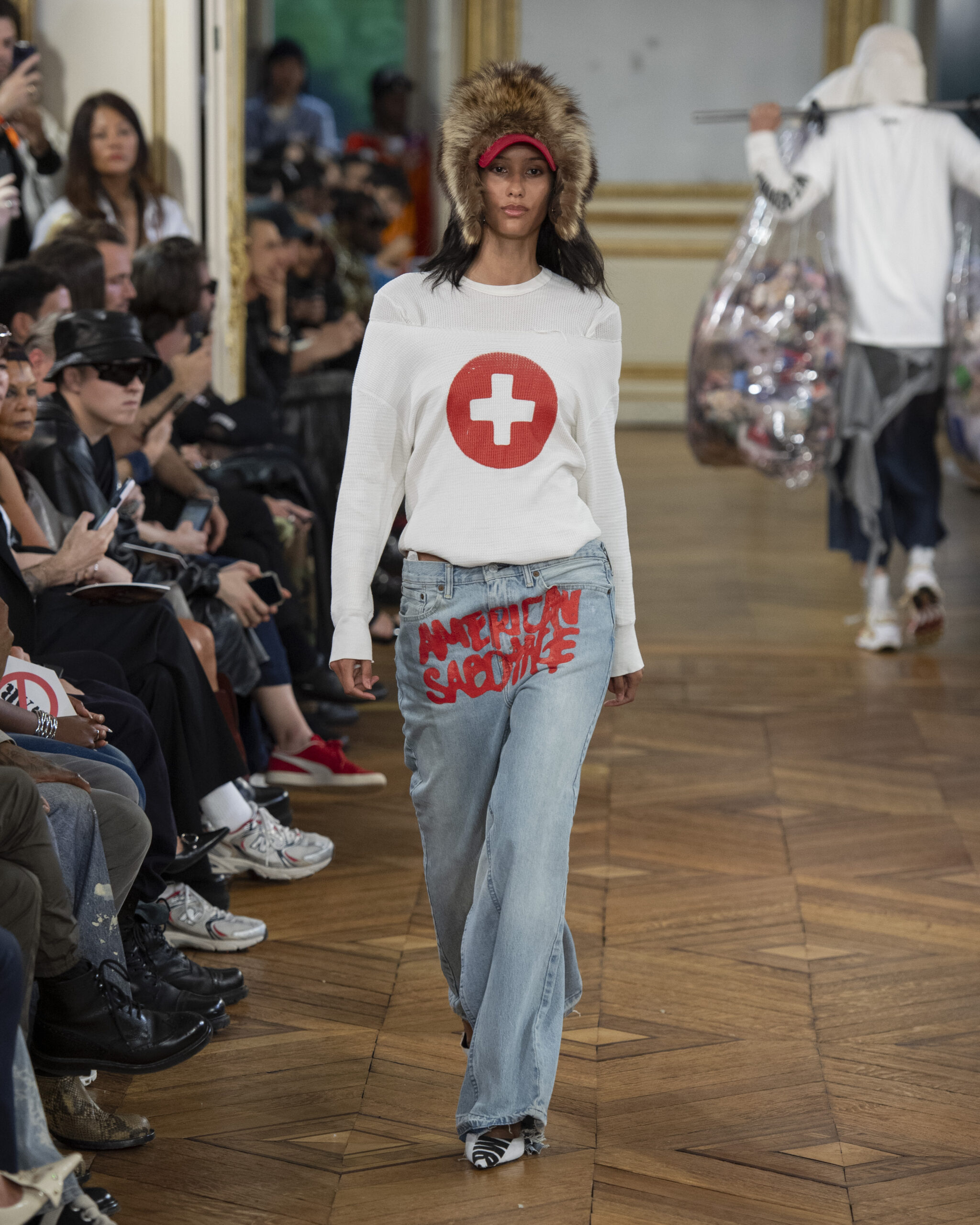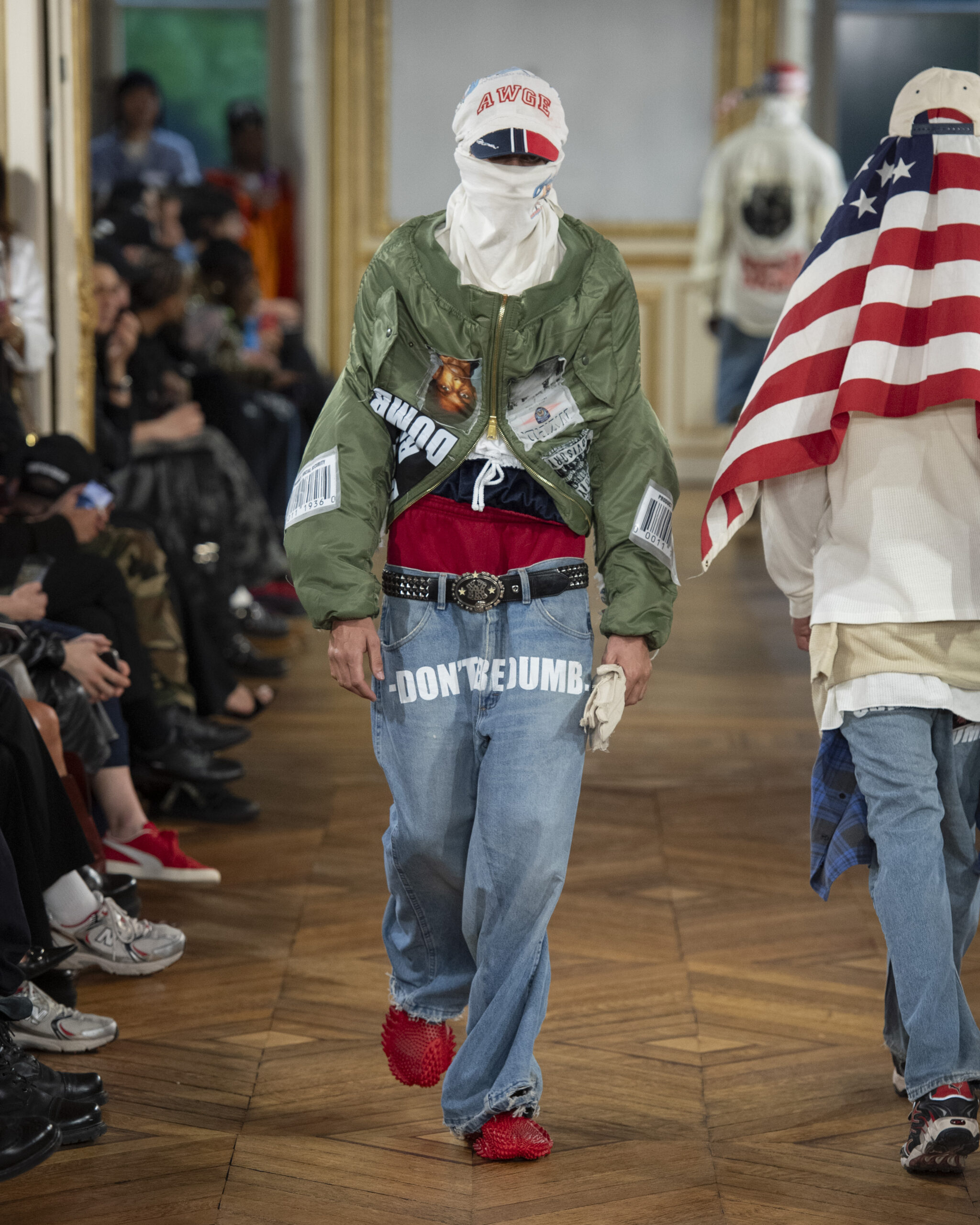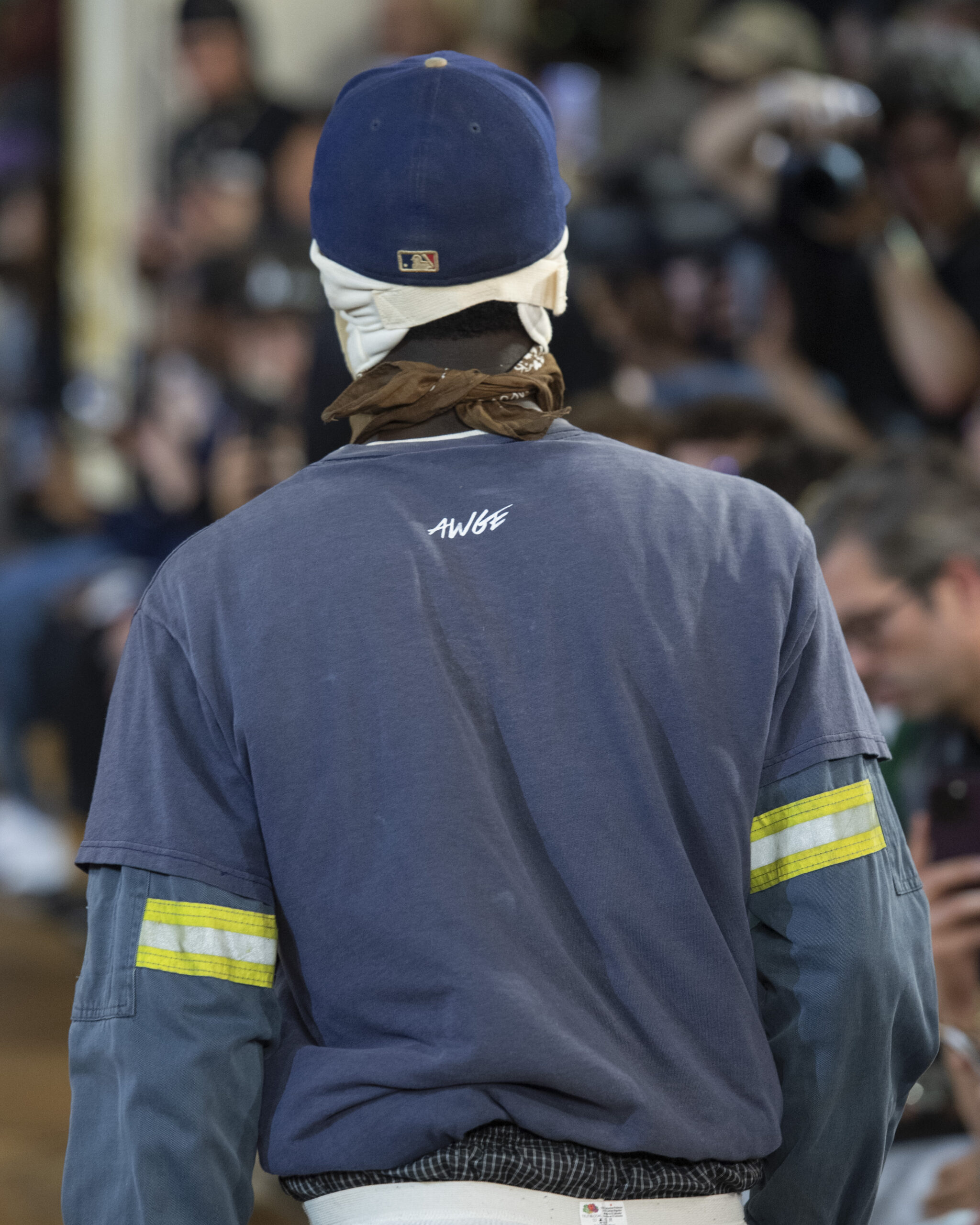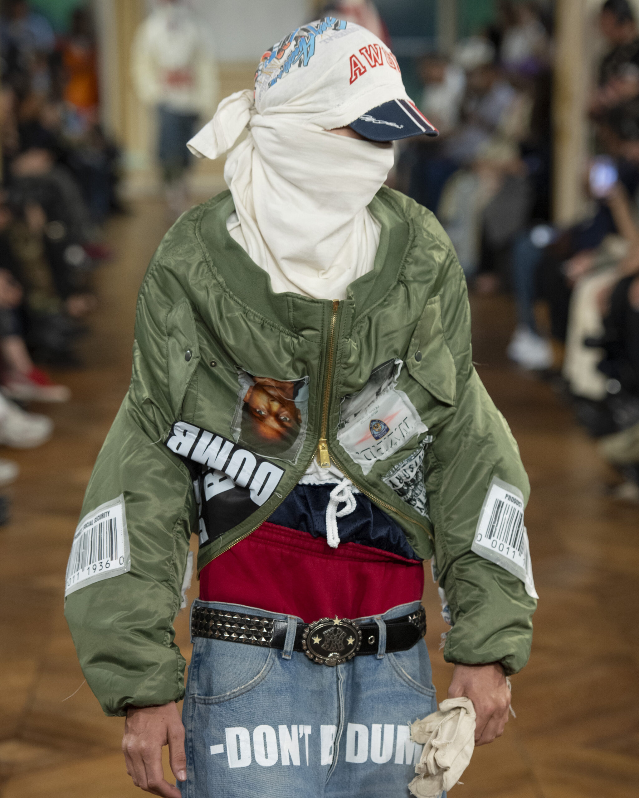 Le décor du défilé, comprenant des sacs poubelles transformés en chaises beanbag issues de la marque de mobilier Hommemade, en collaboration avec Crosby Studios, ajoutait une dimension immersive à cette expérience unique. Le défilé a été rythmé par la bande-son du prochain album d’A$AP Rocky, créant une synergie entre mode et musique.