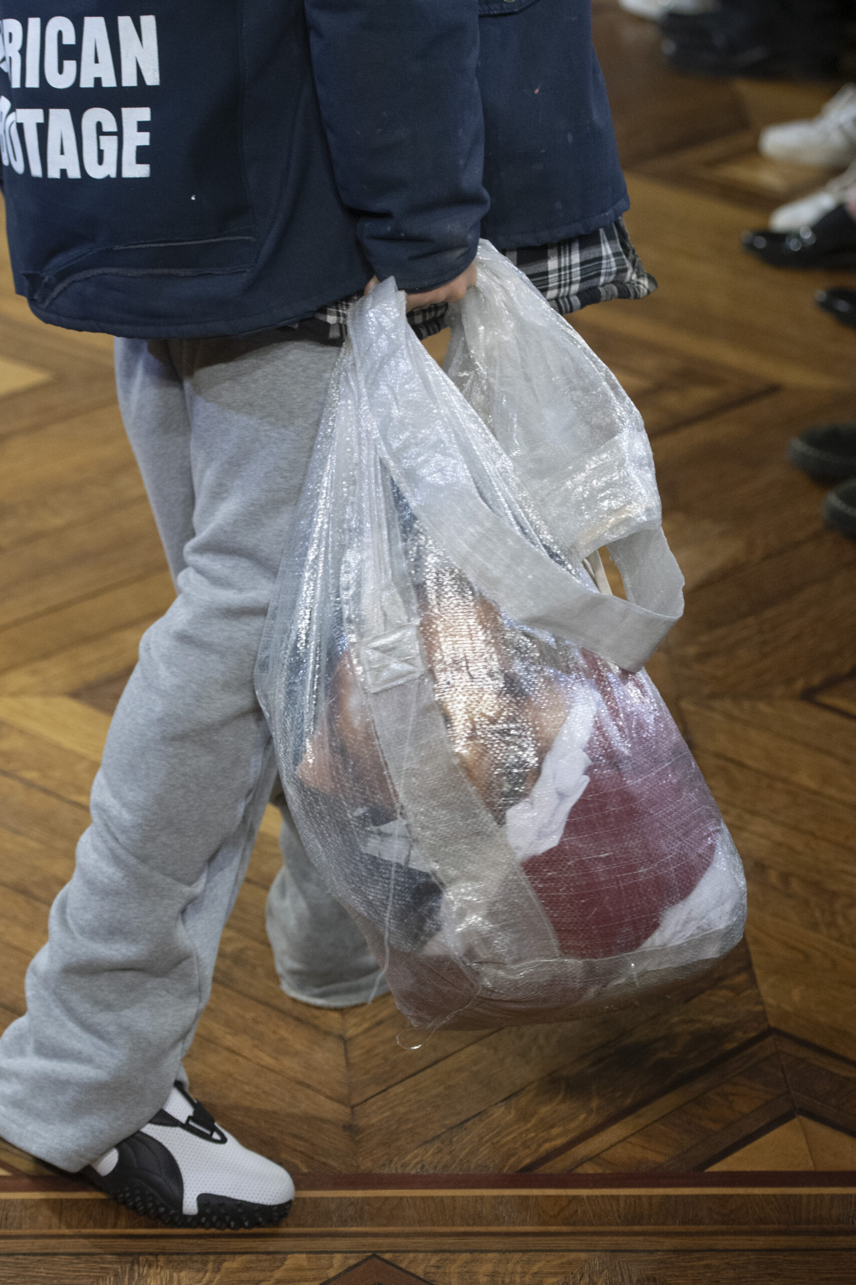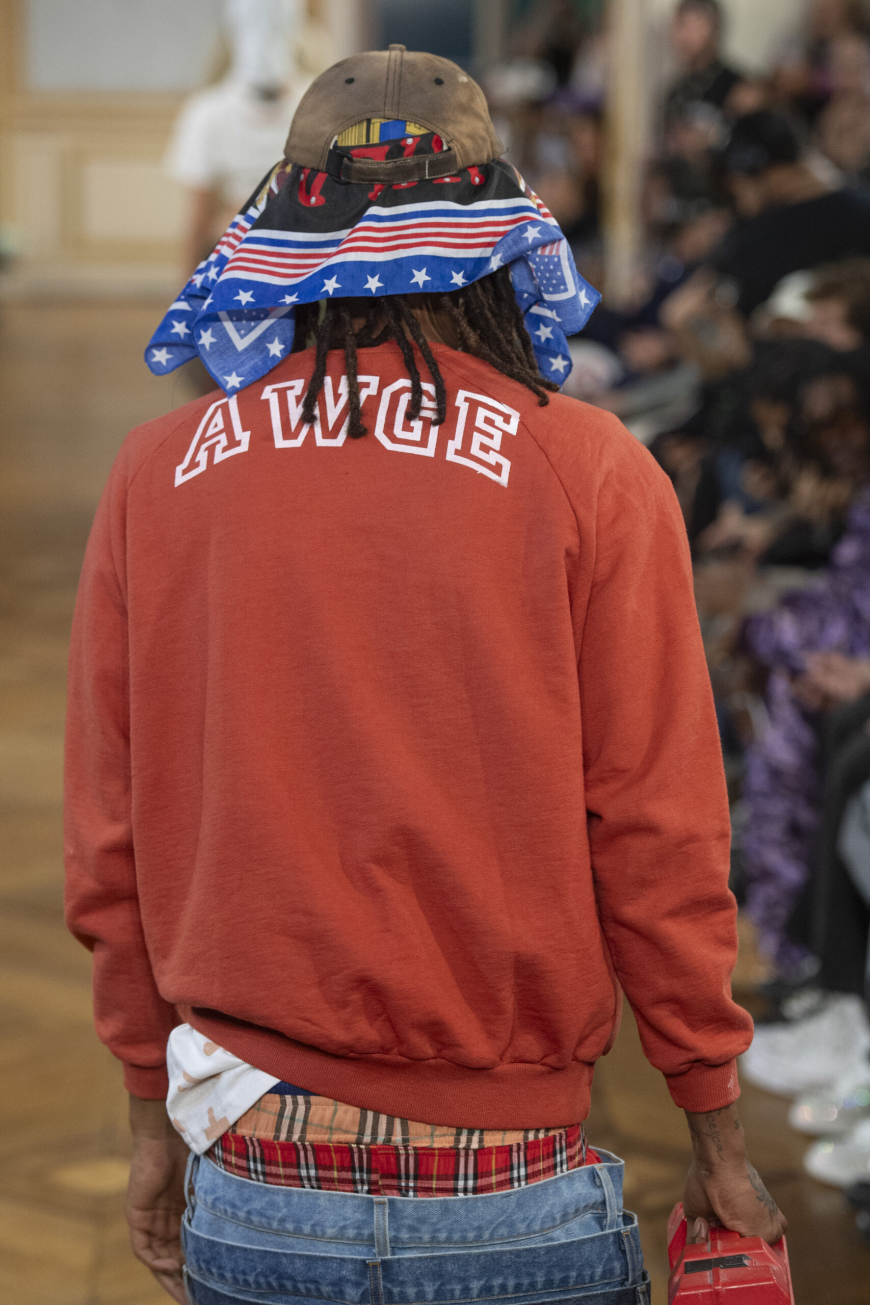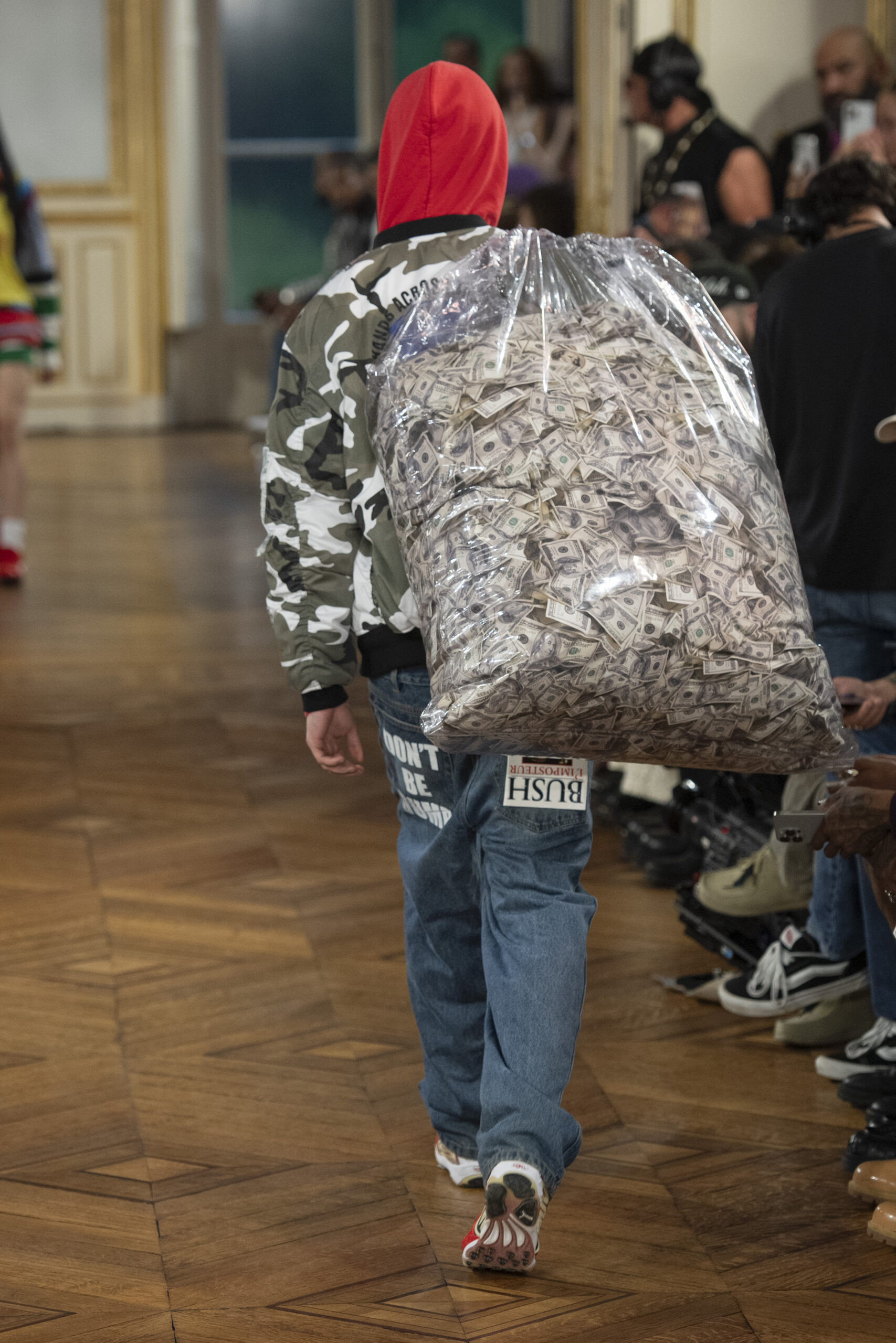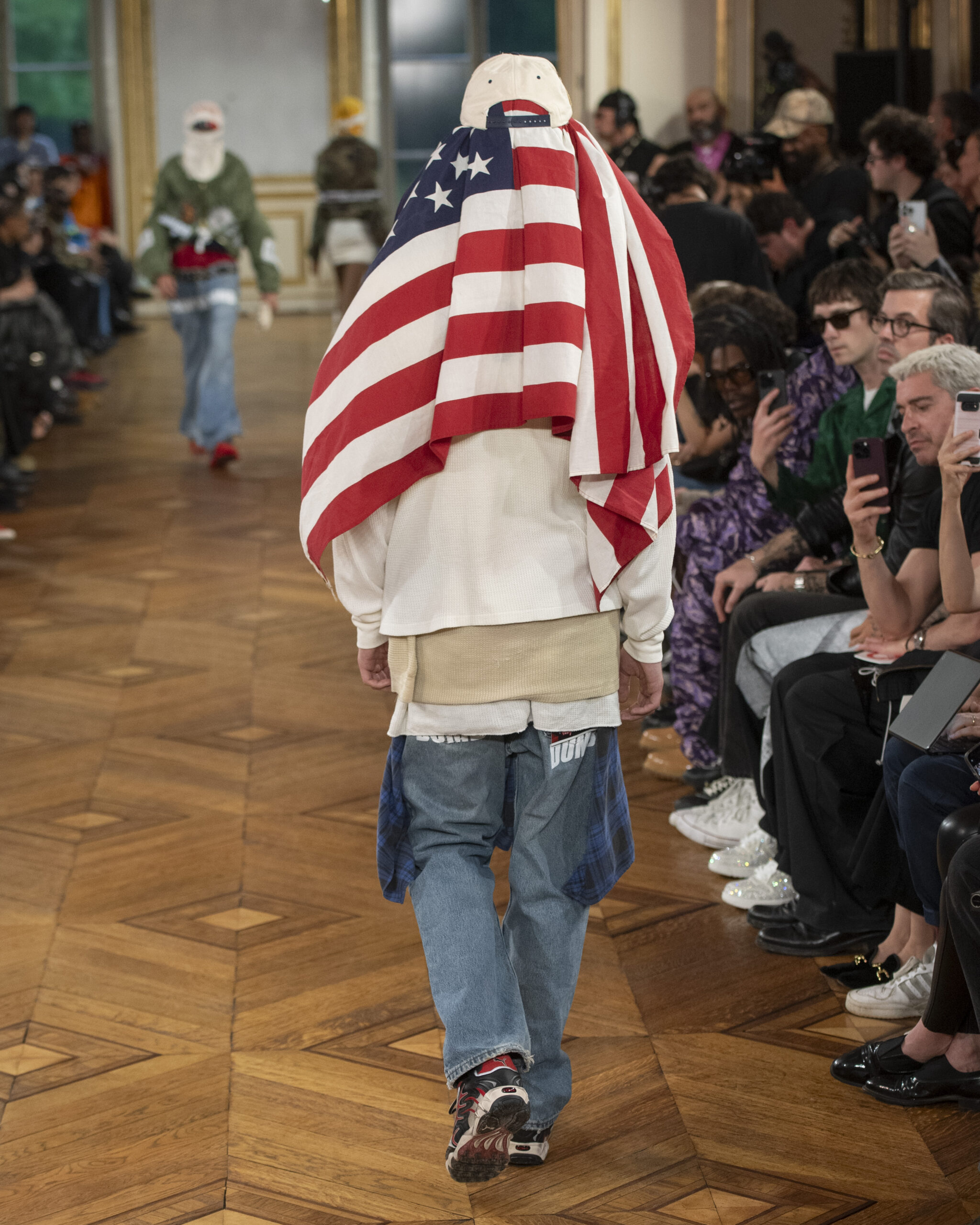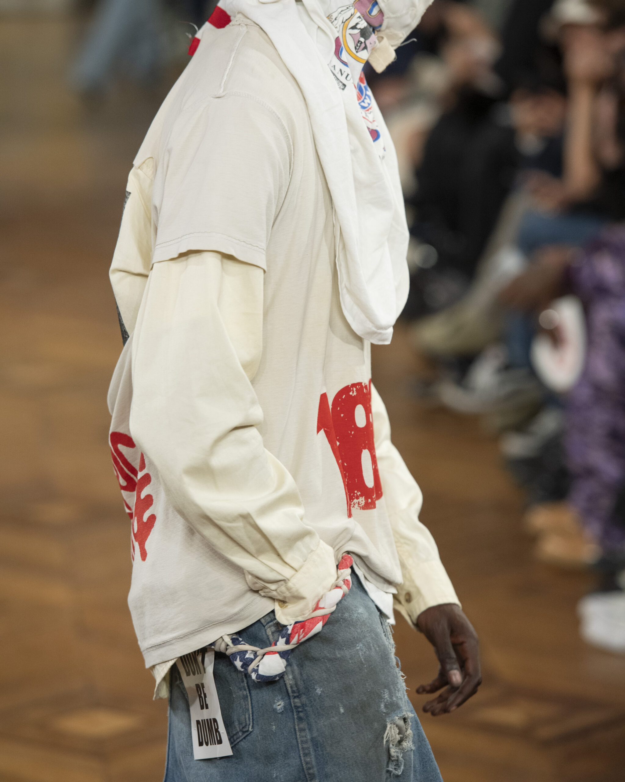 Le décor du défilé, comprenant des sacs poubelles transformés en chaises beanbag issues de la marque de mobilier Hommemade, en collaboration avec Crosby Studios, ajoutait une dimension immersive à cette expérience unique. Le défilé a été rythmé par la bande-son du prochain album d’A$AP Rocky, créant une synergie entre mode et musique.
