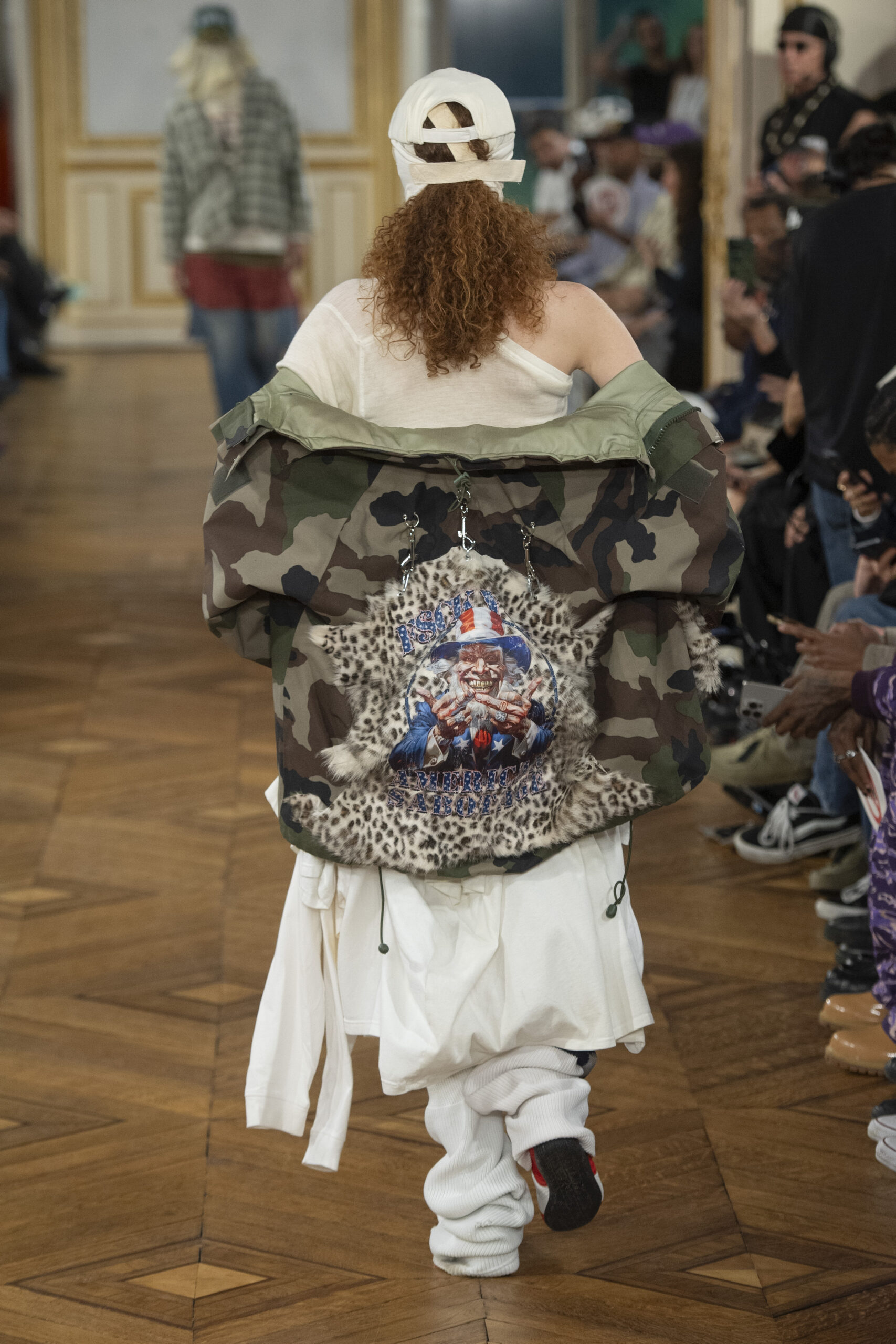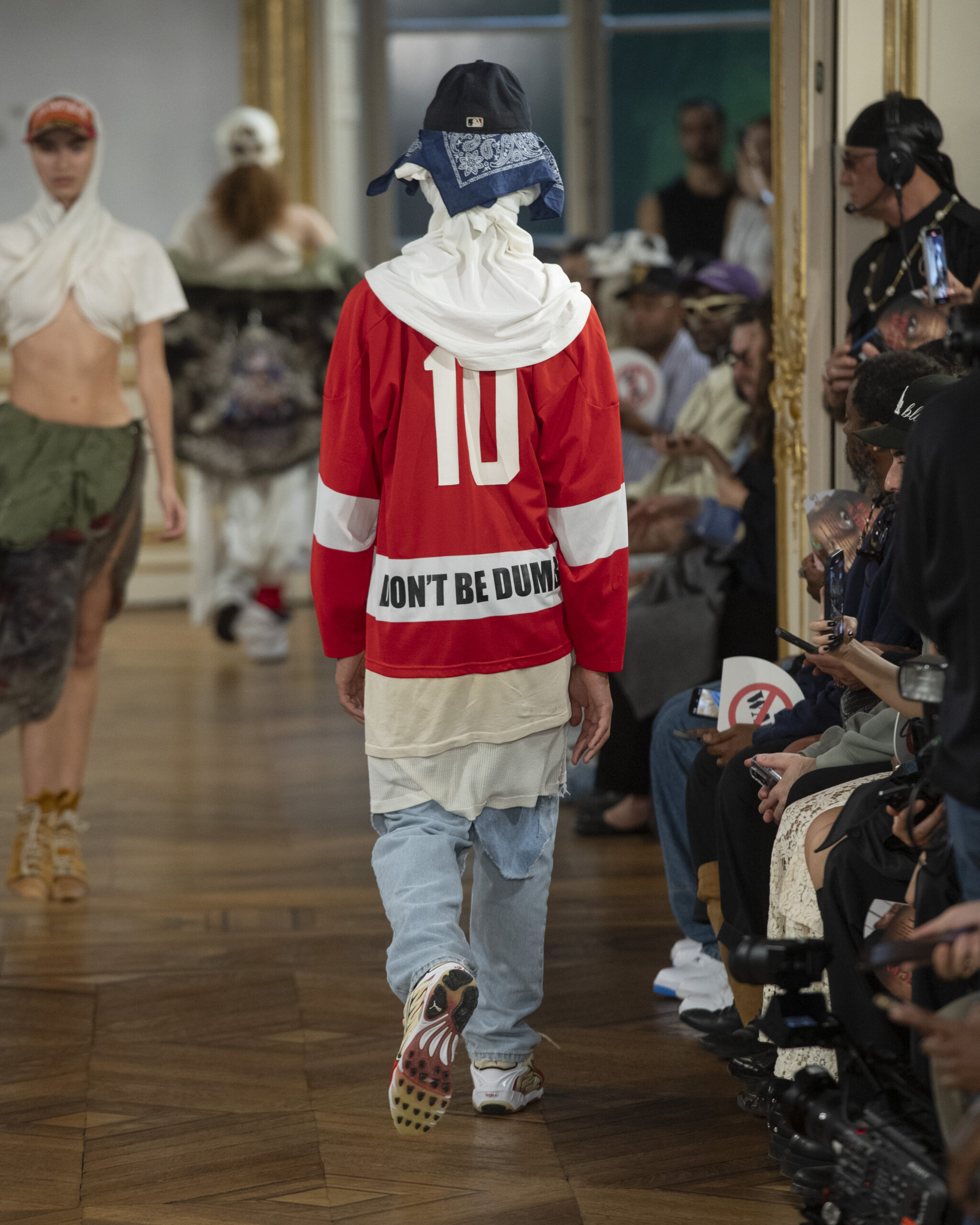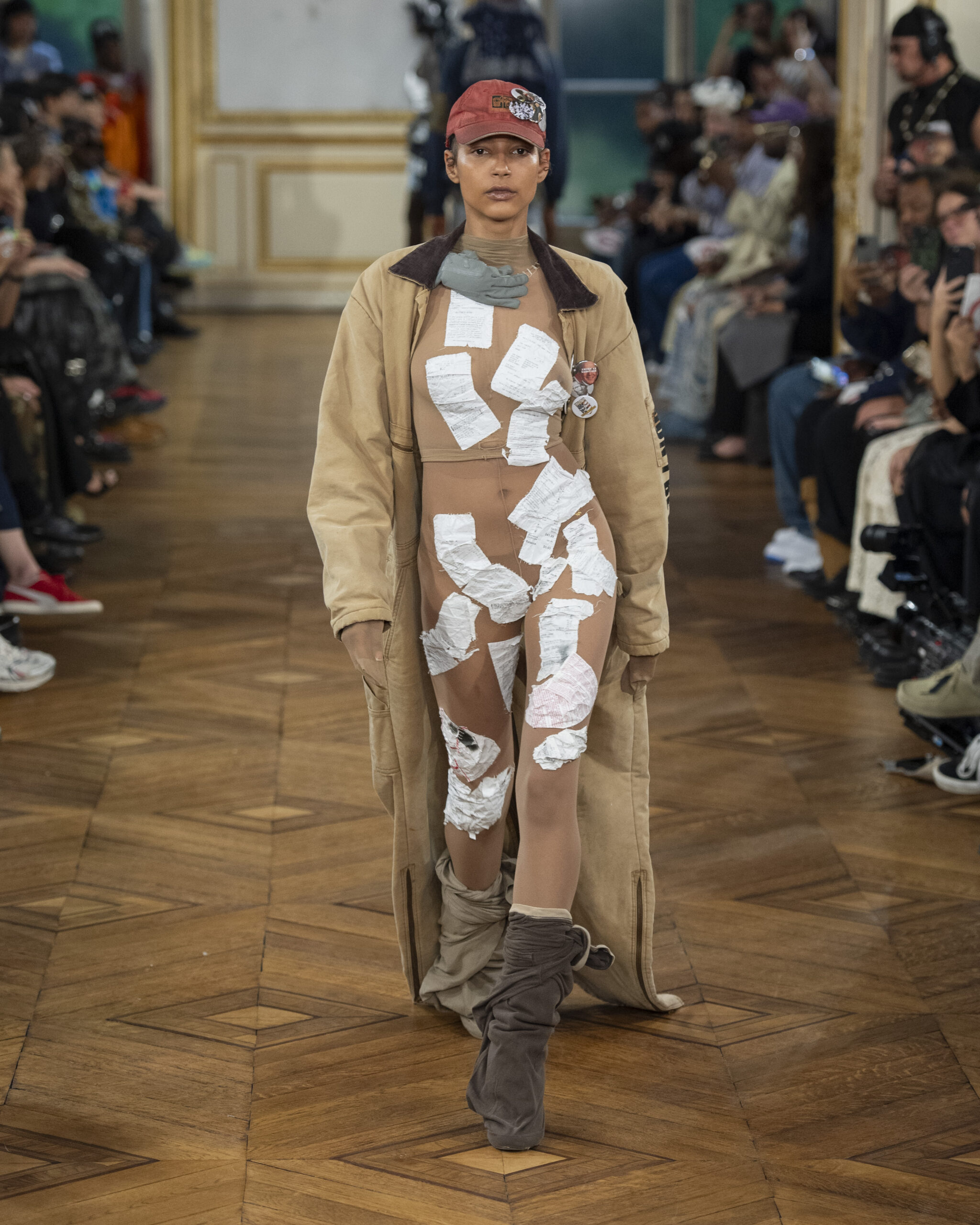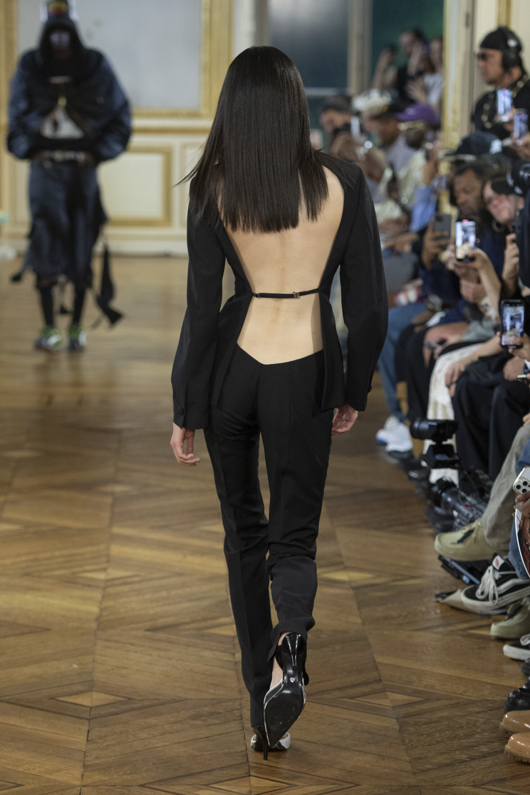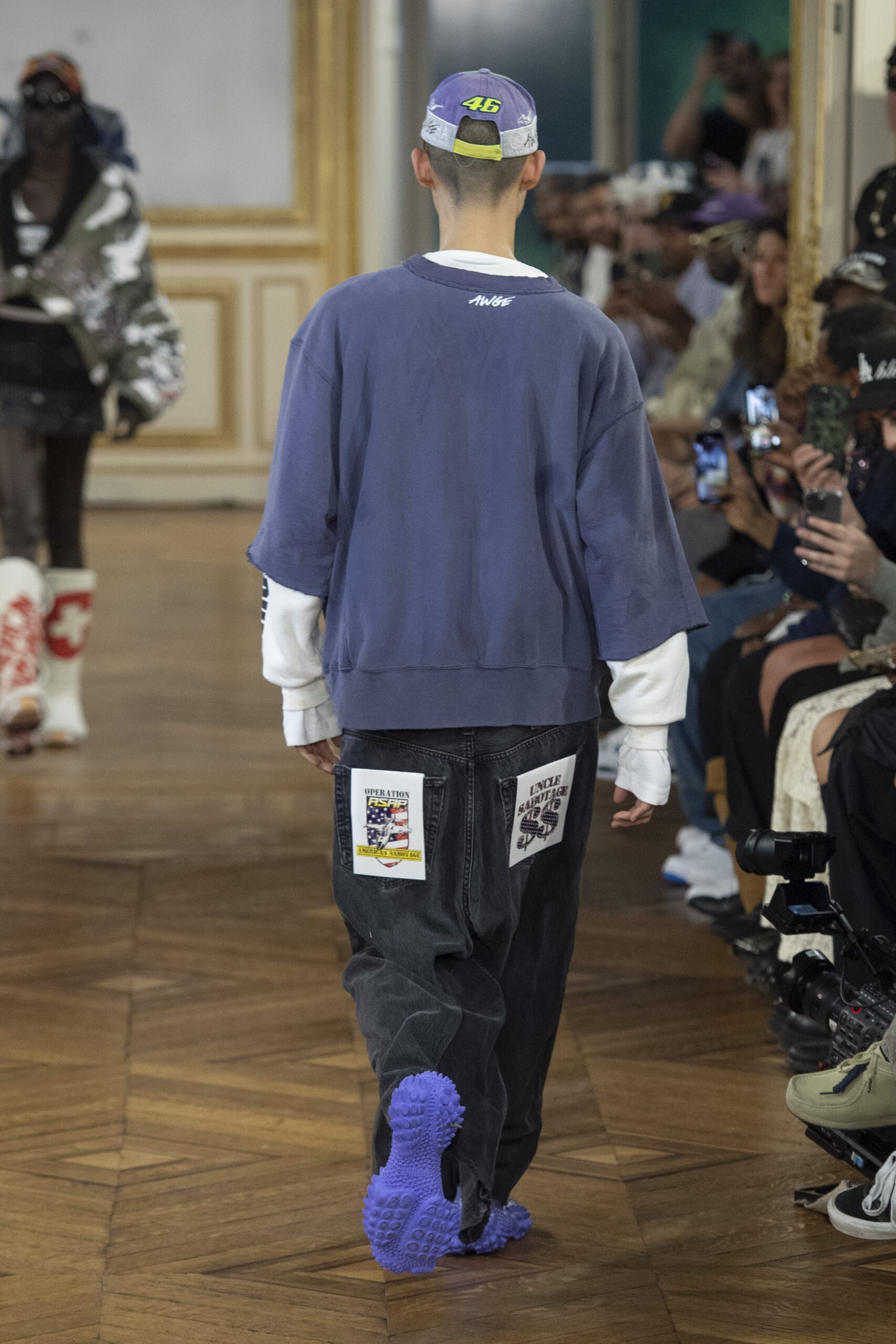 Le décor du défilé, comprenant des sacs poubelles transformés en chaises beanbag issues de la marque de mobilier Hommemade, en collaboration avec Crosby Studios, ajoutait une dimension immersive à cette expérience unique. Le défilé a été rythmé par la bande-son du prochain album d’A$AP Rocky, créant une synergie entre mode et musique.