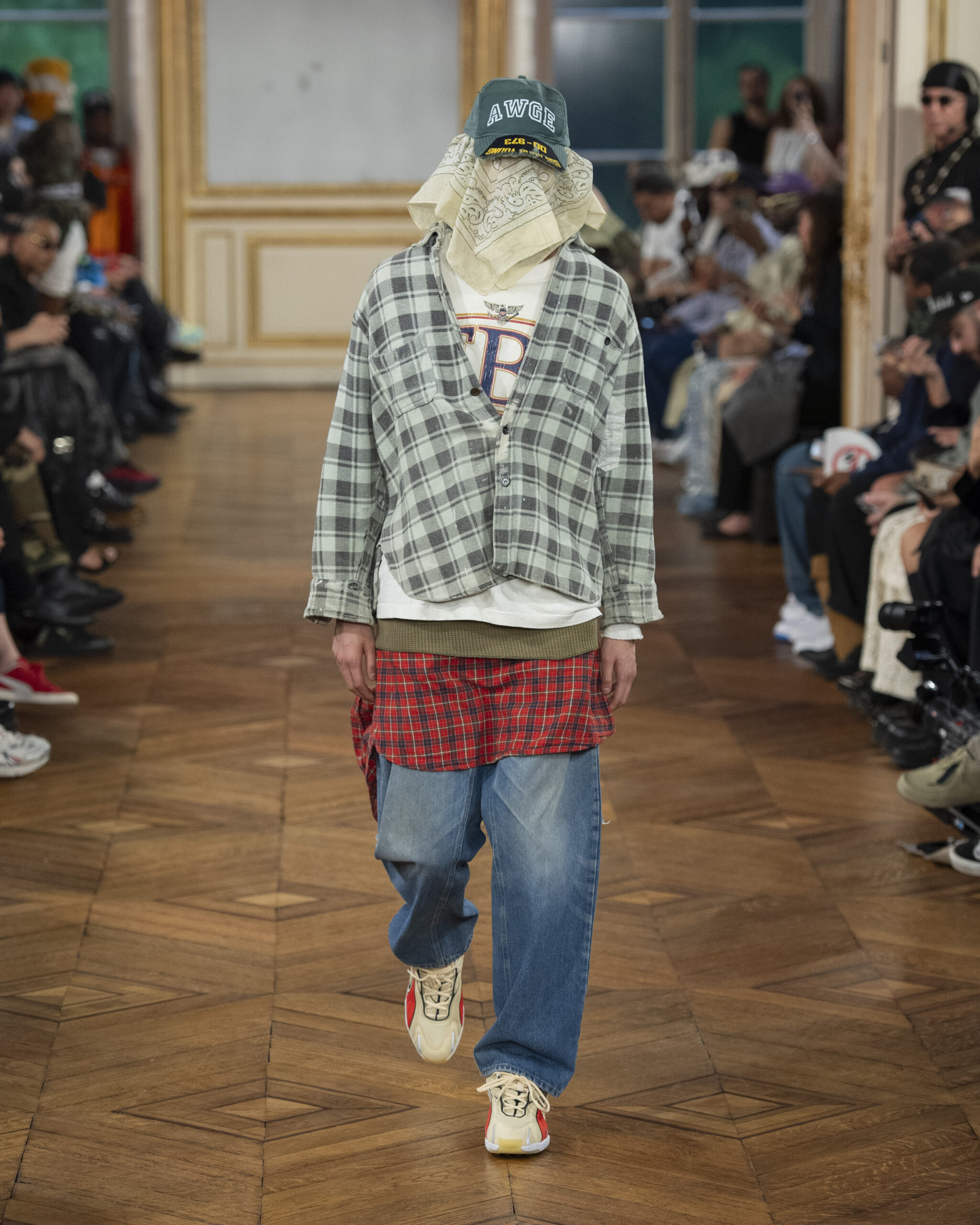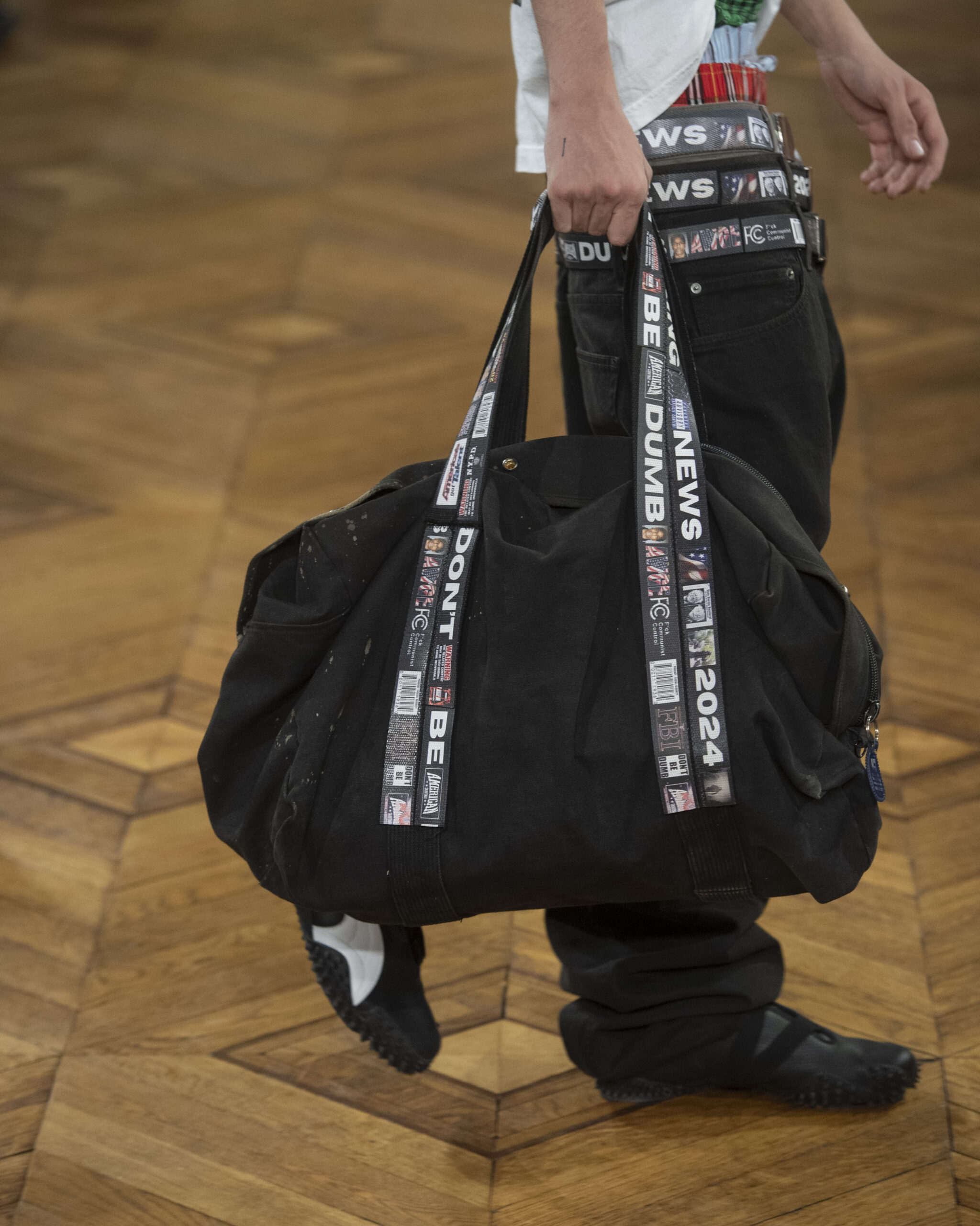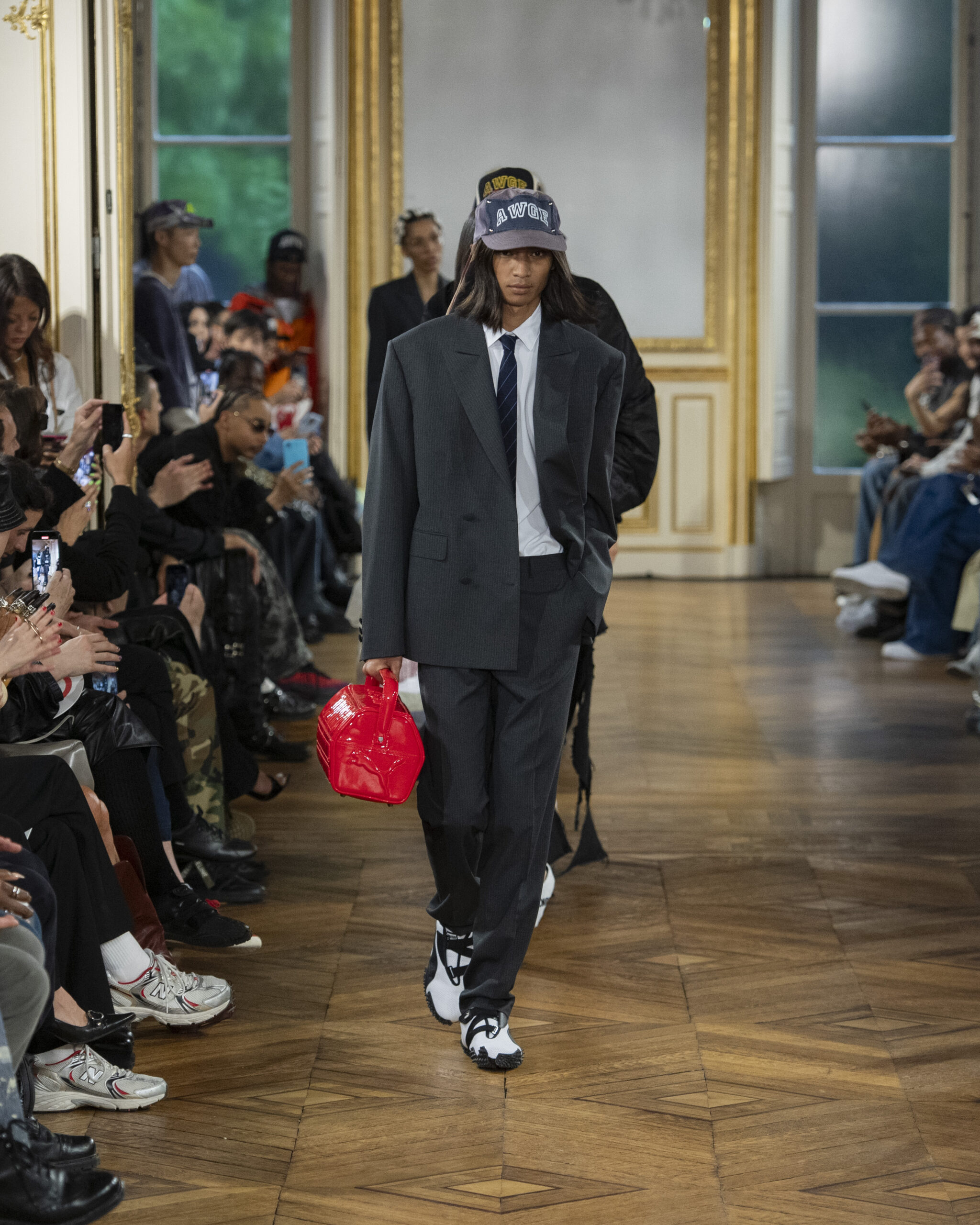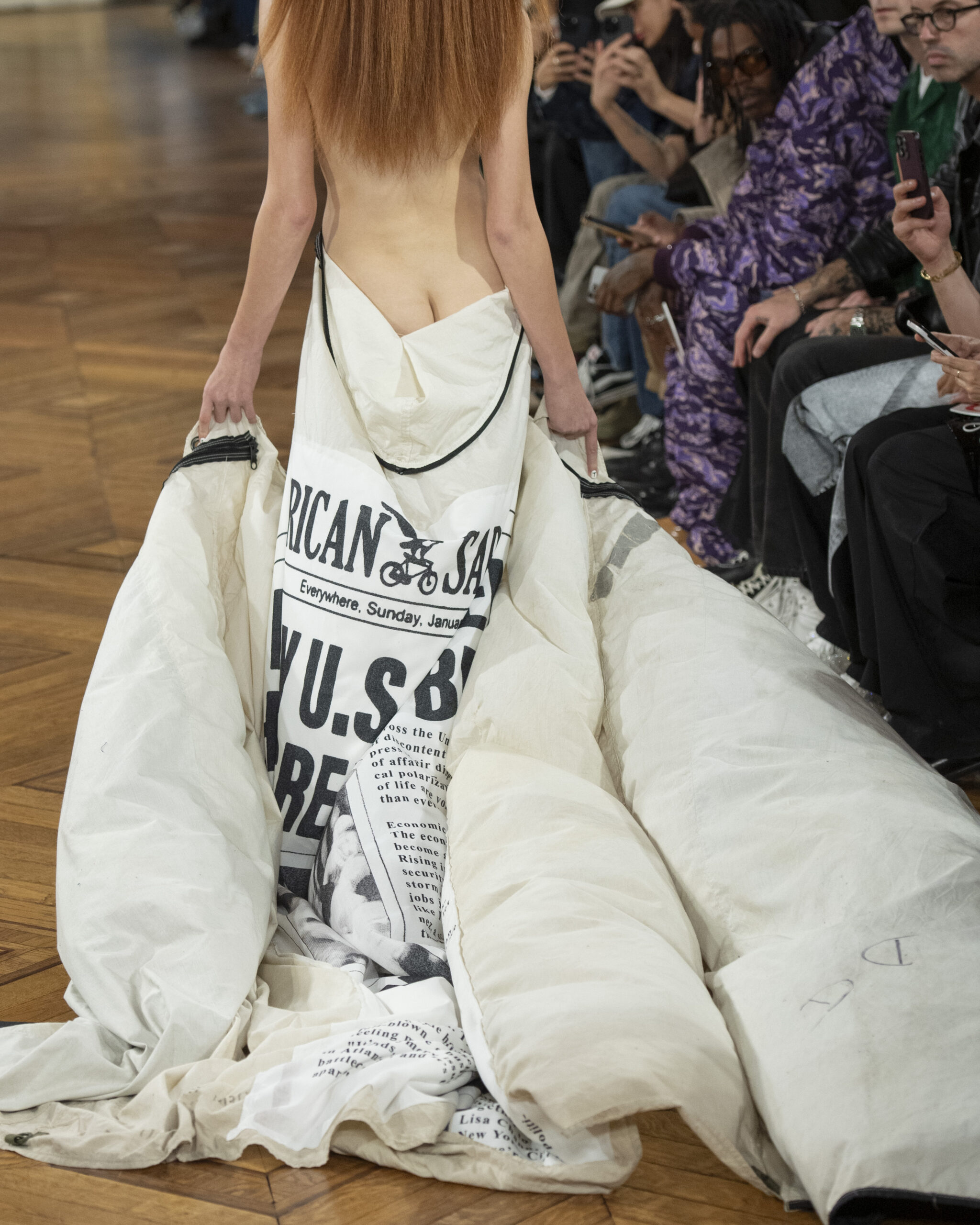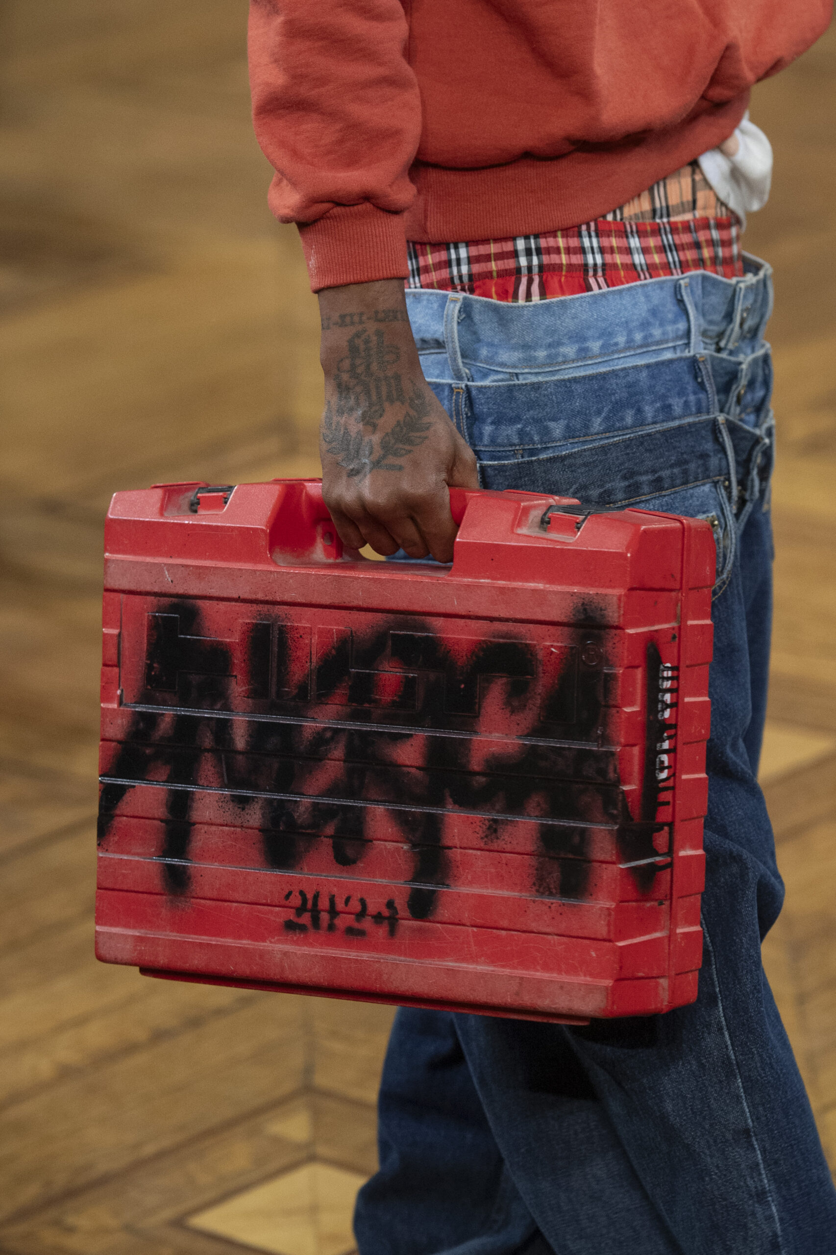 Le décor du défilé, comprenant des sacs poubelles transformés en chaises beanbag issues de la marque de mobilier Hommemade, en collaboration avec Crosby Studios, ajoutait une dimension immersive à cette expérience unique. Le défilé a été rythmé par la bande-son du prochain album d’A$AP Rocky, créant une synergie entre mode et musique.