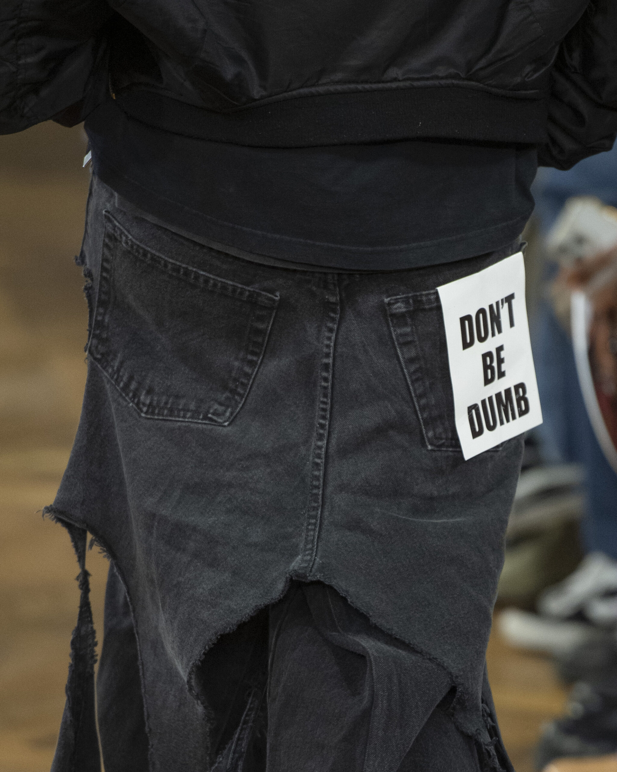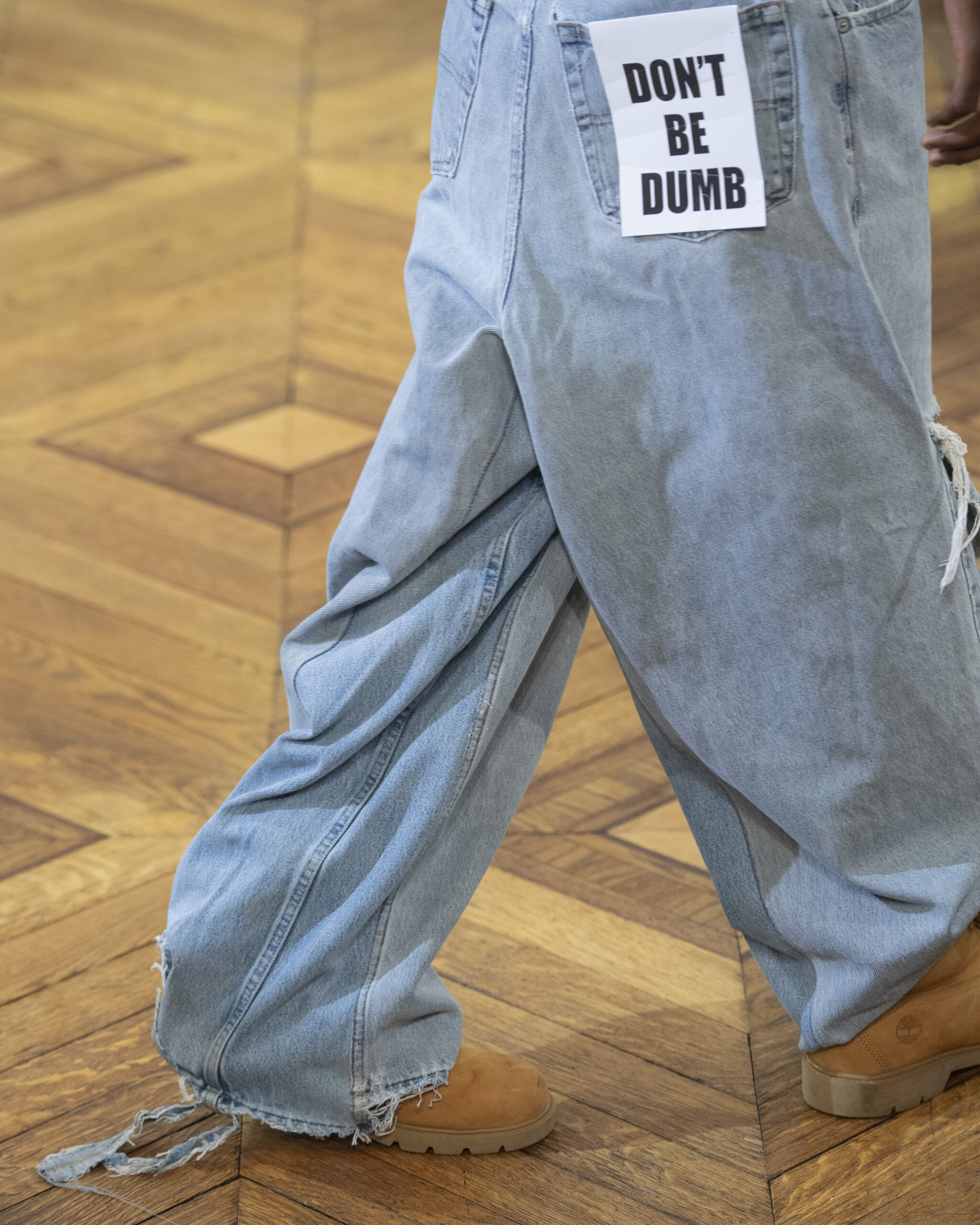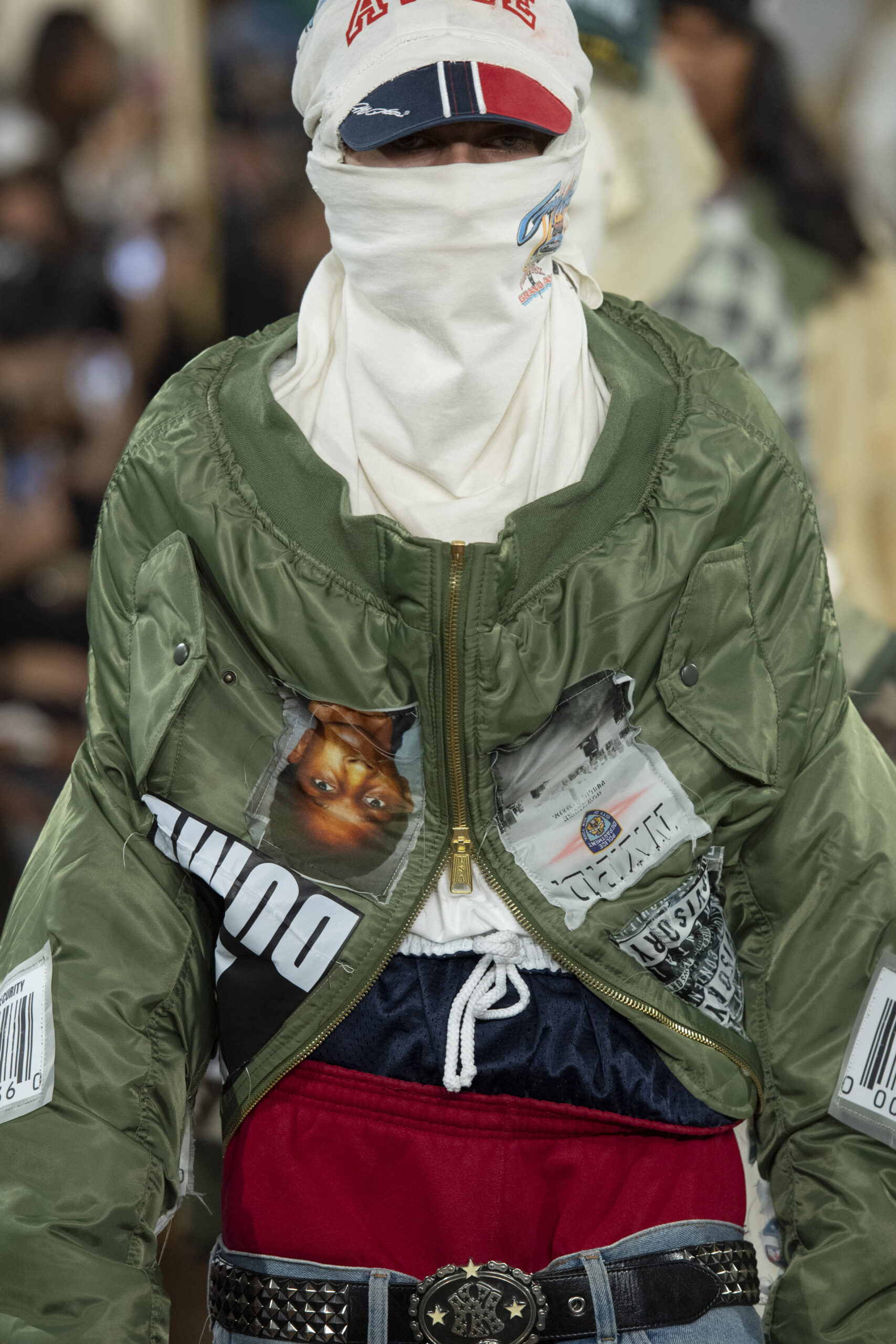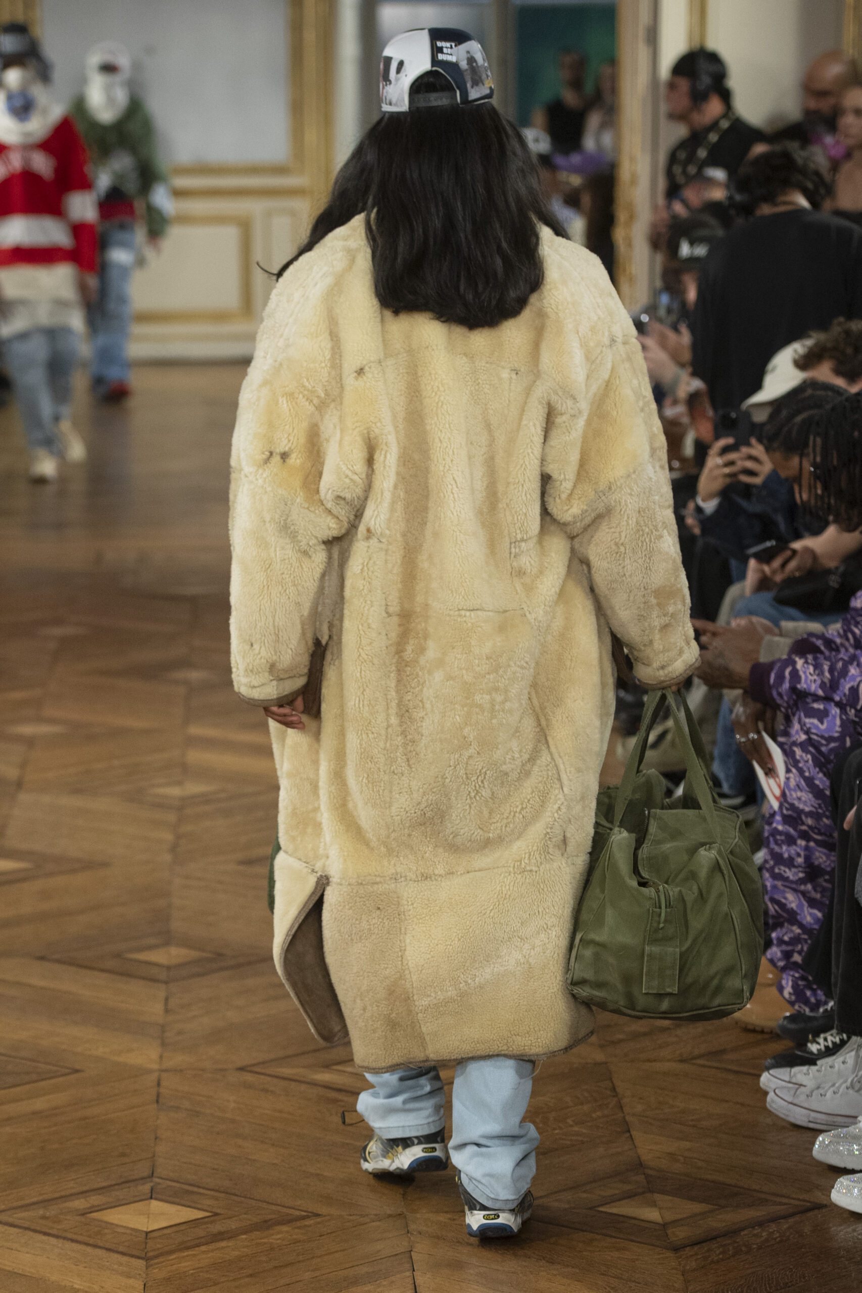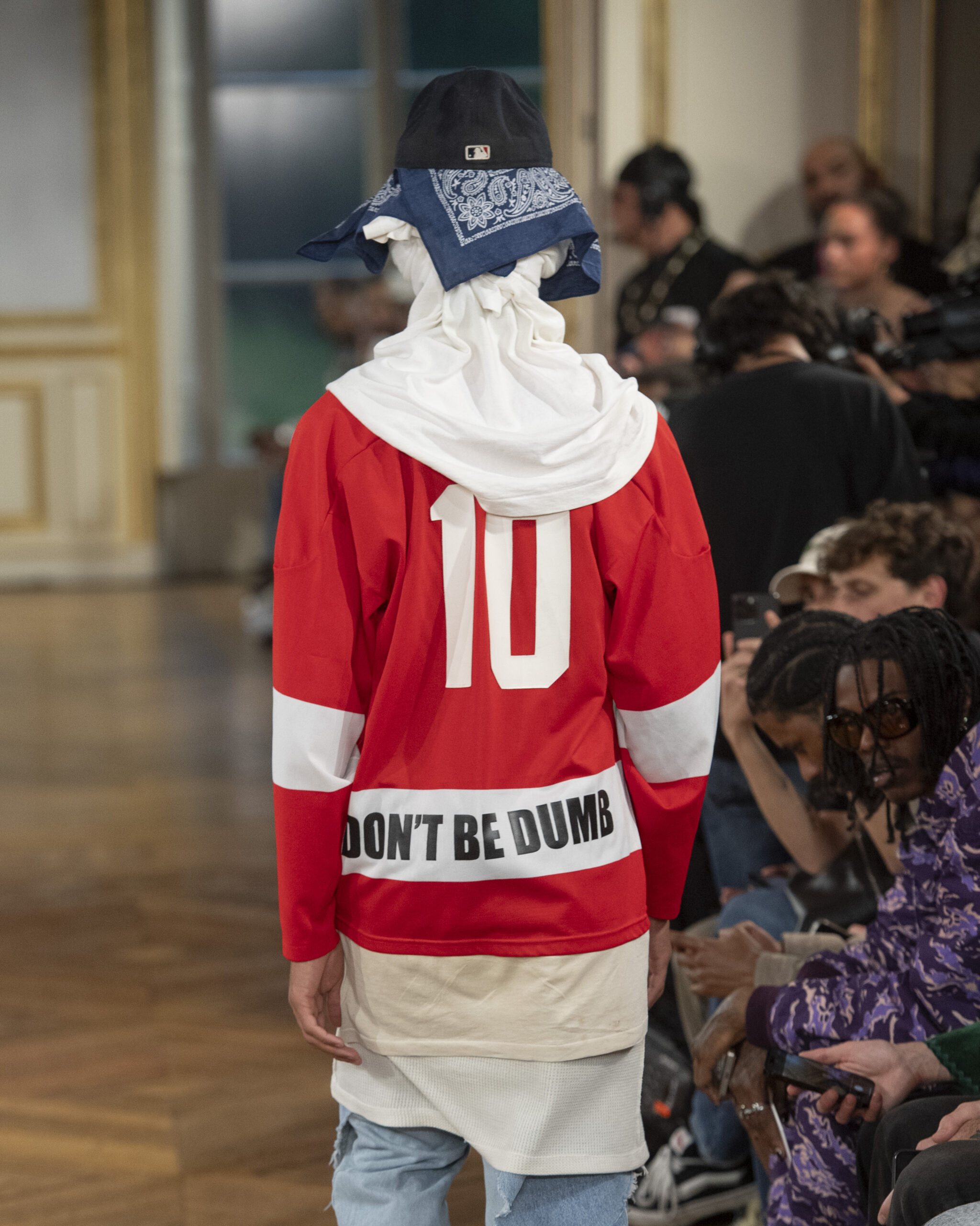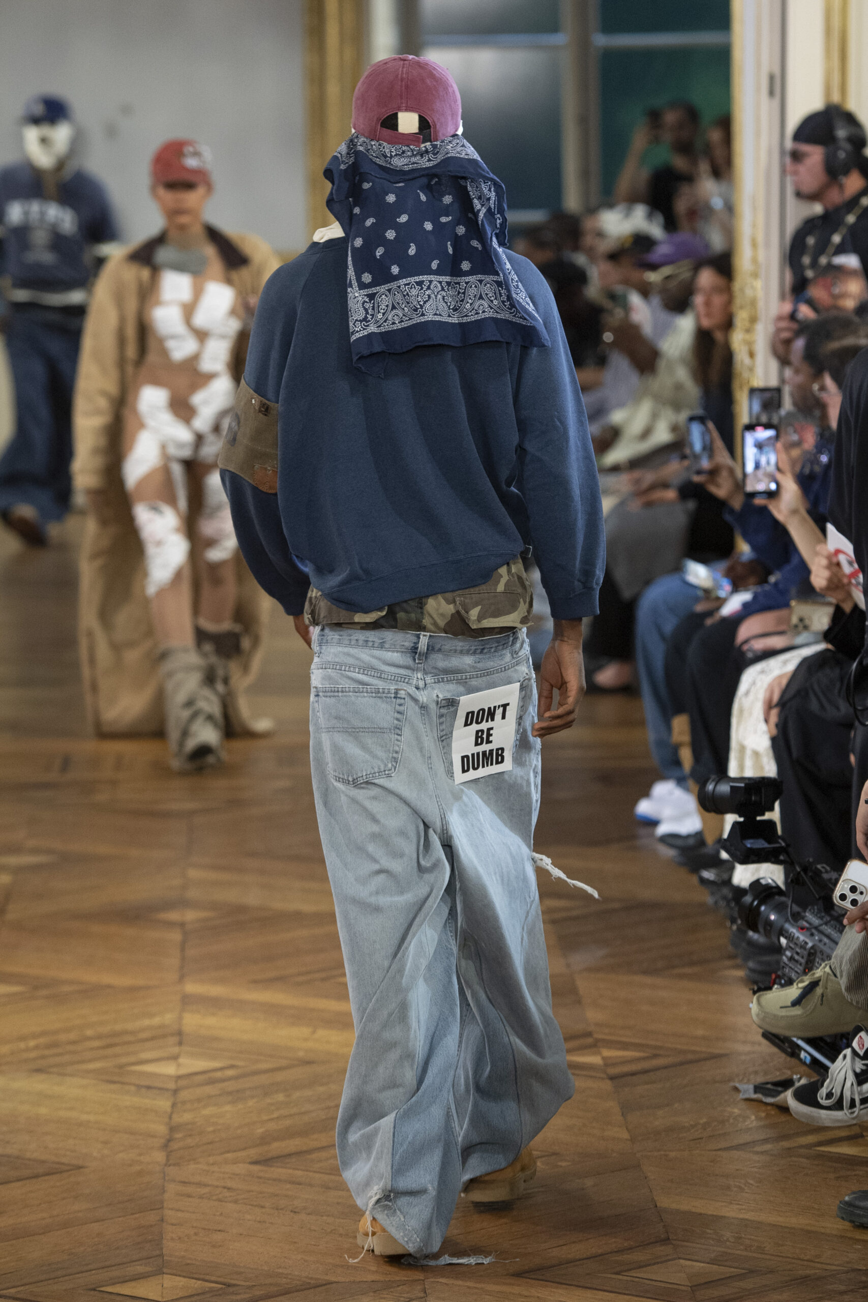 Le décor du défilé, comprenant des sacs poubelles transformés en chaises beanbag issues de la marque de mobilier Hommemade, en collaboration avec Crosby Studios, ajoutait une dimension immersive à cette expérience unique. Le défilé a été rythmé par la bande-son du prochain album d’A$AP Rocky, créant une synergie entre mode et musique.
