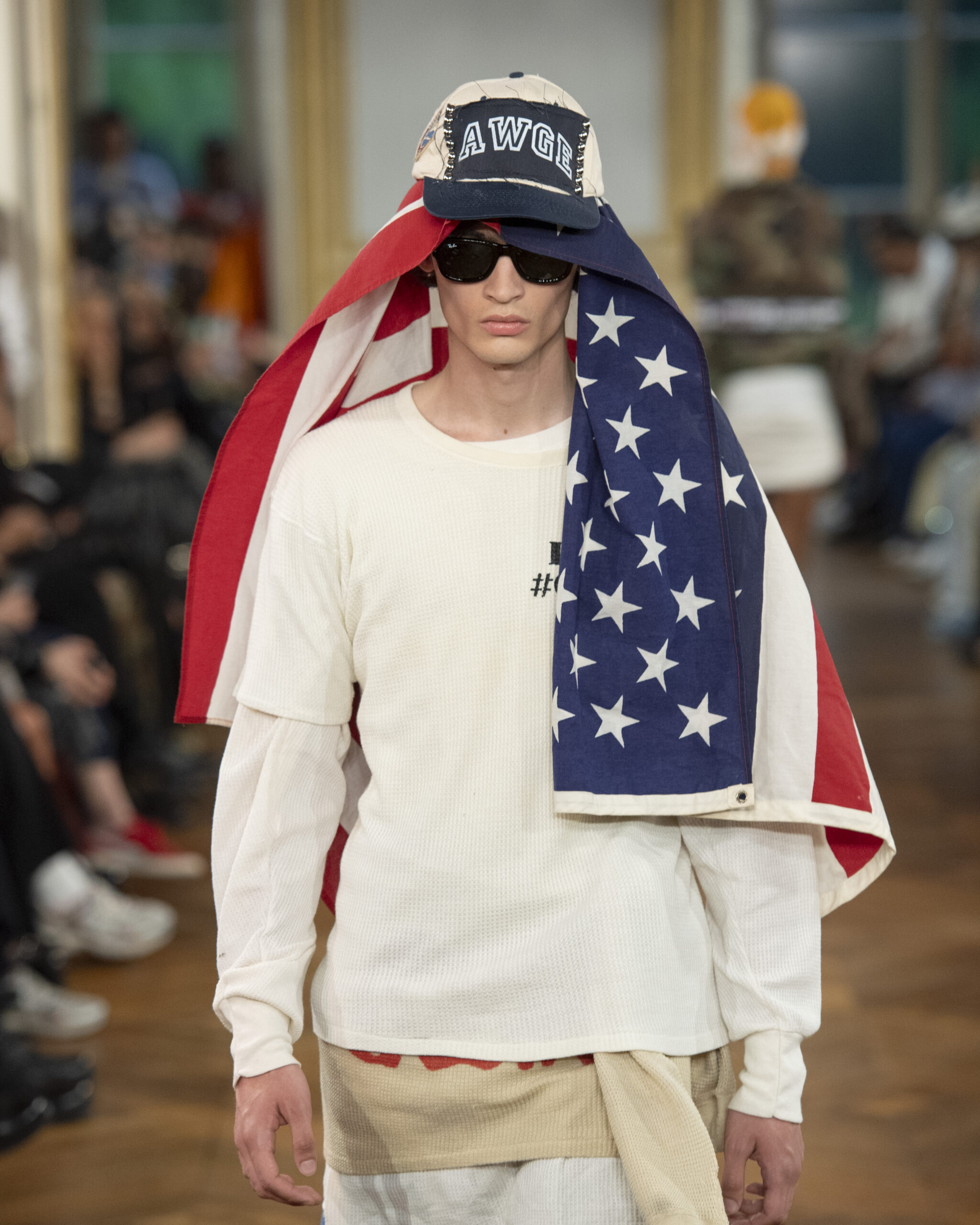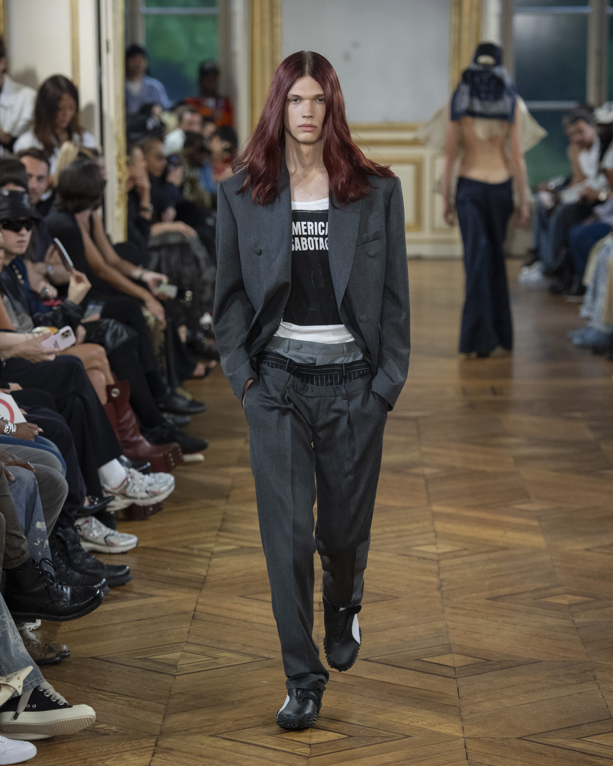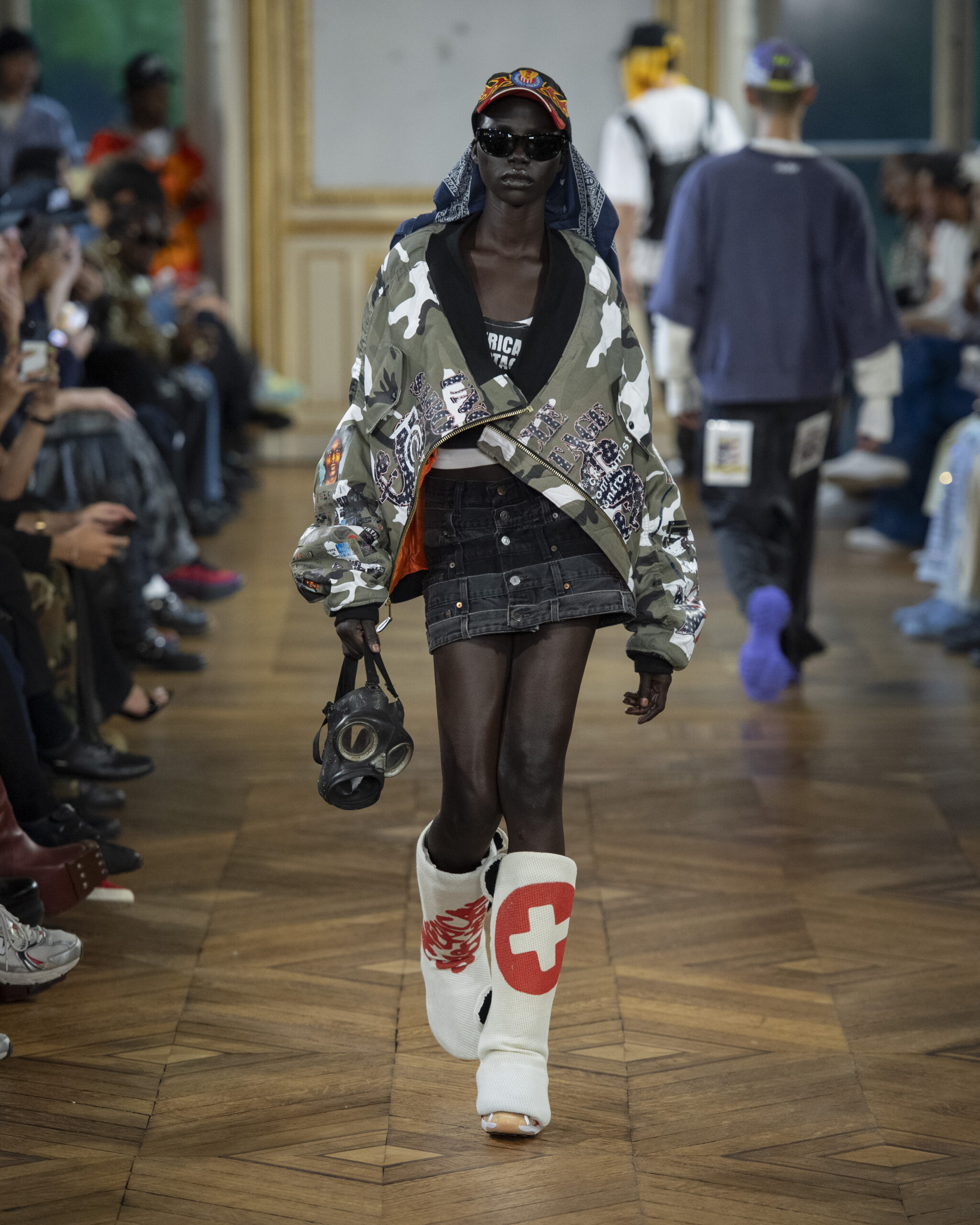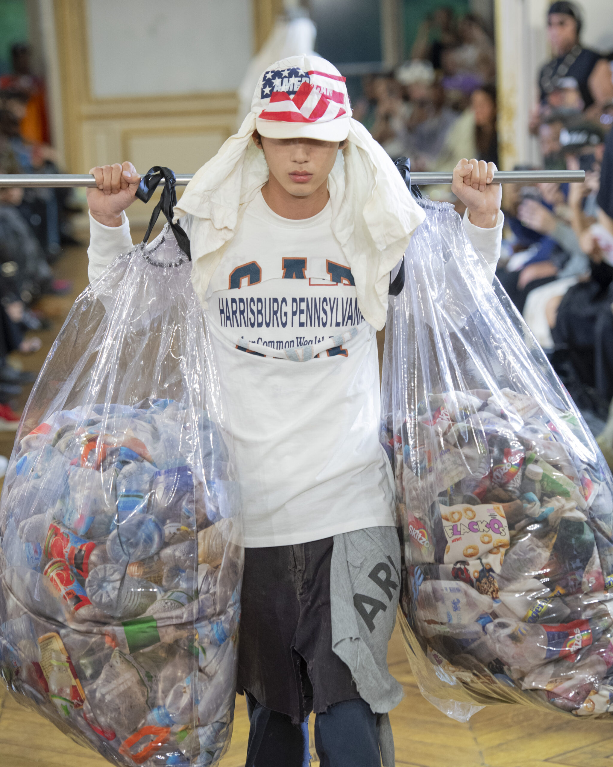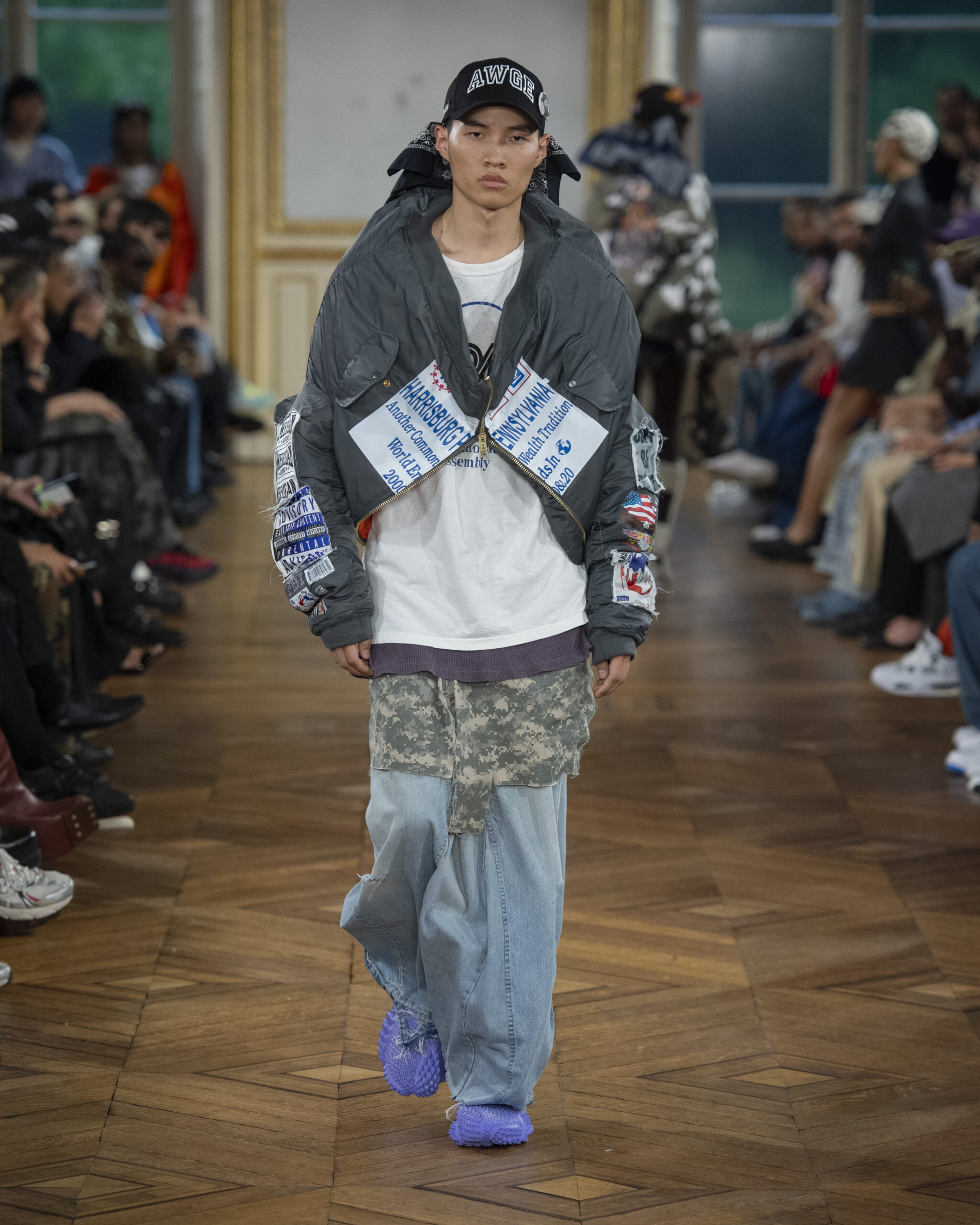 Le décor du défilé, comprenant des sacs poubelles transformés en chaises beanbag issues de la marque de mobilier Hommemade, en collaboration avec Crosby Studios, ajoutait une dimension immersive à cette expérience unique. Le défilé a été rythmé par la bande-son du prochain album d’A$AP Rocky, créant une synergie entre mode et musique.