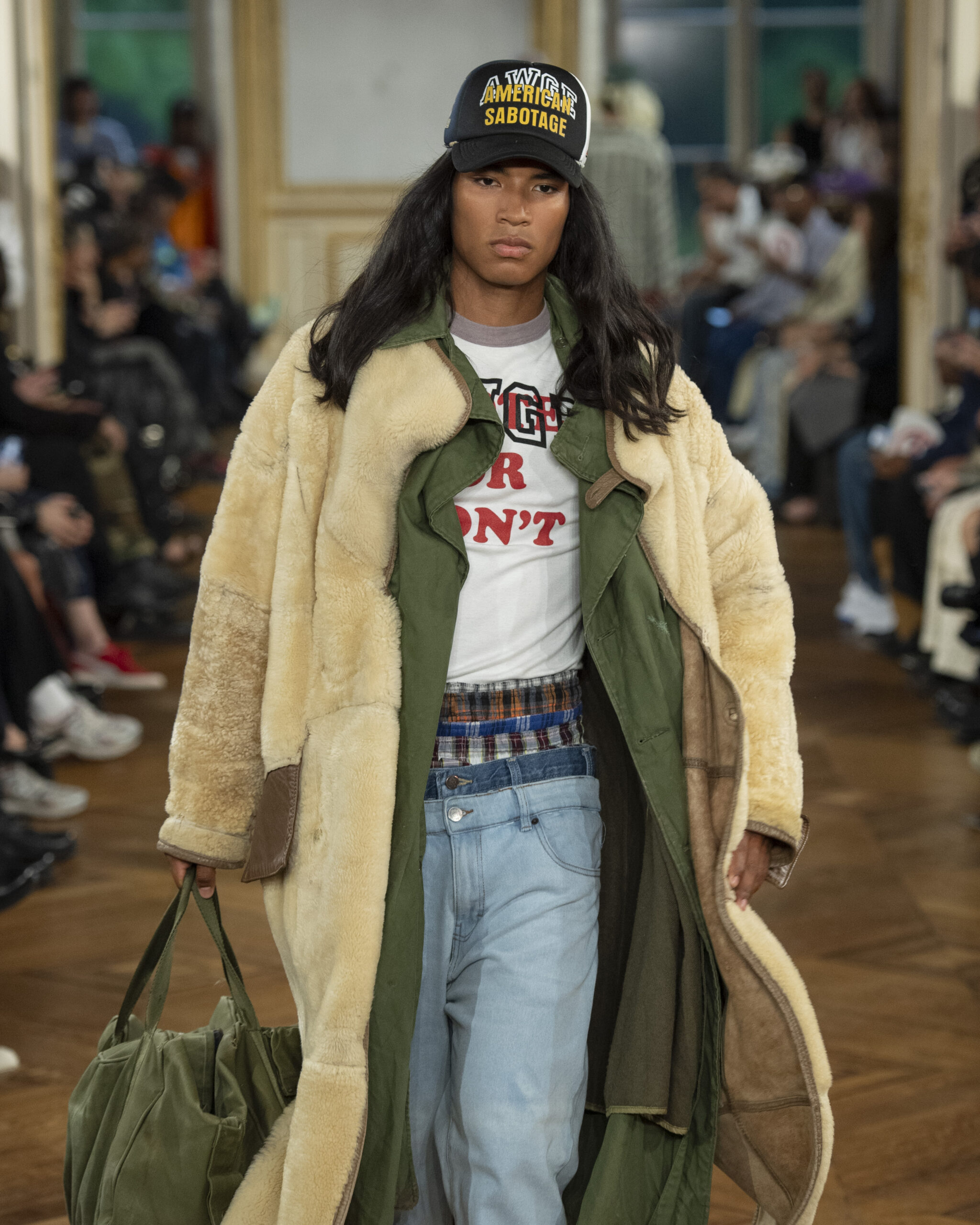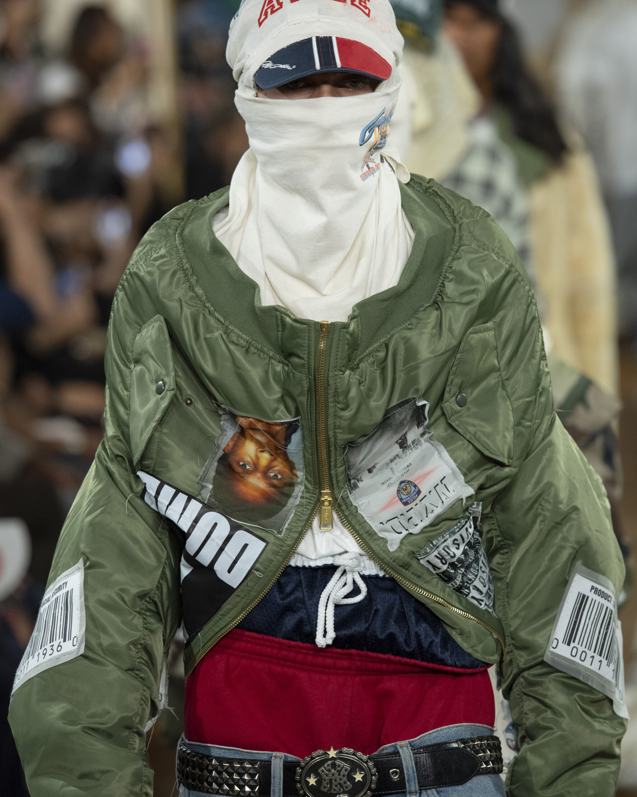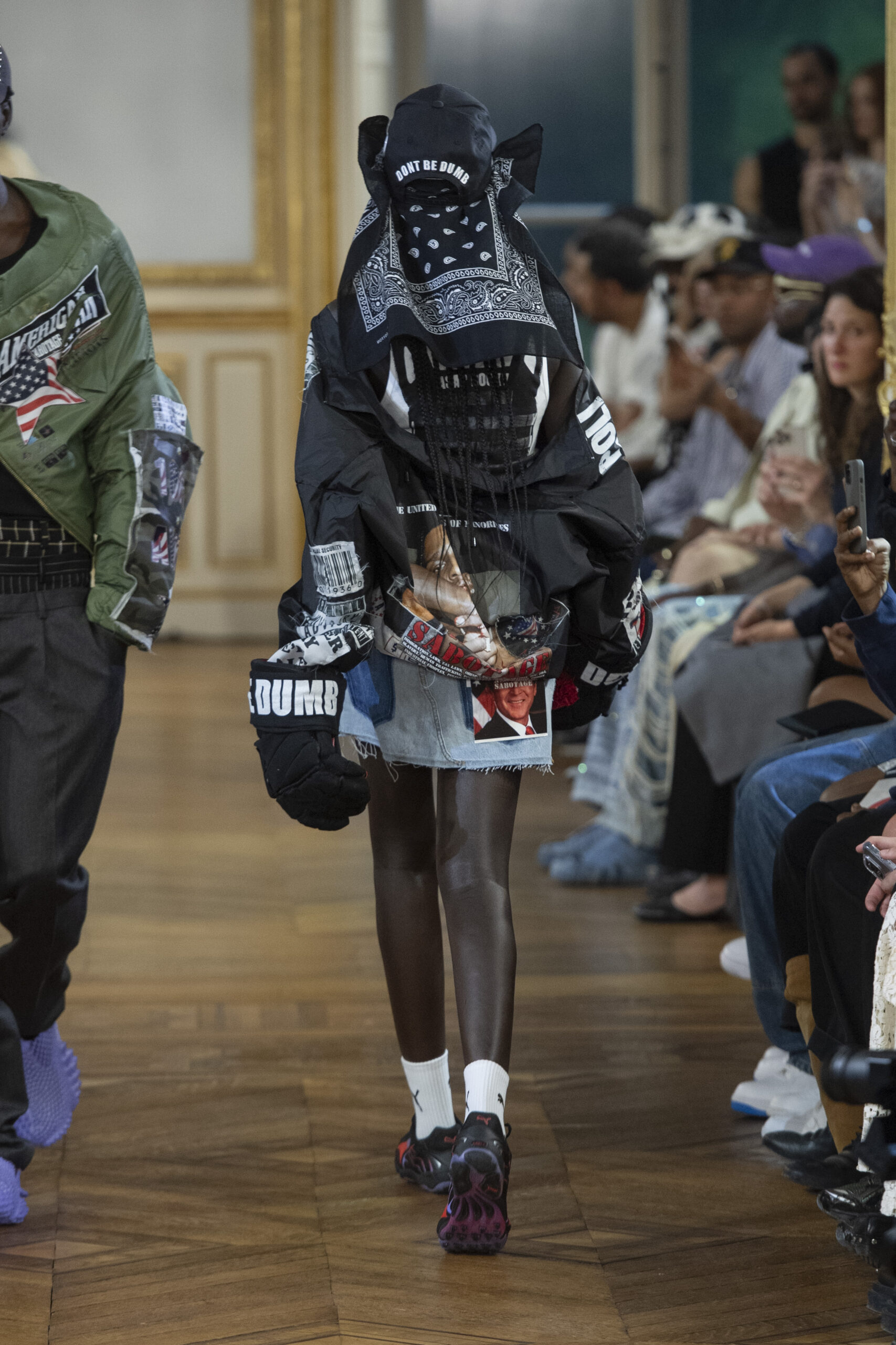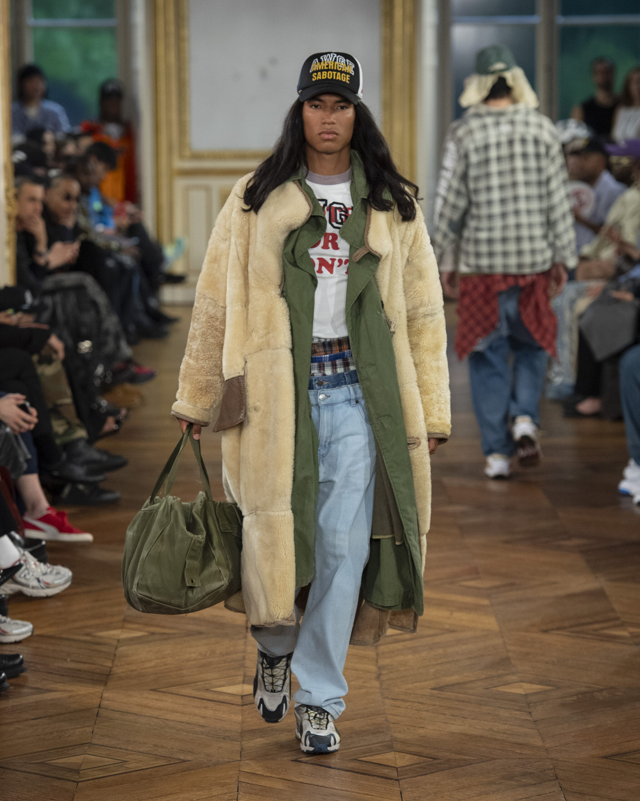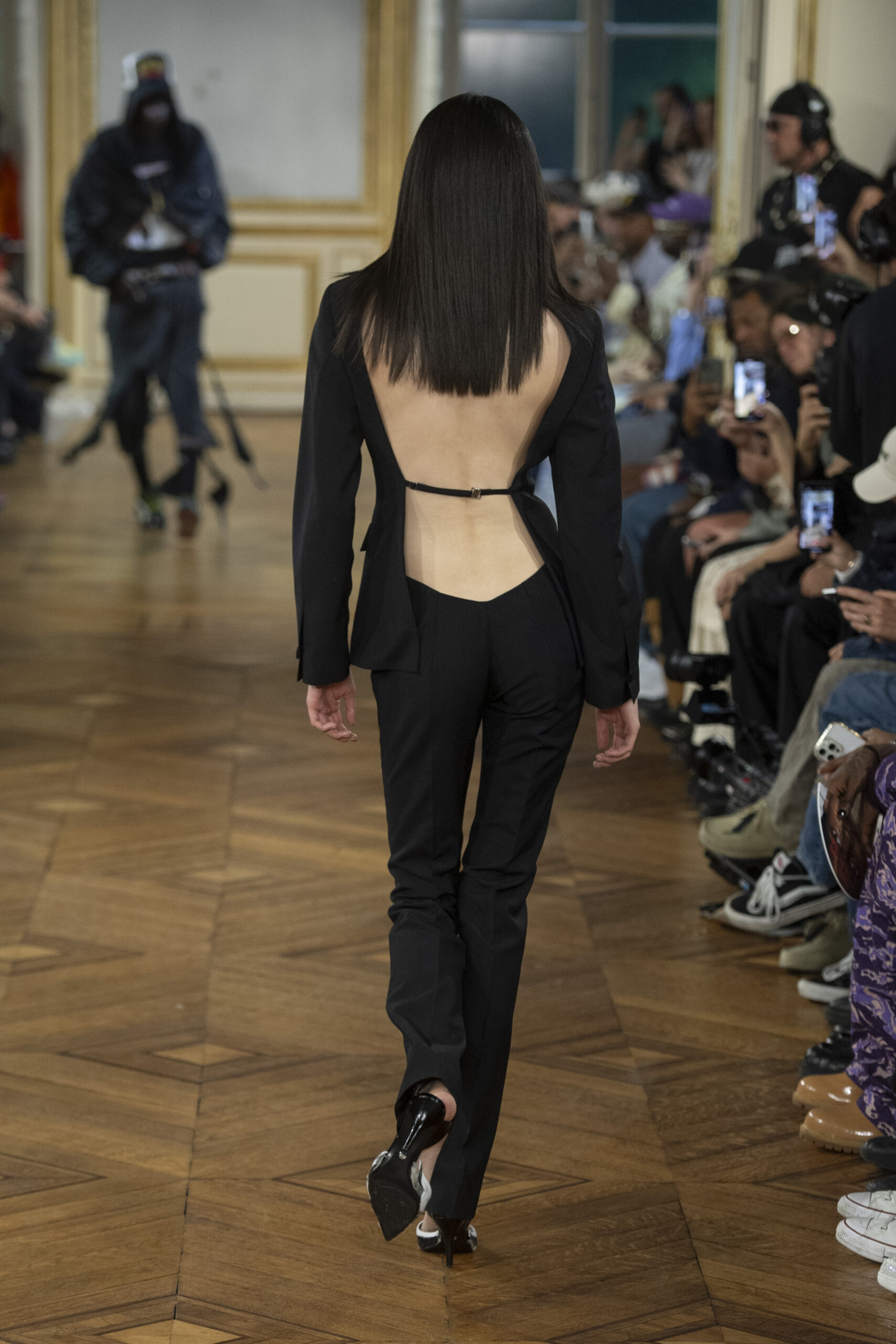 Le décor du défilé, comprenant des sacs poubelles transformés en chaises beanbag issues de la marque de mobilier Hommemade, en collaboration avec Crosby Studios, ajoutait une dimension immersive à cette expérience unique. Le défilé a été rythmé par la bande-son du prochain album d’A$AP Rocky, créant une synergie entre mode et musique.