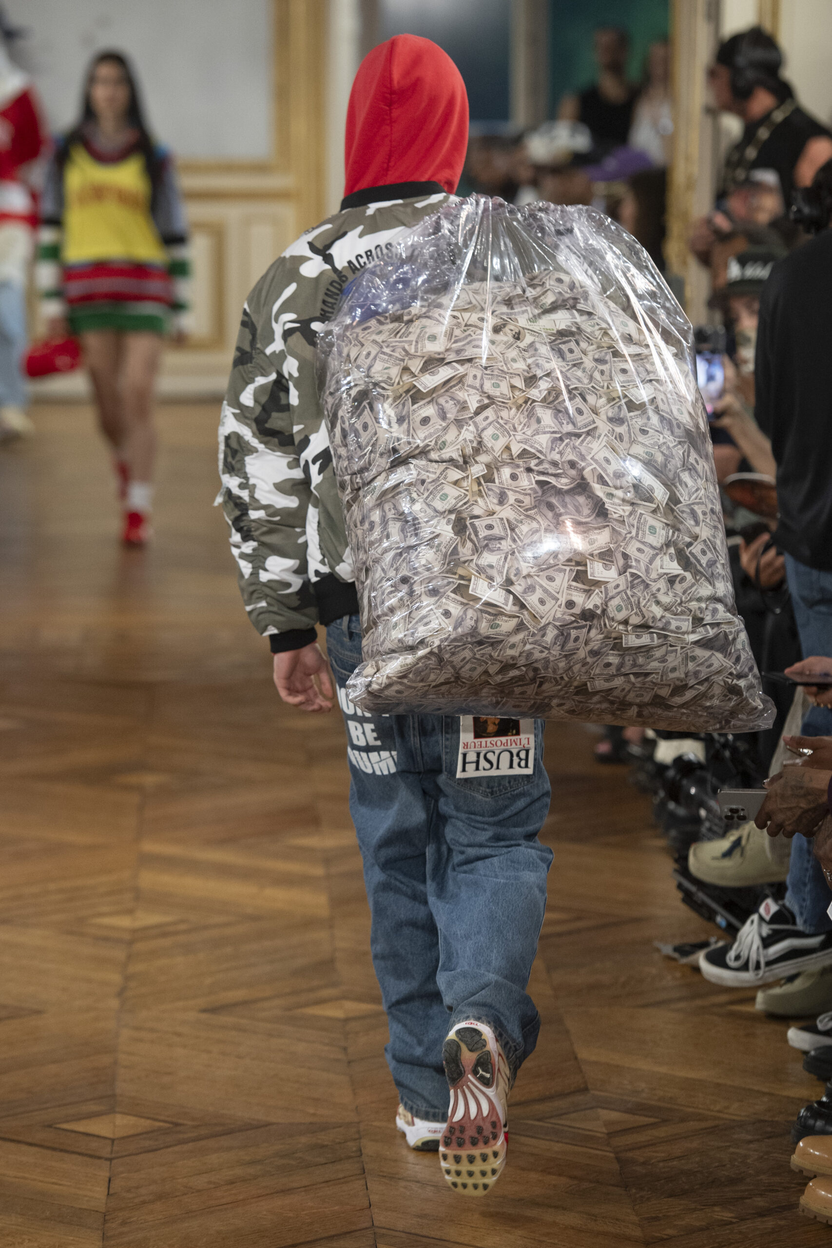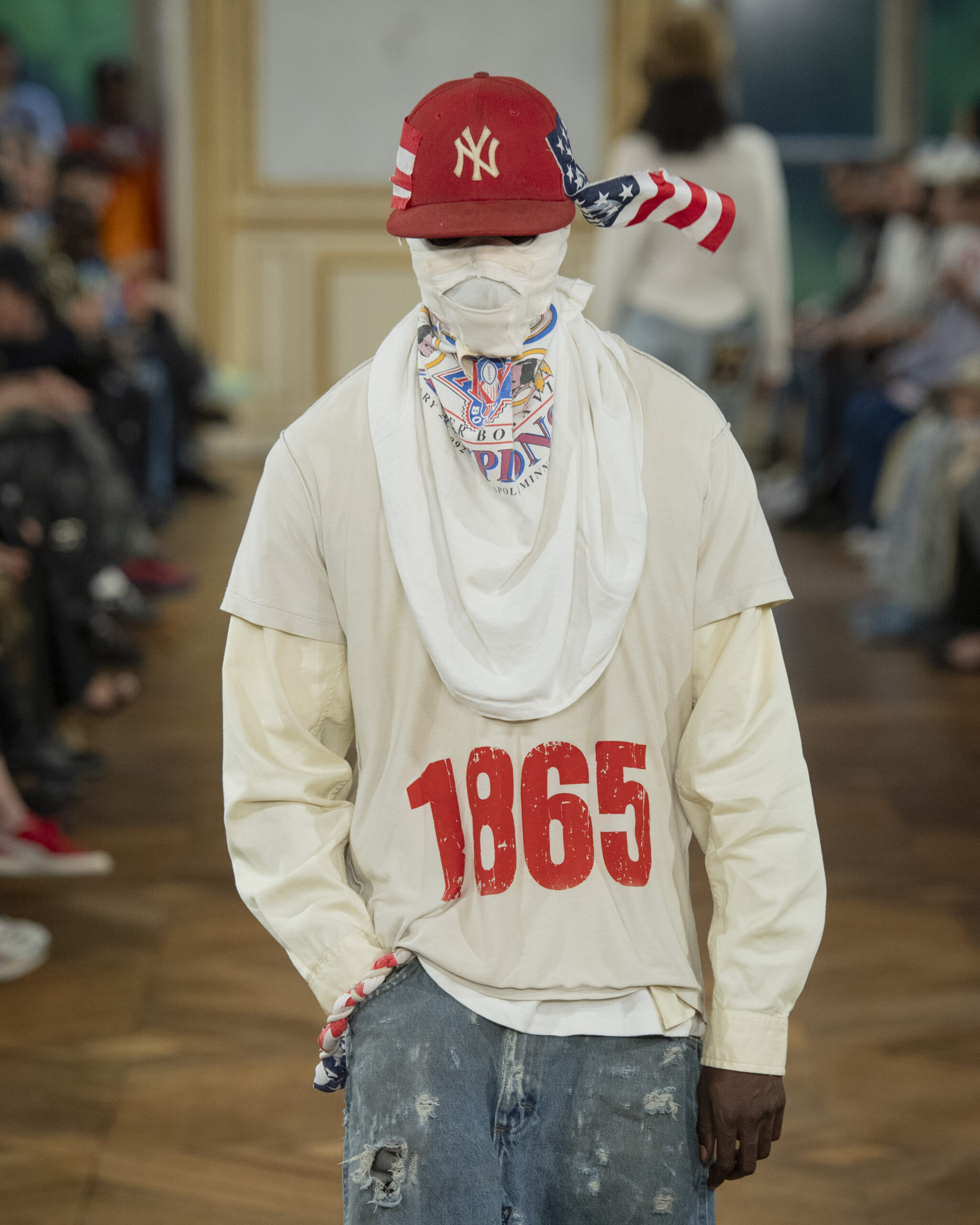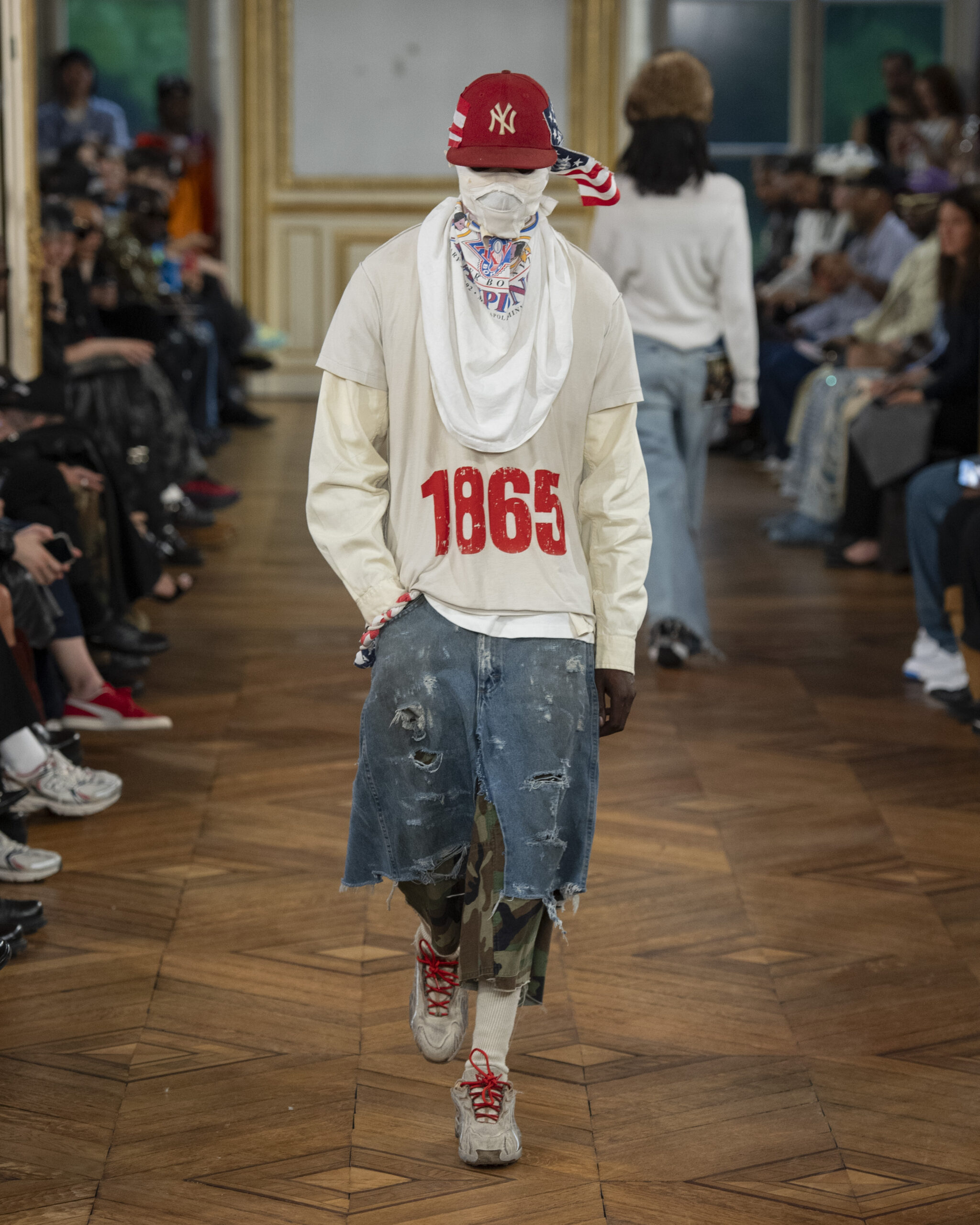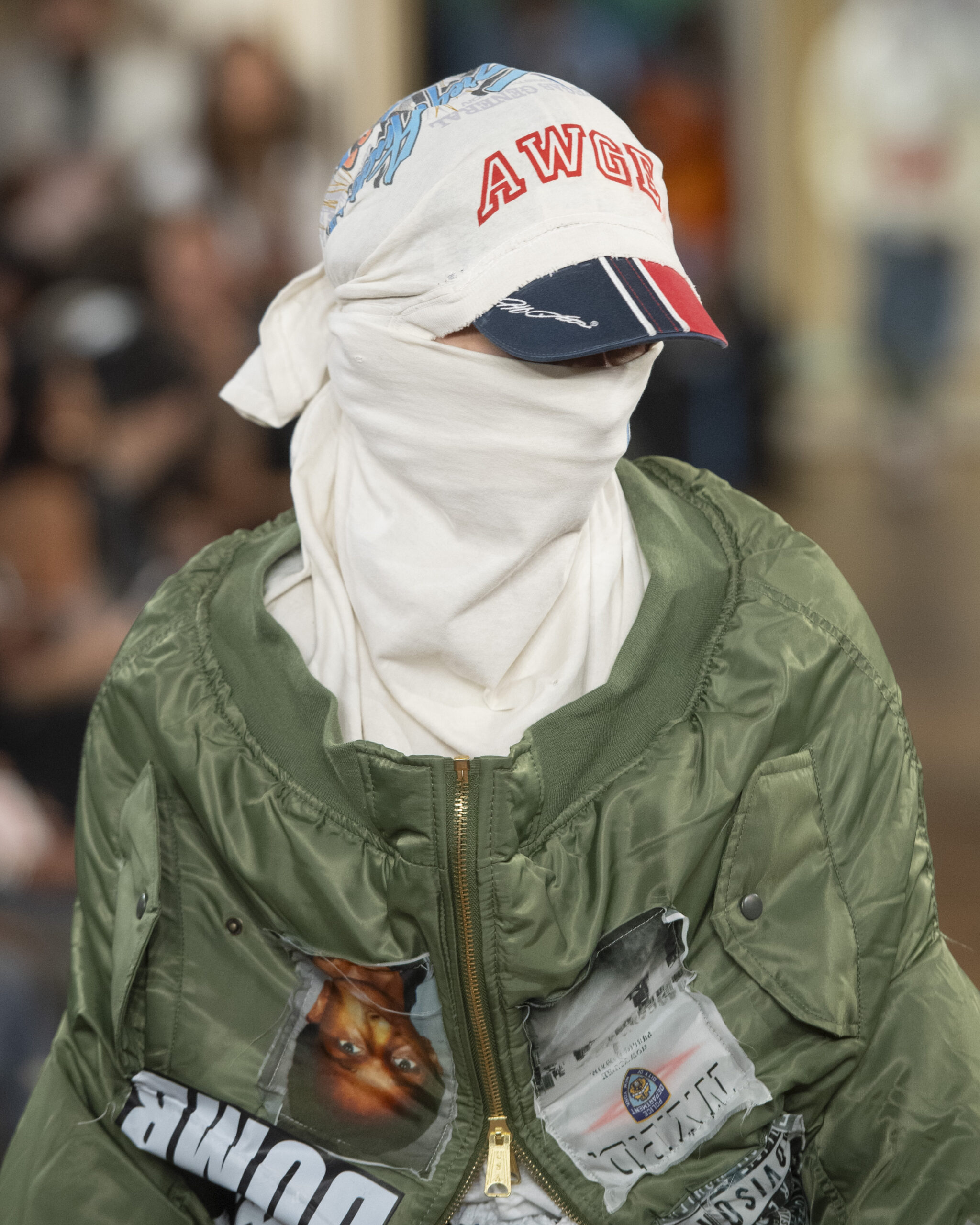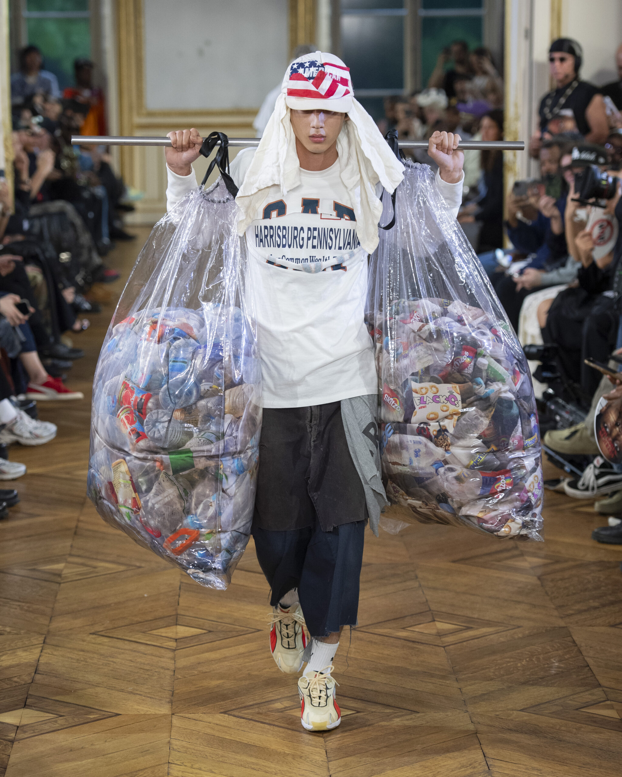 Le décor du défilé, comprenant des sacs poubelles transformés en chaises beanbag issues de la marque de mobilier Hommemade, en collaboration avec Crosby Studios, ajoutait une dimension immersive à cette expérience unique. Le défilé a été rythmé par la bande-son du prochain album d’A$AP Rocky, créant une synergie entre mode et musique.