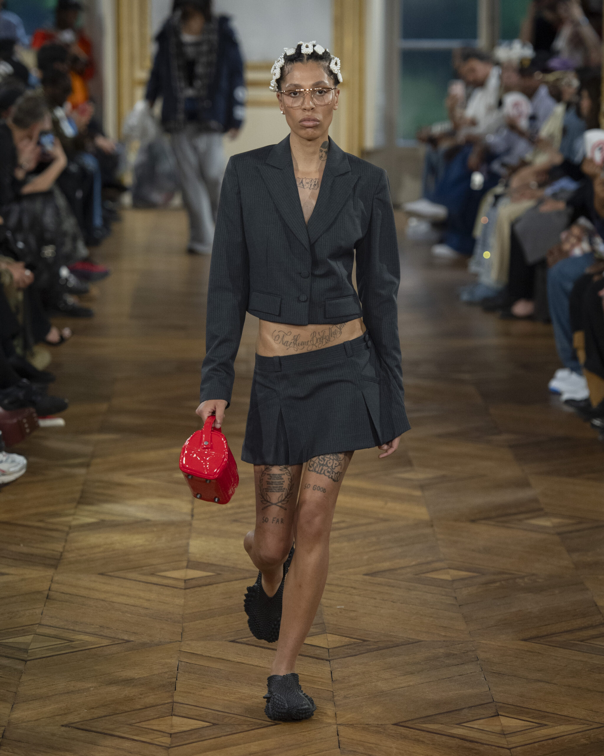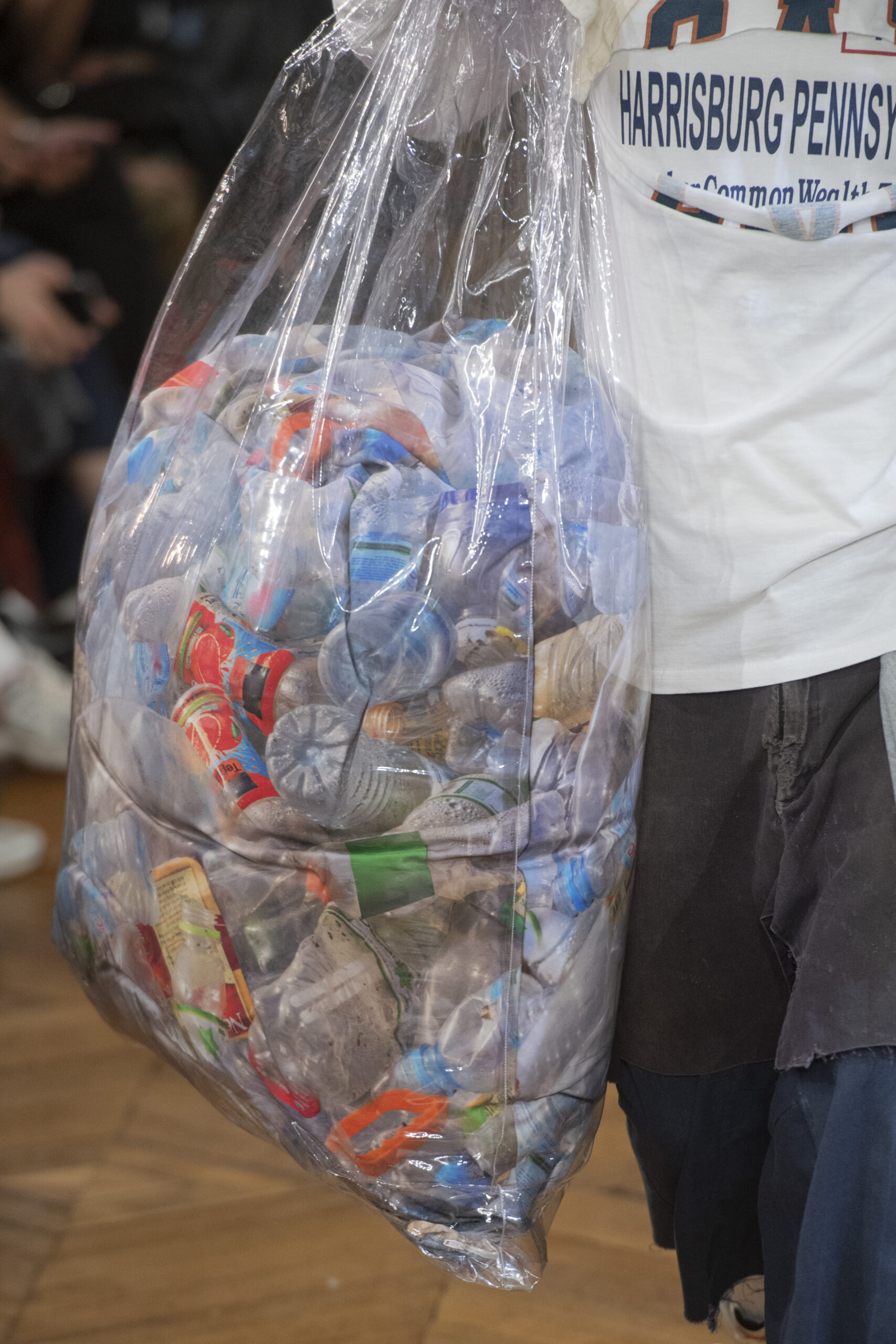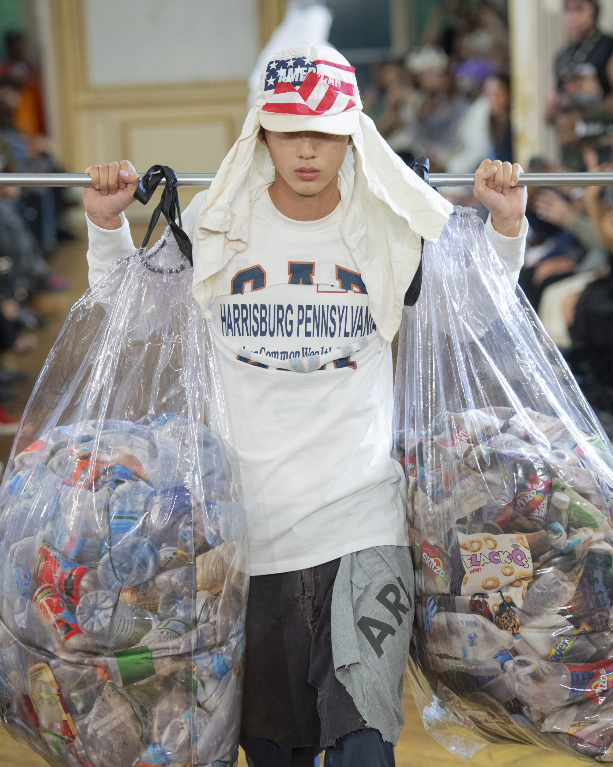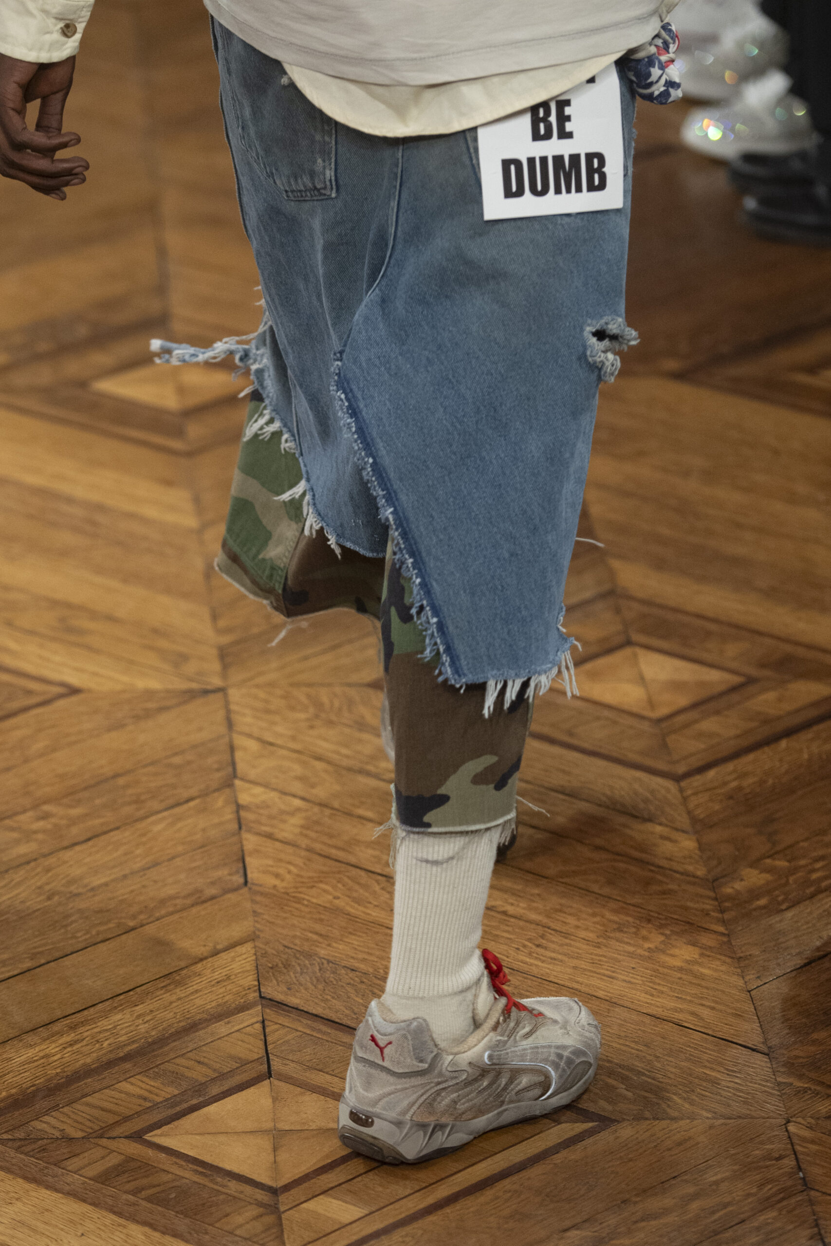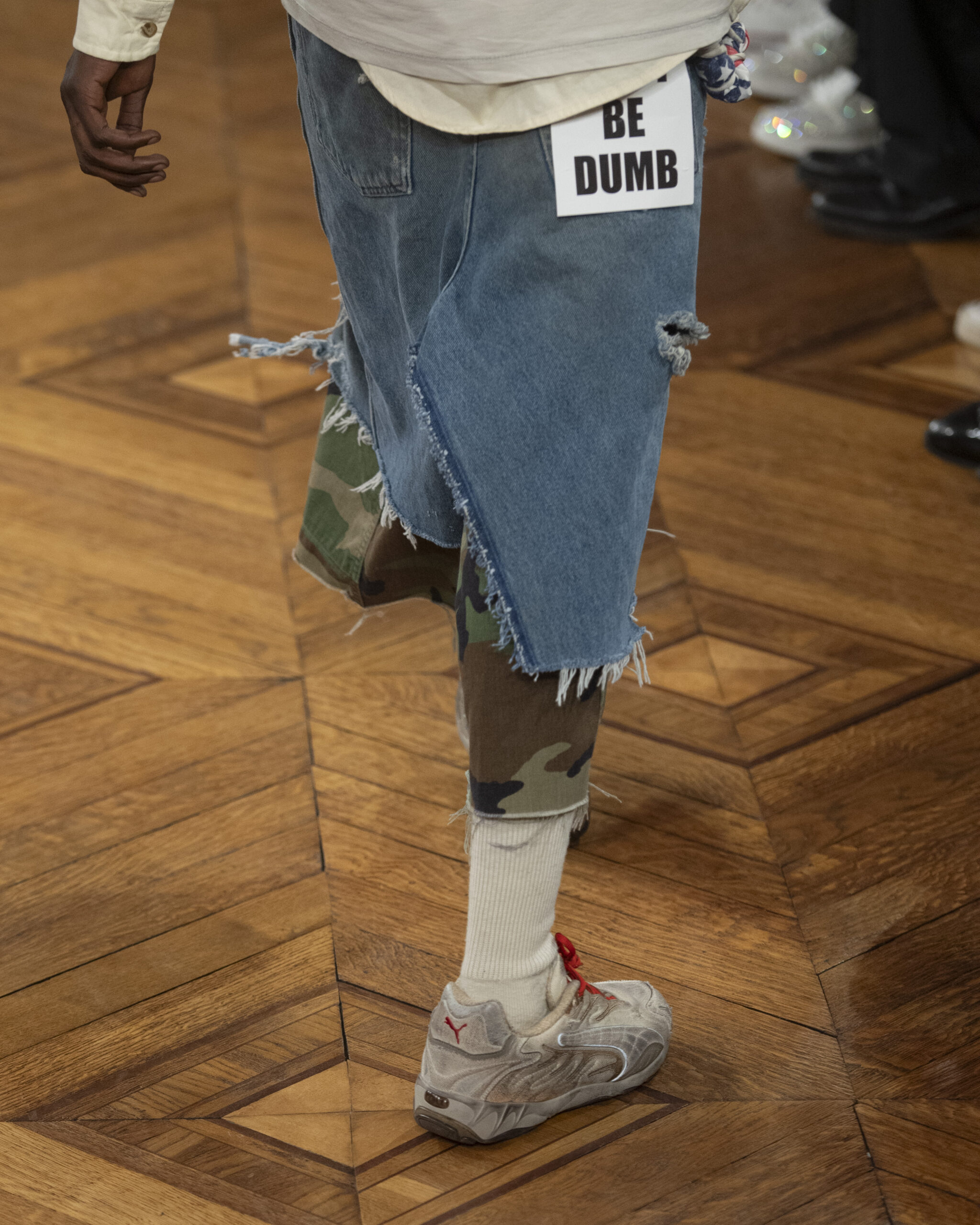 Le décor du défilé, comprenant des sacs poubelles transformés en chaises beanbag issues de la marque de mobilier Hommemade, en collaboration avec Crosby Studios, ajoutait une dimension immersive à cette expérience unique. Le défilé a été rythmé par la bande-son du prochain album d’A$AP Rocky, créant une synergie entre mode et musique.