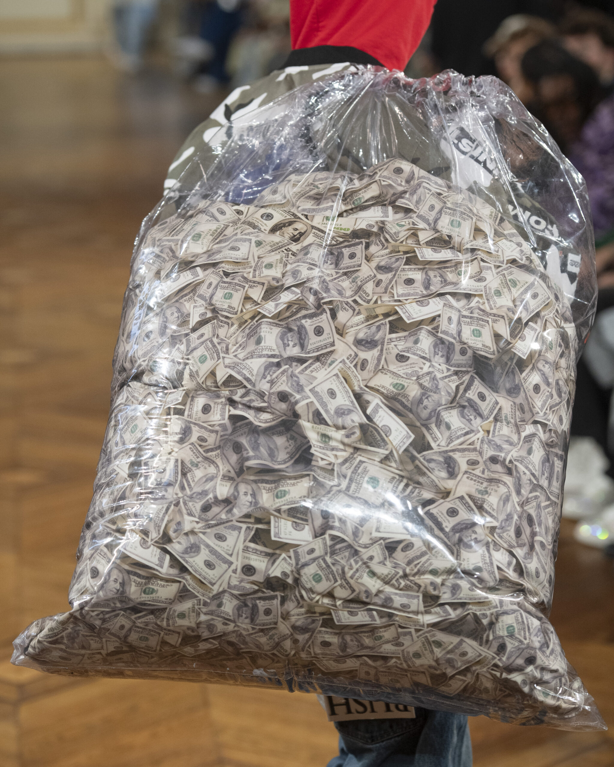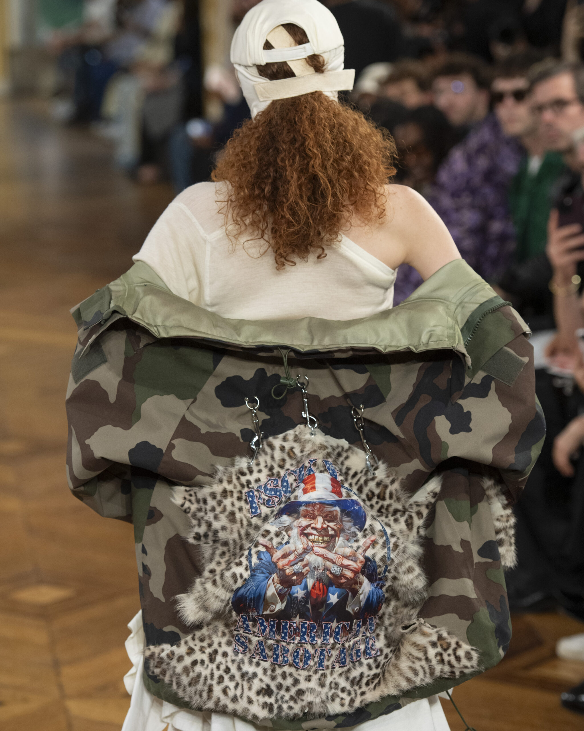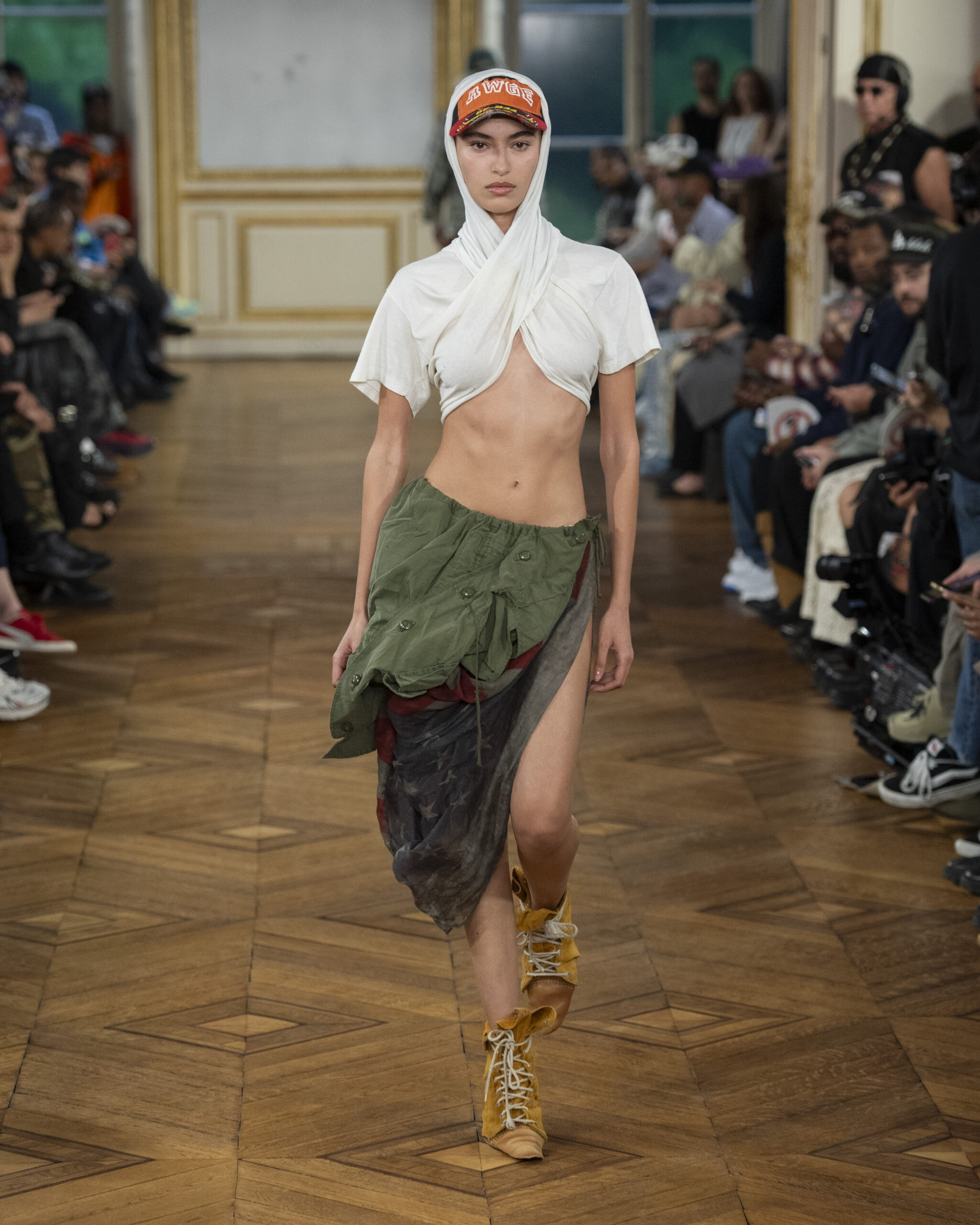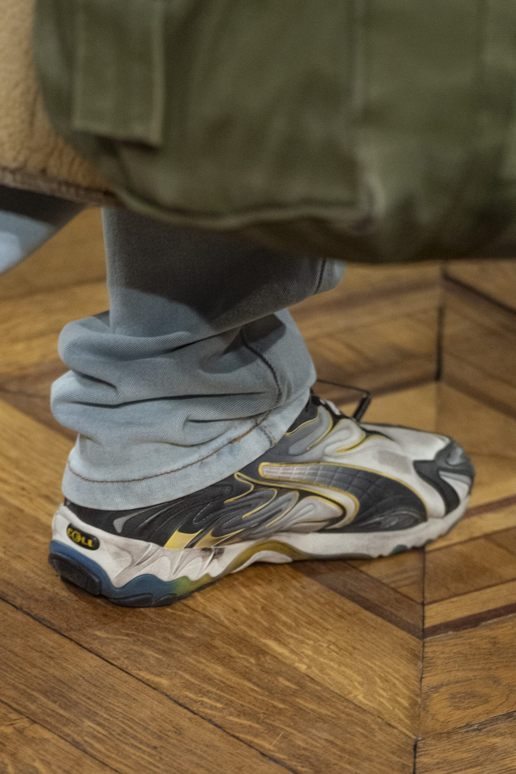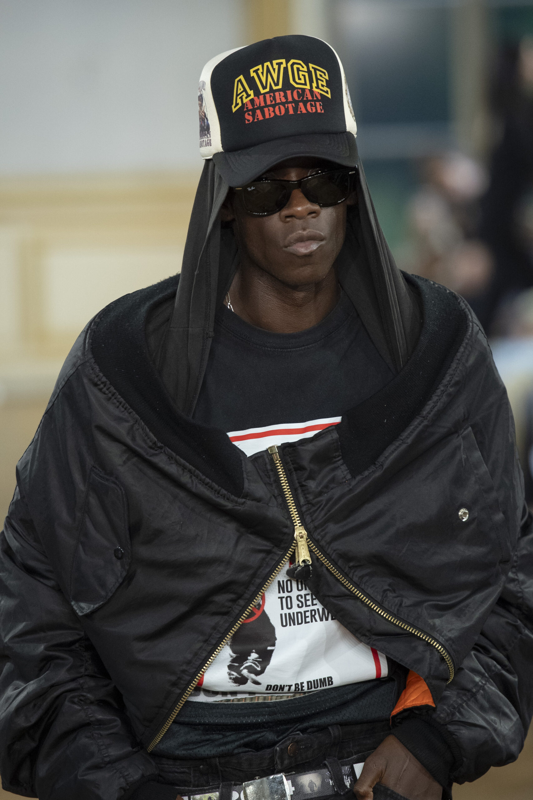 Le décor du défilé, comprenant des sacs poubelles transformés en chaises beanbag issues de la marque de mobilier Hommemade, en collaboration avec Crosby Studios, ajoutait une dimension immersive à cette expérience unique. Le défilé a été rythmé par la bande-son du prochain album d’A$AP Rocky, créant une synergie entre mode et musique.