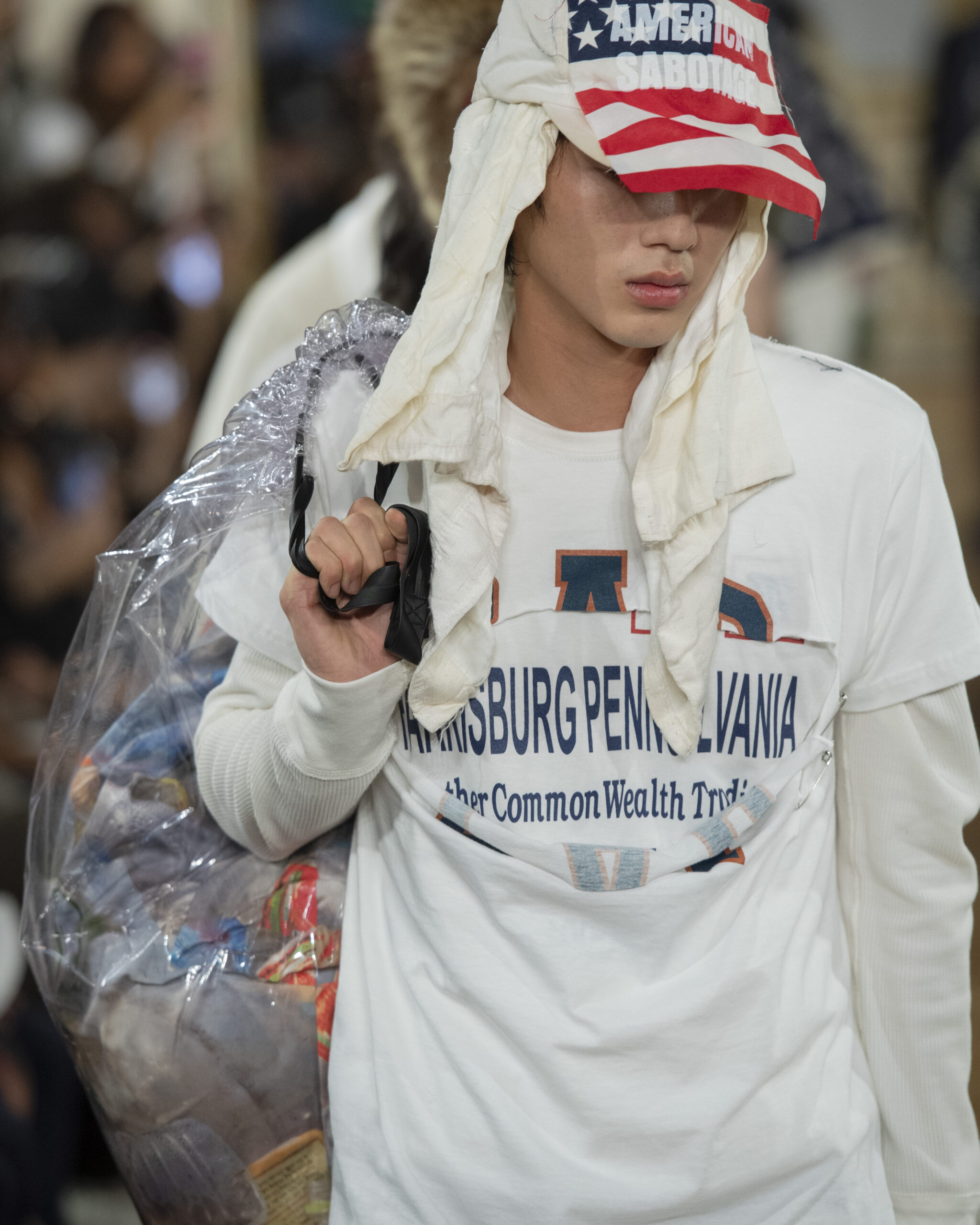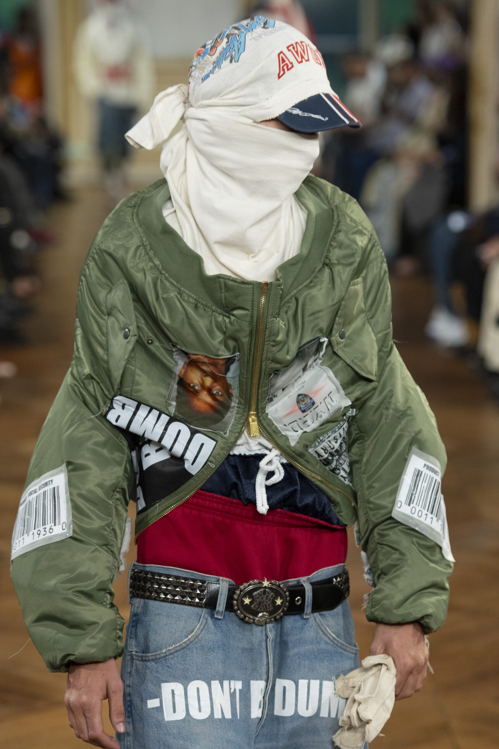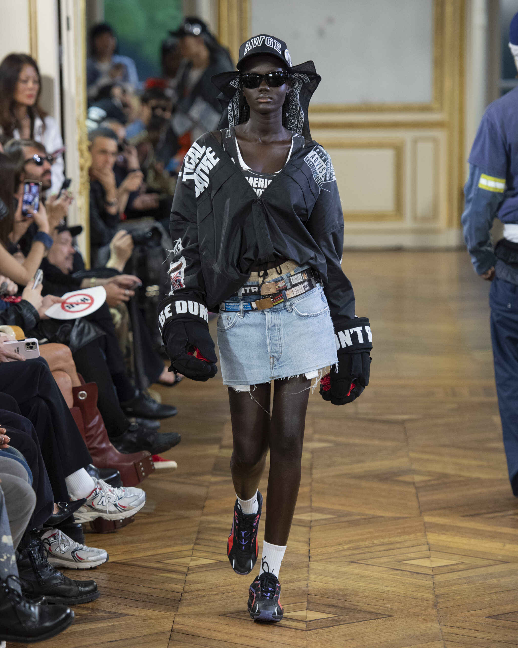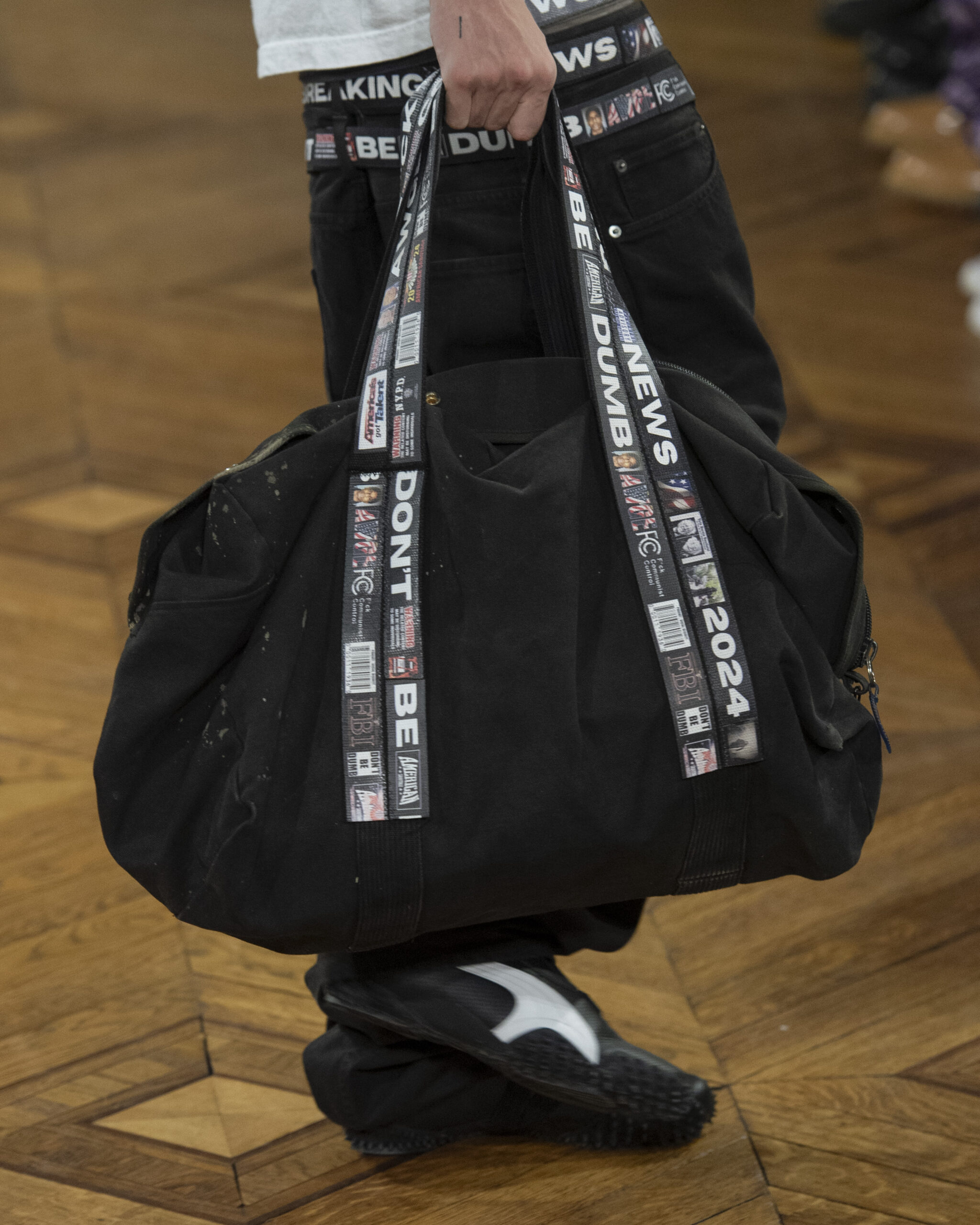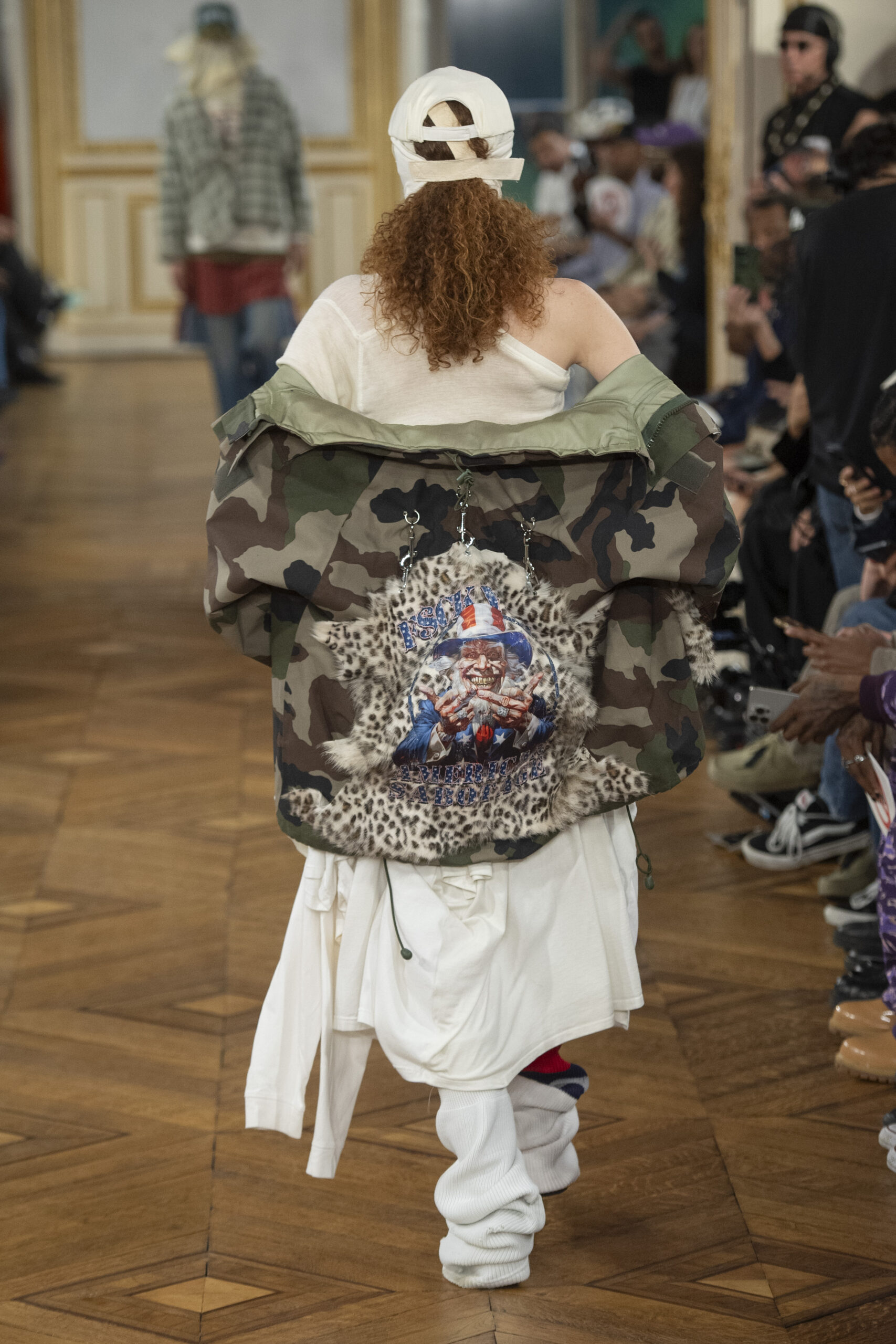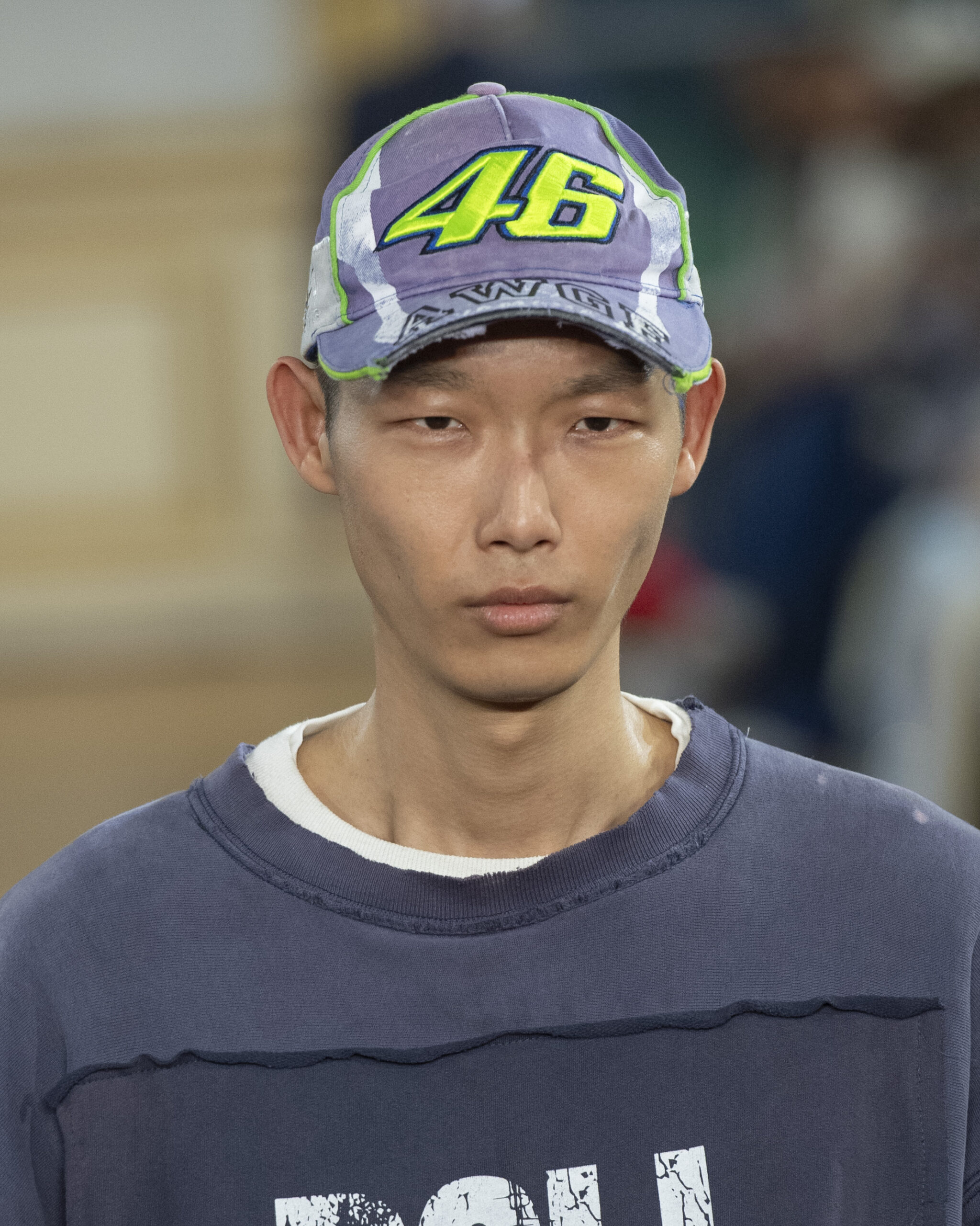 Le décor du défilé, comprenant des sacs poubelles transformés en chaises beanbag issues de la marque de mobilier Hommemade, en collaboration avec Crosby Studios, ajoutait une dimension immersive à cette expérience unique. Le défilé a été rythmé par la bande-son du prochain album d’A$AP Rocky, créant une synergie entre mode et musique.