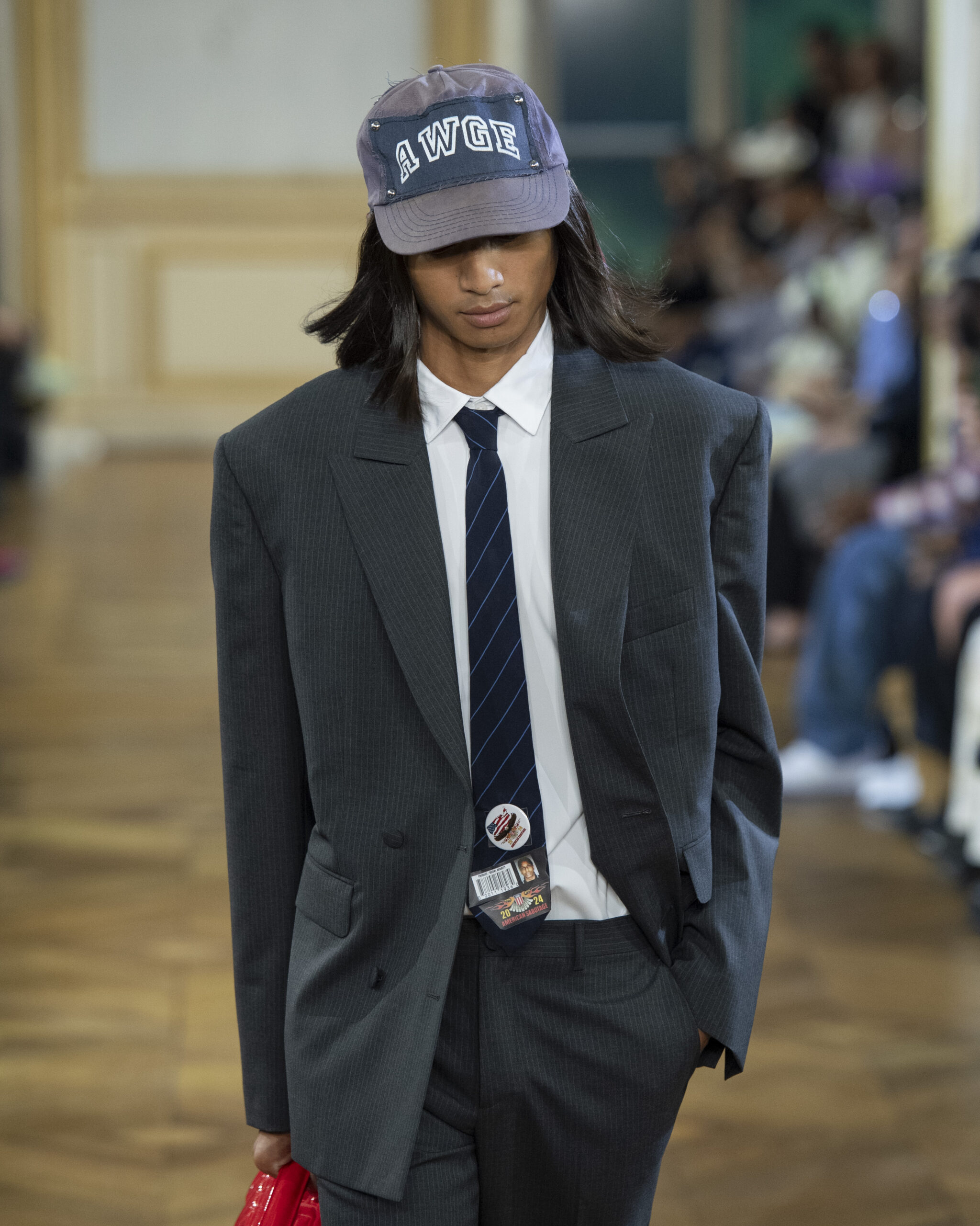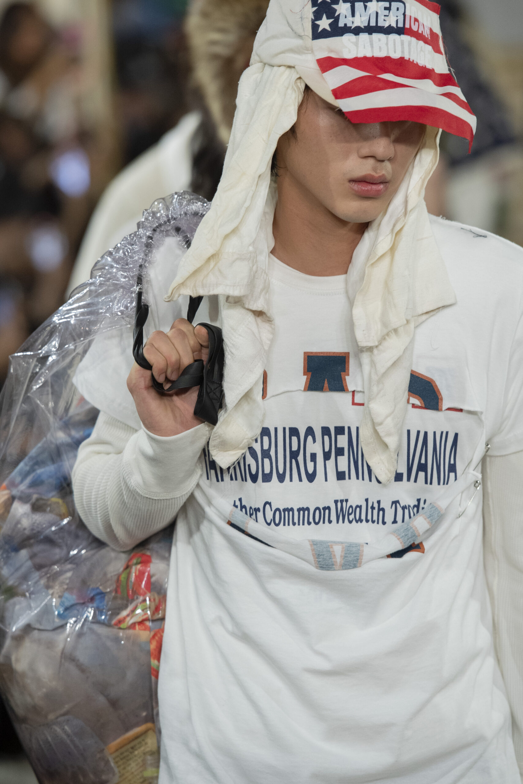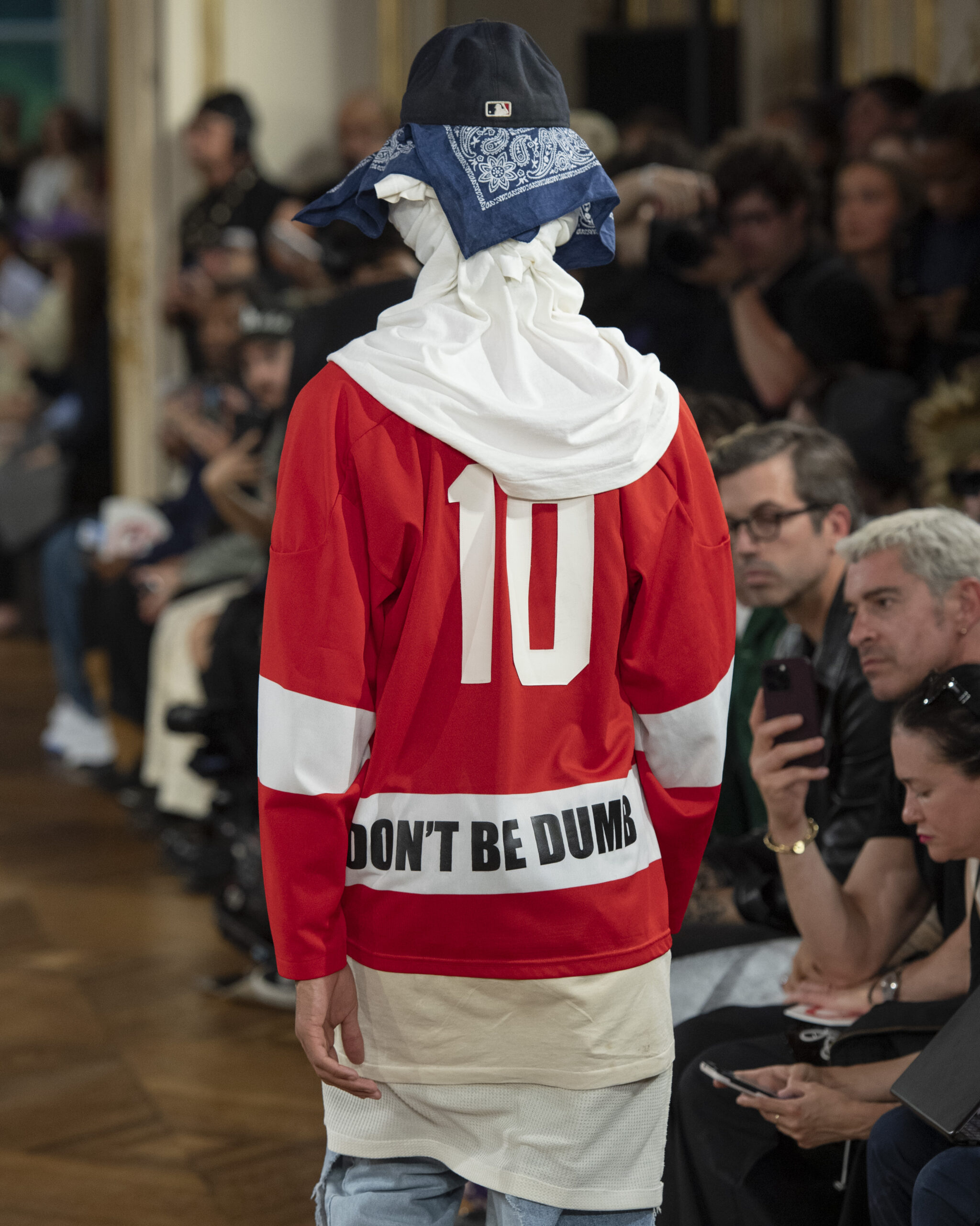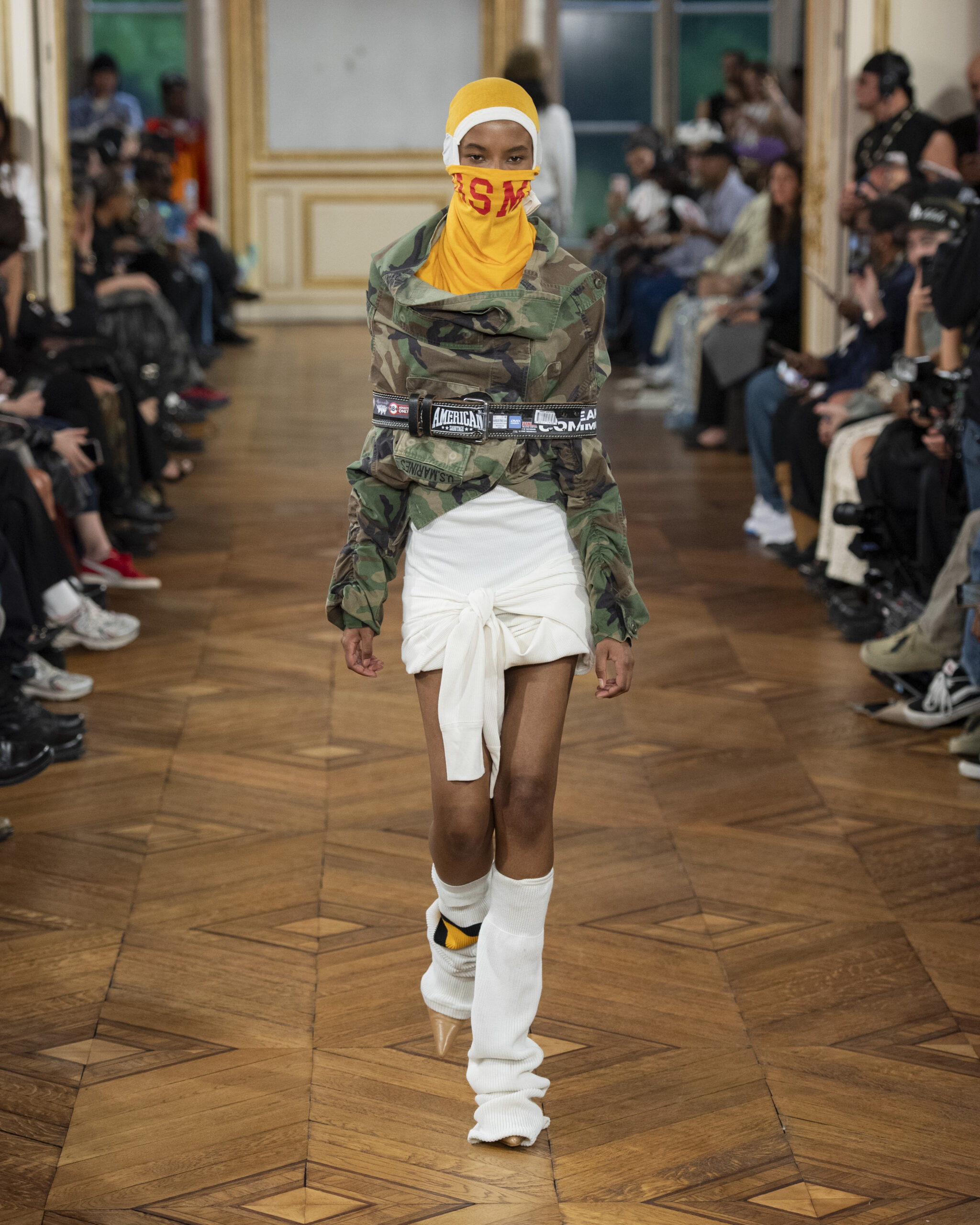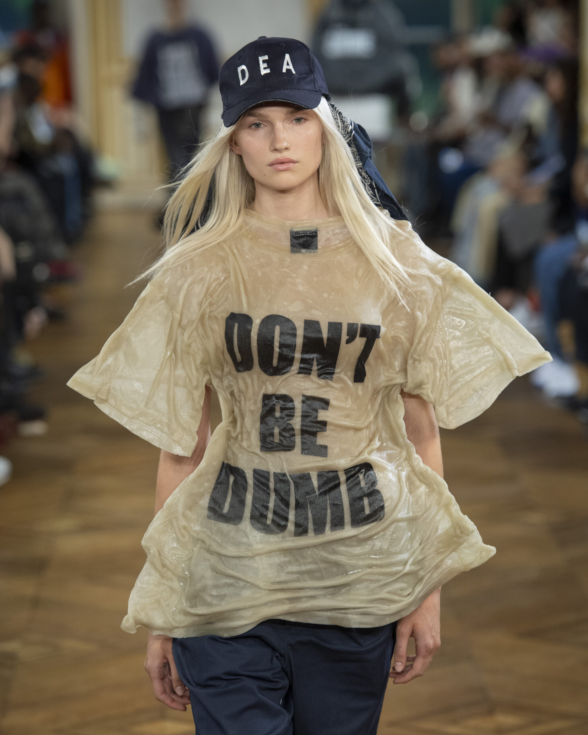 Le décor du défilé, comprenant des sacs poubelles transformés en chaises beanbag issues de la marque de mobilier Hommemade, en collaboration avec Crosby Studios, ajoutait une dimension immersive à cette expérience unique. Le défilé a été rythmé par la bande-son du prochain album d’A$AP Rocky, créant une synergie entre mode et musique.