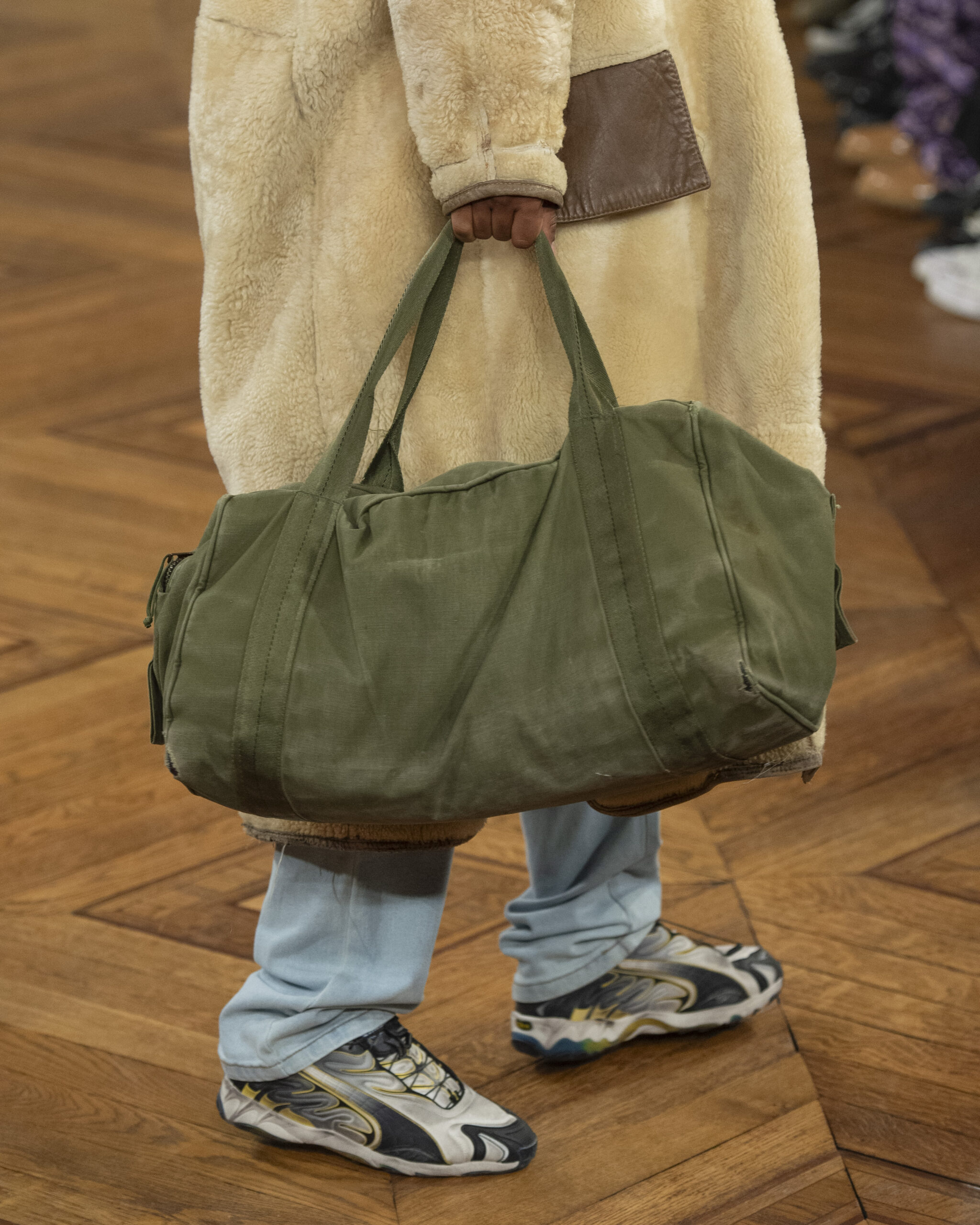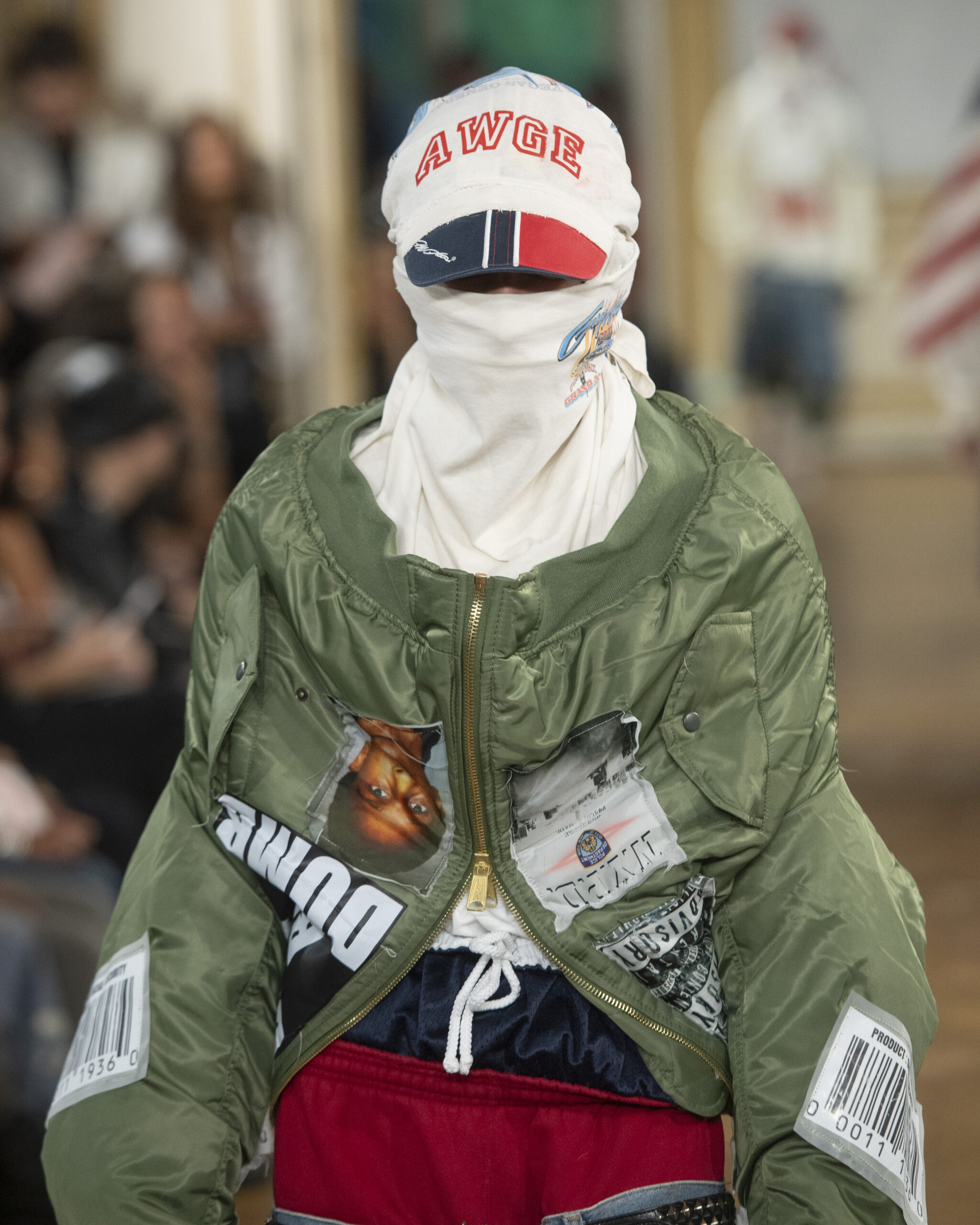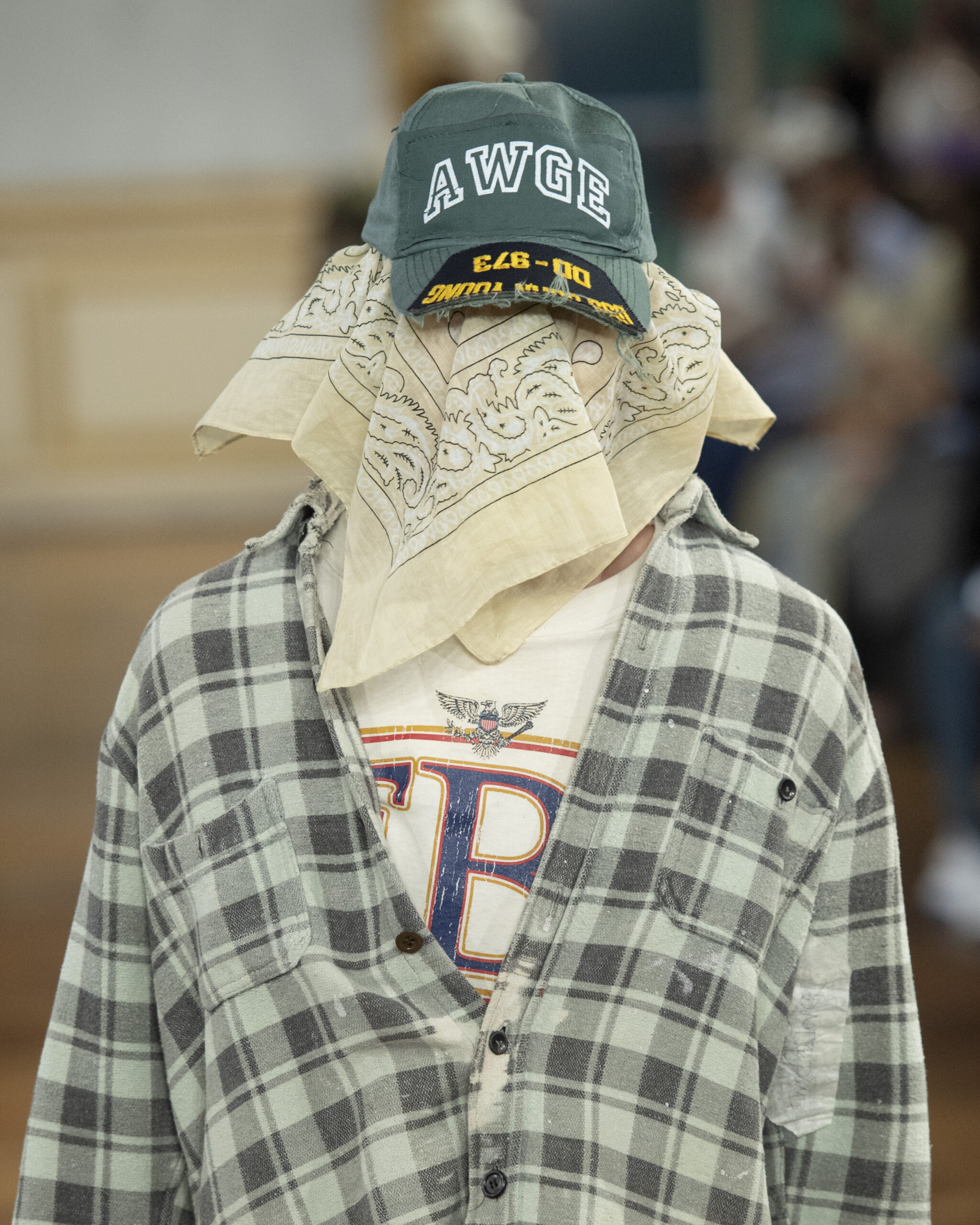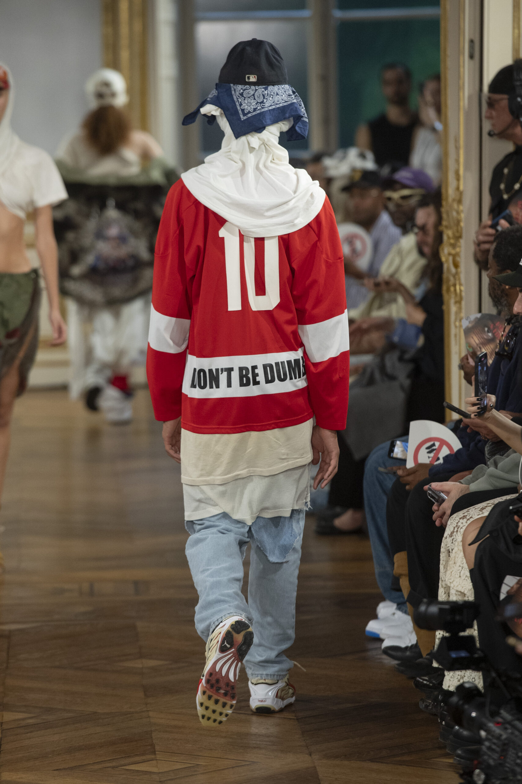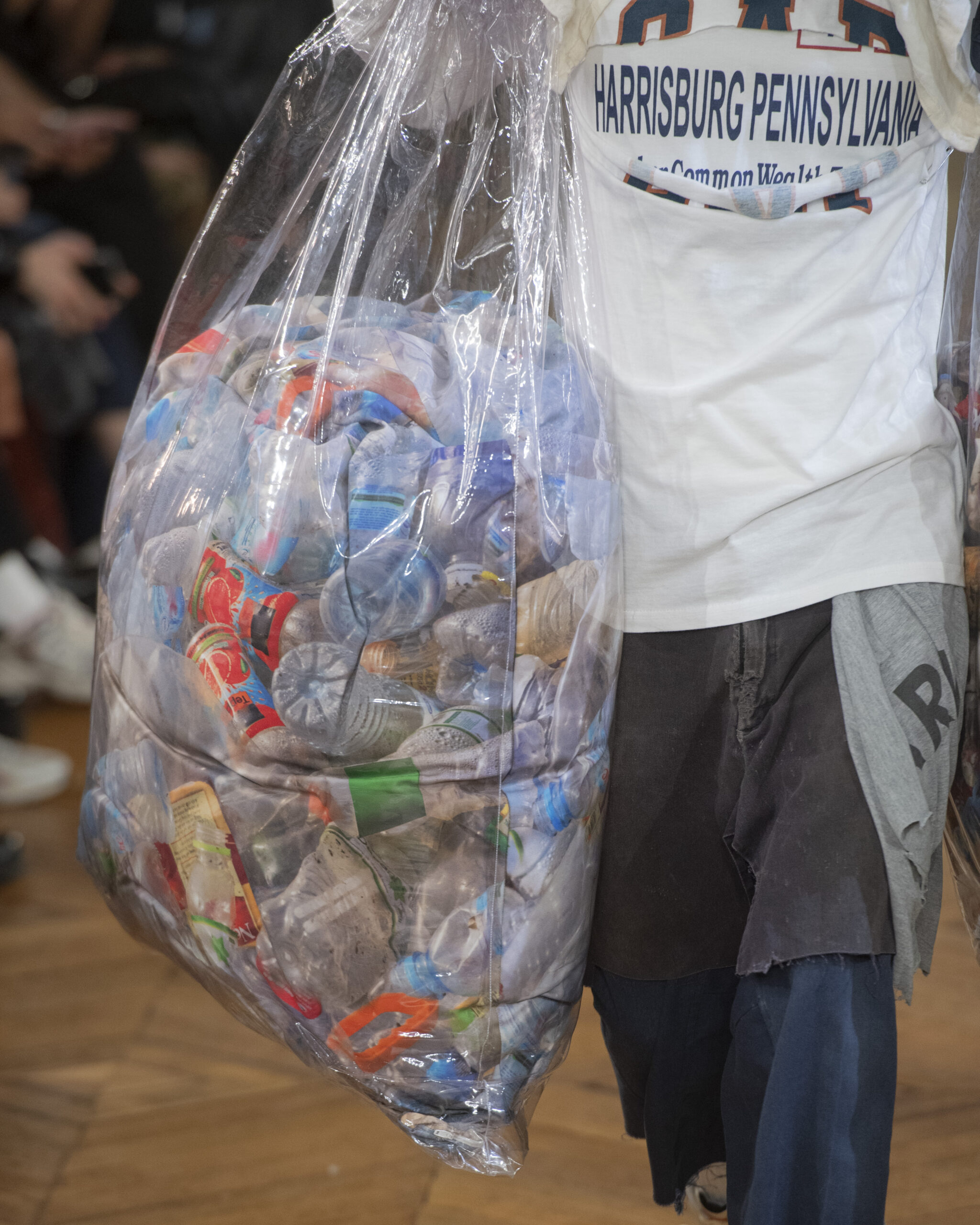 Le décor du défilé, comprenant des sacs poubelles transformés en chaises beanbag issues de la marque de mobilier Hommemade, en collaboration avec Crosby Studios, ajoutait une dimension immersive à cette expérience unique. Le défilé a été rythmé par la bande-son du prochain album d’A$AP Rocky, créant une synergie entre mode et musique.