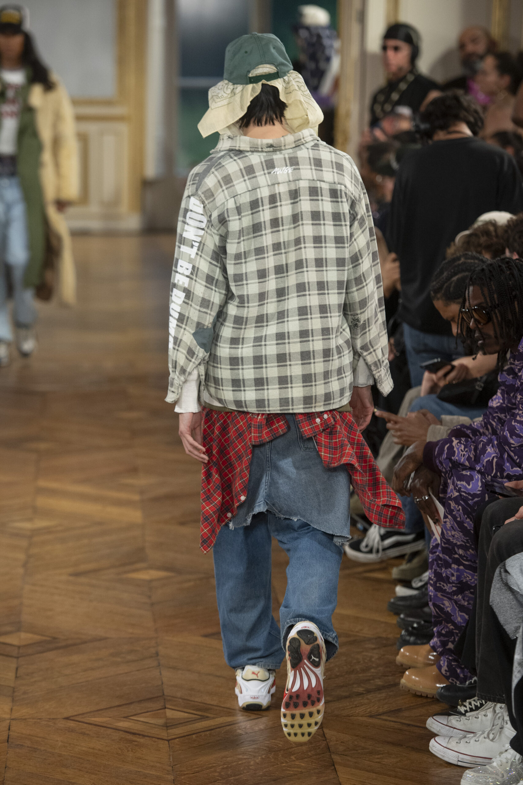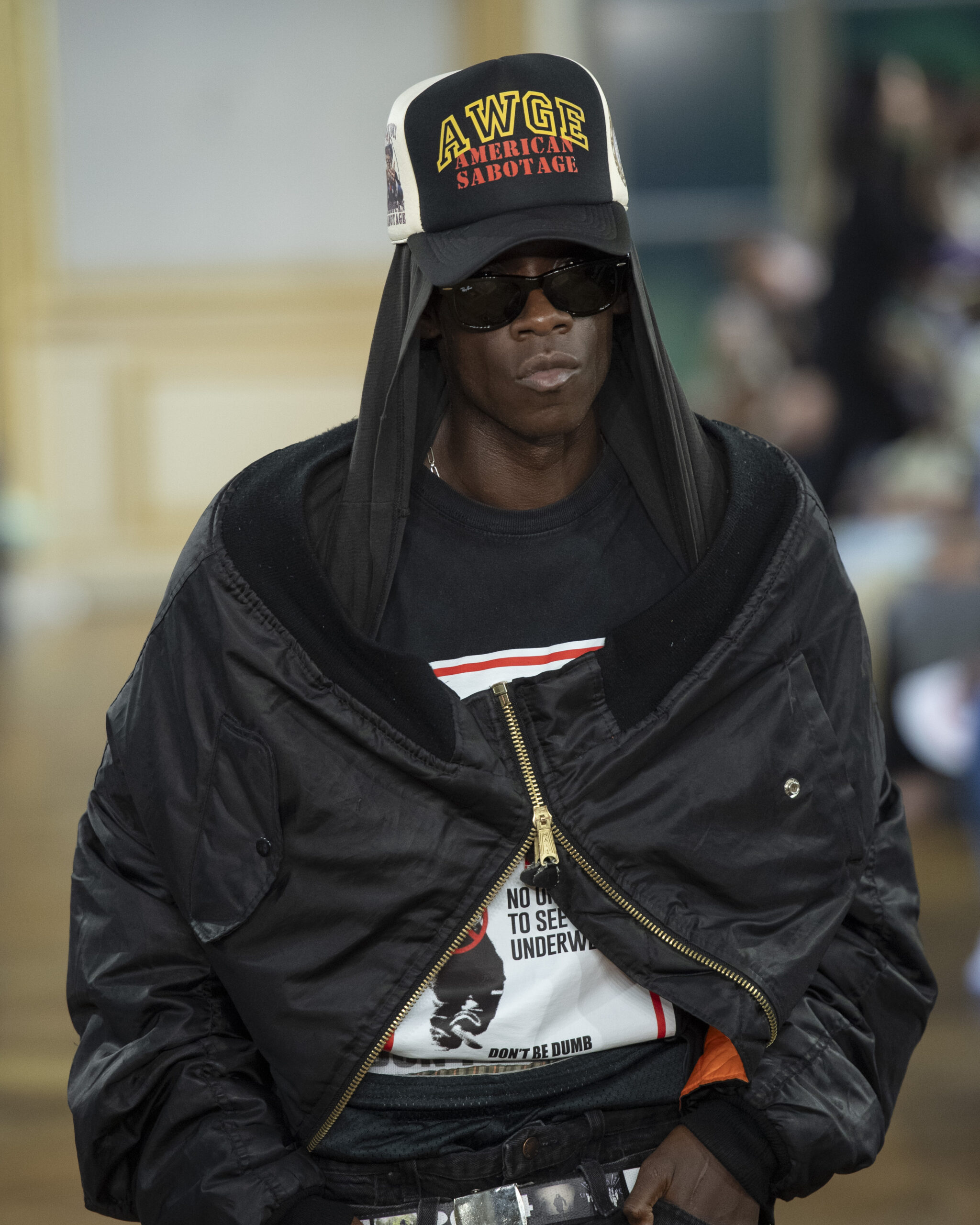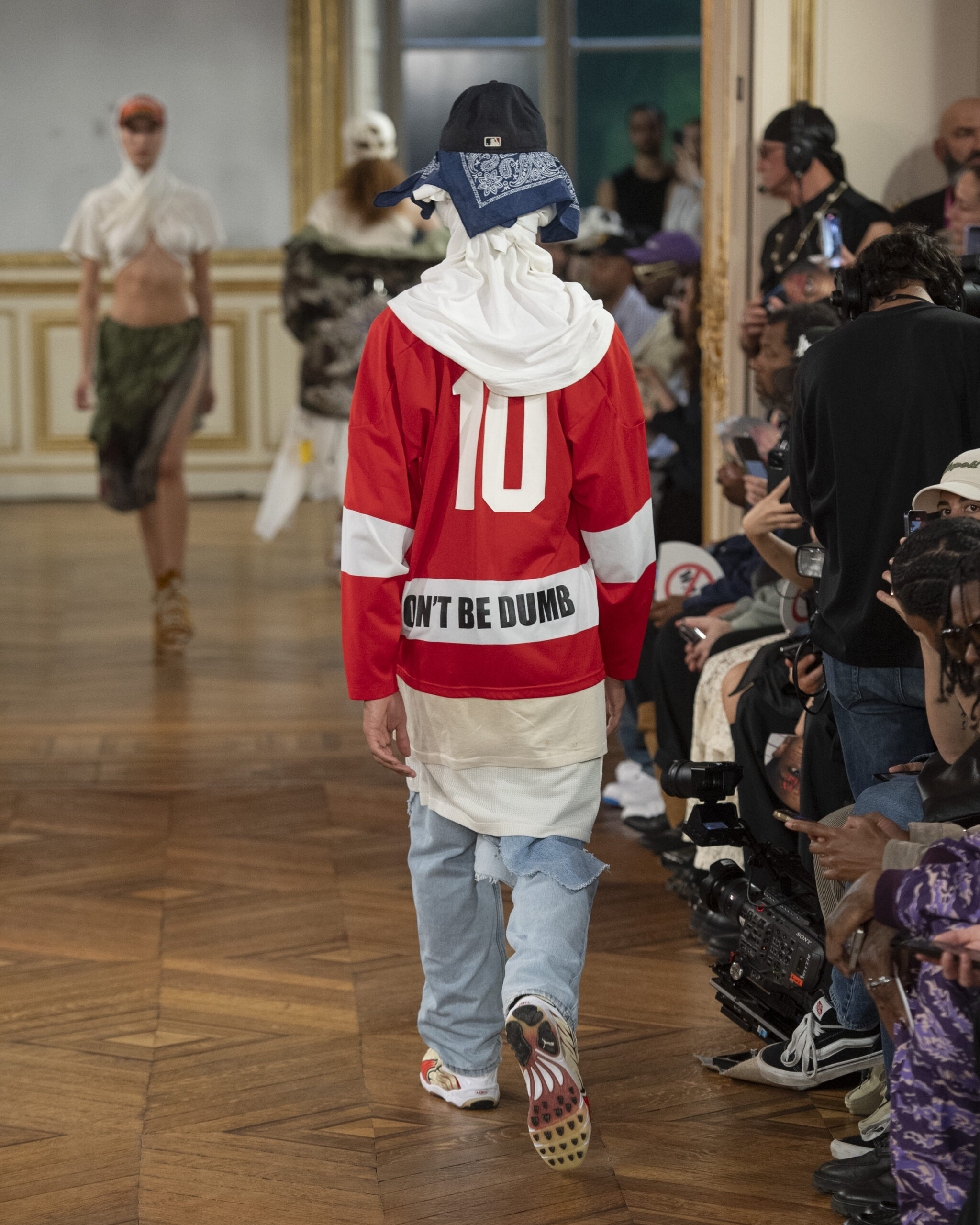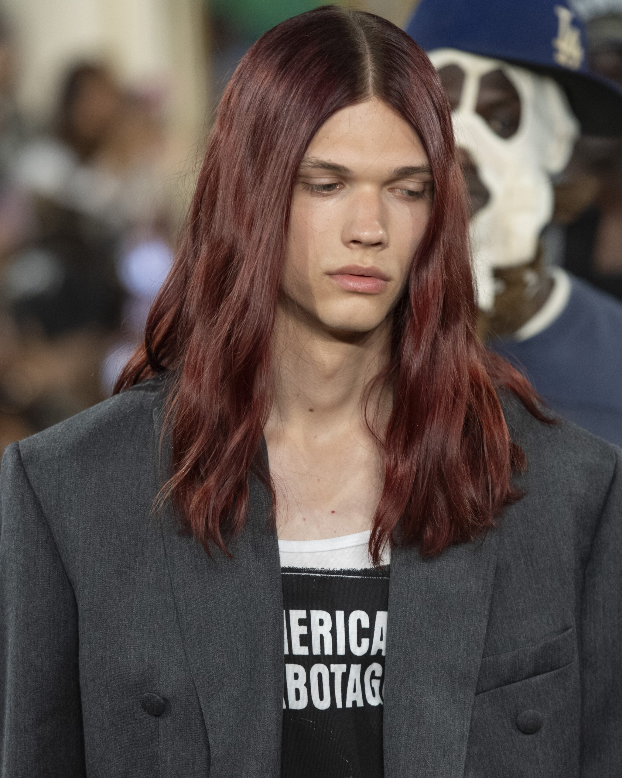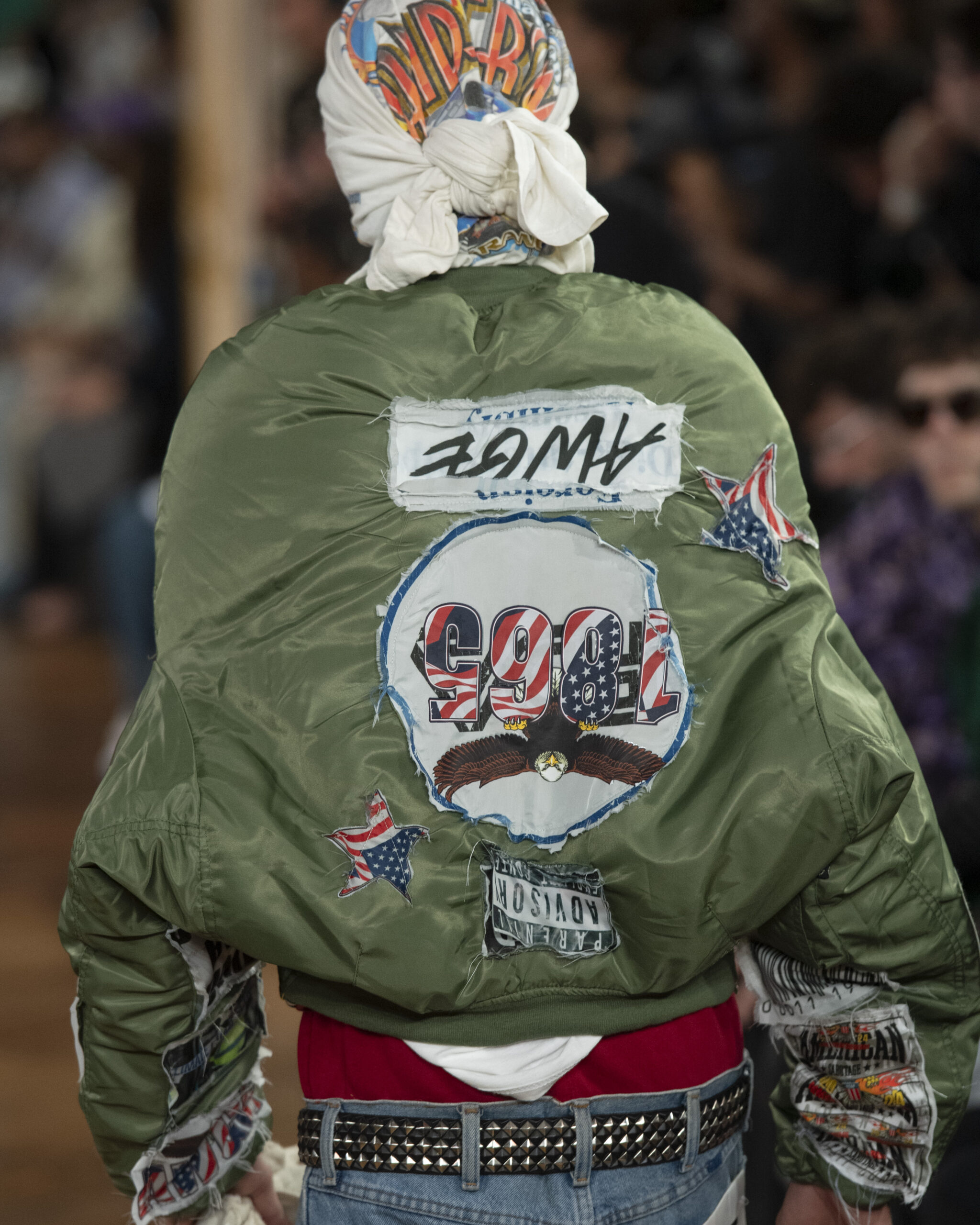 Le décor du défilé, comprenant des sacs poubelles transformés en chaises beanbag issues de la marque de mobilier Hommemade, en collaboration avec Crosby Studios, ajoutait une dimension immersive à cette expérience unique. Le défilé a été rythmé par la bande-son du prochain album d’A$AP Rocky, créant une synergie entre mode et musique.
