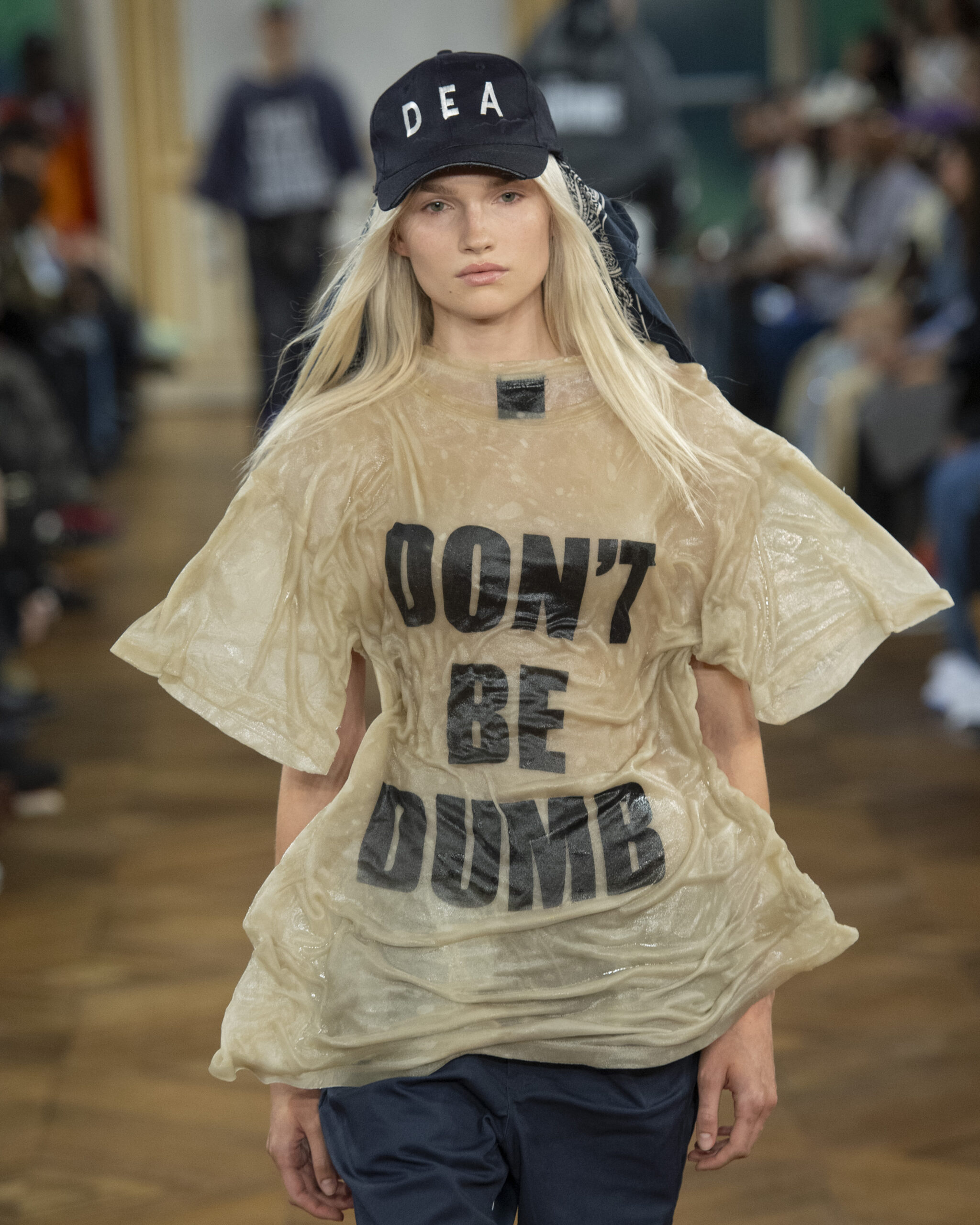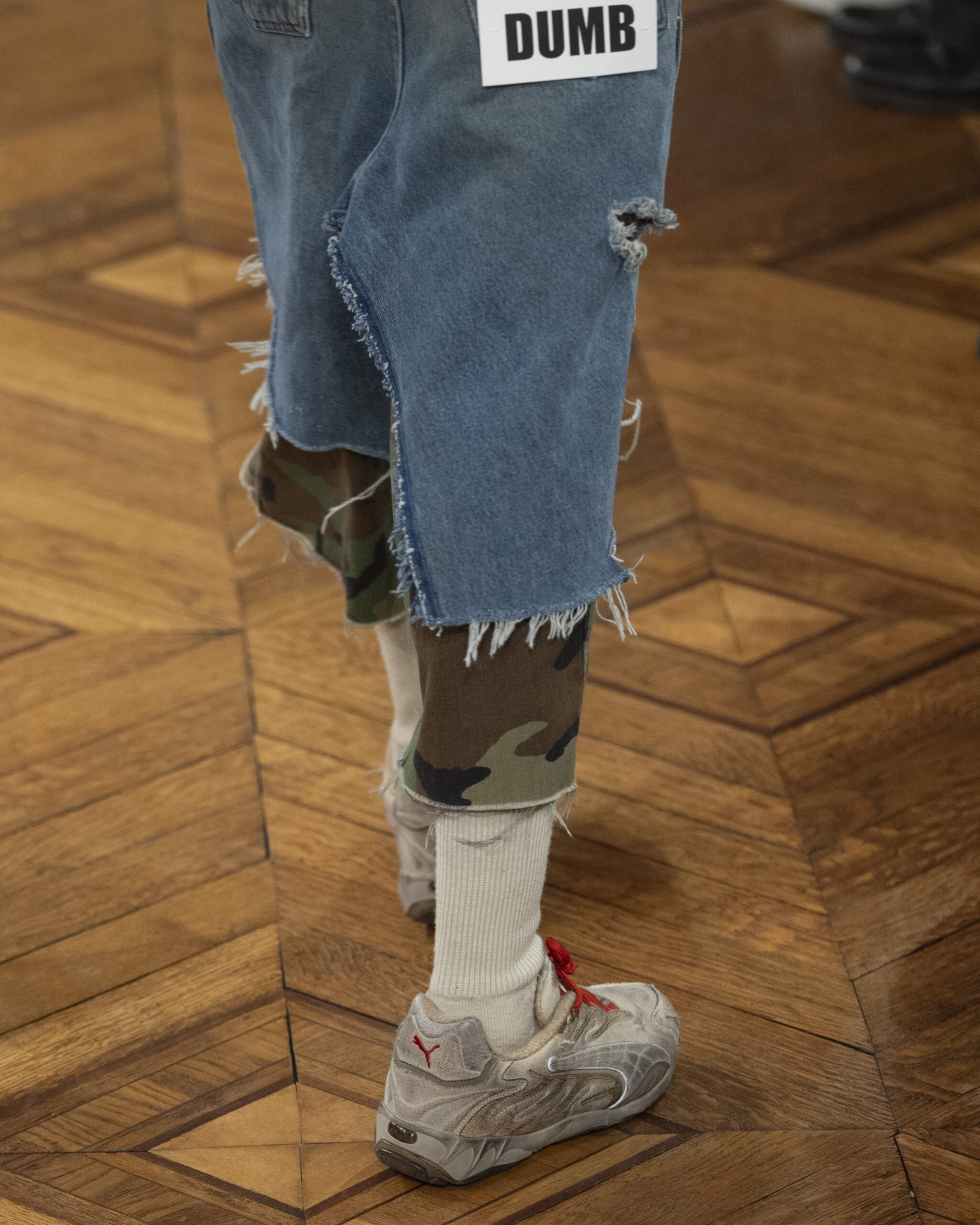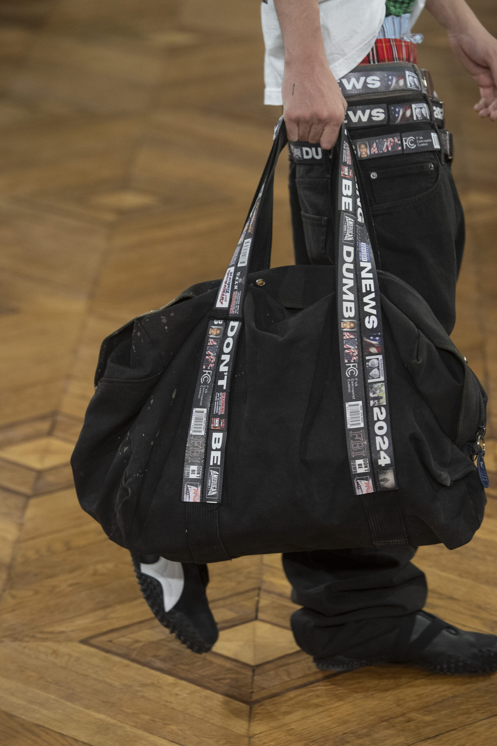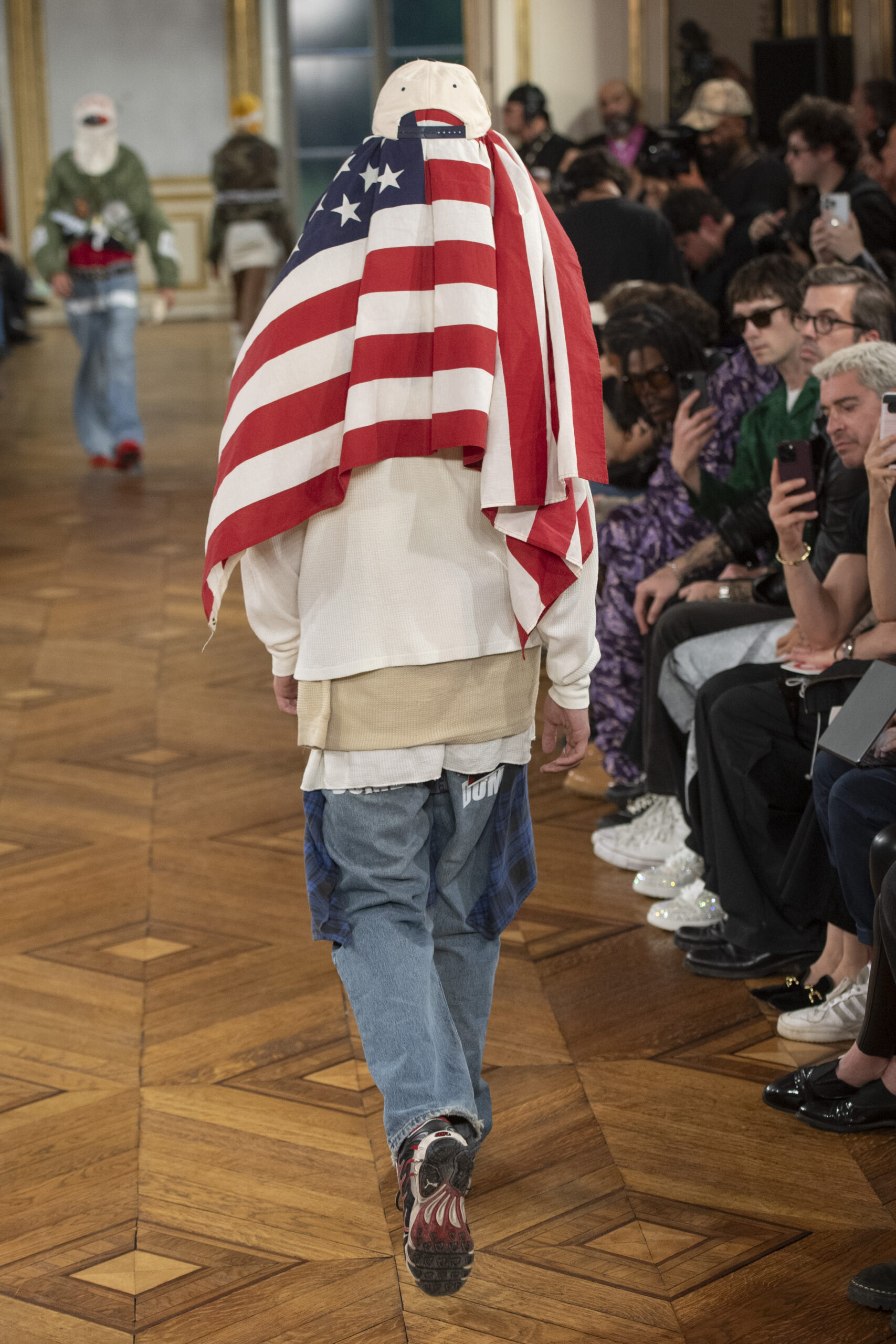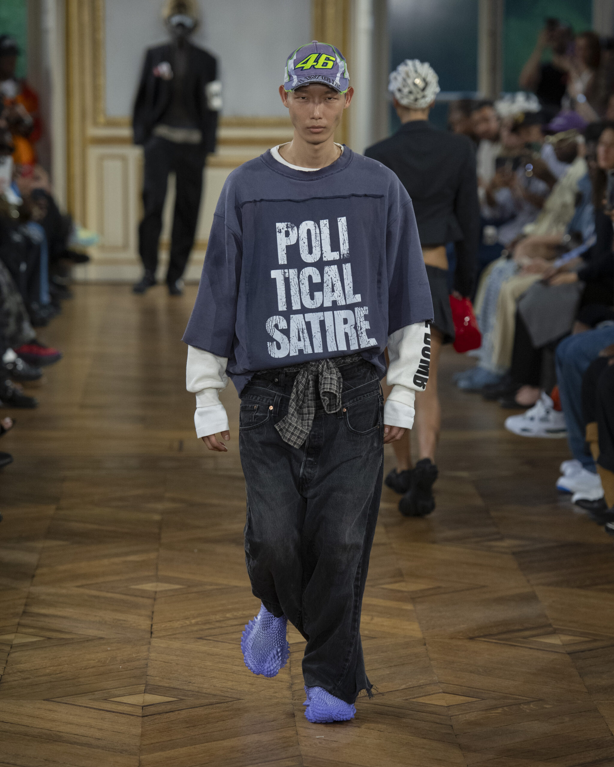 Le décor du défilé, comprenant des sacs poubelles transformés en chaises beanbag issues de la marque de mobilier Hommemade, en collaboration avec Crosby Studios, ajoutait une dimension immersive à cette expérience unique. Le défilé a été rythmé par la bande-son du prochain album d’A$AP Rocky, créant une synergie entre mode et musique.