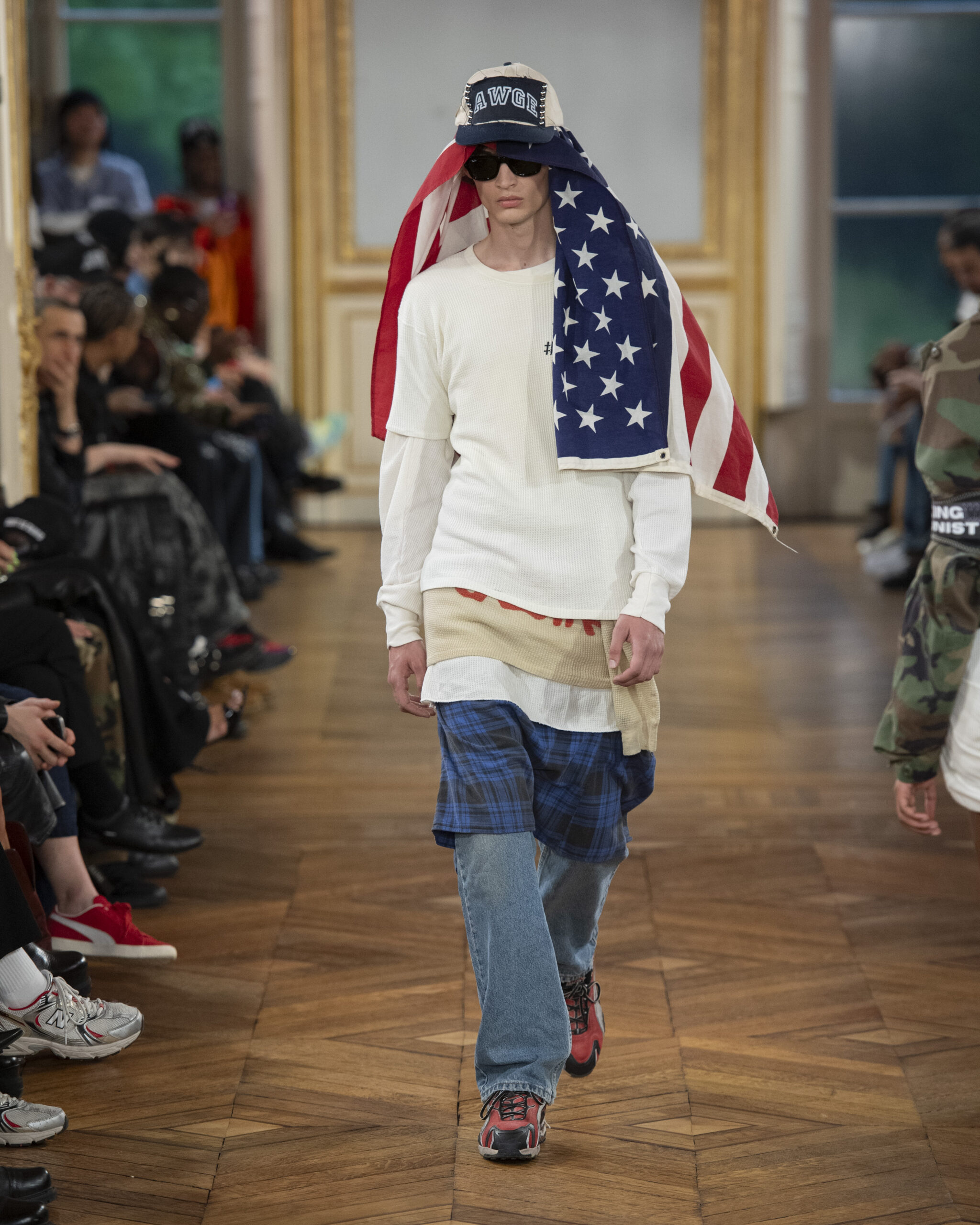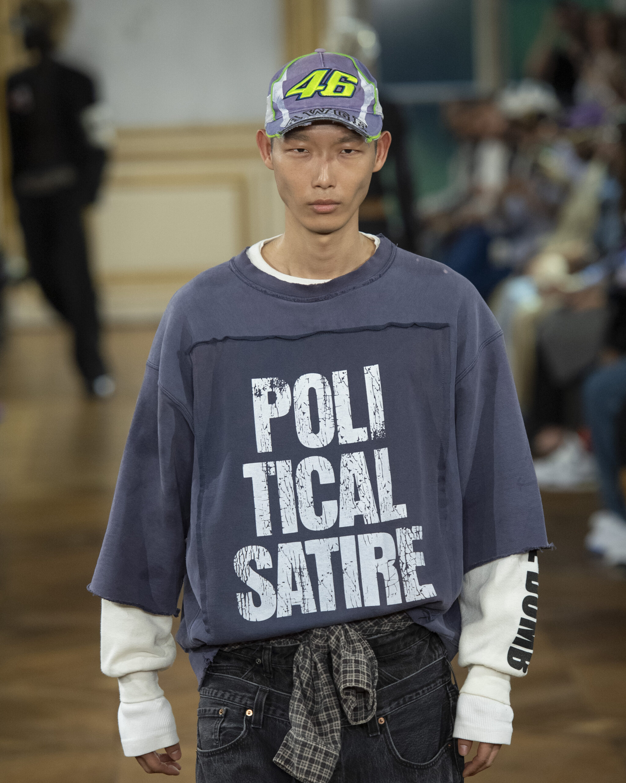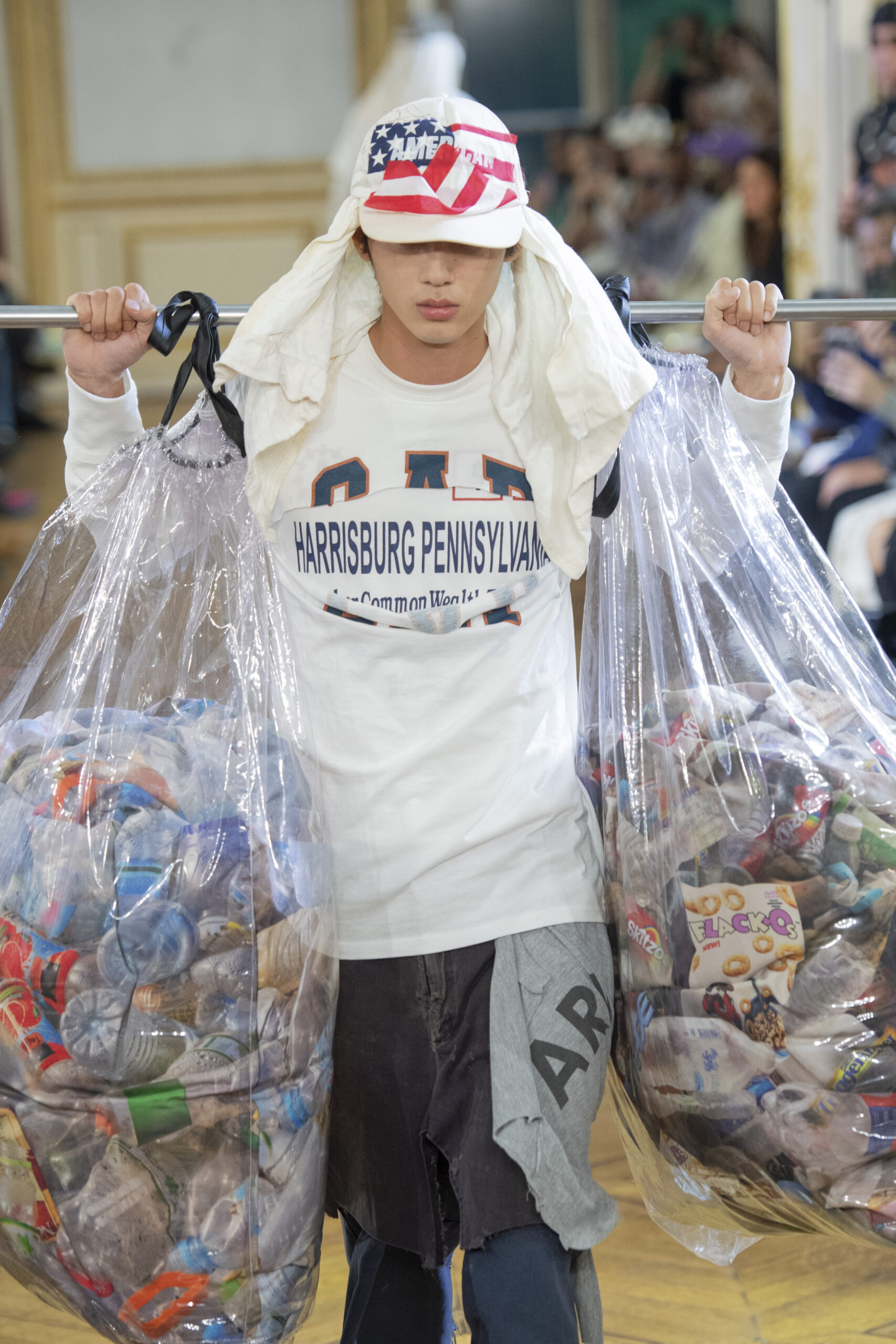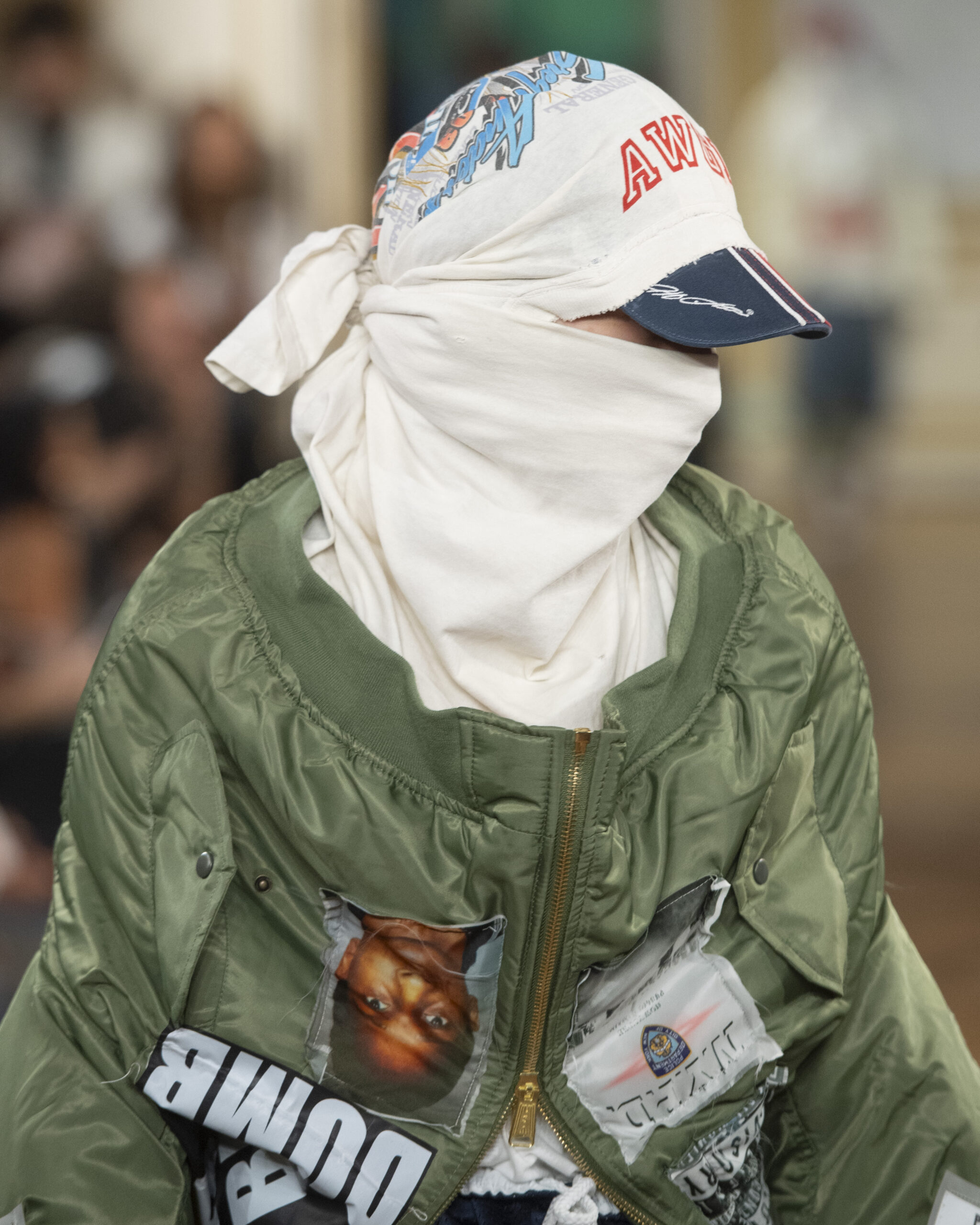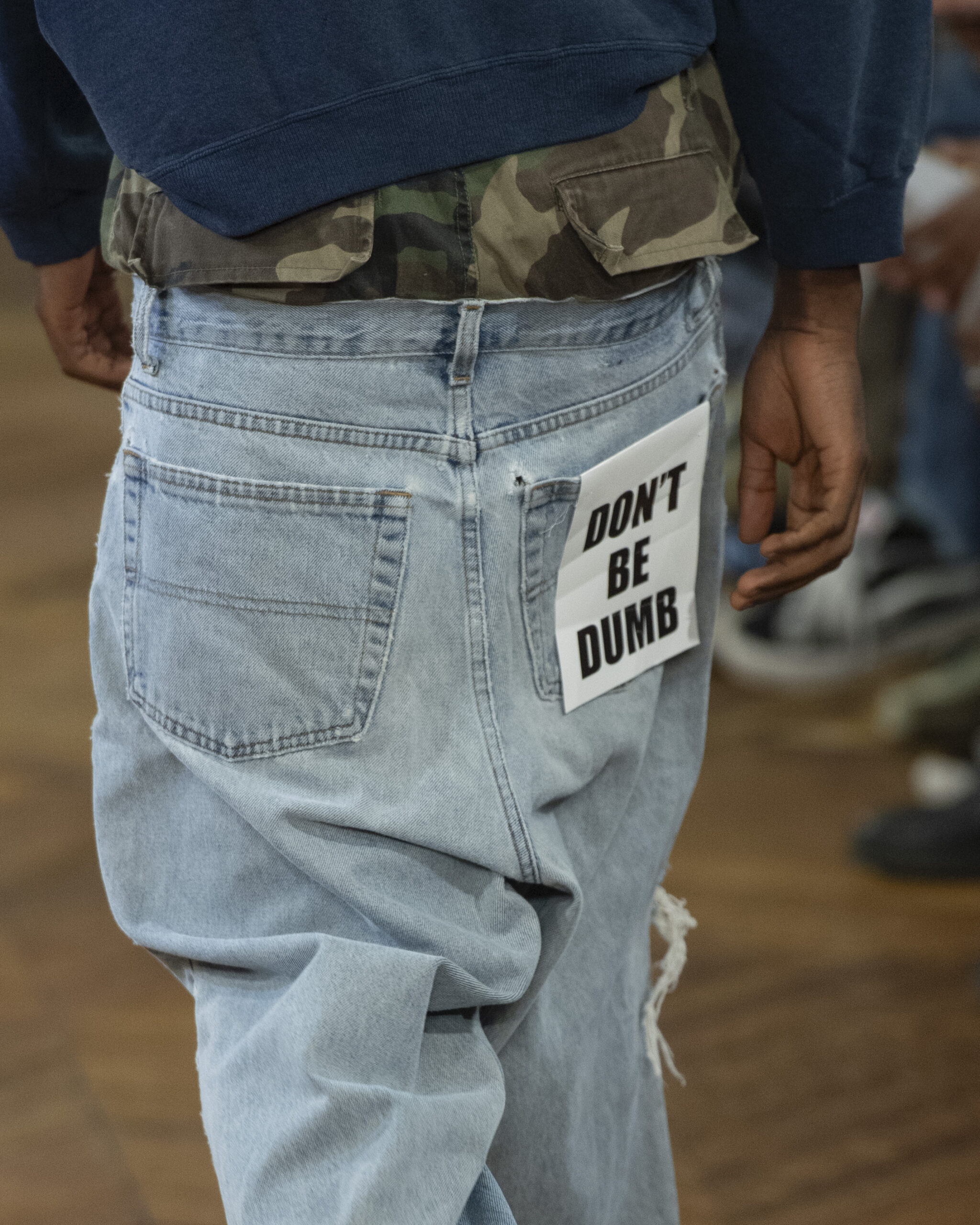 Le décor du défilé, comprenant des sacs poubelles transformés en chaises beanbag issues de la marque de mobilier Hommemade, en collaboration avec Crosby Studios, ajoutait une dimension immersive à cette expérience unique. Le défilé a été rythmé par la bande-son du prochain album d’A$AP Rocky, créant une synergie entre mode et musique.
