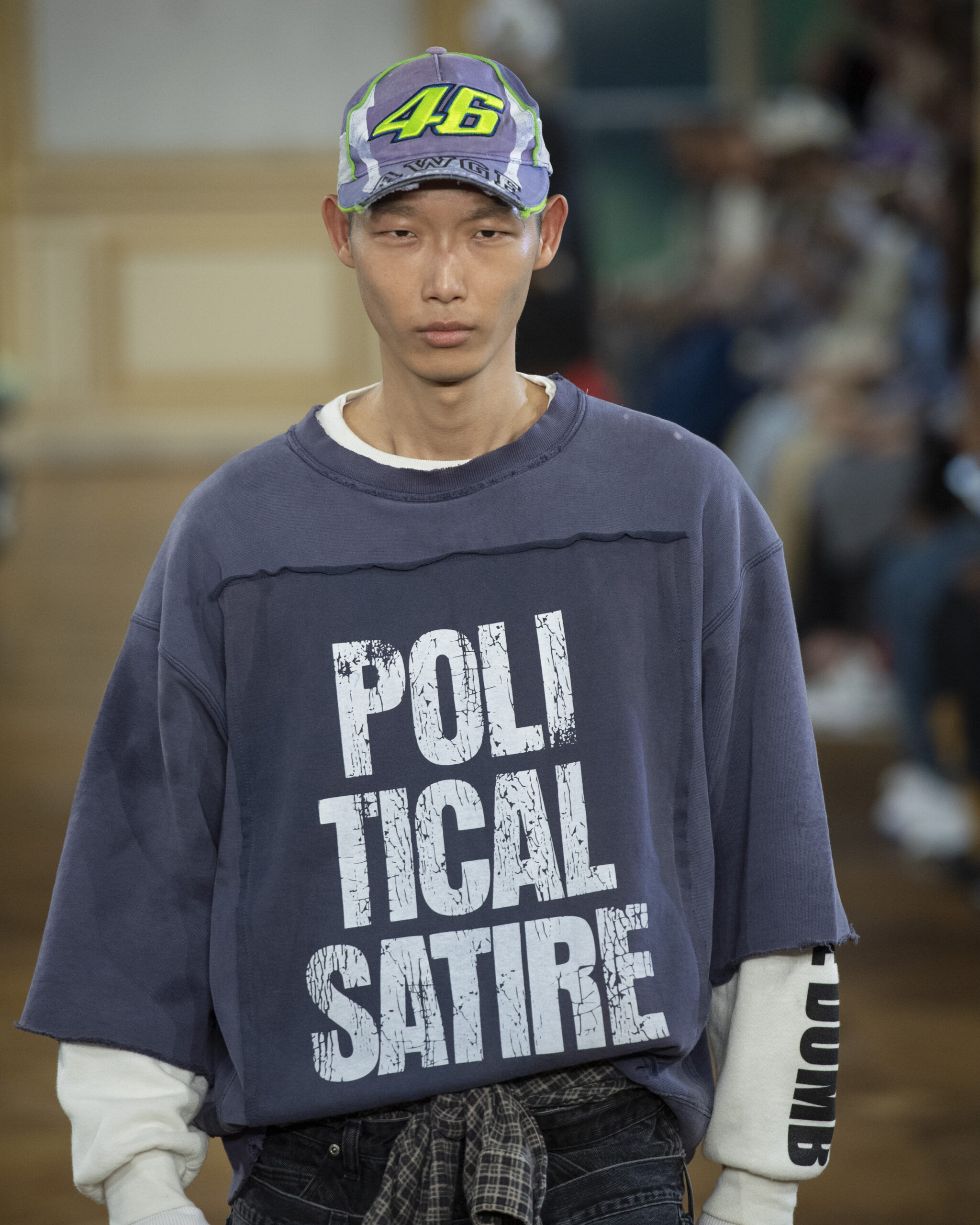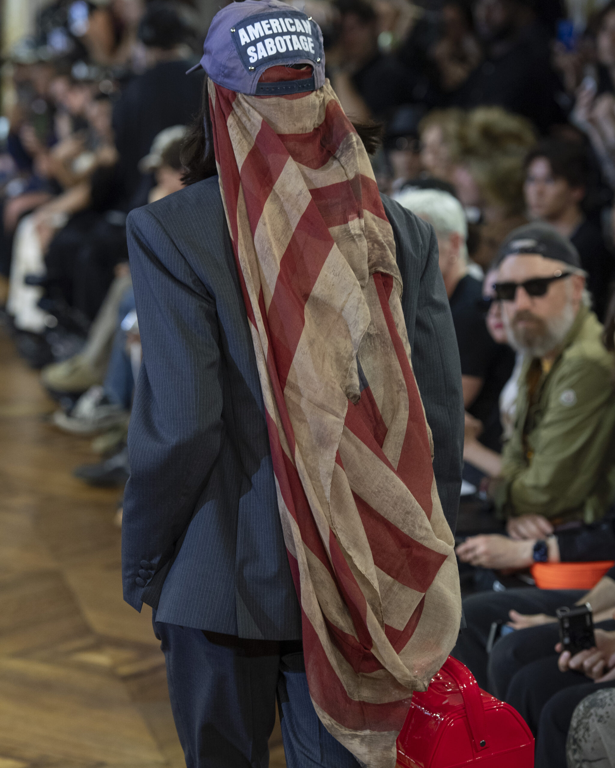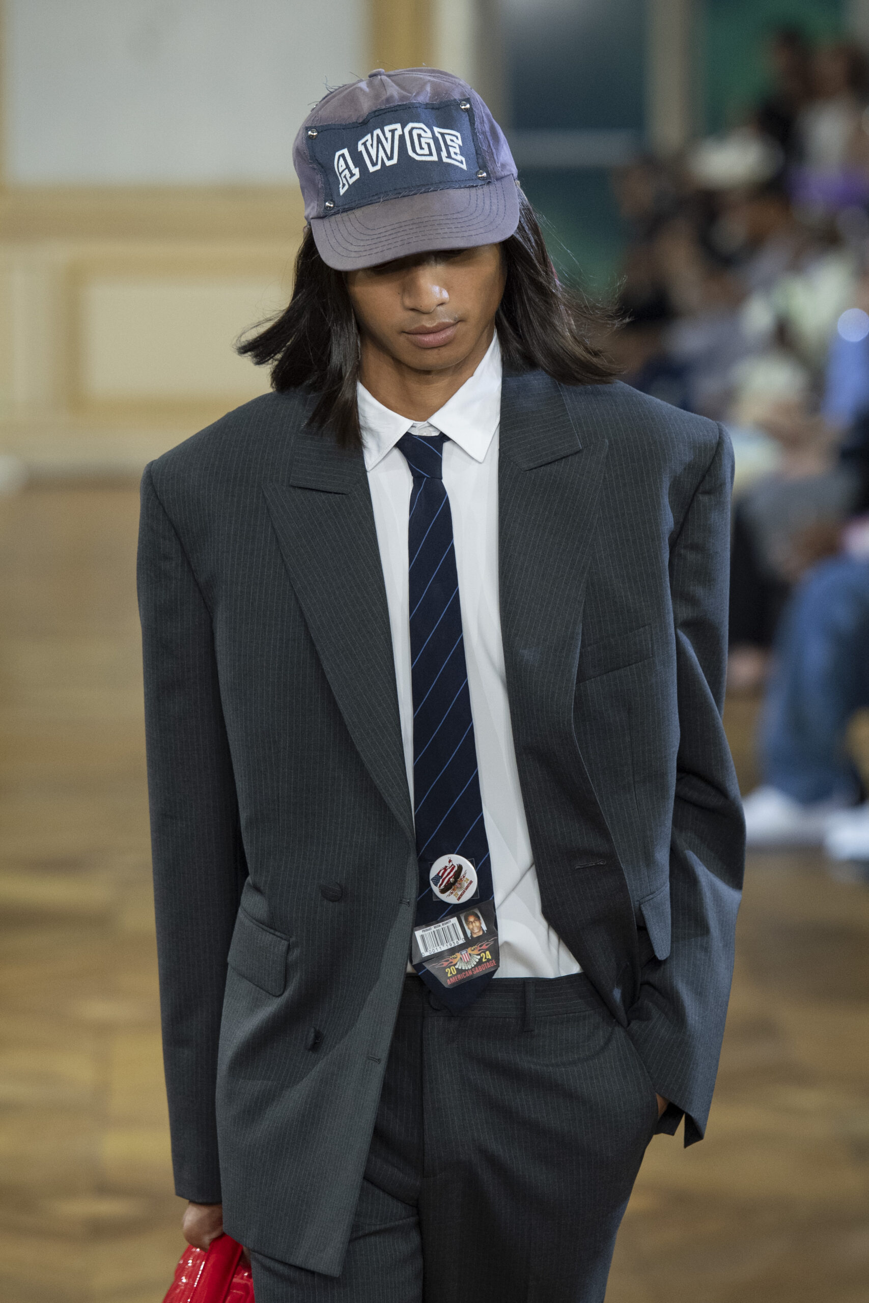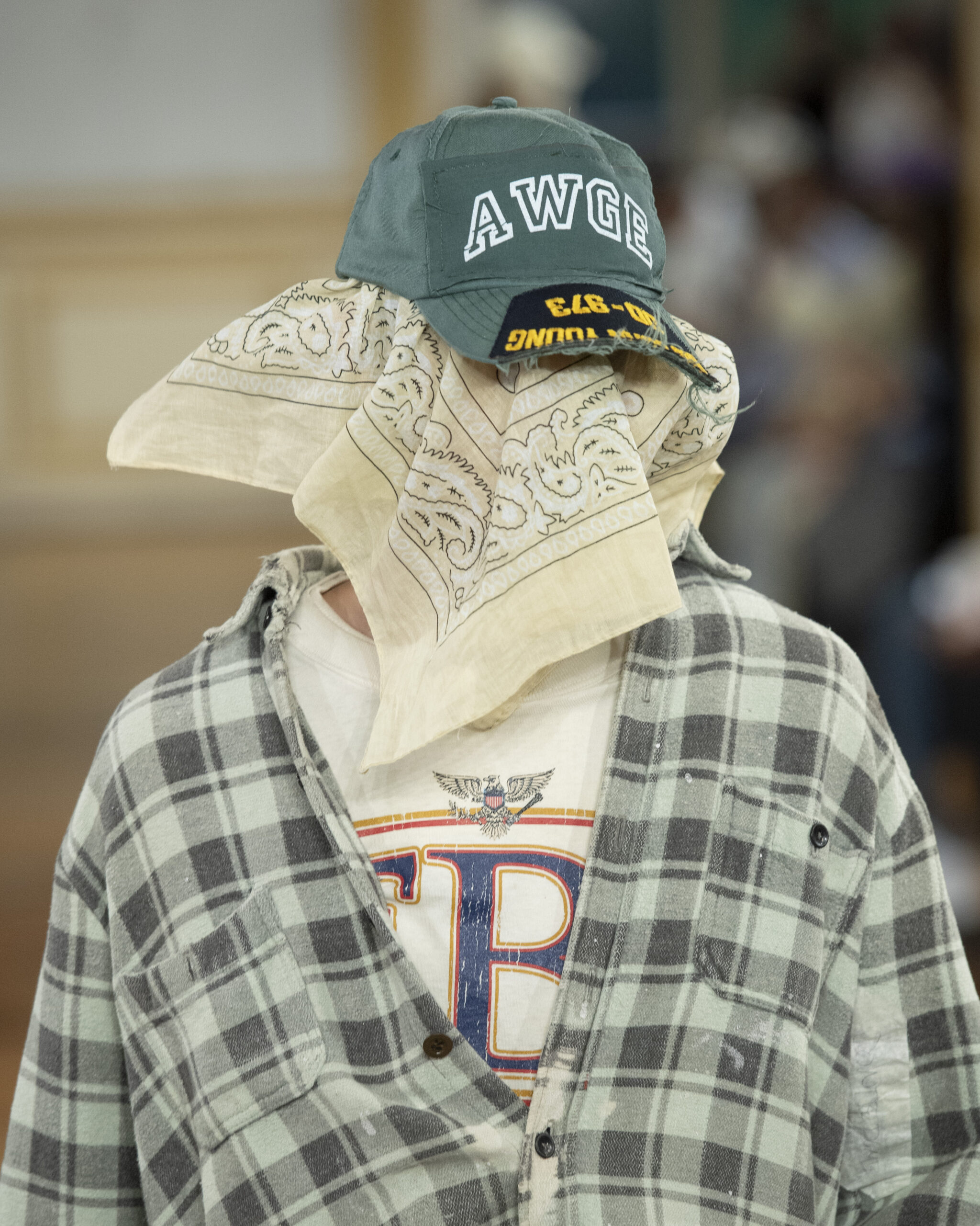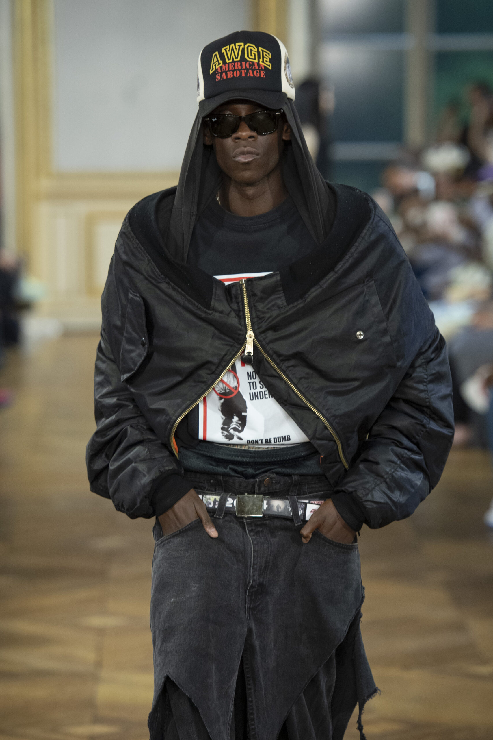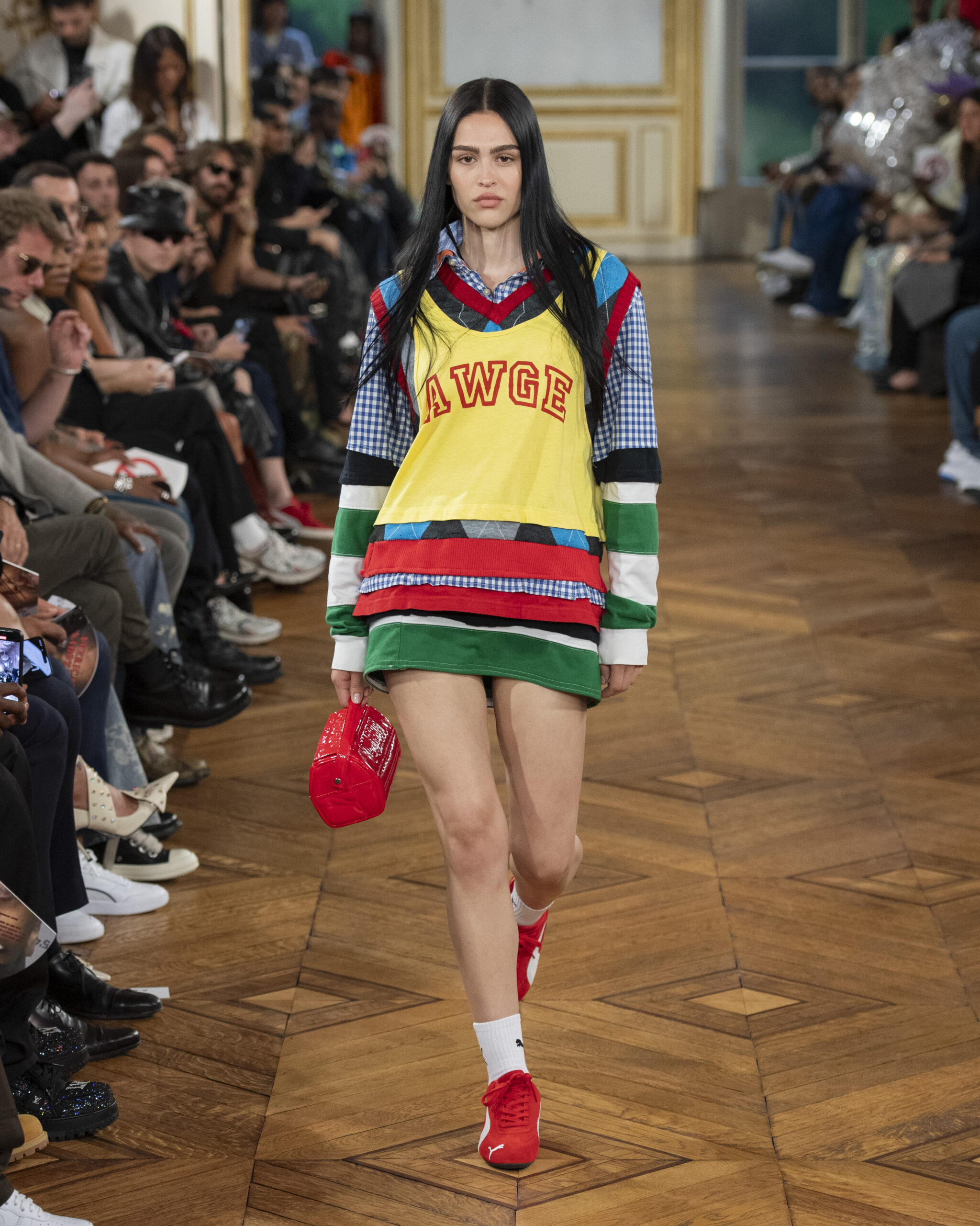 Le décor du défilé, comprenant des sacs poubelles transformés en chaises beanbag issues de la marque de mobilier Hommemade, en collaboration avec Crosby Studios, ajoutait une dimension immersive à cette expérience unique. Le défilé a été rythmé par la bande-son du prochain album d’A$AP Rocky, créant une synergie entre mode et musique.