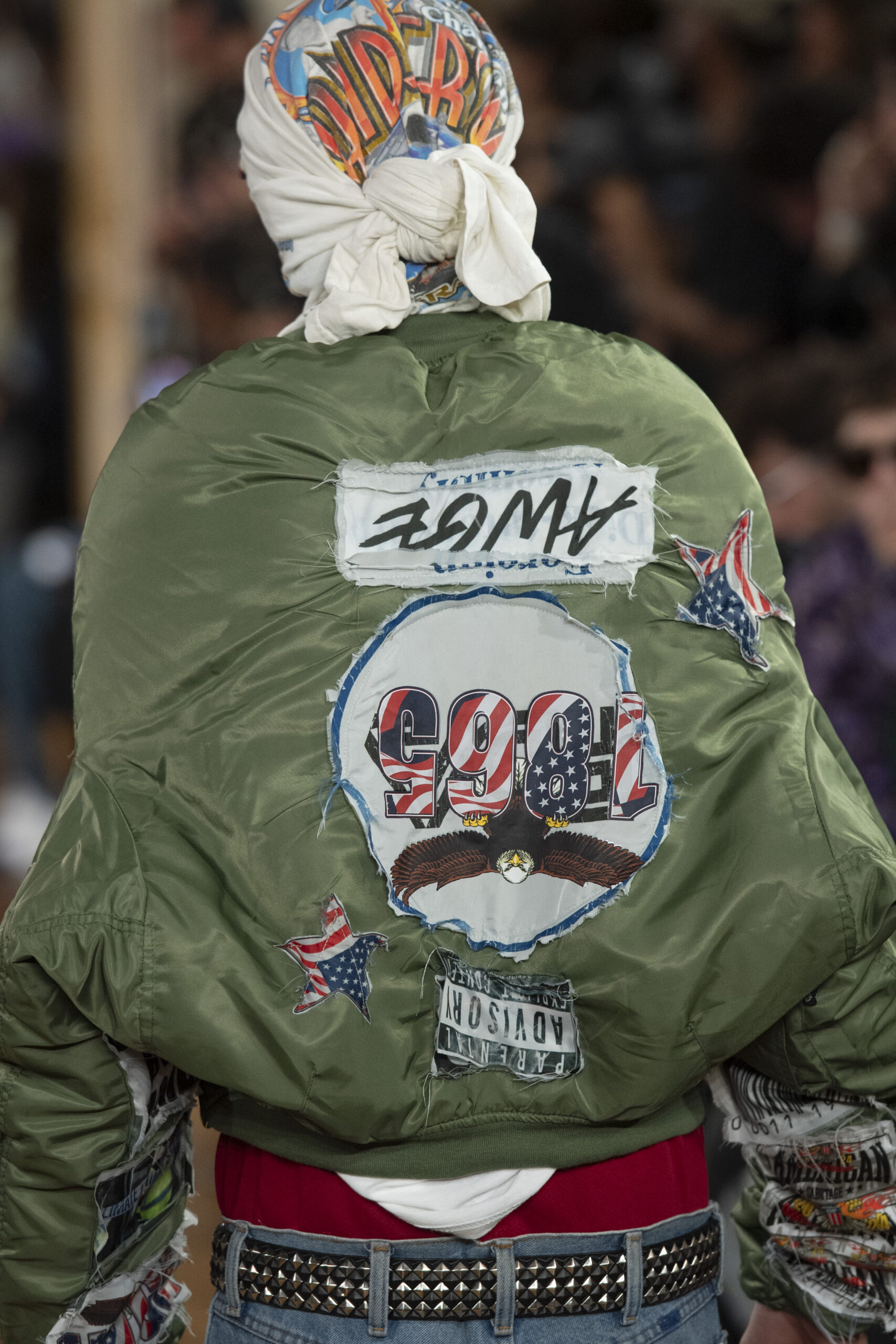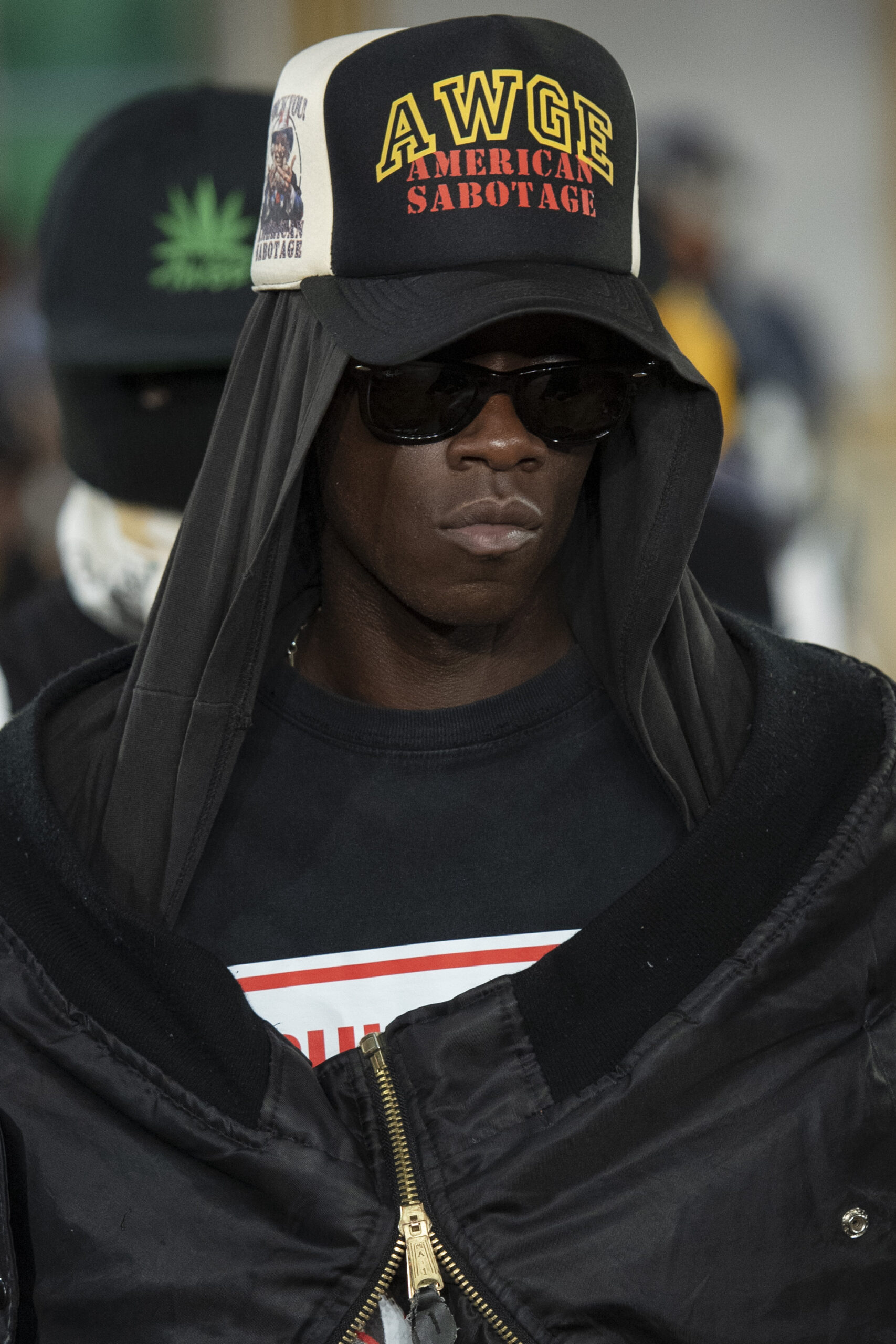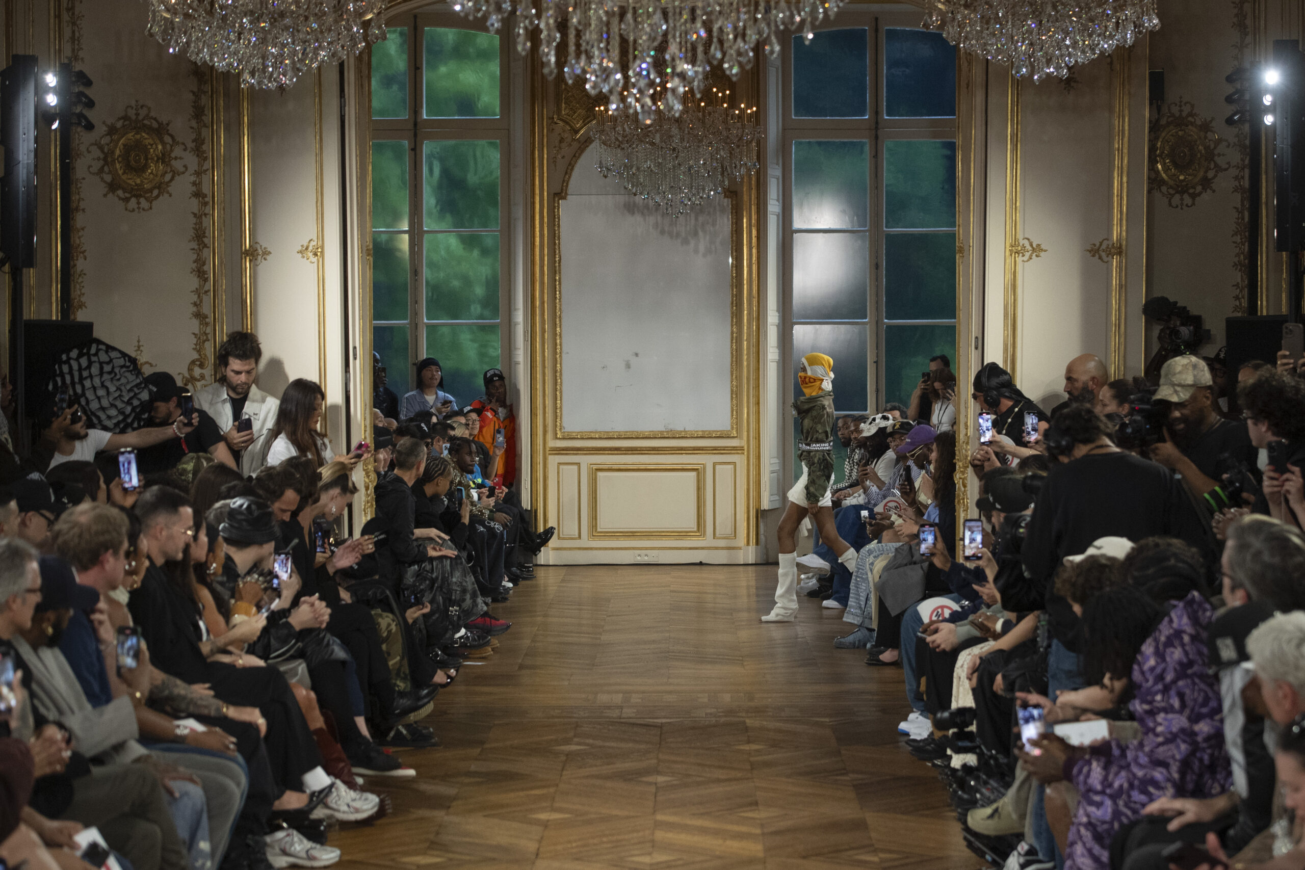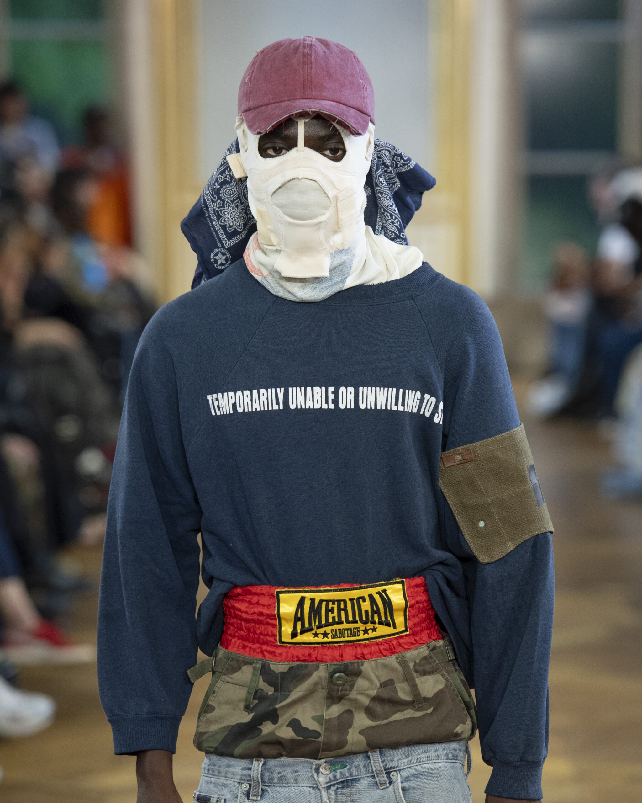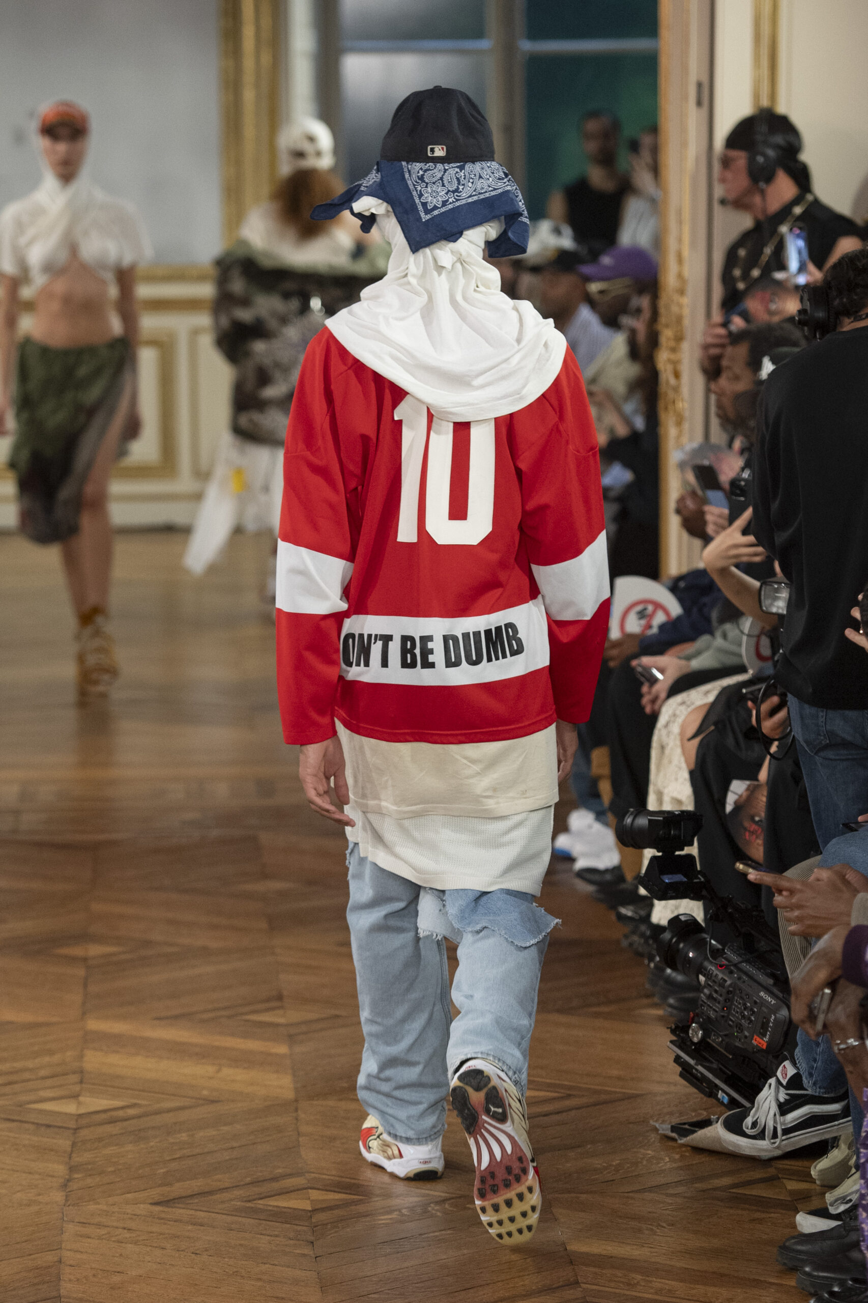 Le décor du défilé, comprenant des sacs poubelles transformés en chaises beanbag issues de la marque de mobilier Hommemade, en collaboration avec Crosby Studios, ajoutait une dimension immersive à cette expérience unique. Le défilé a été rythmé par la bande-son du prochain album d’A$AP Rocky, créant une synergie entre mode et musique.