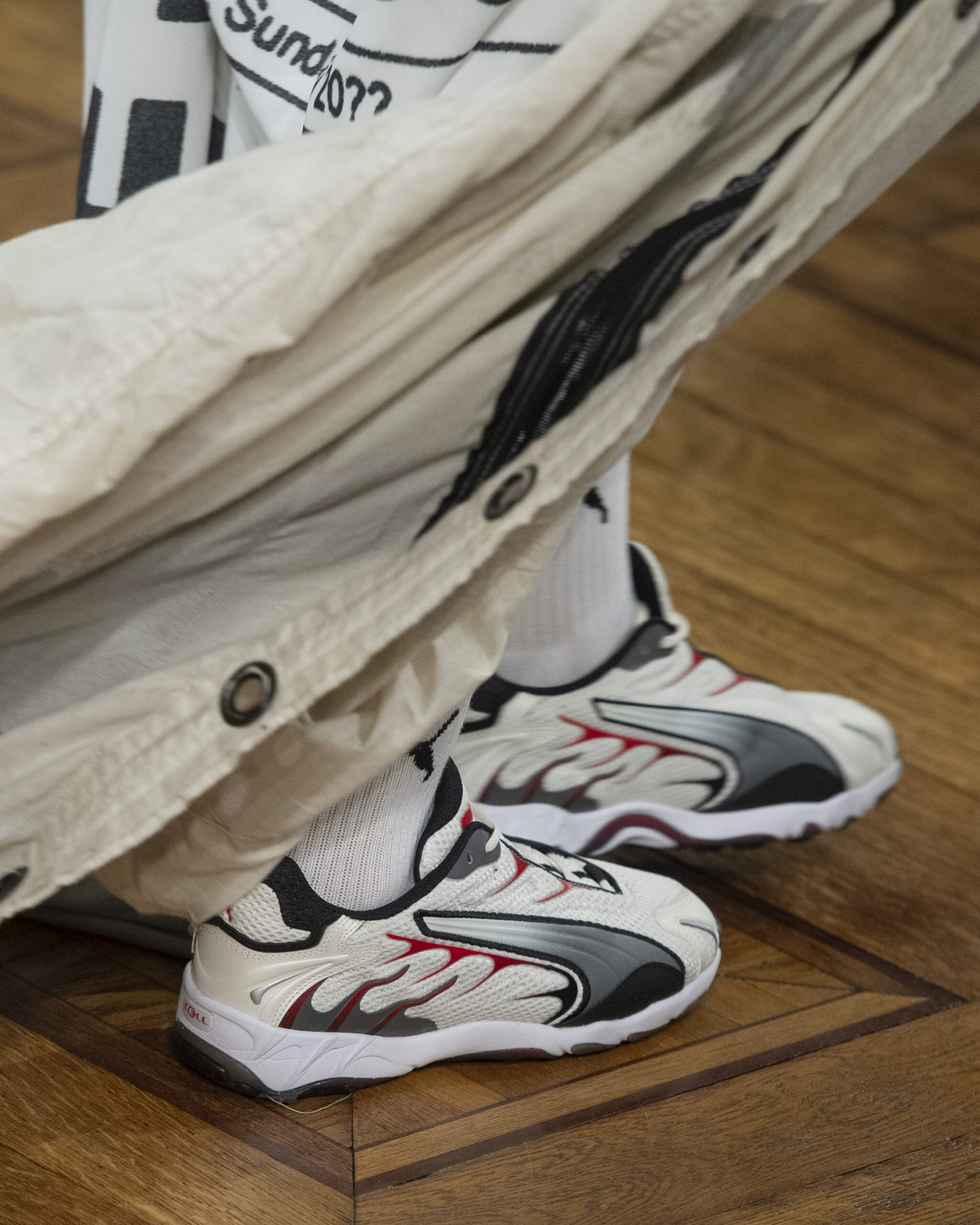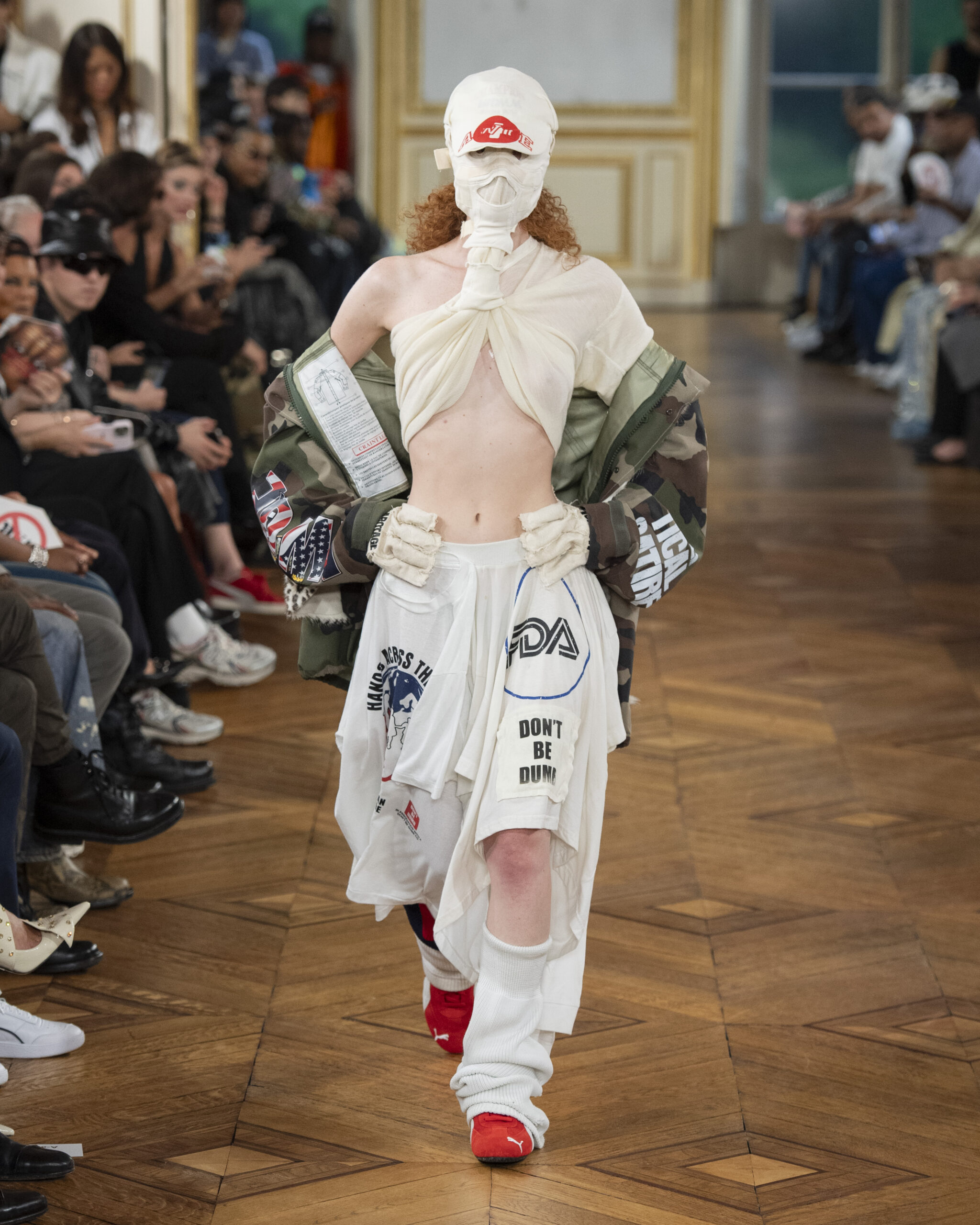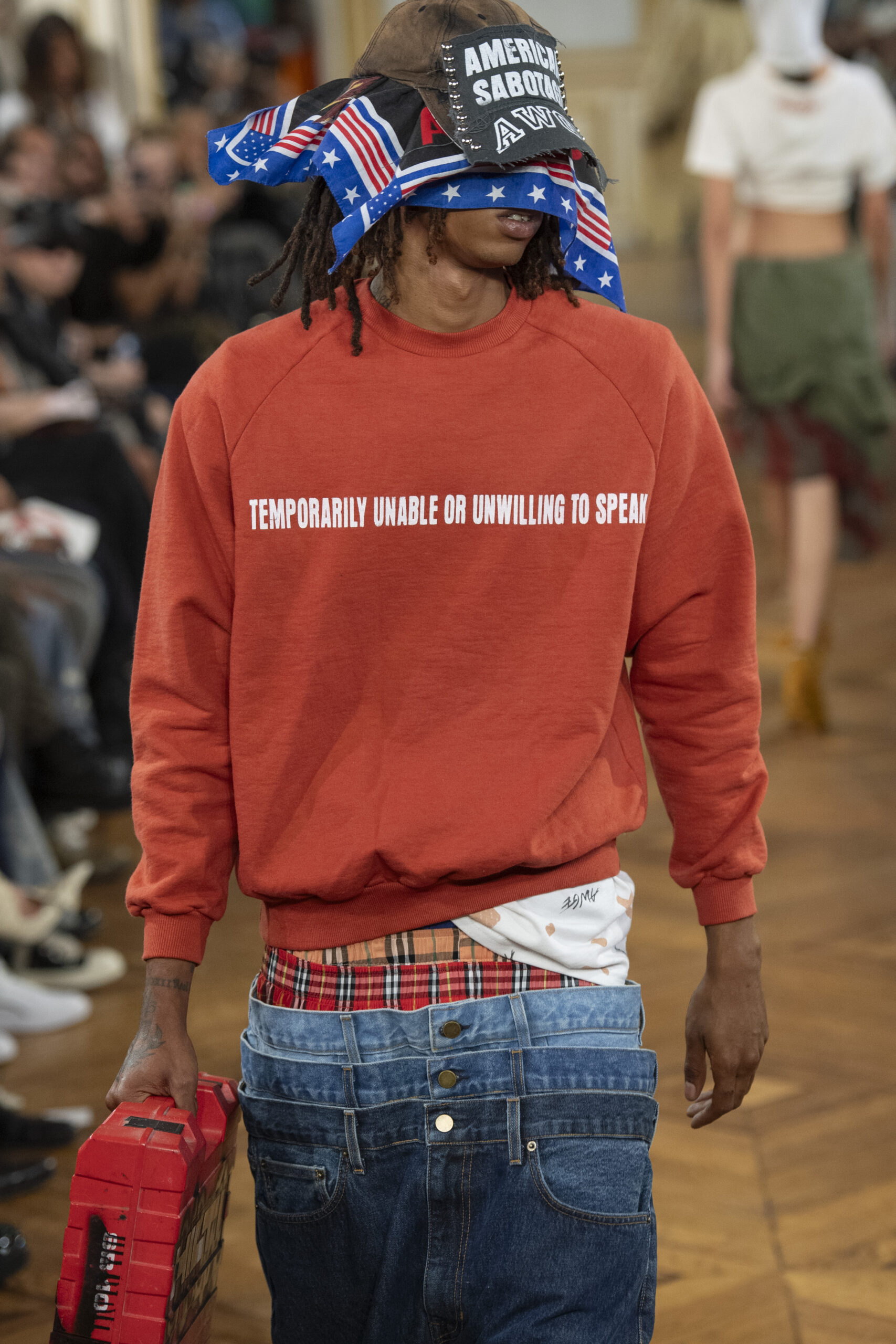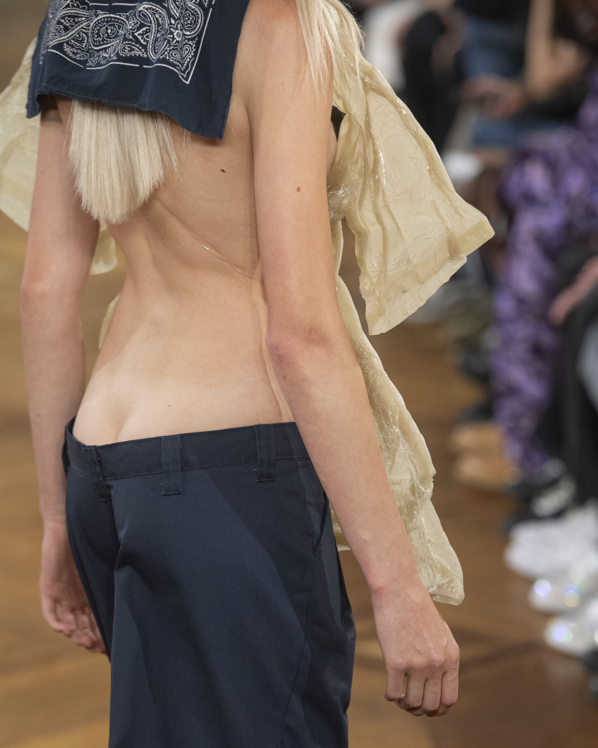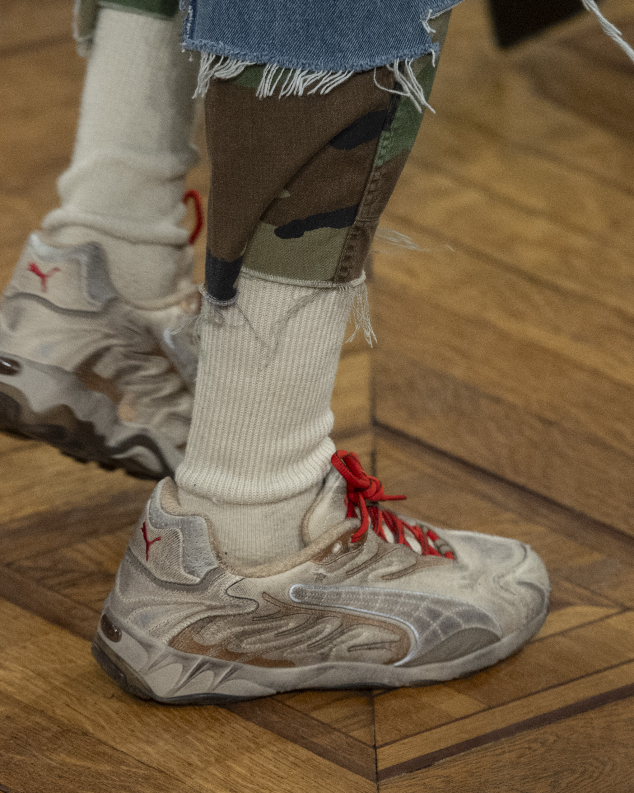 Le décor du défilé, comprenant des sacs poubelles transformés en chaises beanbag issues de la marque de mobilier Hommemade, en collaboration avec Crosby Studios, ajoutait une dimension immersive à cette expérience unique. Le défilé a été rythmé par la bande-son du prochain album d’A$AP Rocky, créant une synergie entre mode et musique.