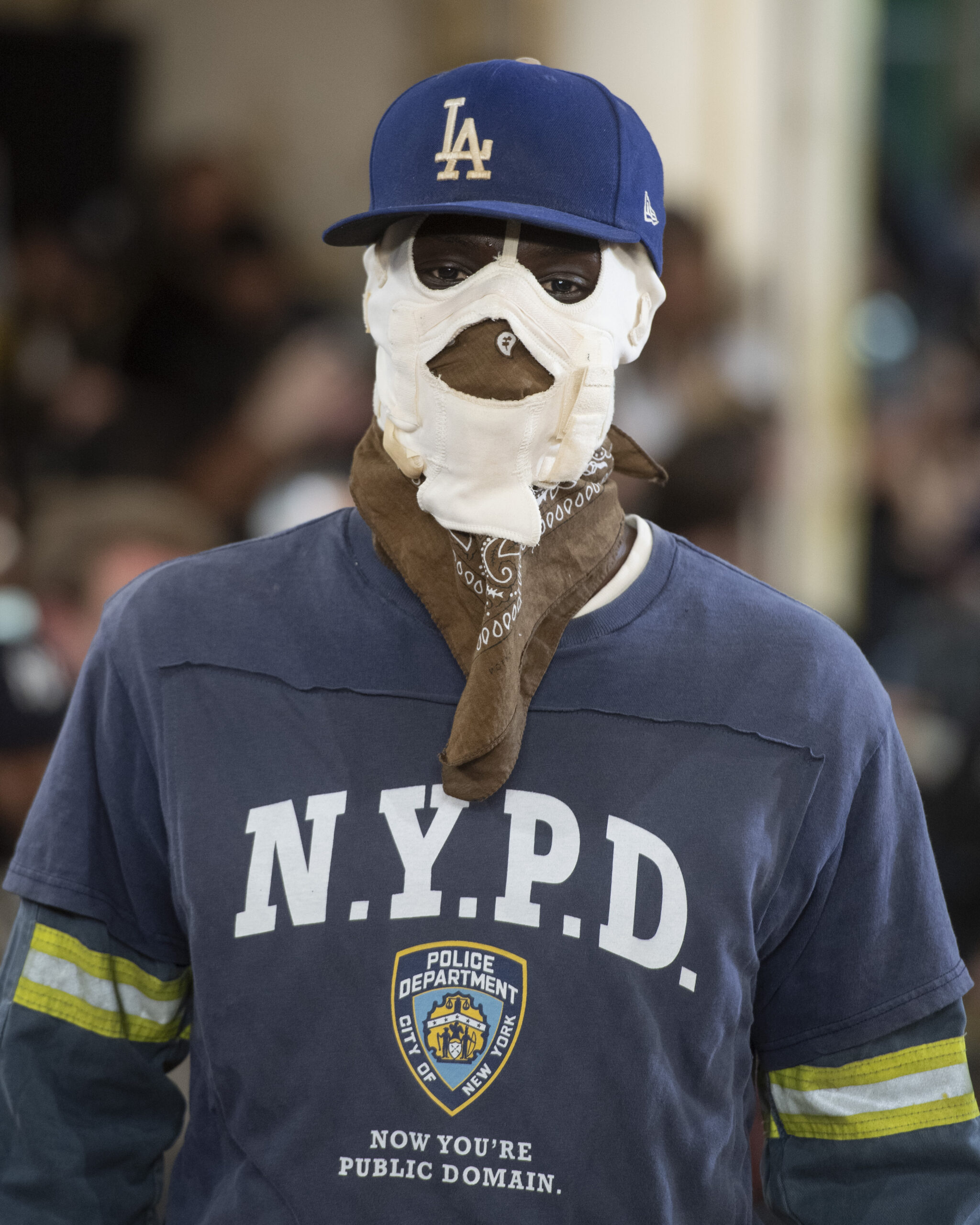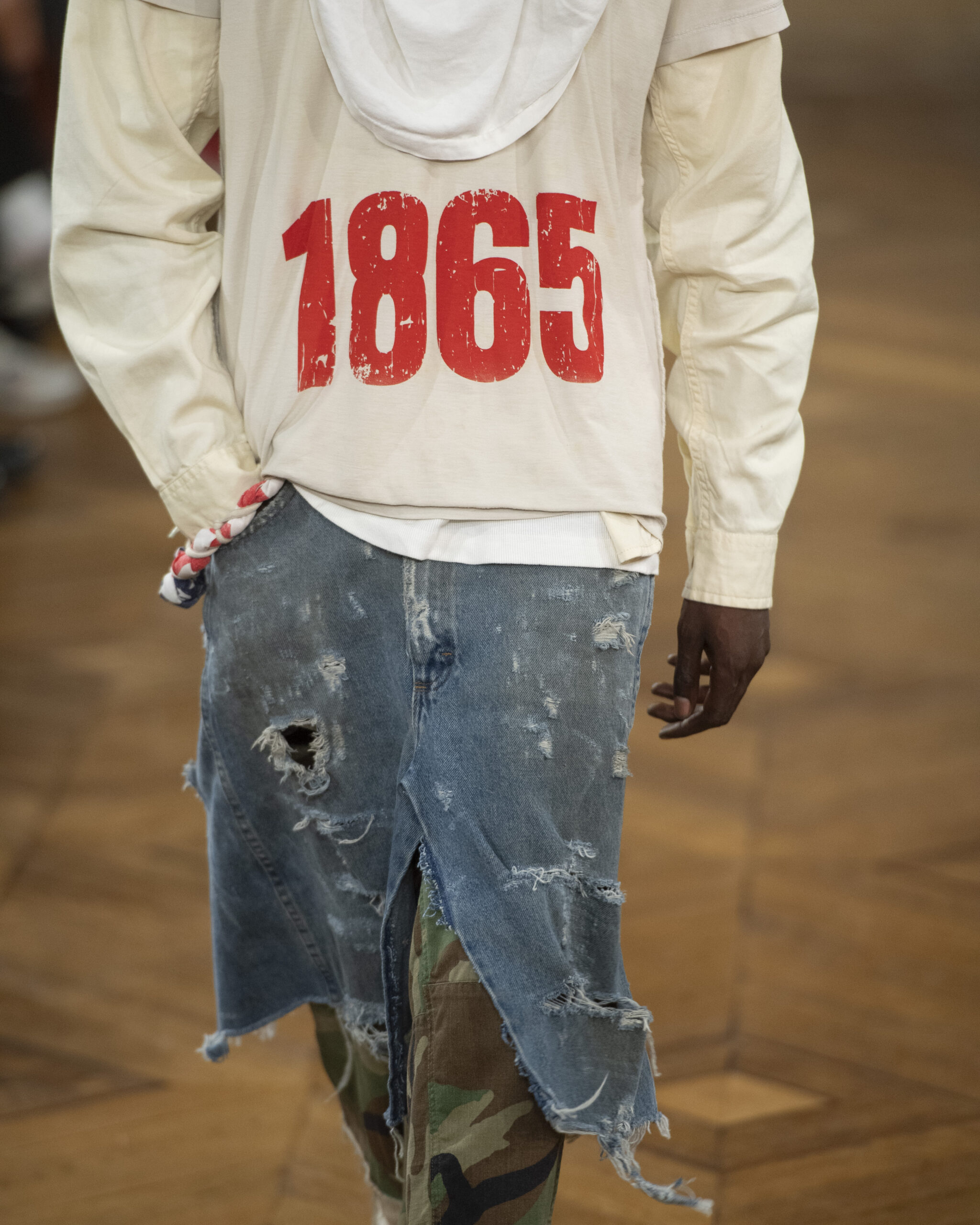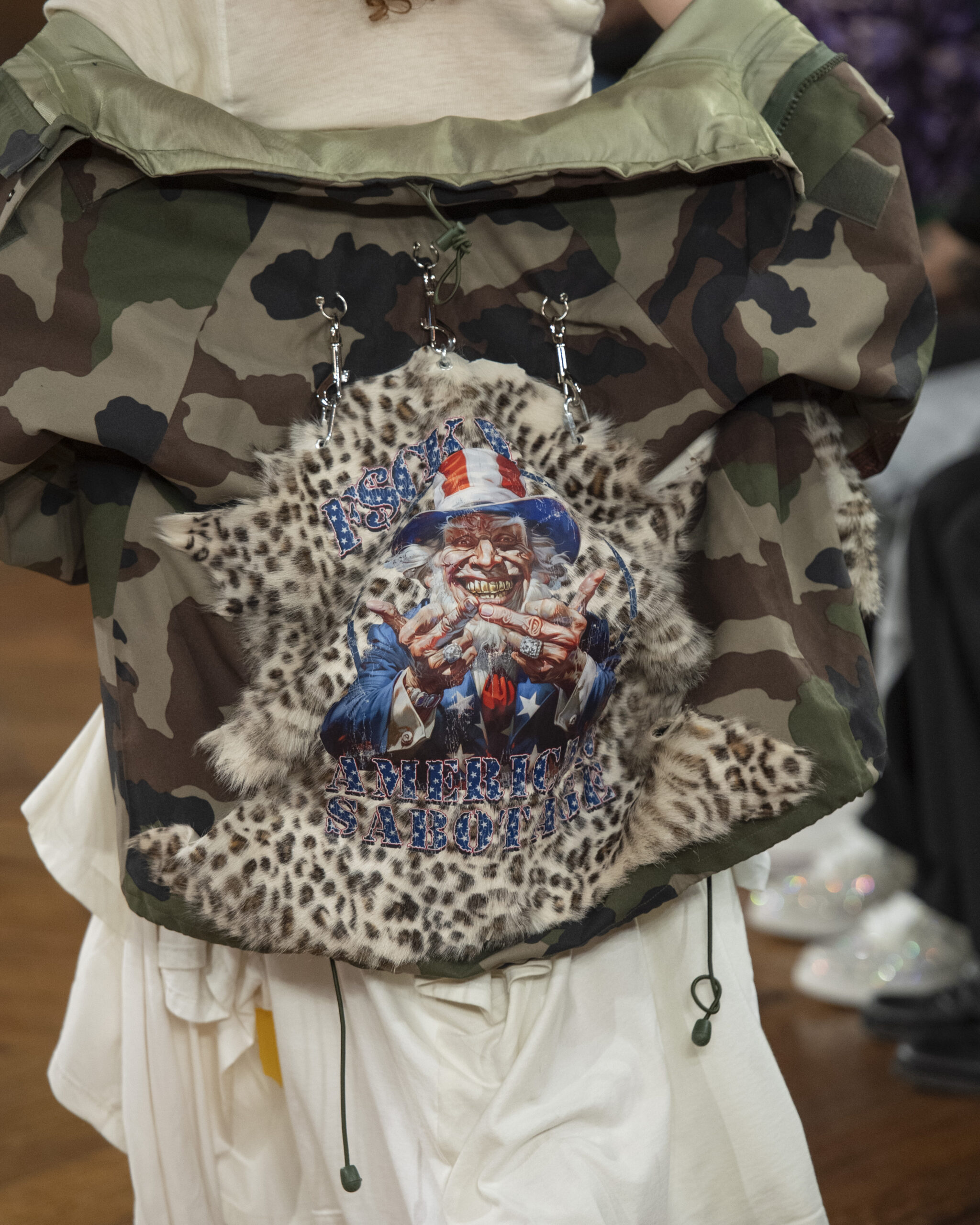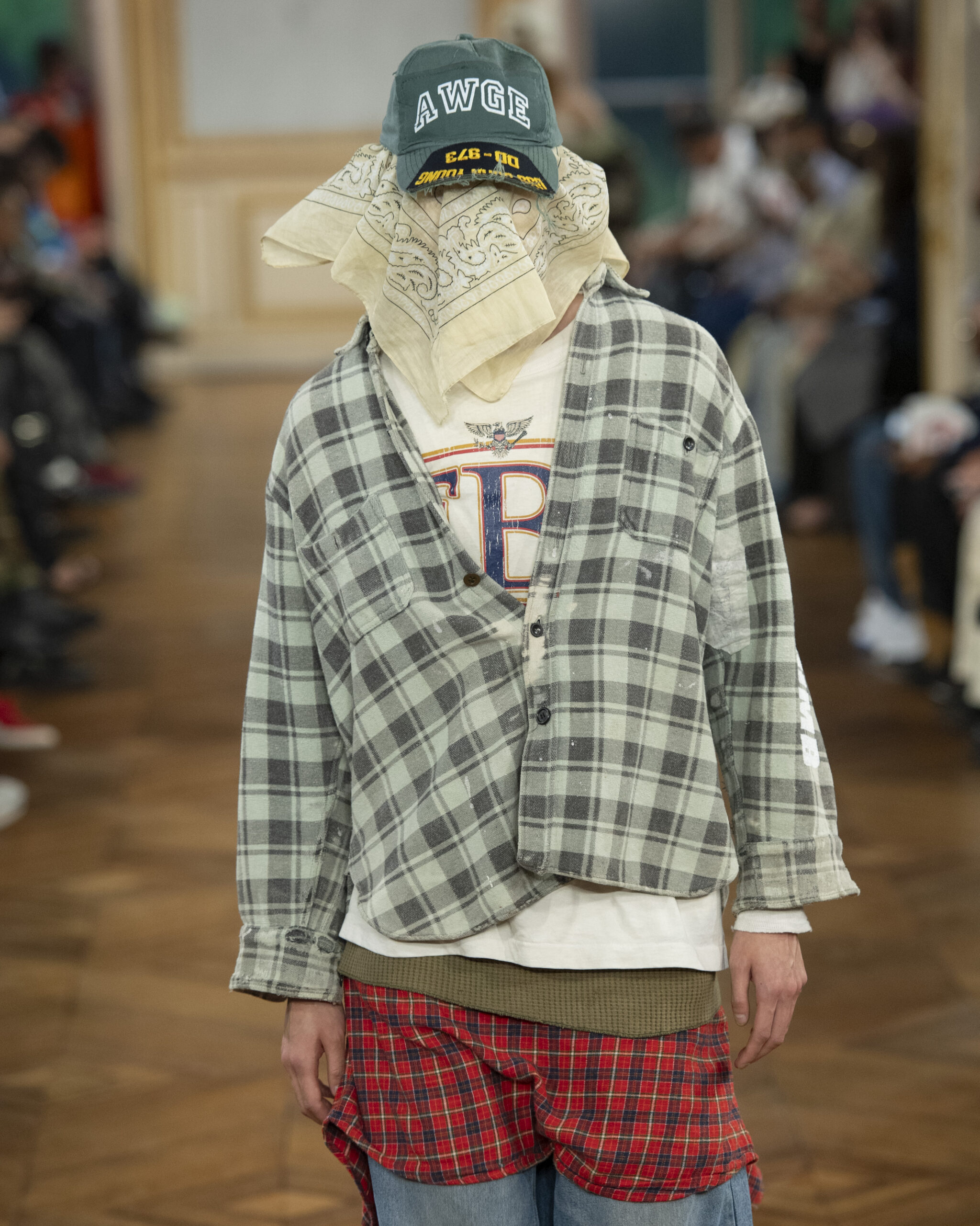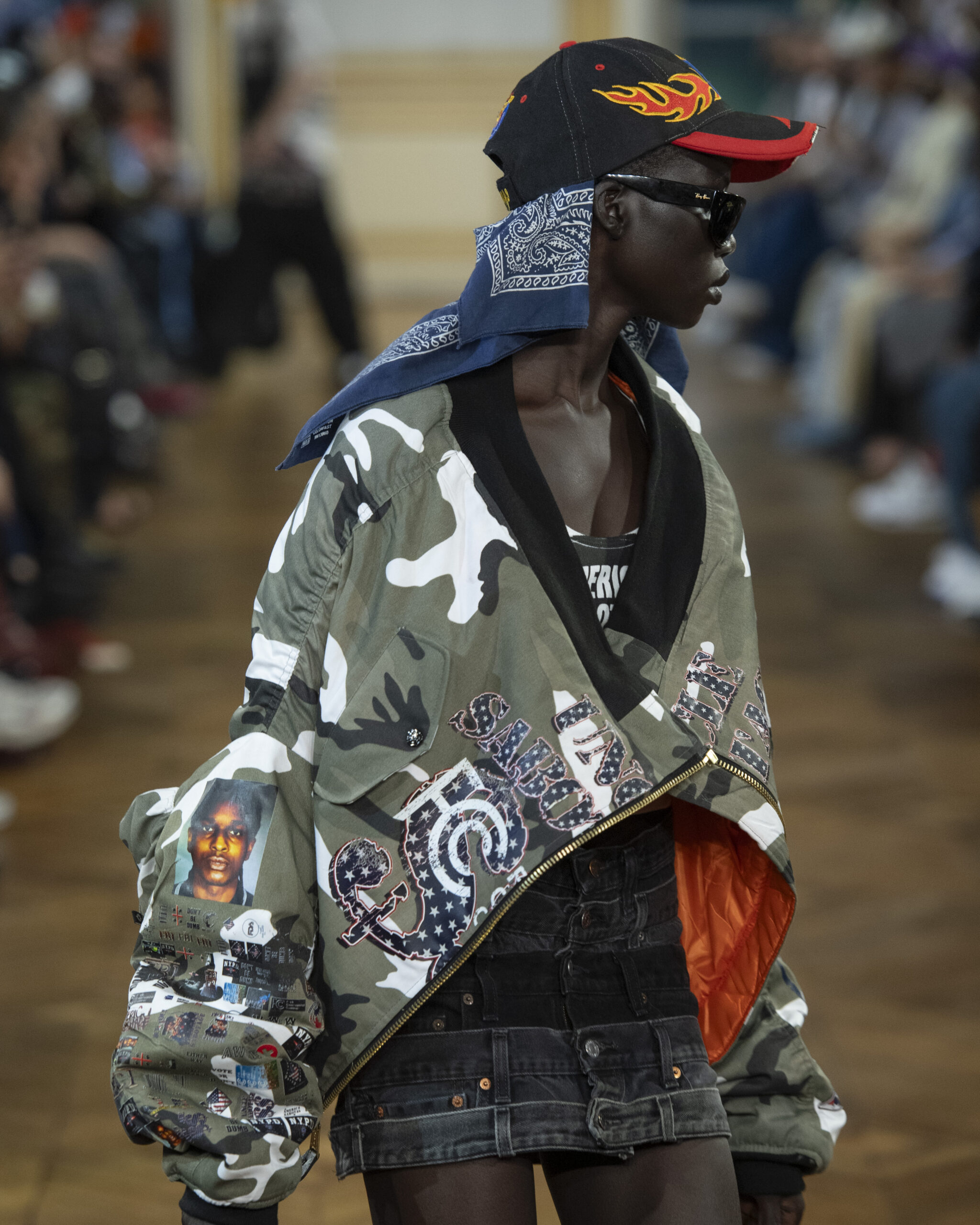 Le décor du défilé, comprenant des sacs poubelles transformés en chaises beanbag issues de la marque de mobilier Hommemade, en collaboration avec Crosby Studios, ajoutait une dimension immersive à cette expérience unique. Le défilé a été rythmé par la bande-son du prochain album d’A$AP Rocky, créant une synergie entre mode et musique.