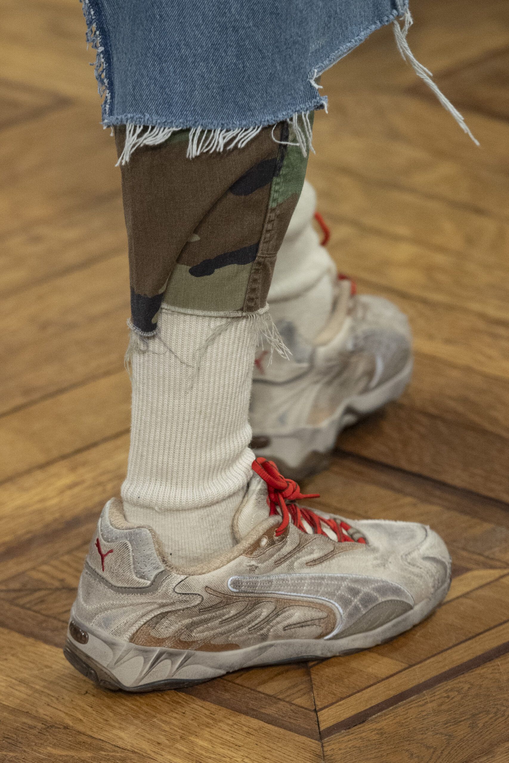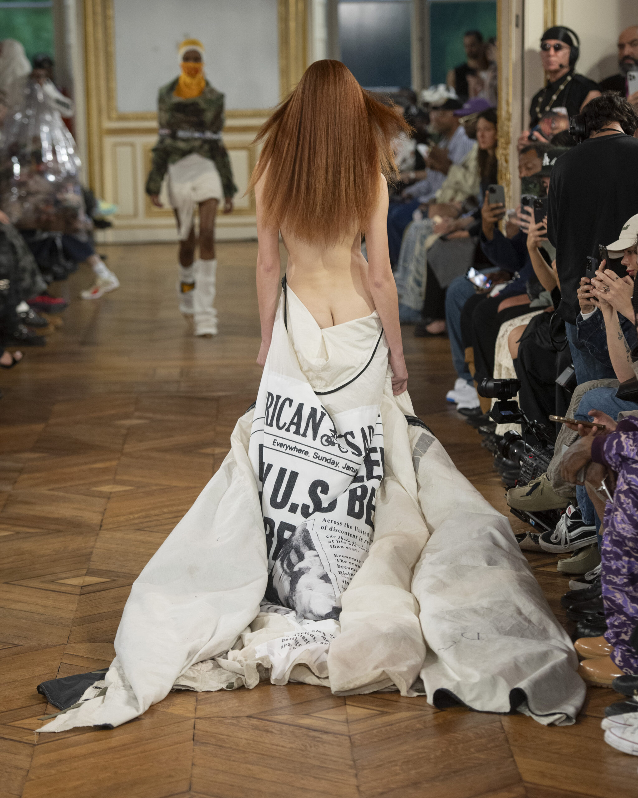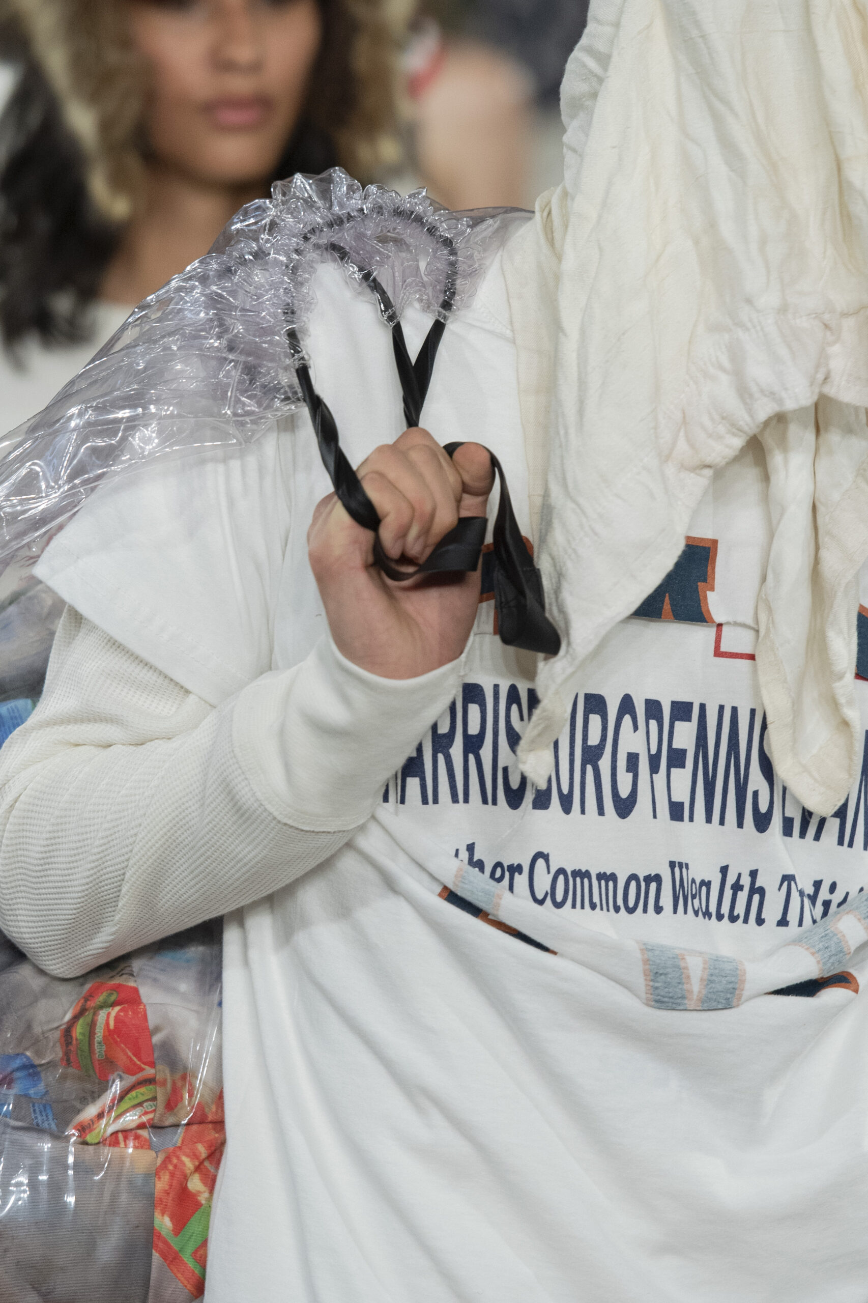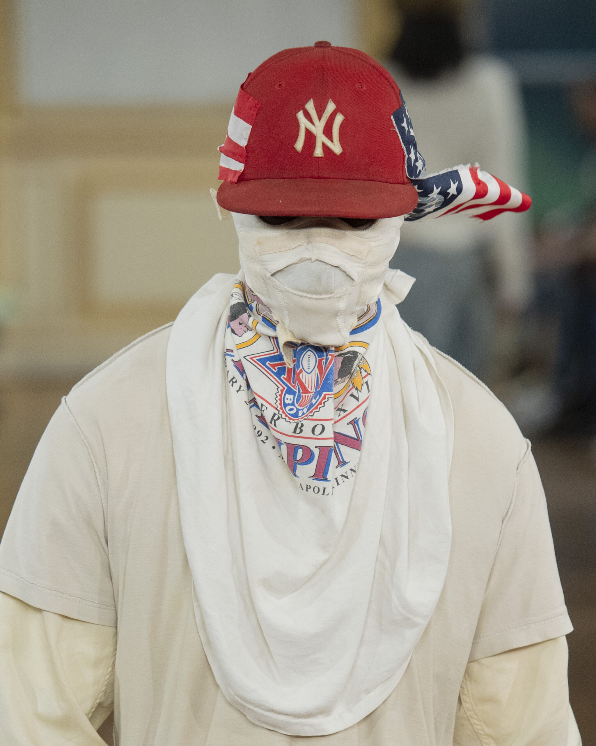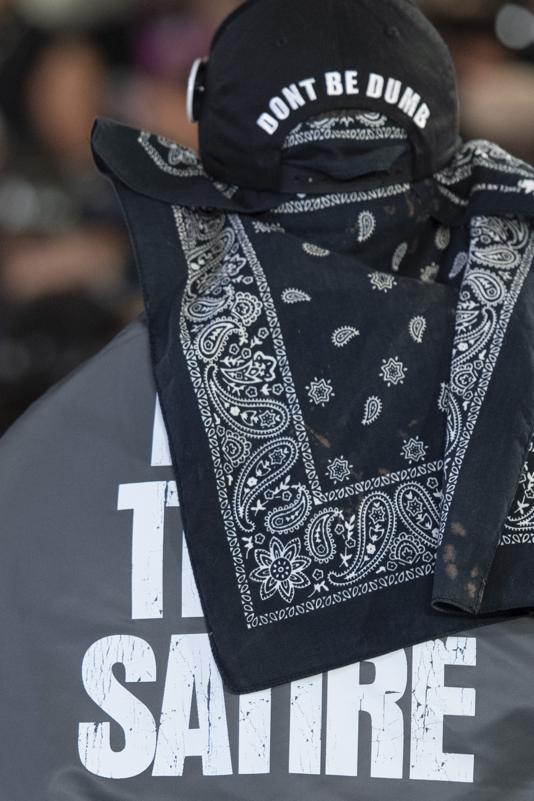 Le décor du défilé, comprenant des sacs poubelles transformés en chaises beanbag issues de la marque de mobilier Hommemade, en collaboration avec Crosby Studios, ajoutait une dimension immersive à cette expérience unique. Le défilé a été rythmé par la bande-son du prochain album d’A$AP Rocky, créant une synergie entre mode et musique.