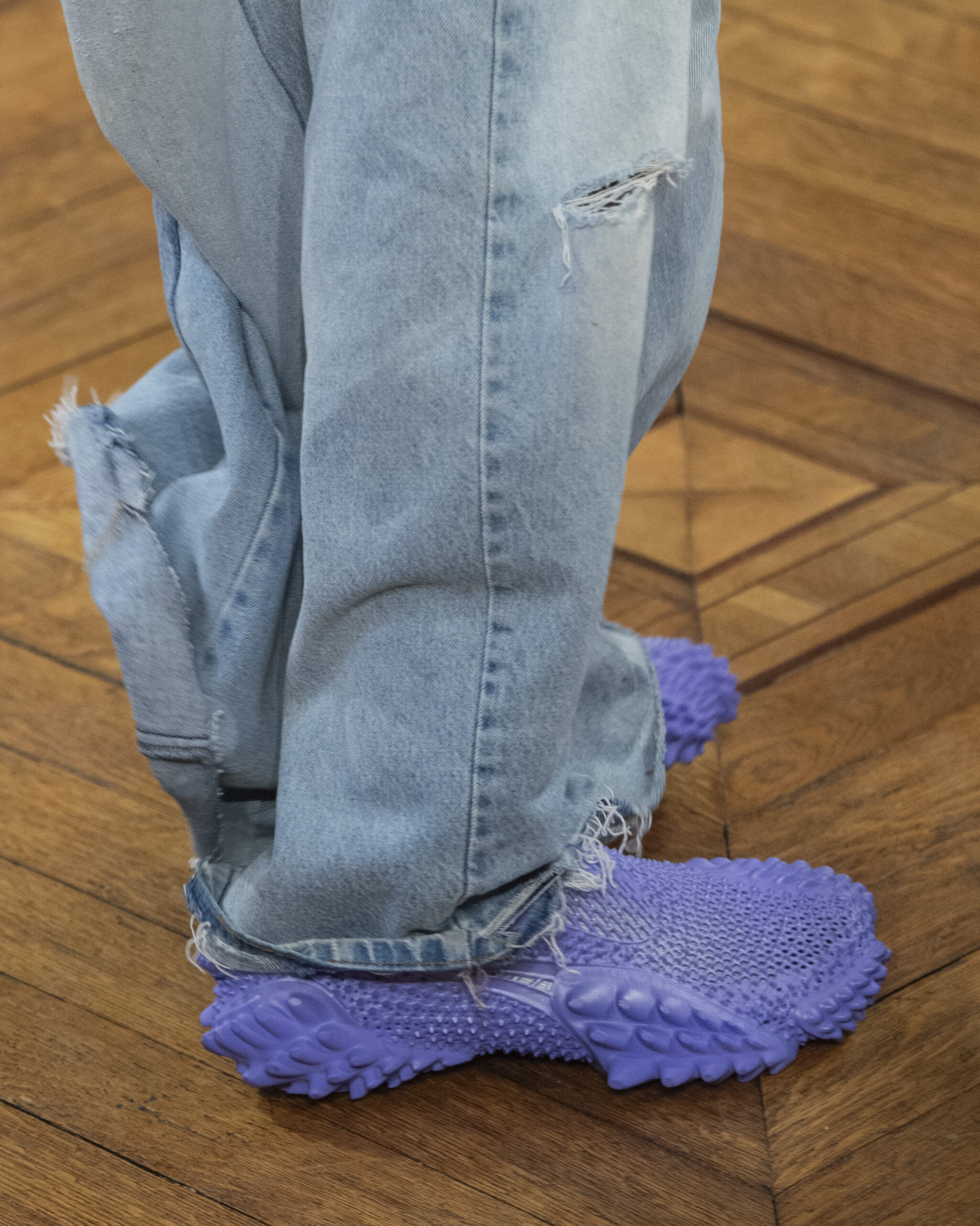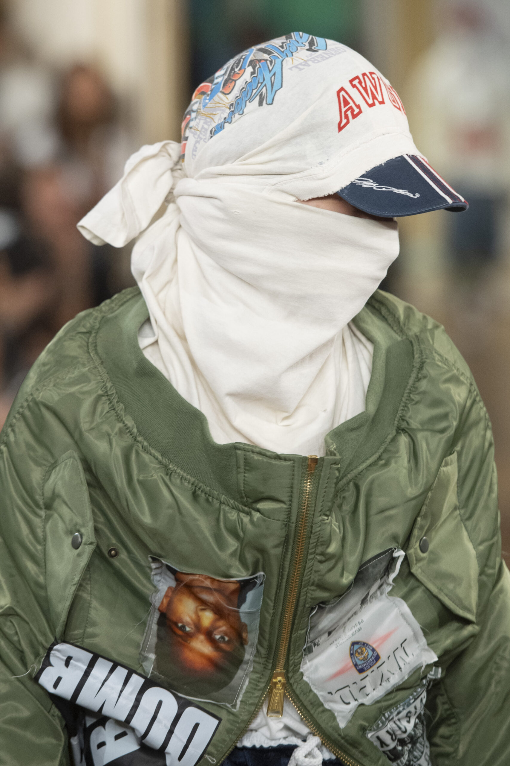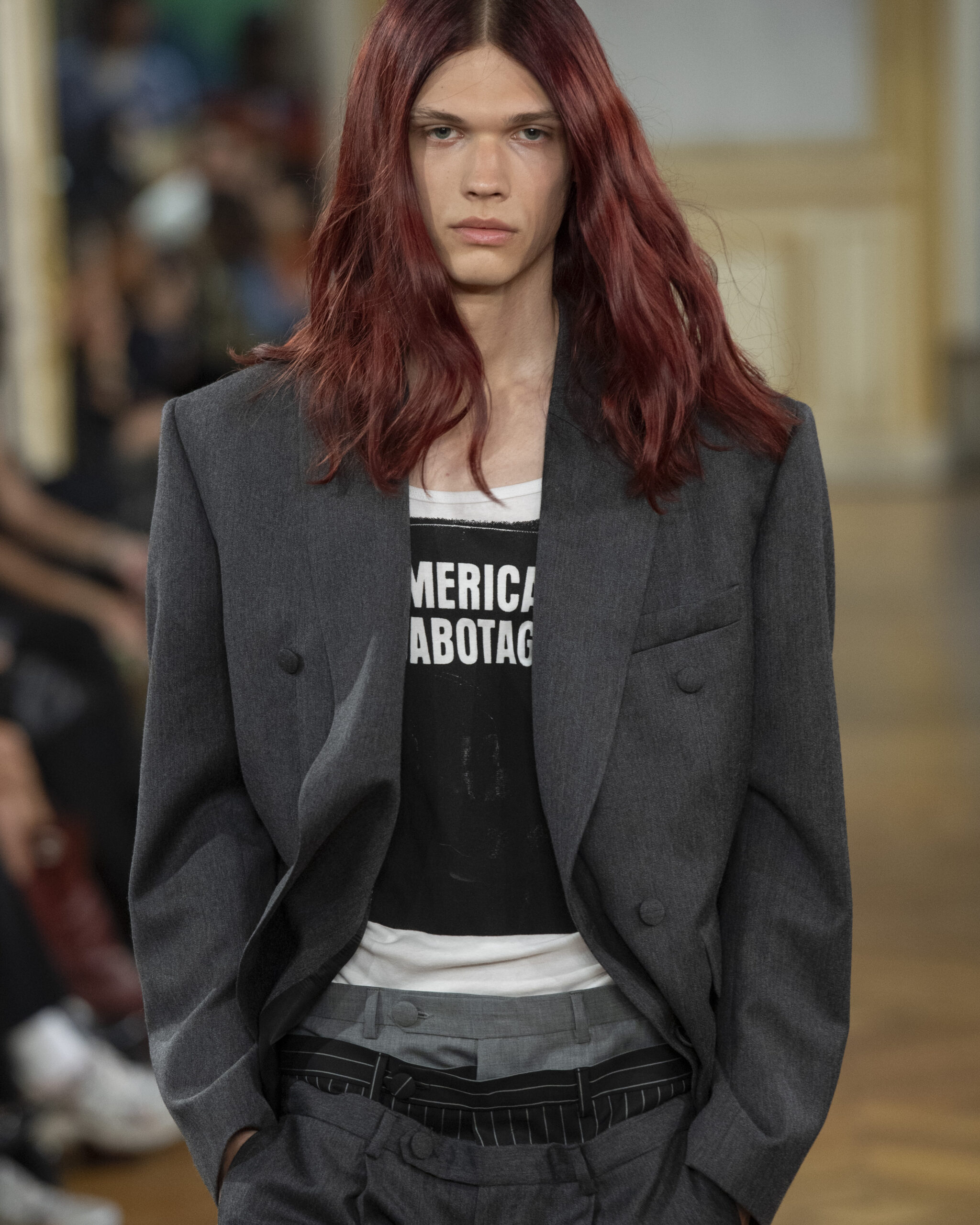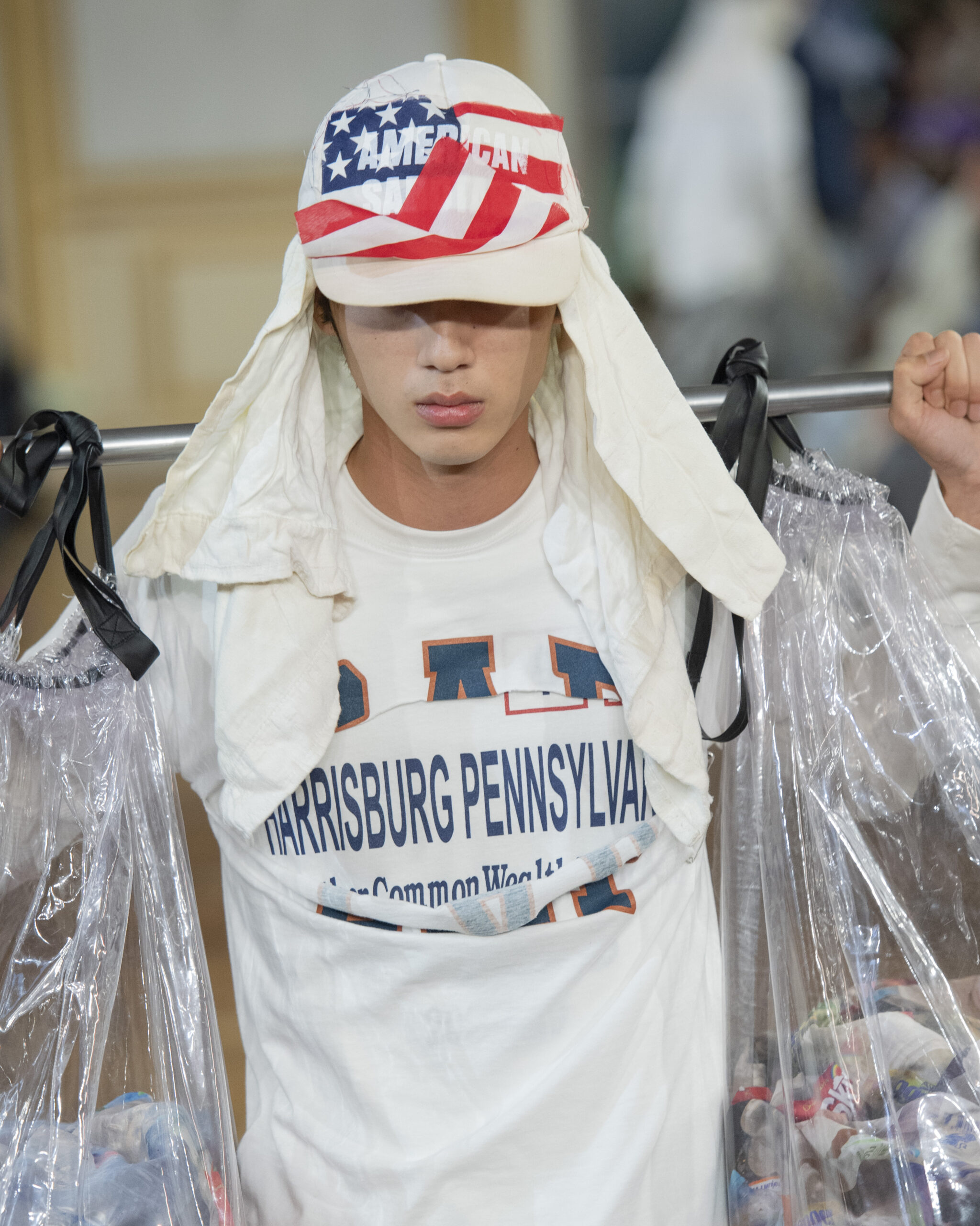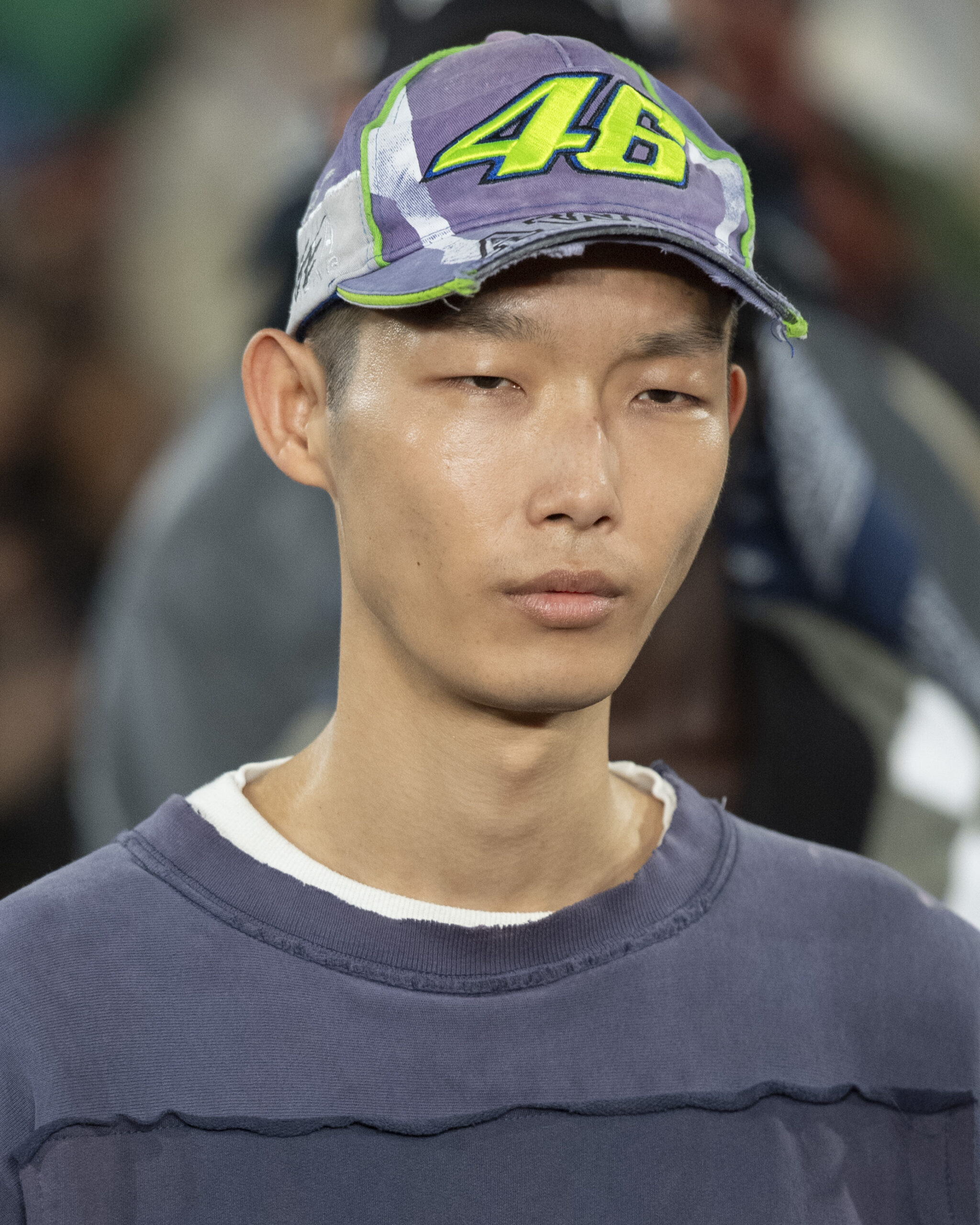 Le décor du défilé, comprenant des sacs poubelles transformés en chaises beanbag issues de la marque de mobilier Hommemade, en collaboration avec Crosby Studios, ajoutait une dimension immersive à cette expérience unique. Le défilé a été rythmé par la bande-son du prochain album d’A$AP Rocky, créant une synergie entre mode et musique.