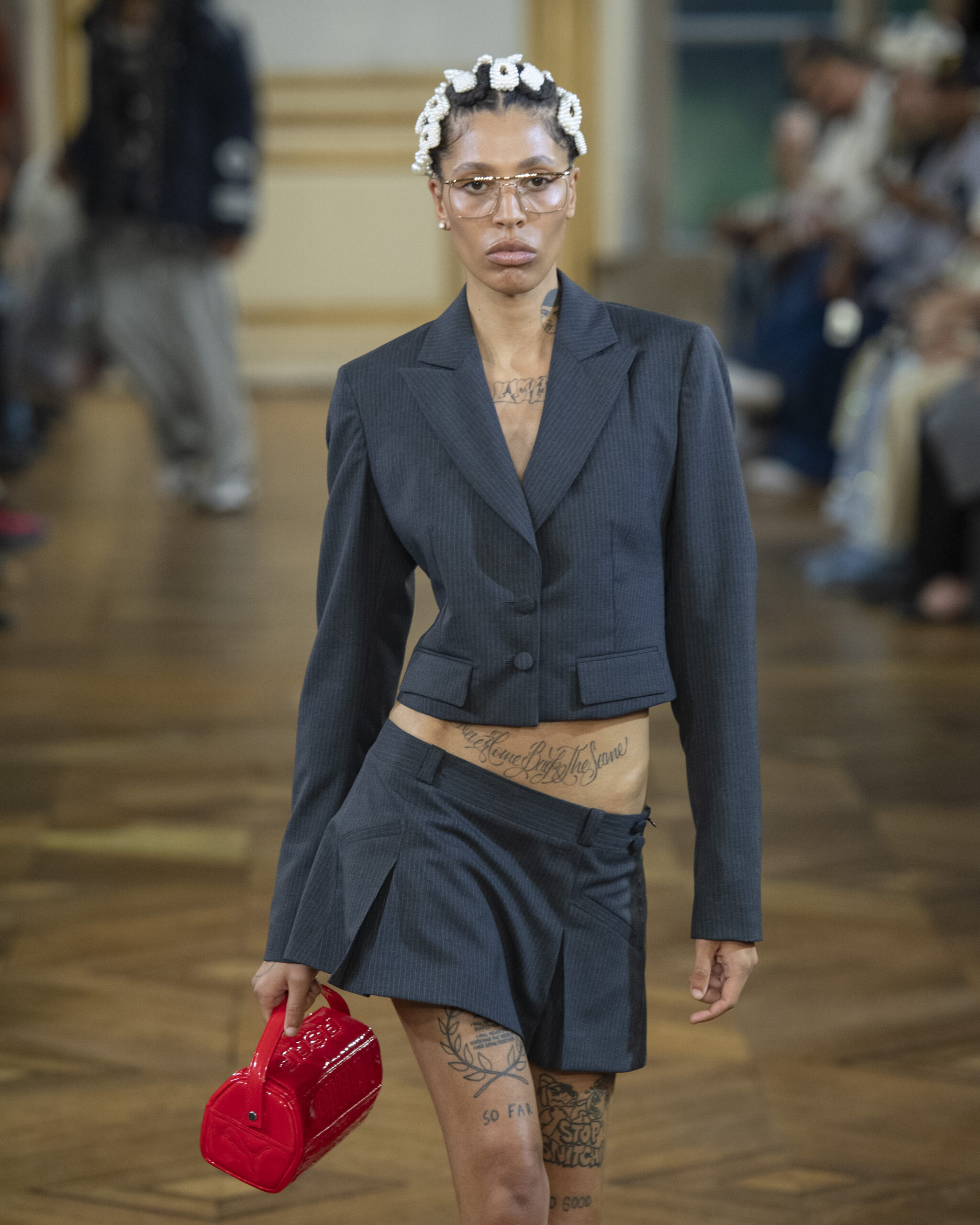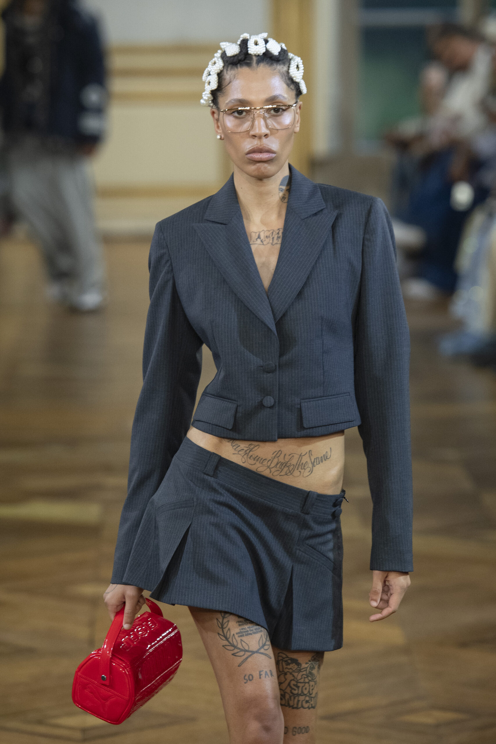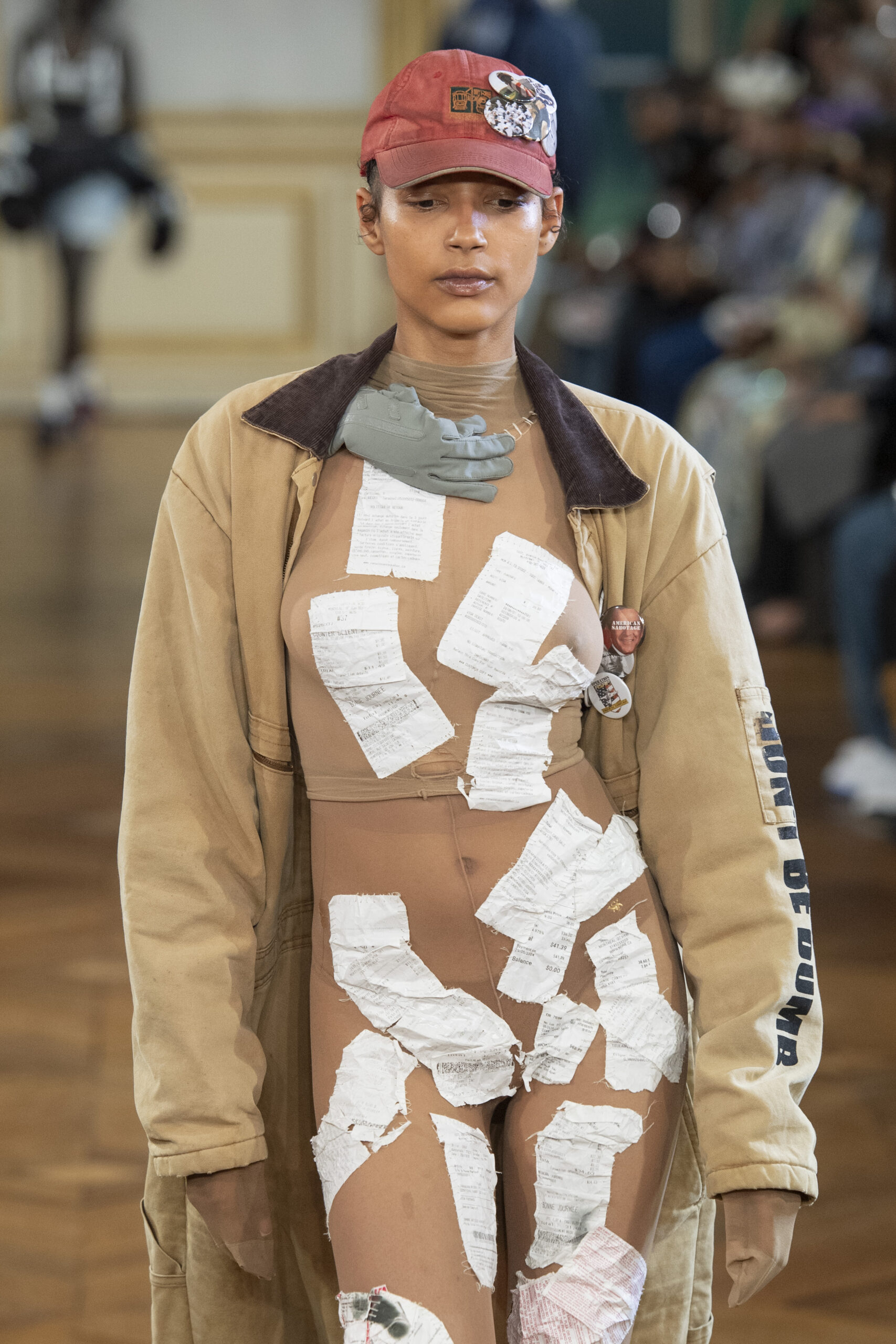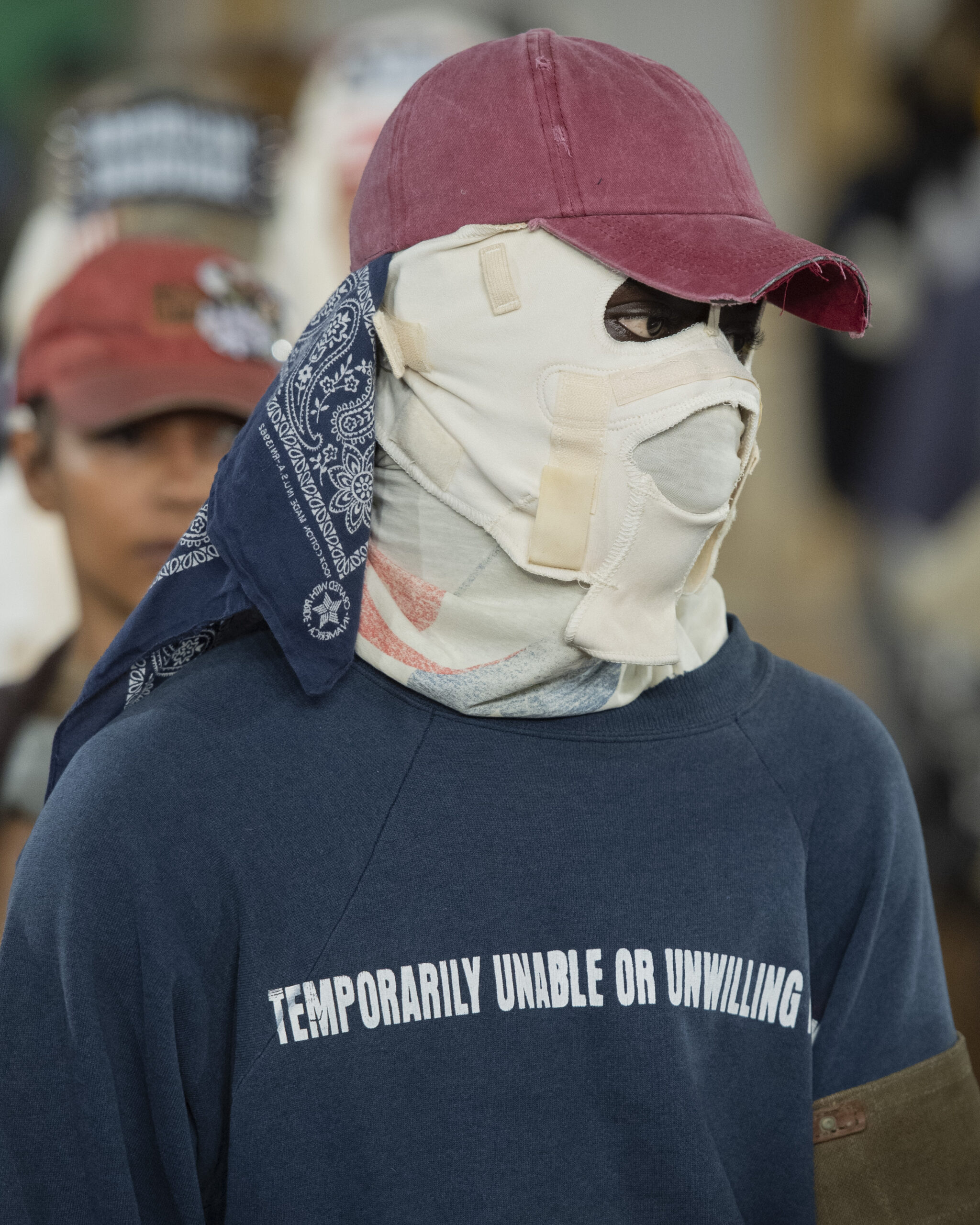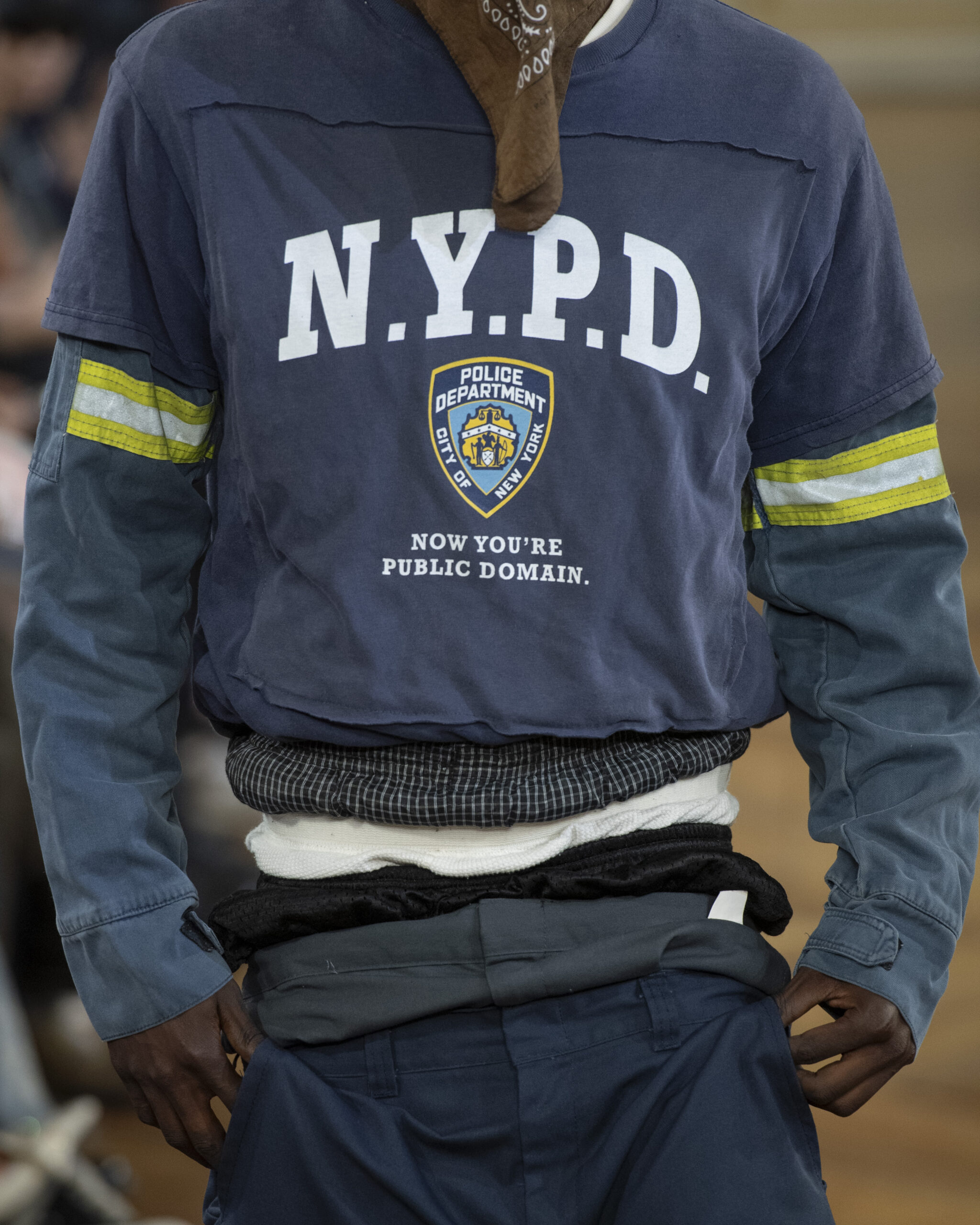 Le décor du défilé, comprenant des sacs poubelles transformés en chaises beanbag issues de la marque de mobilier Hommemade, en collaboration avec Crosby Studios, ajoutait une dimension immersive à cette expérience unique. Le défilé a été rythmé par la bande-son du prochain album d’A$AP Rocky, créant une synergie entre mode et musique.