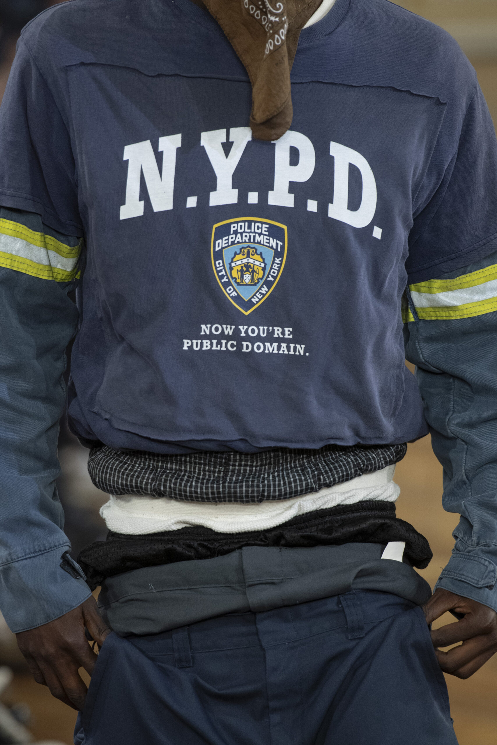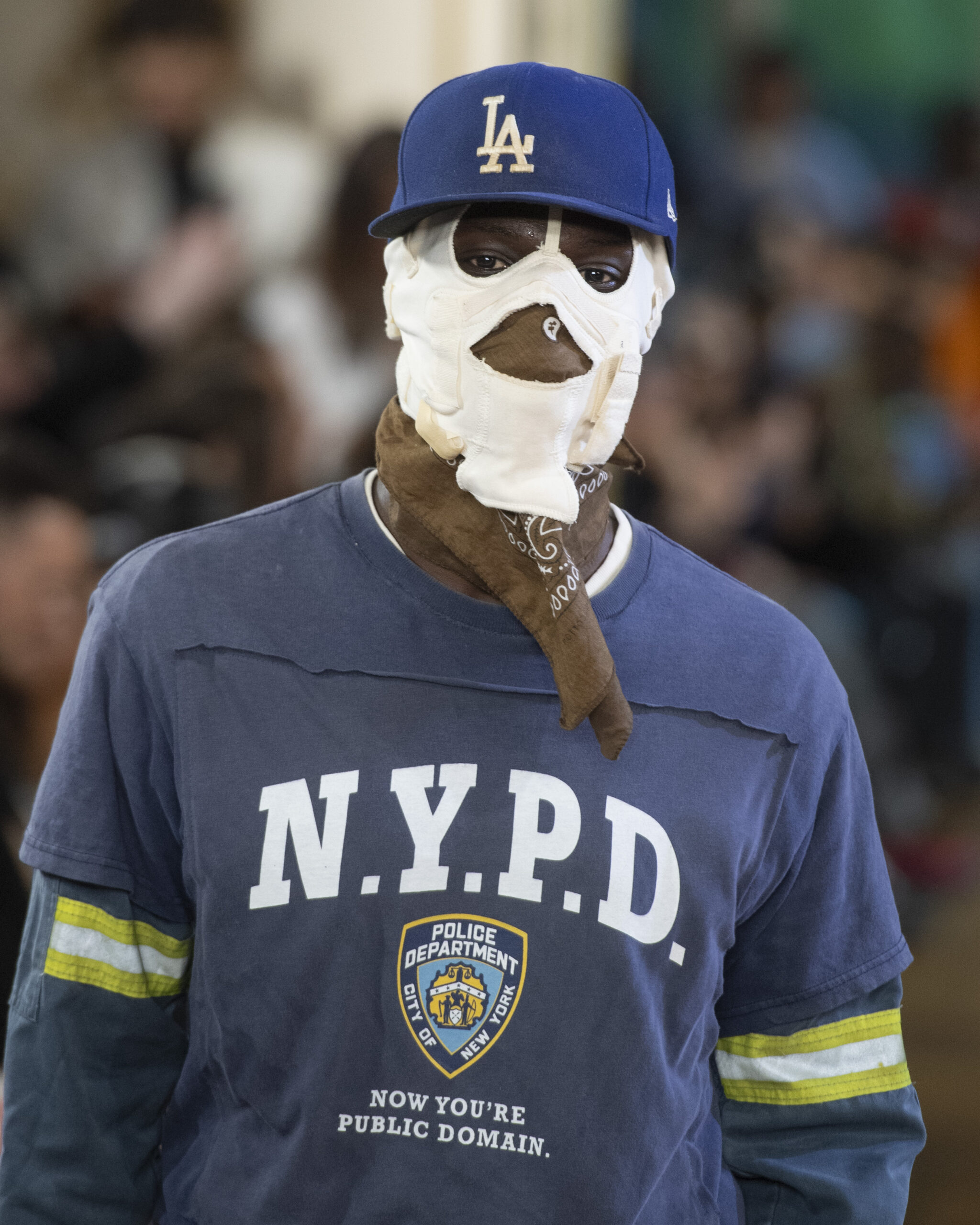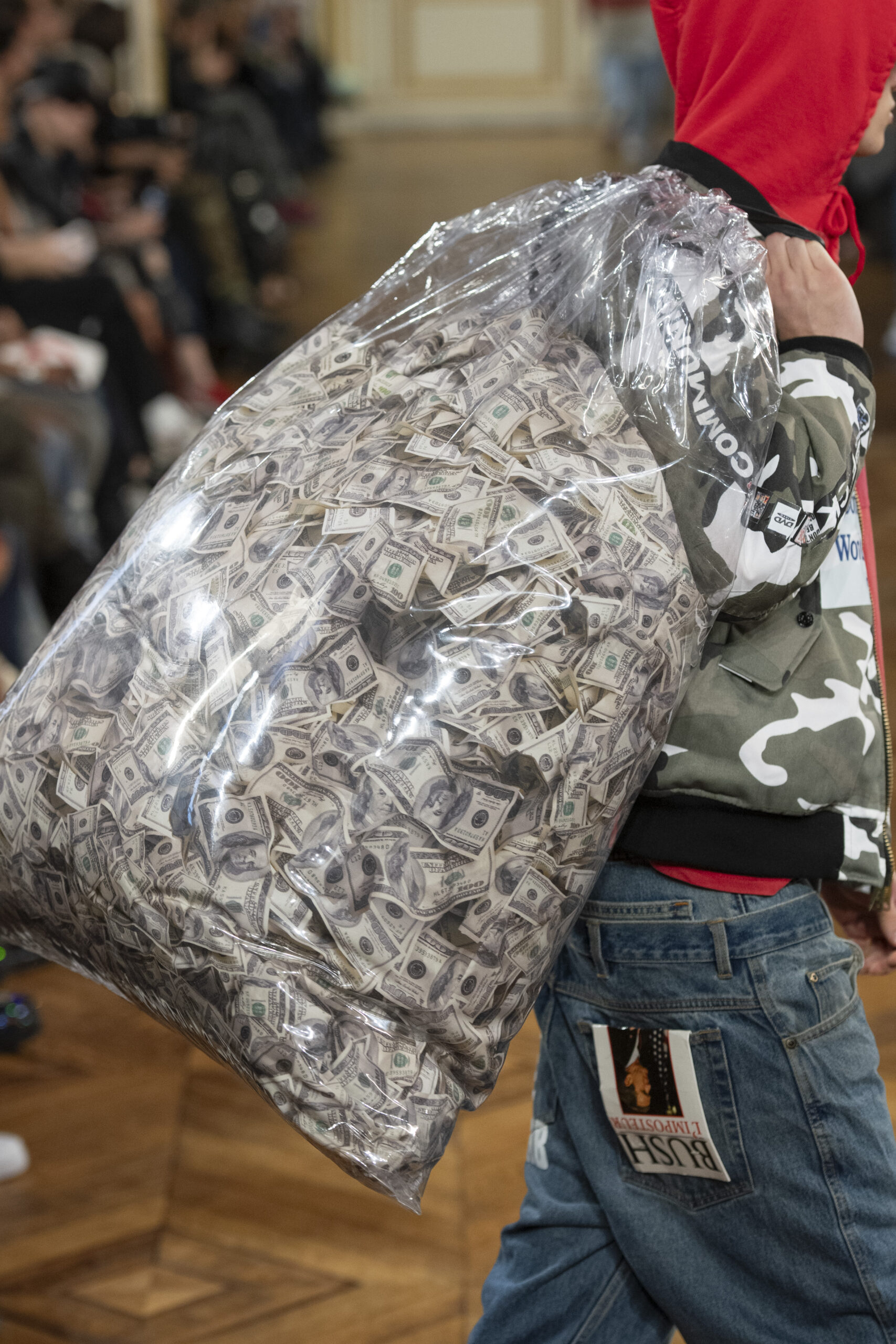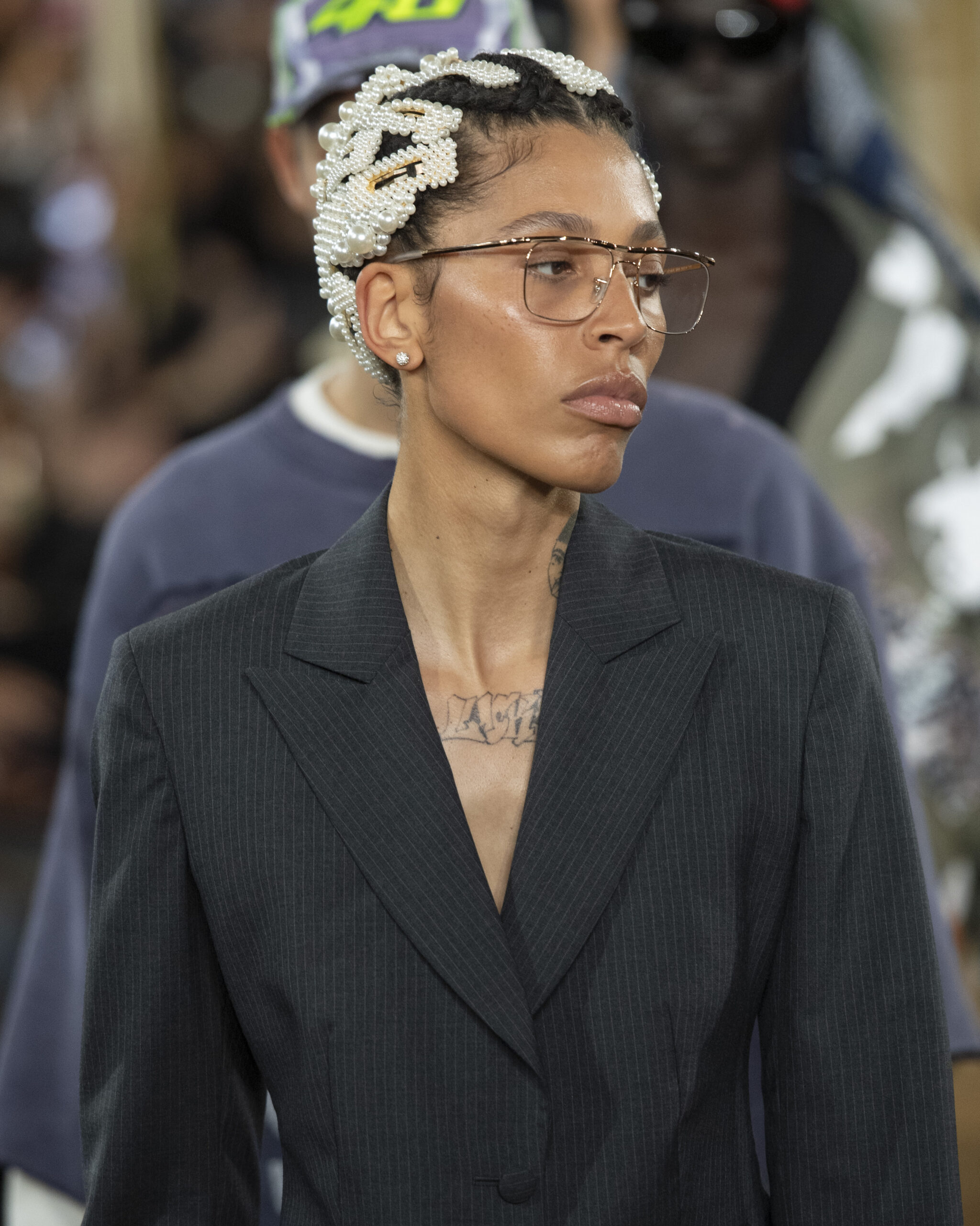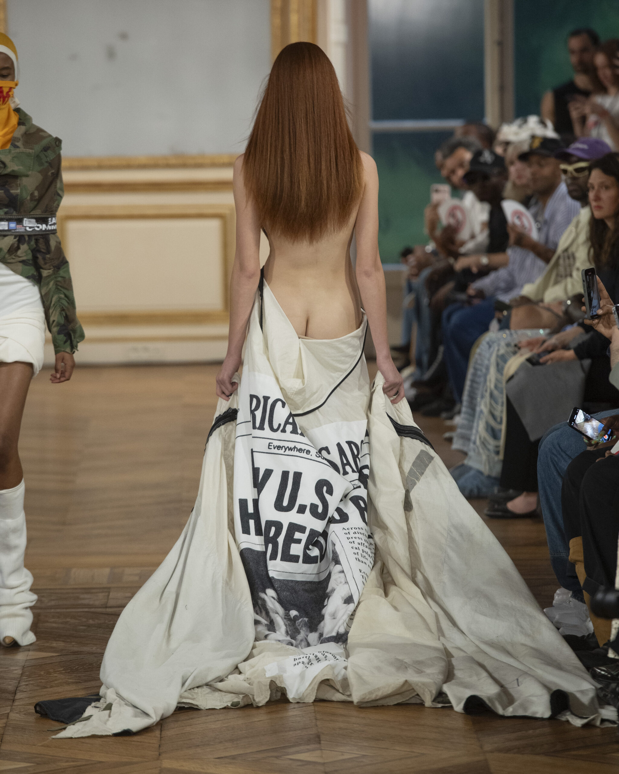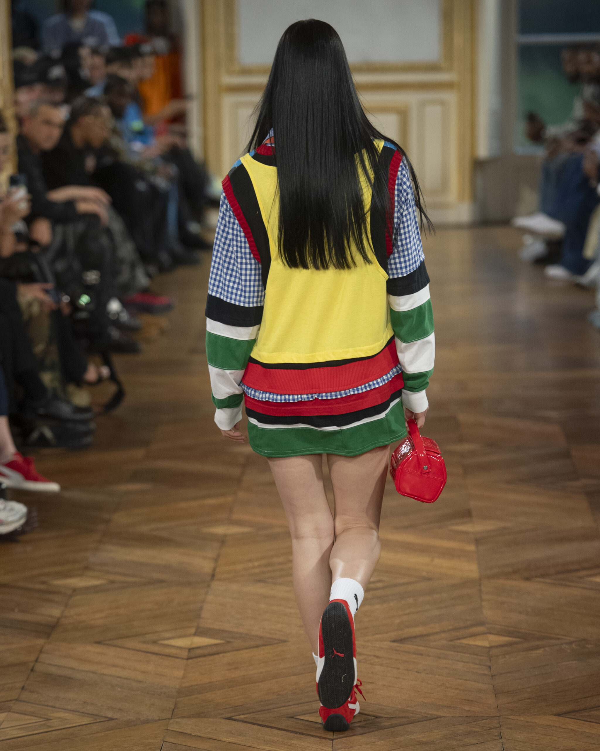 Le décor du défilé, comprenant des sacs poubelles transformés en chaises beanbag issues de la marque de mobilier Hommemade, en collaboration avec Crosby Studios, ajoutait une dimension immersive à cette expérience unique. Le défilé a été rythmé par la bande-son du prochain album d’A$AP Rocky, créant une synergie entre mode et musique.