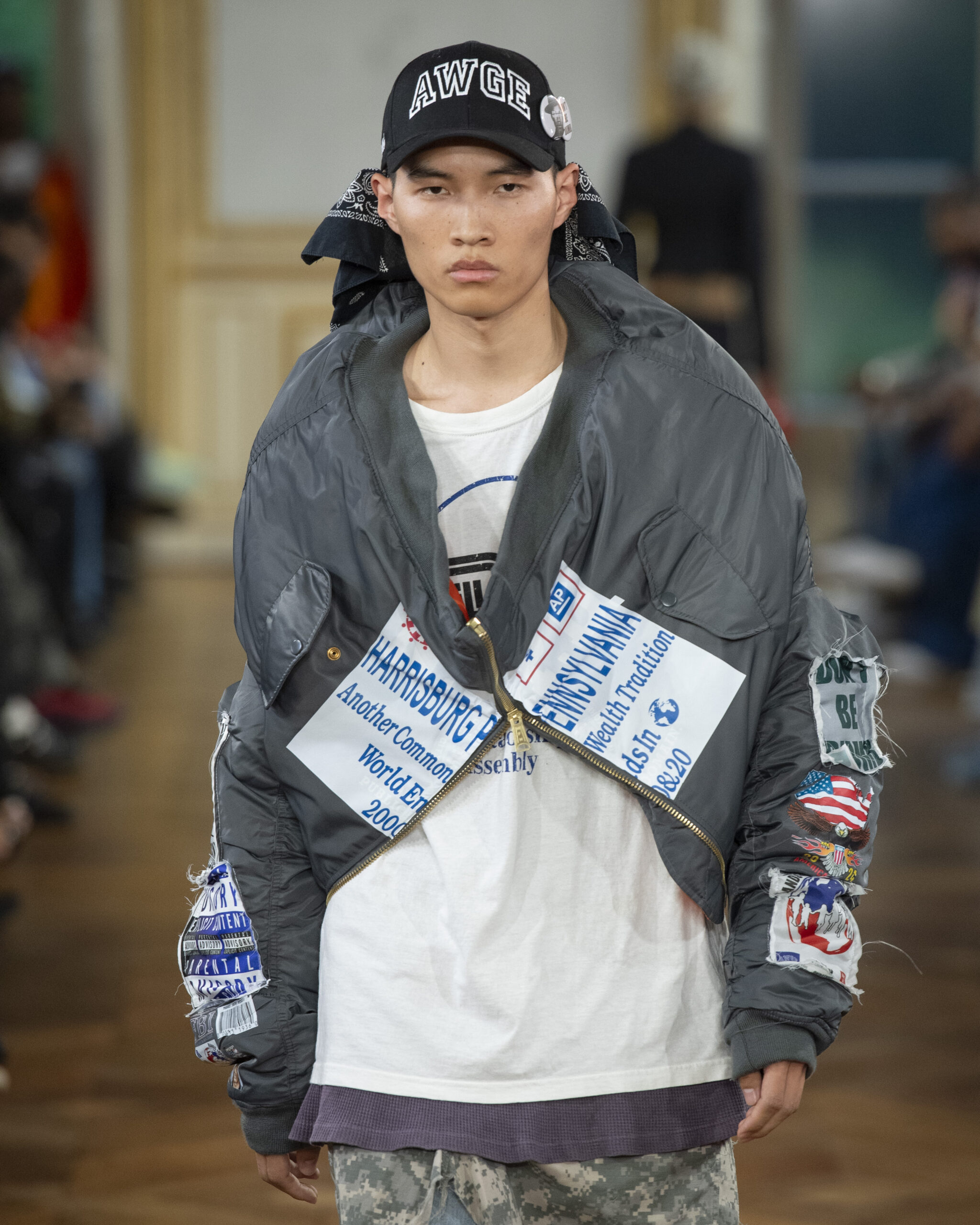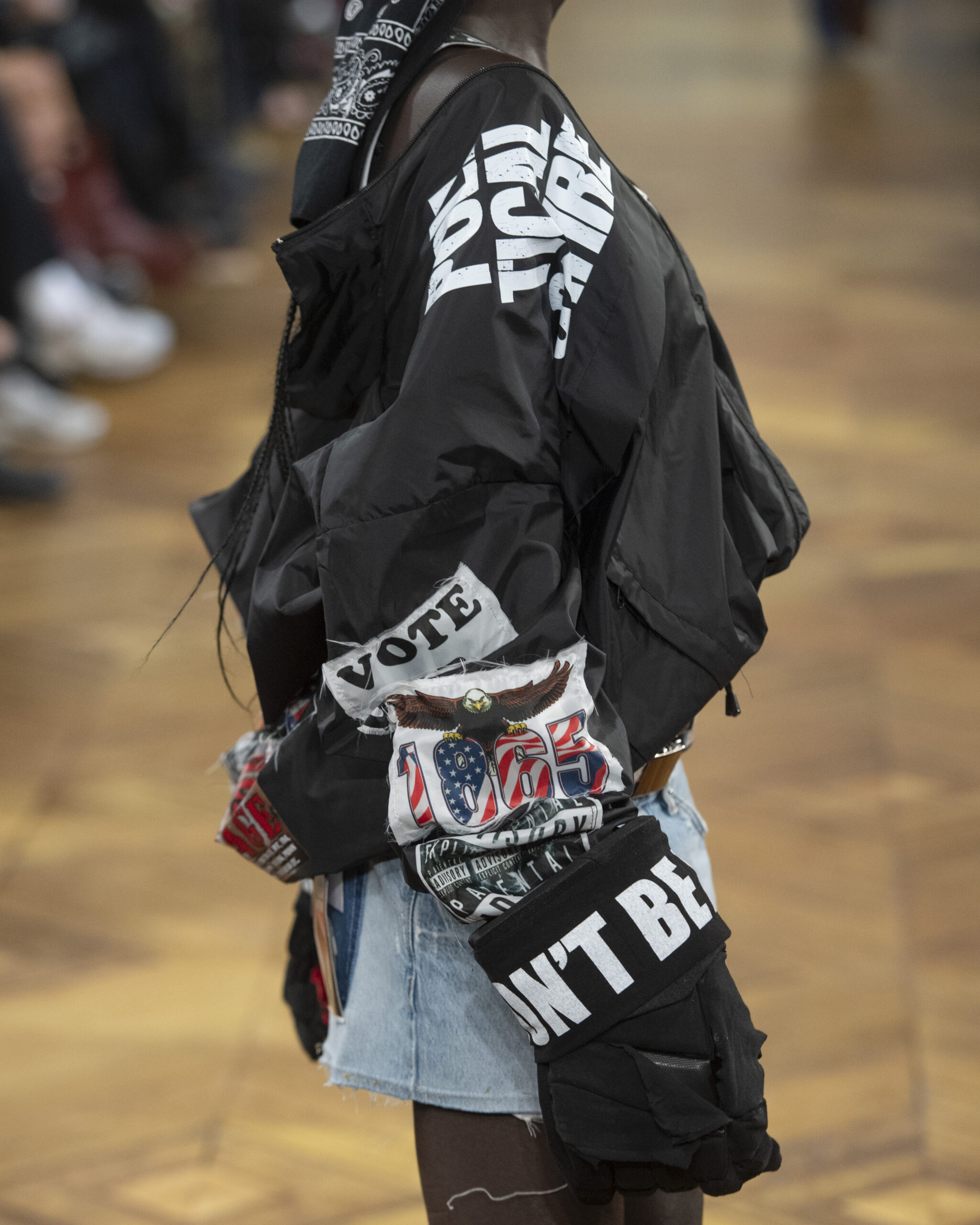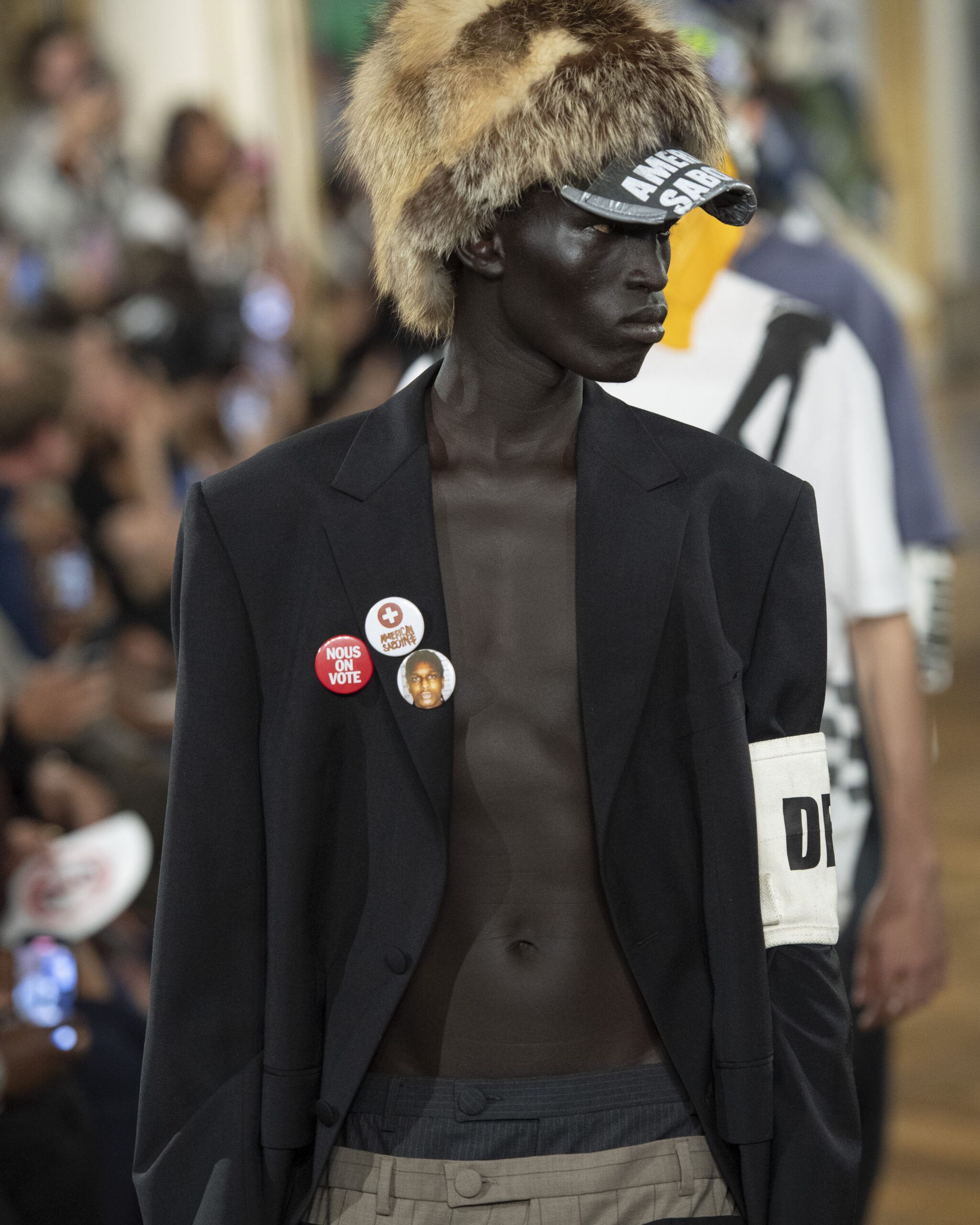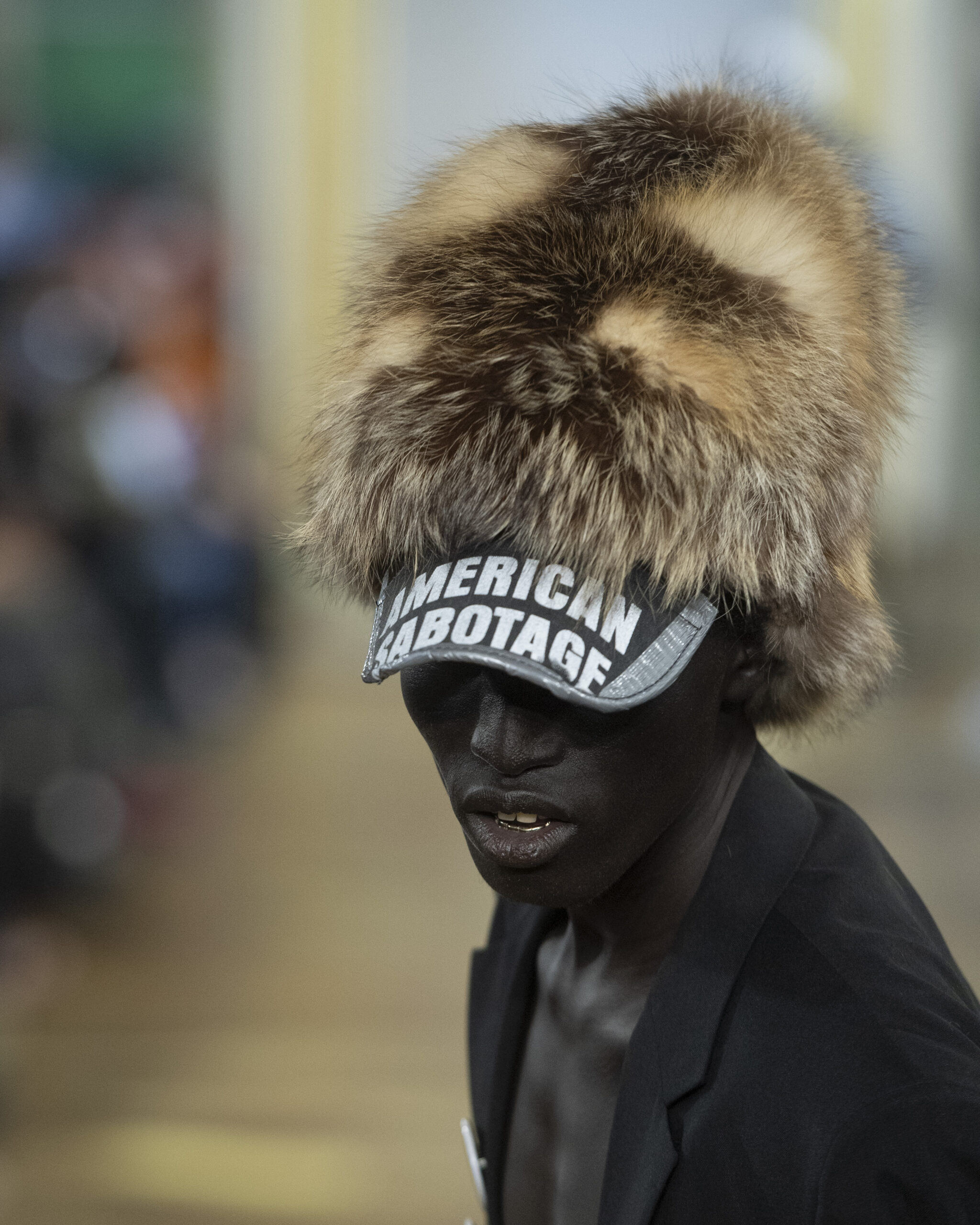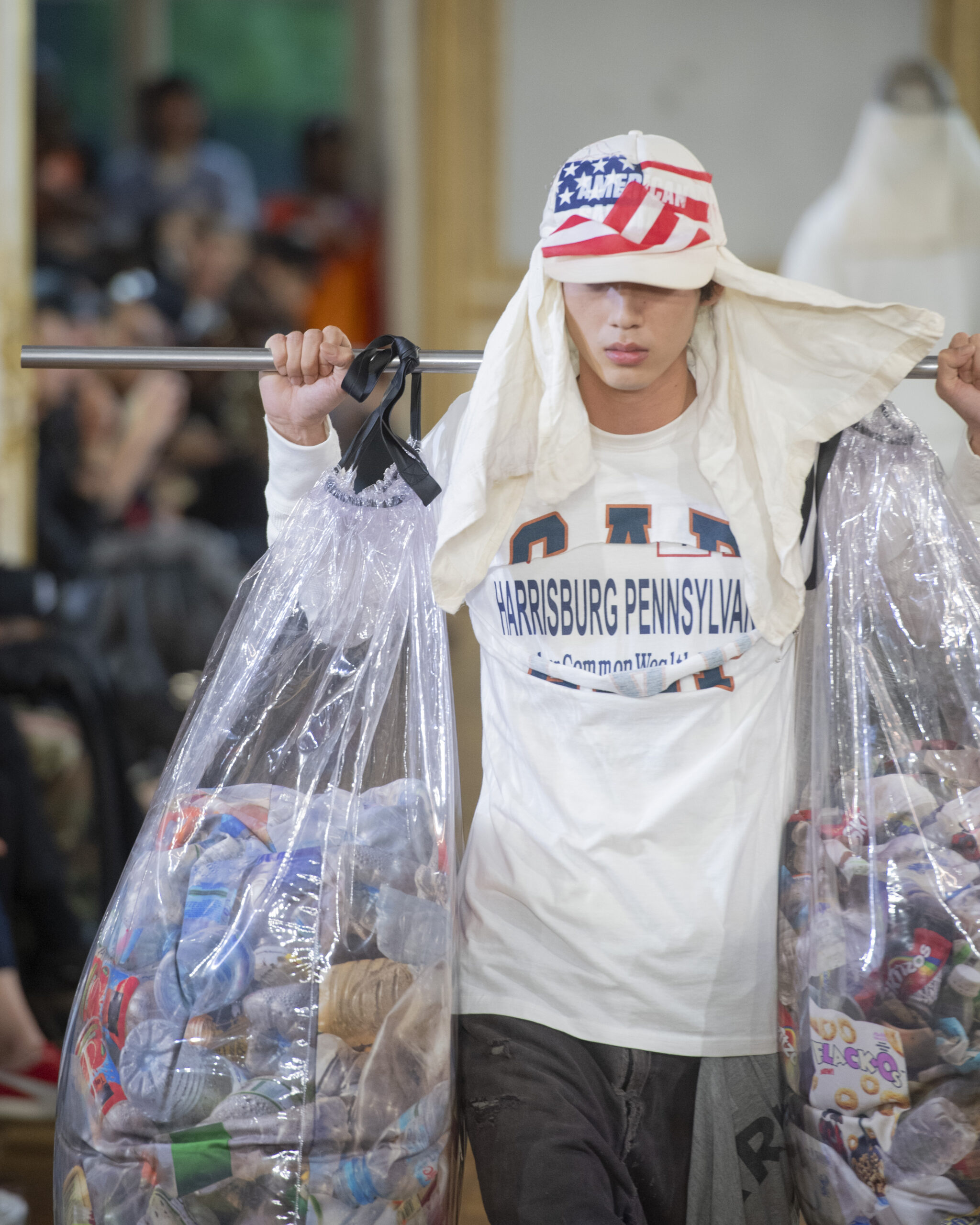 Le décor du défilé, comprenant des sacs poubelles transformés en chaises beanbag issues de la marque de mobilier Hommemade, en collaboration avec Crosby Studios, ajoutait une dimension immersive à cette expérience unique. Le défilé a été rythmé par la bande-son du prochain album d’A$AP Rocky, créant une synergie entre mode et musique.