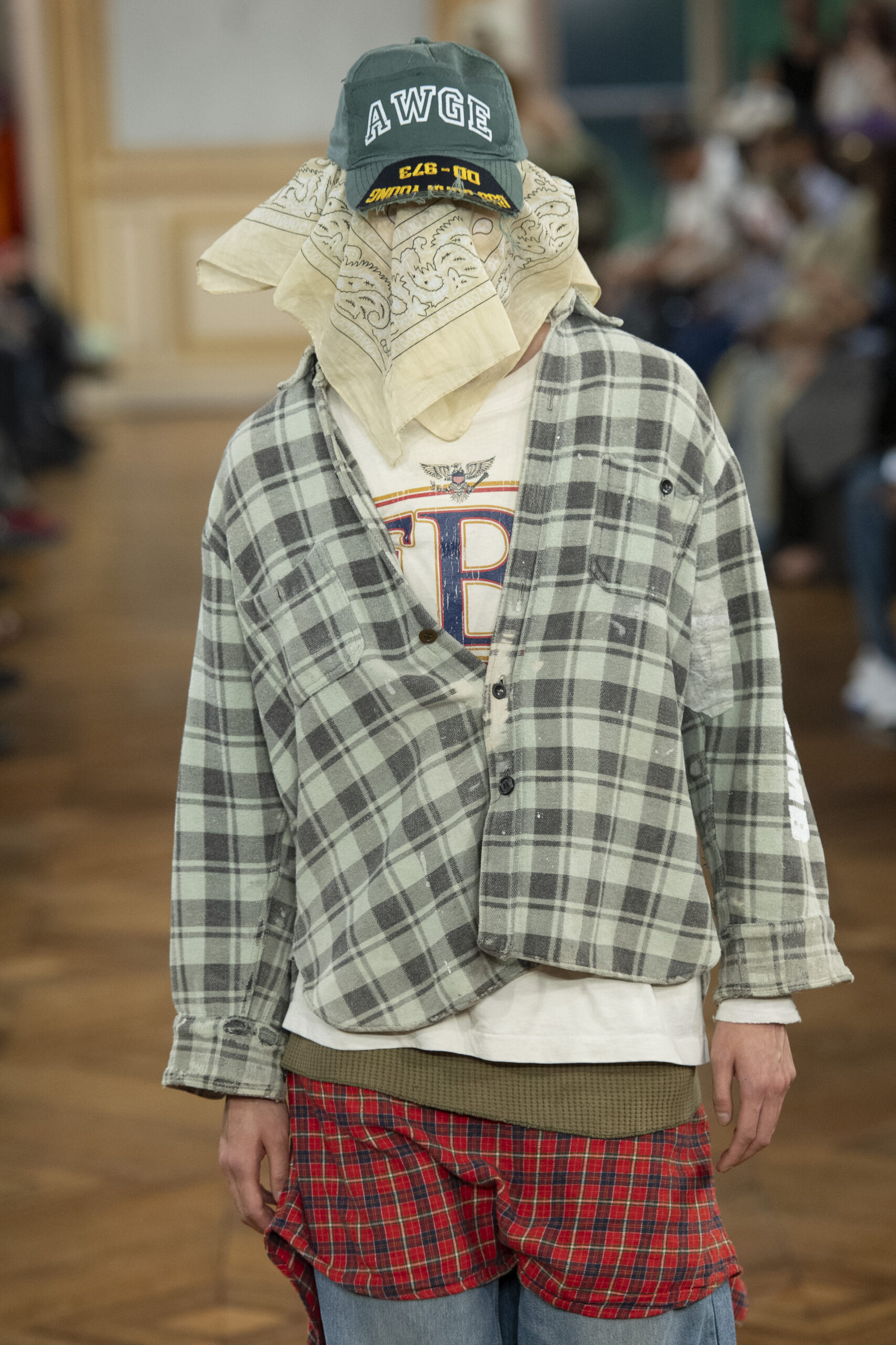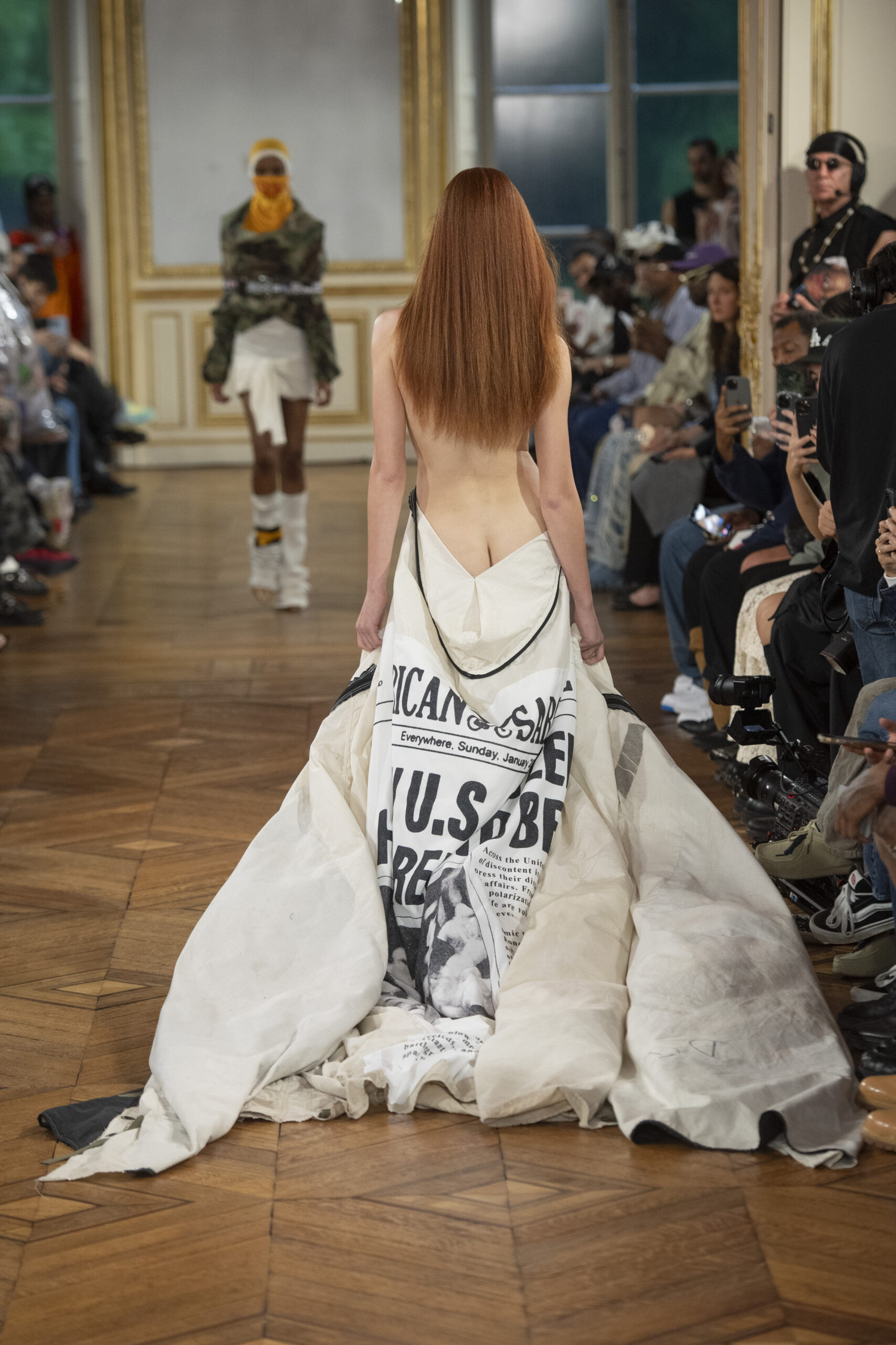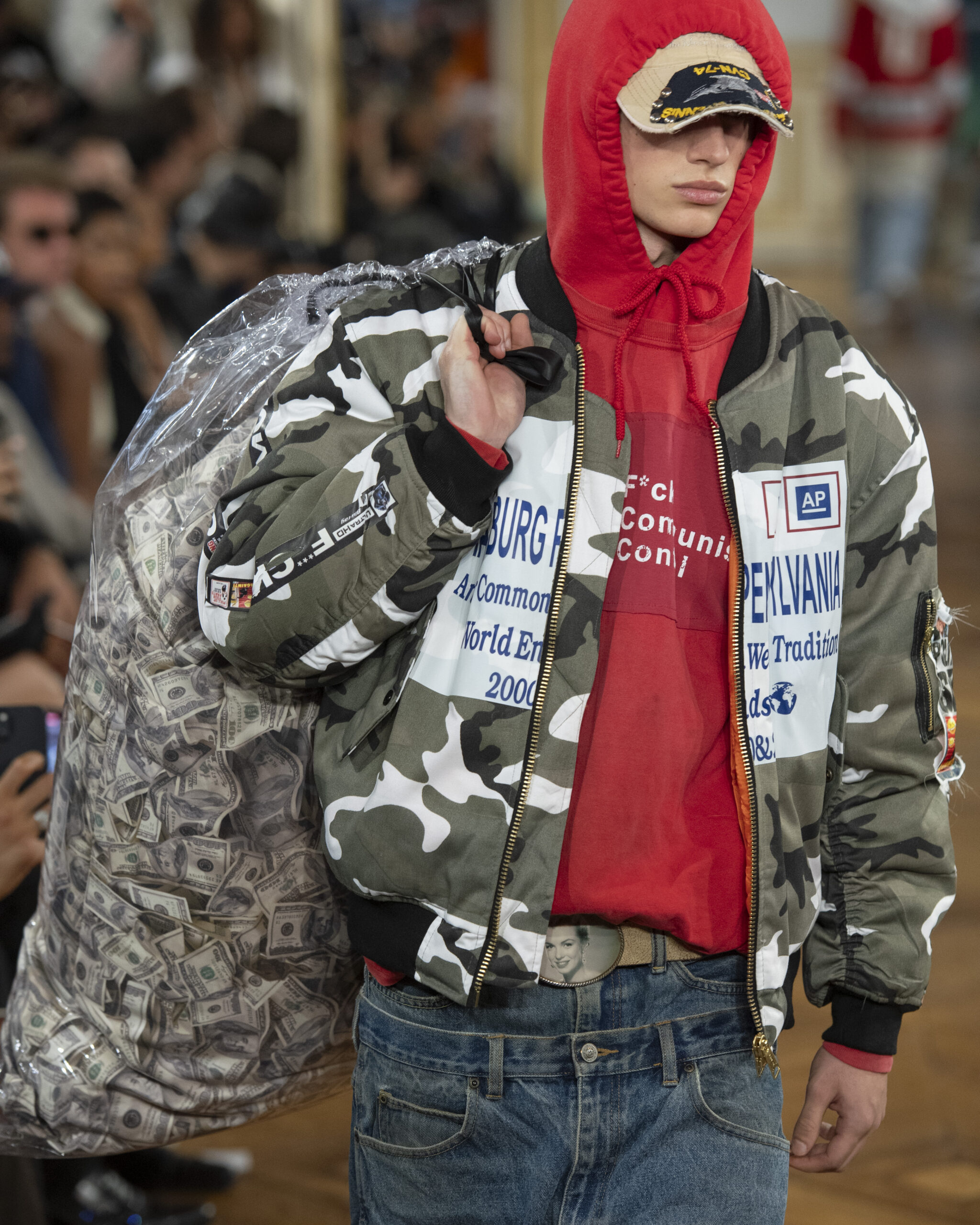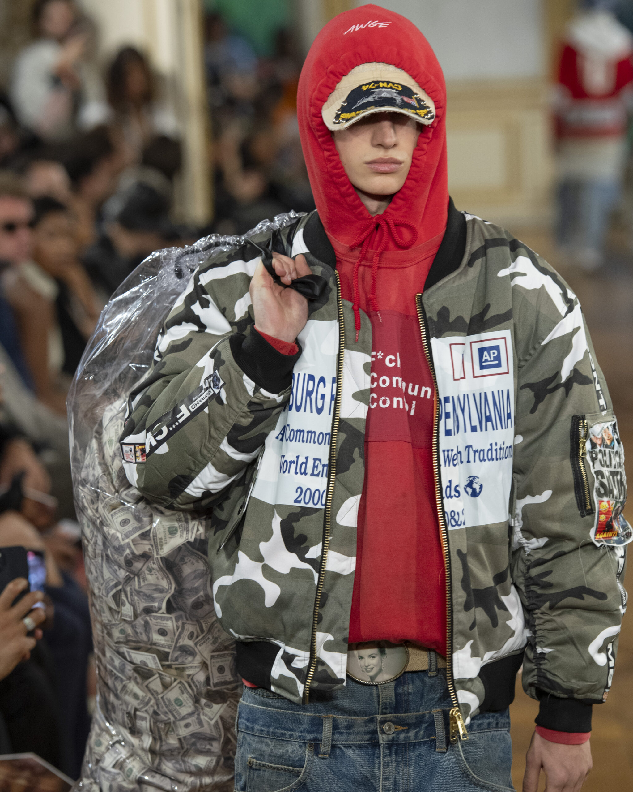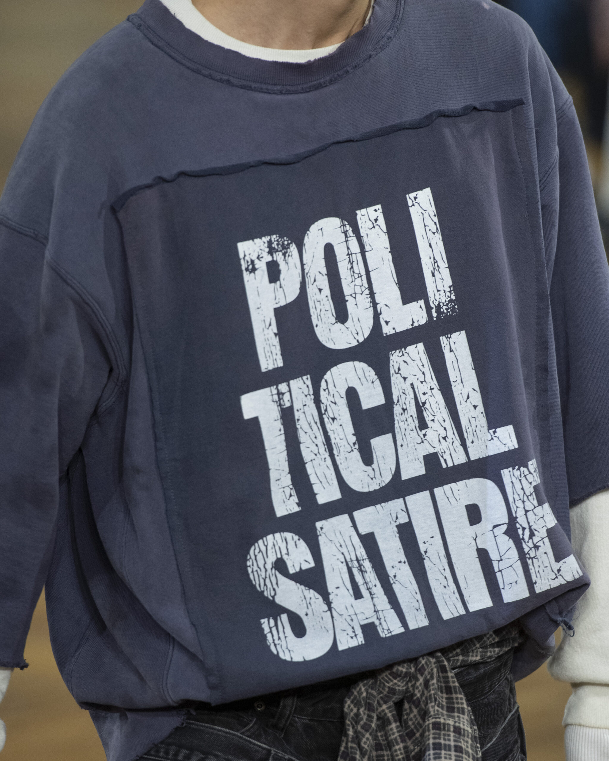 Le décor du défilé, comprenant des sacs poubelles transformés en chaises beanbag issues de la marque de mobilier Hommemade, en collaboration avec Crosby Studios, ajoutait une dimension immersive à cette expérience unique. Le défilé a été rythmé par la bande-son du prochain album d’A$AP Rocky, créant une synergie entre mode et musique.