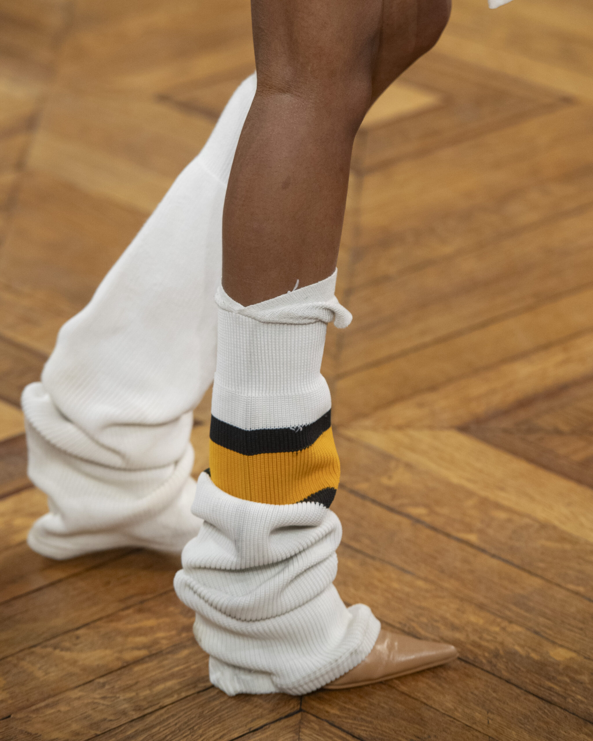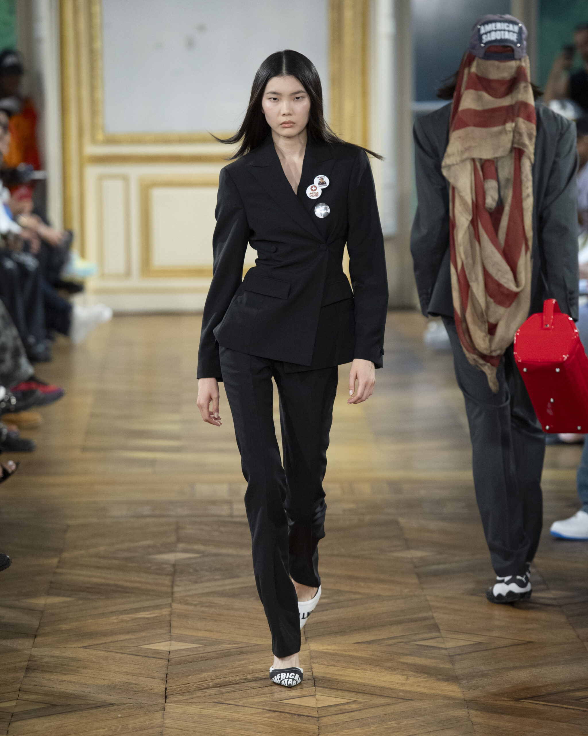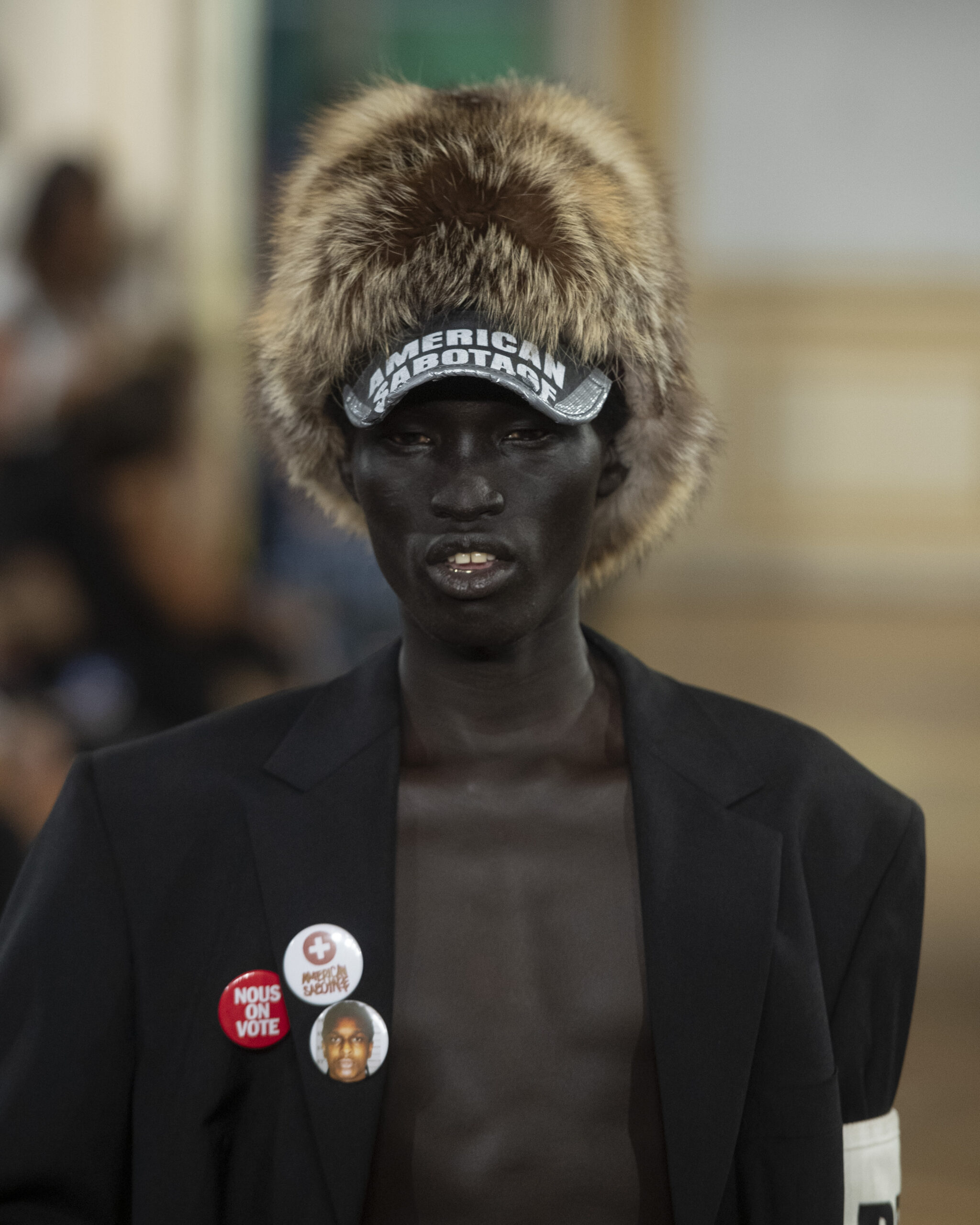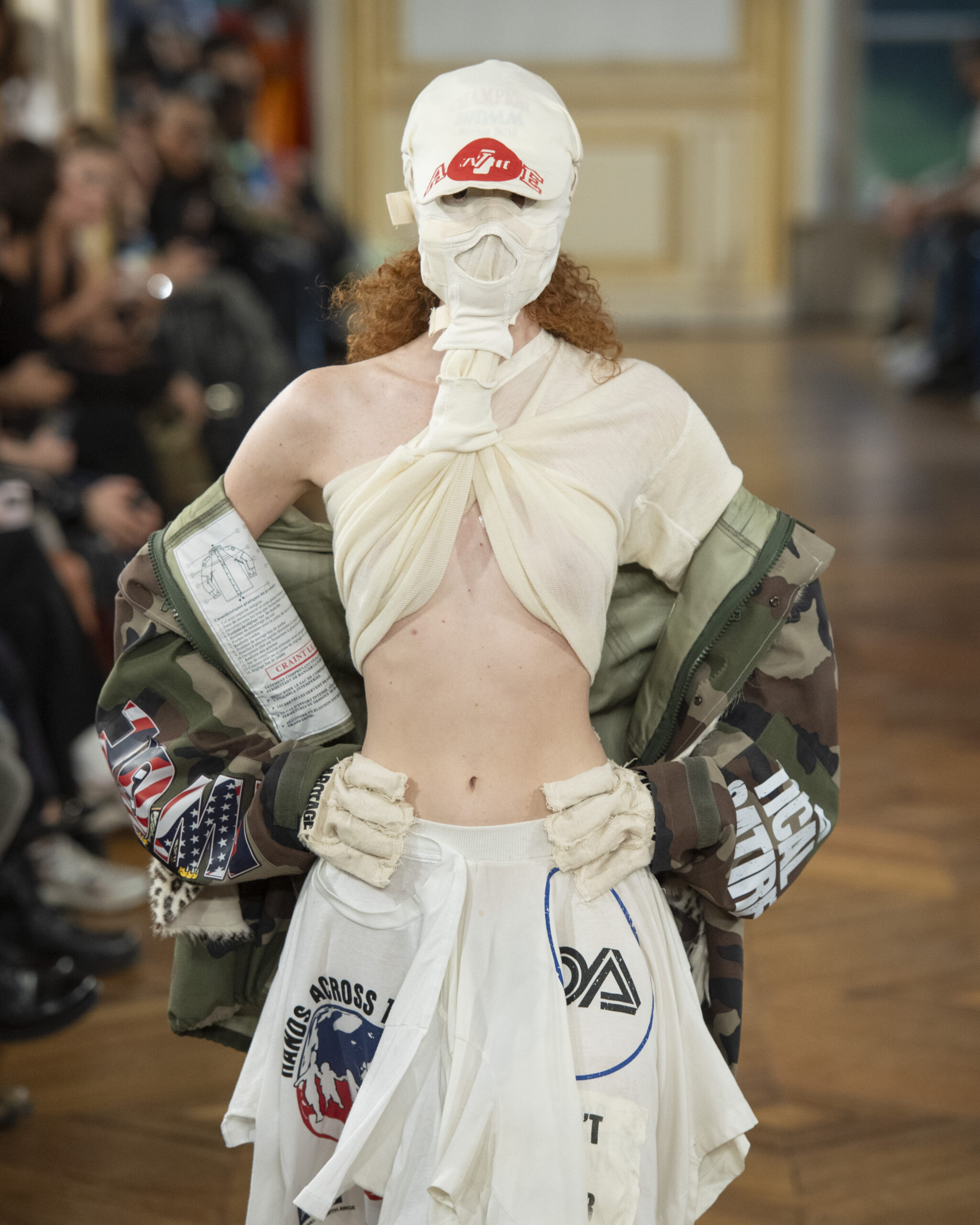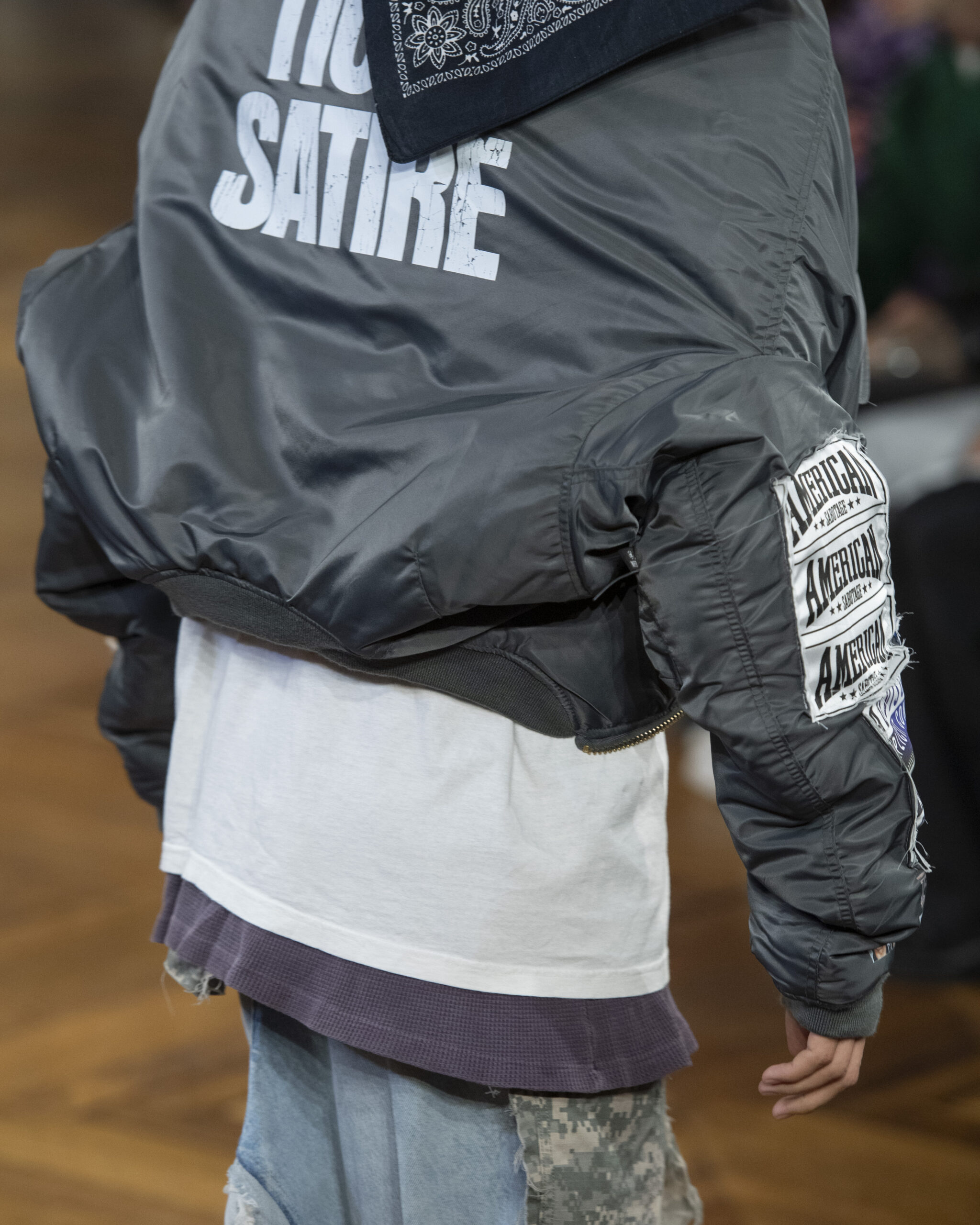 Le décor du défilé, comprenant des sacs poubelles transformés en chaises beanbag issues de la marque de mobilier Hommemade, en collaboration avec Crosby Studios, ajoutait une dimension immersive à cette expérience unique. Le défilé a été rythmé par la bande-son du prochain album d’A$AP Rocky, créant une synergie entre mode et musique.