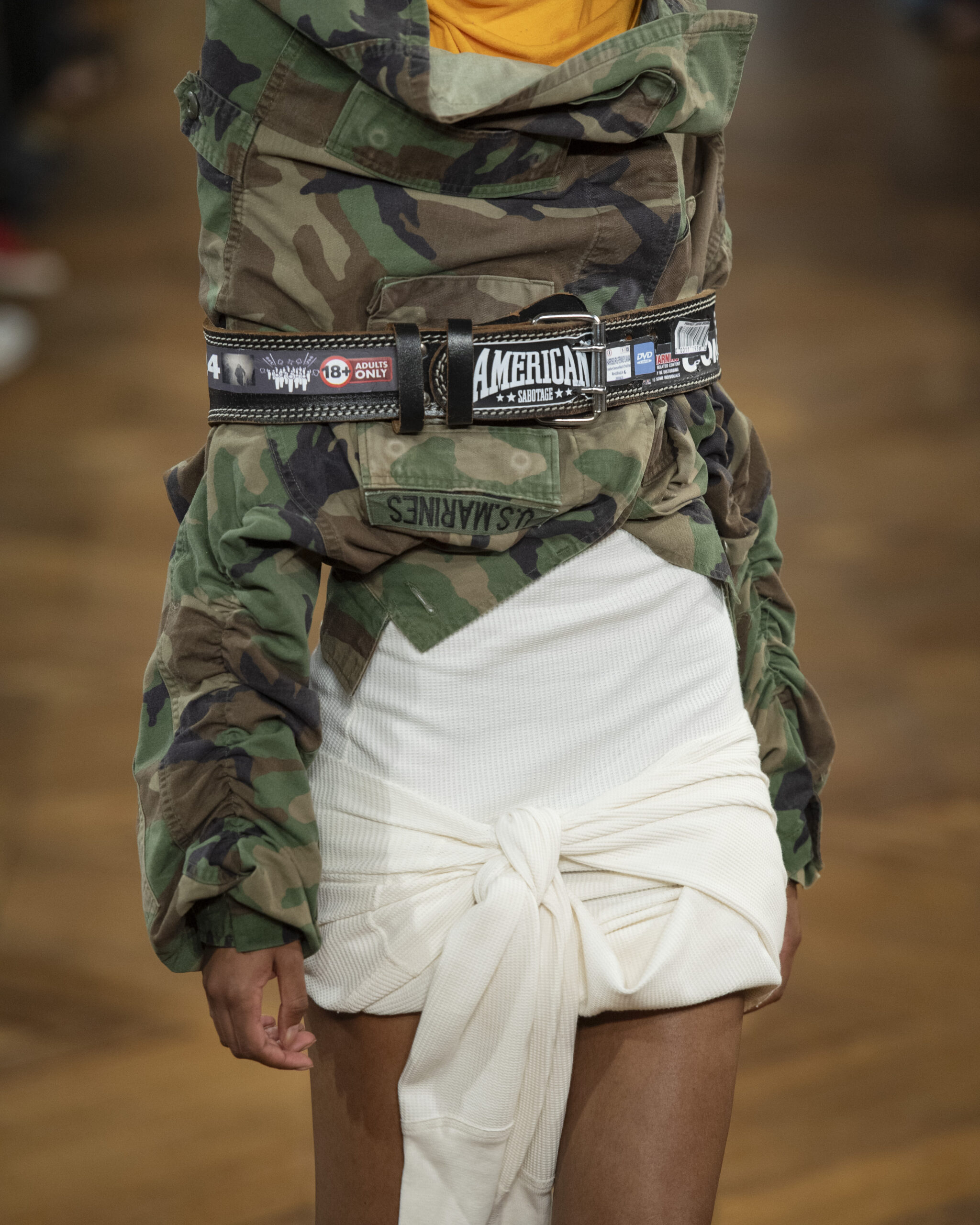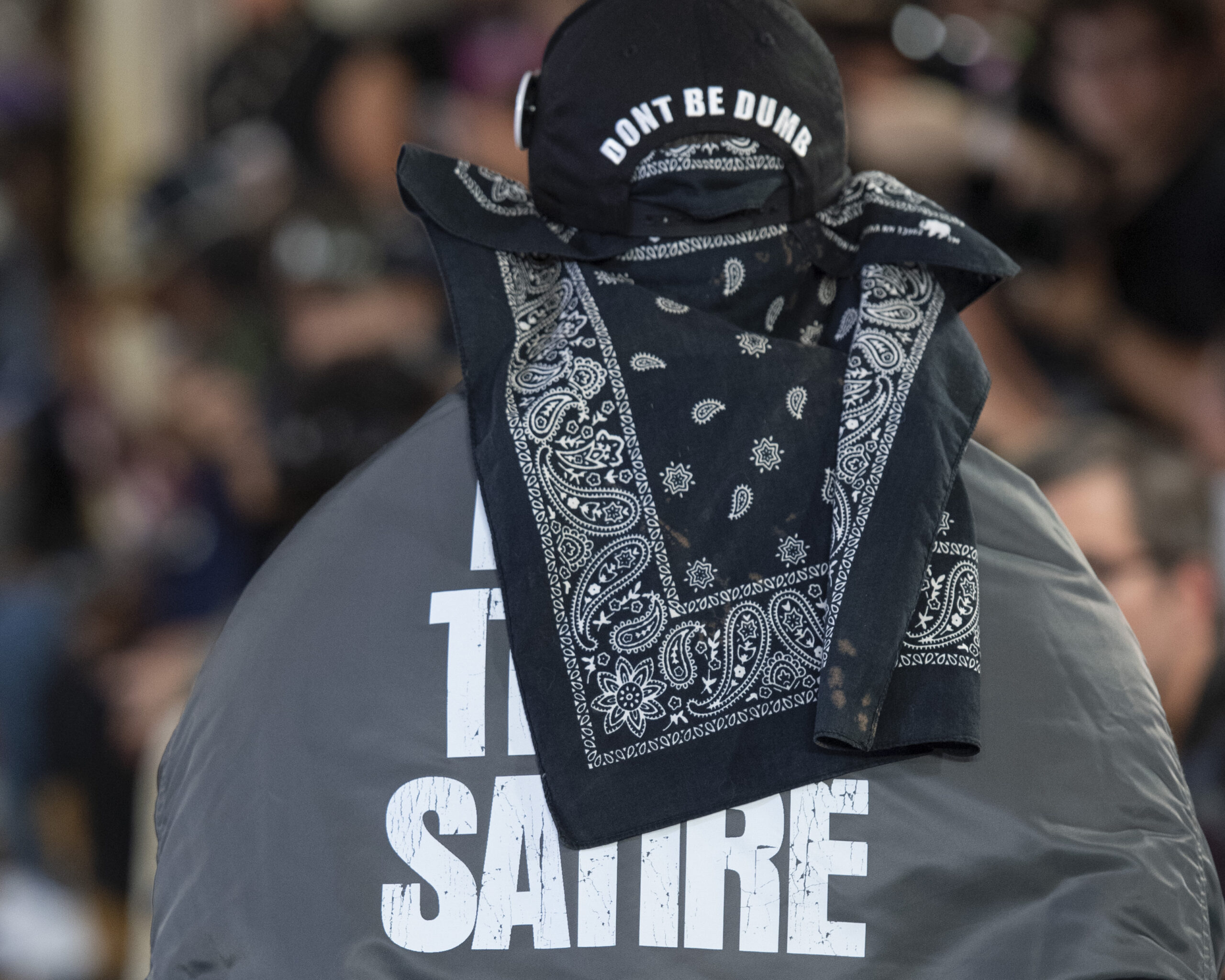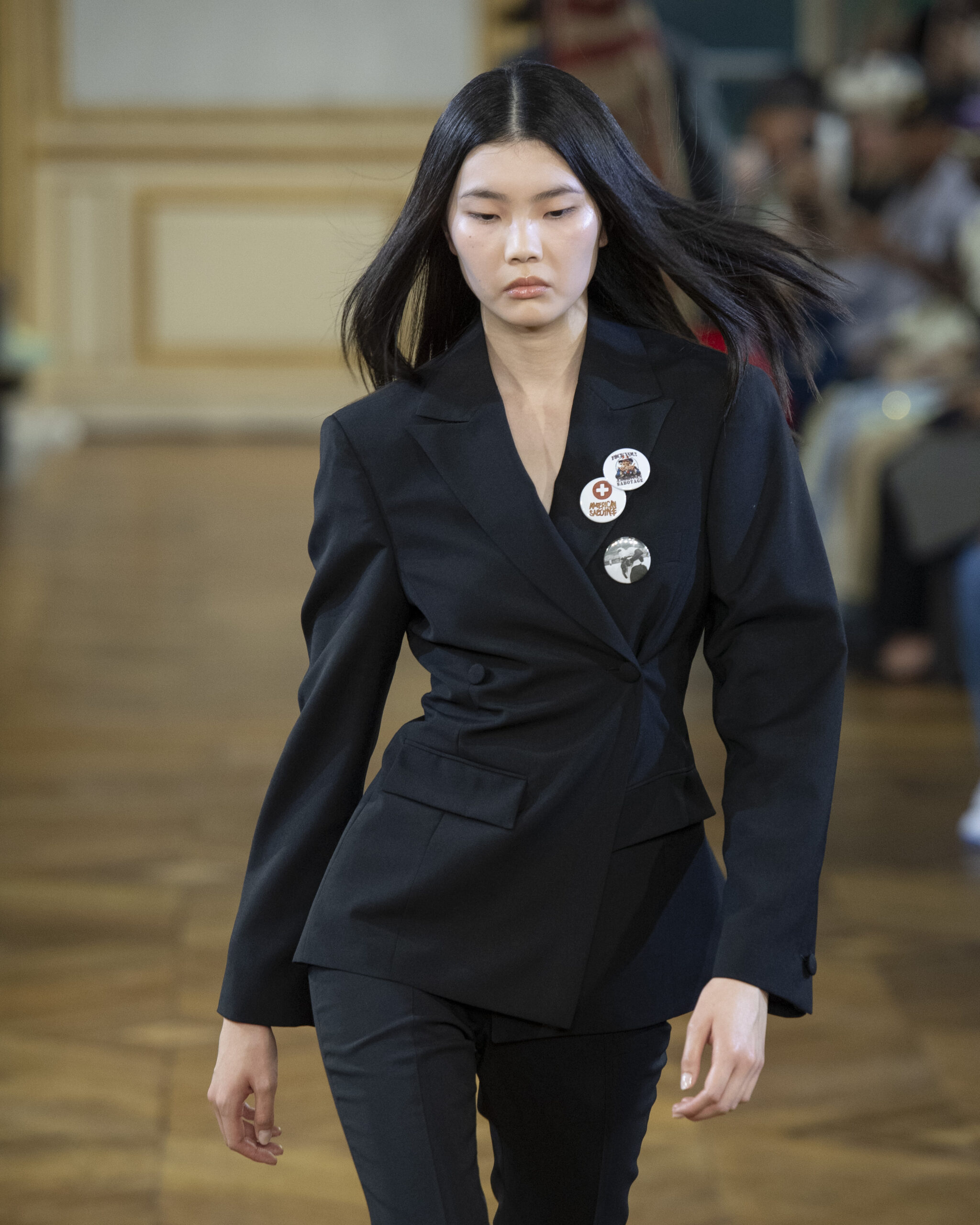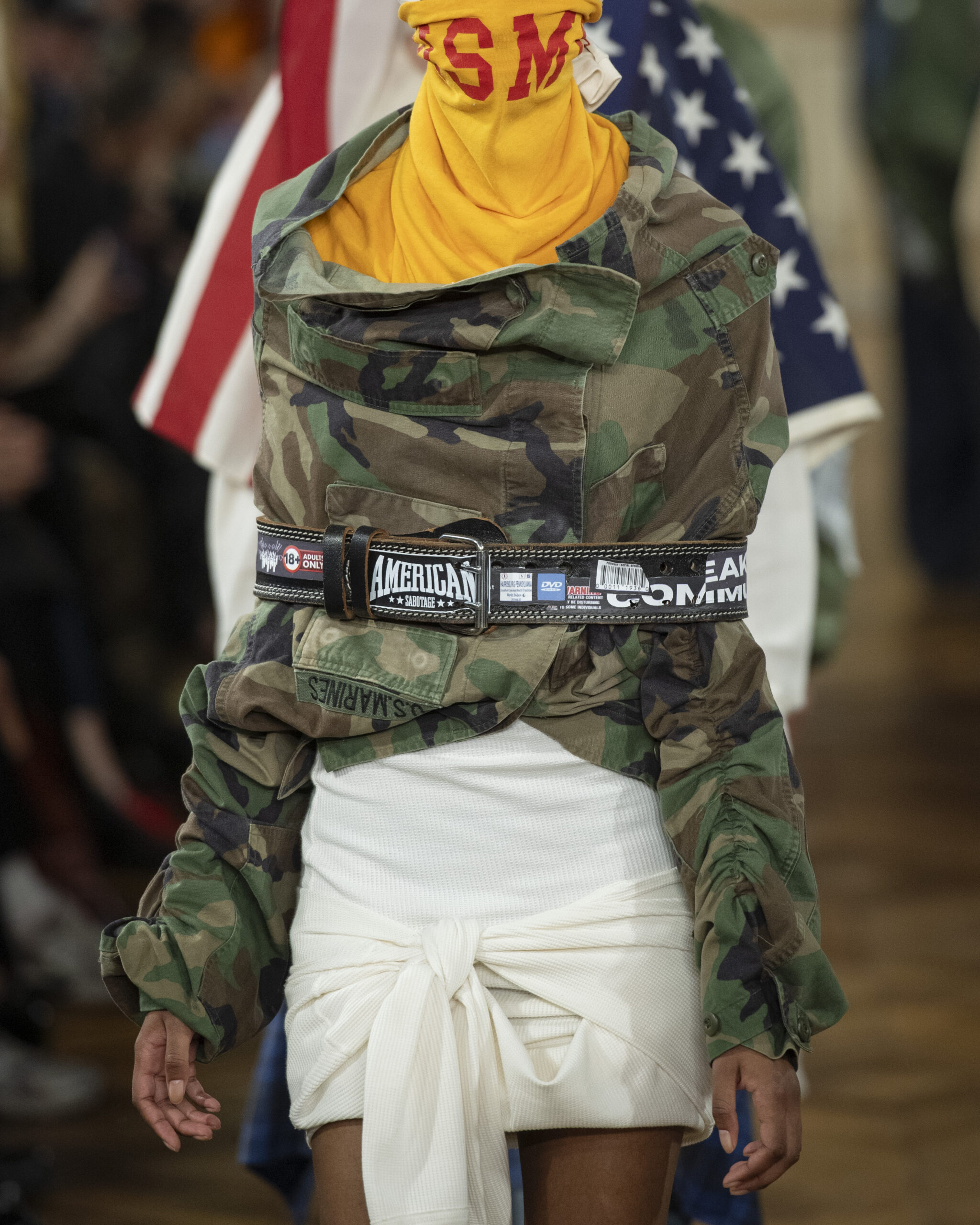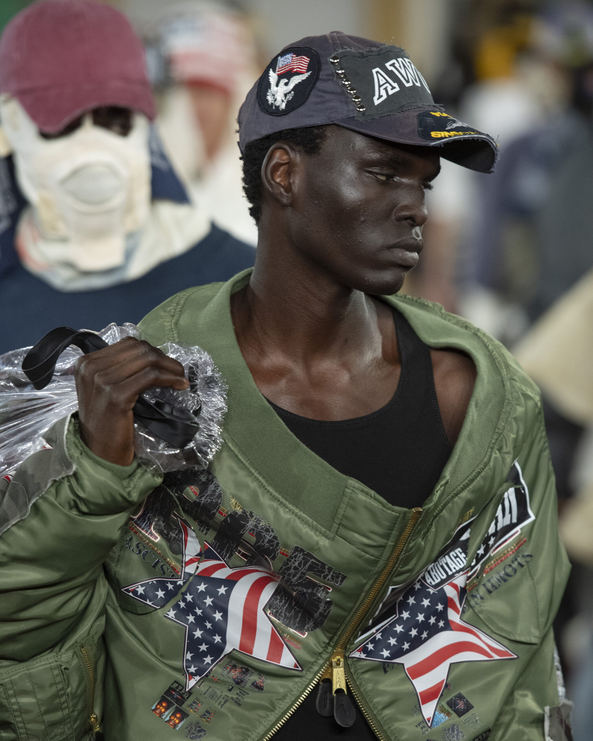 Le décor du défilé, comprenant des sacs poubelles transformés en chaises beanbag issues de la marque de mobilier Hommemade, en collaboration avec Crosby Studios, ajoutait une dimension immersive à cette expérience unique. Le défilé a été rythmé par la bande-son du prochain album d’A$AP Rocky, créant une synergie entre mode et musique.