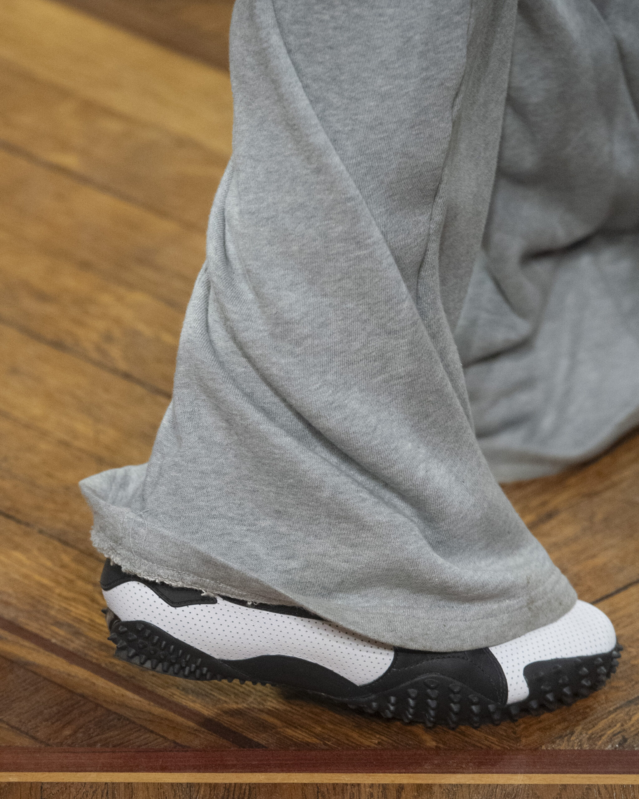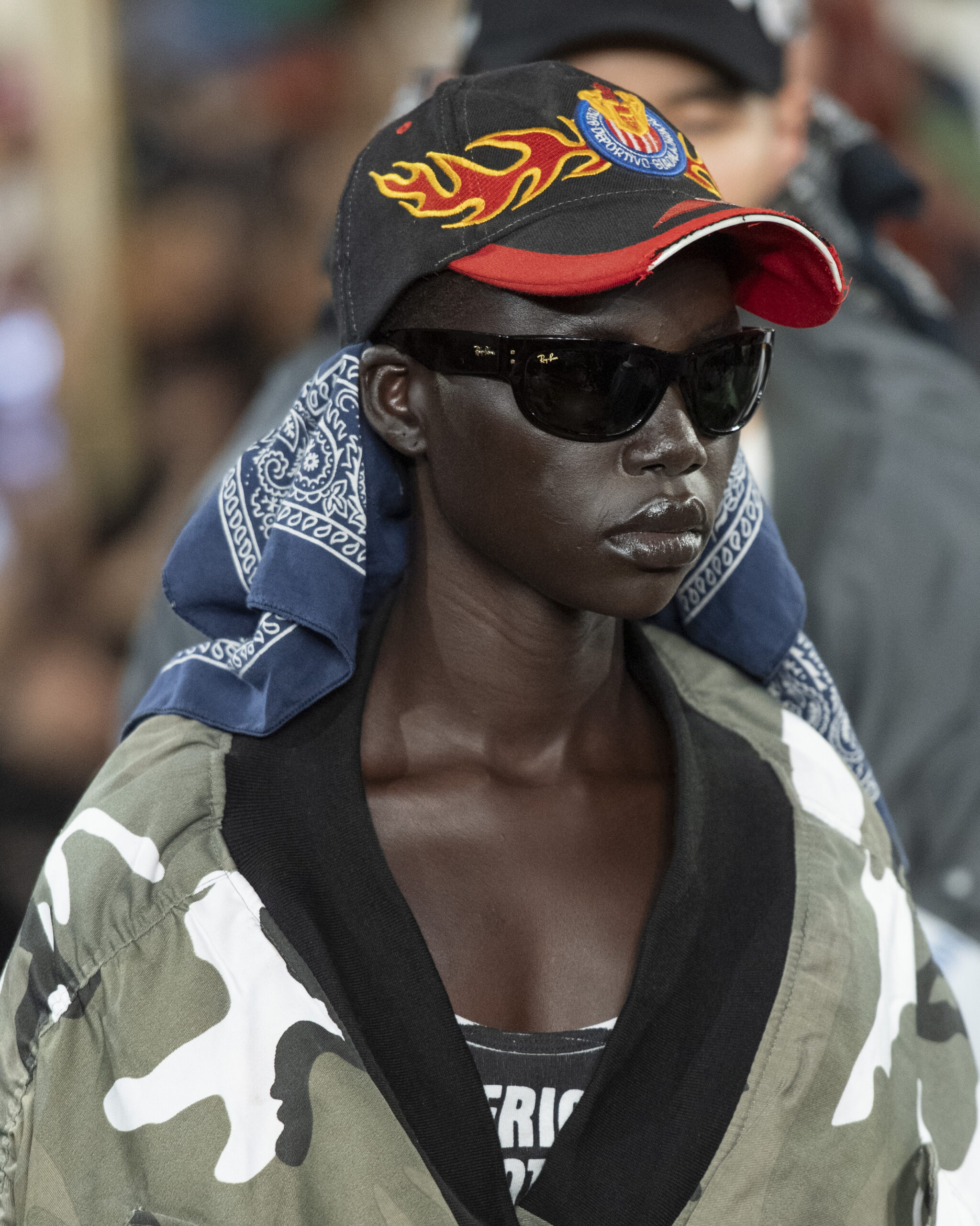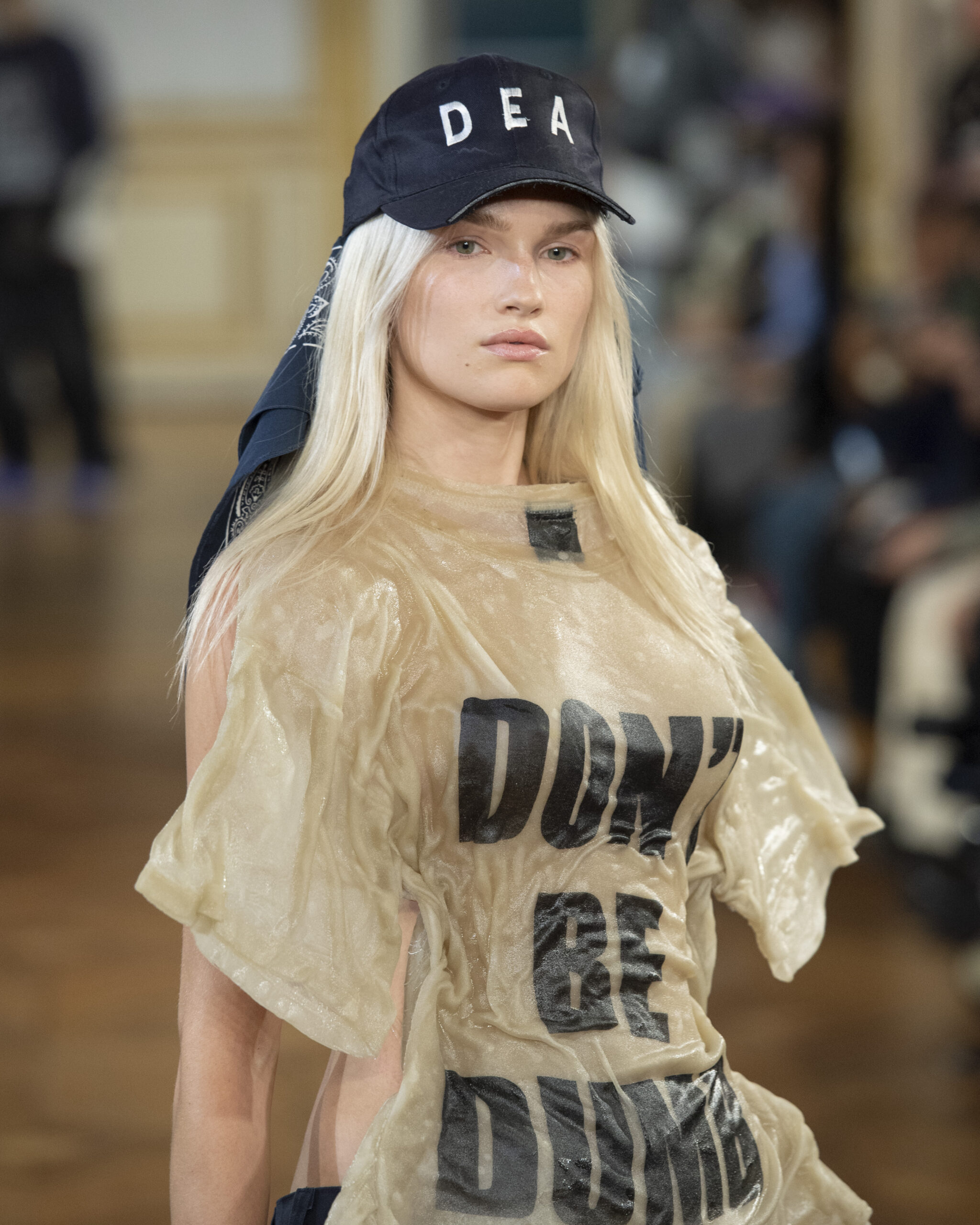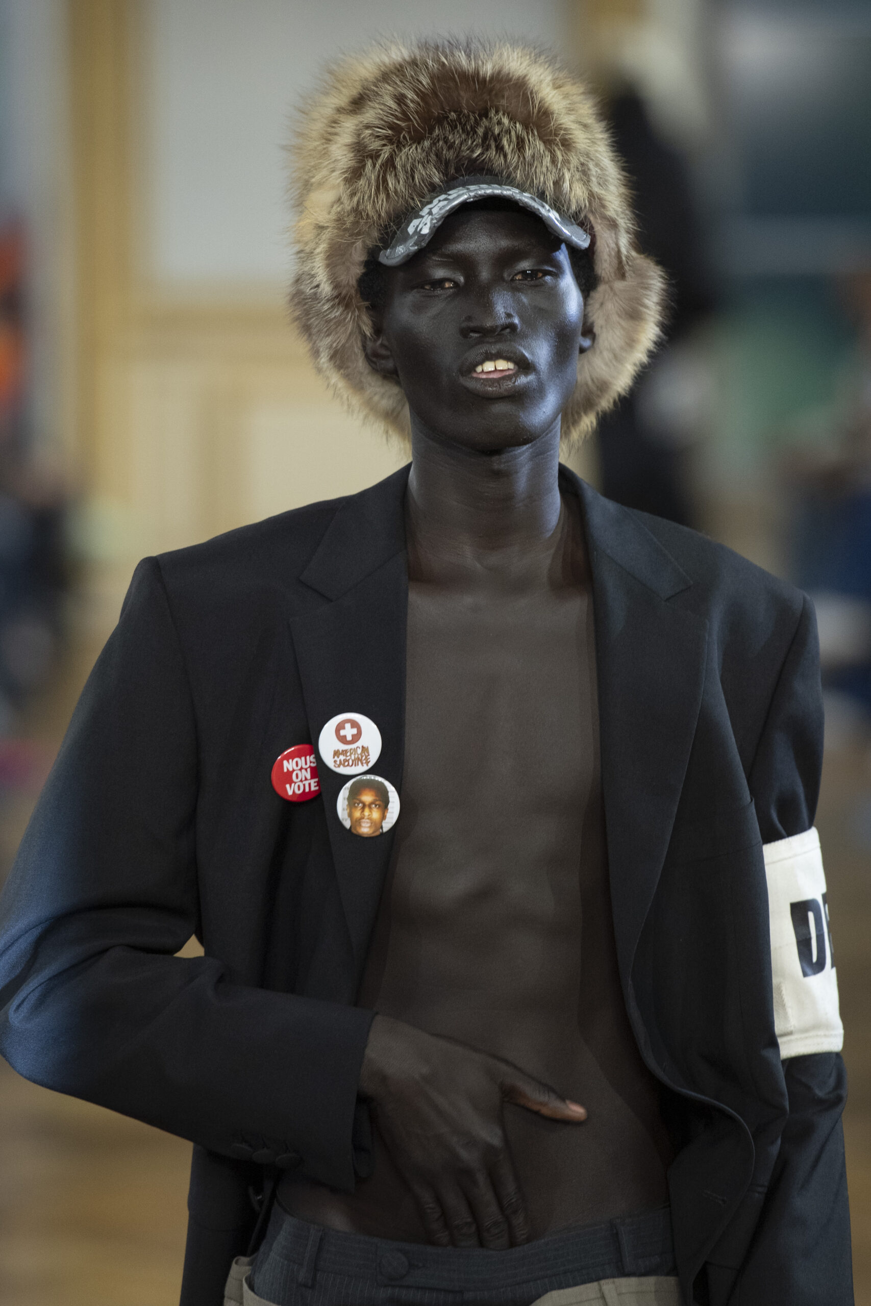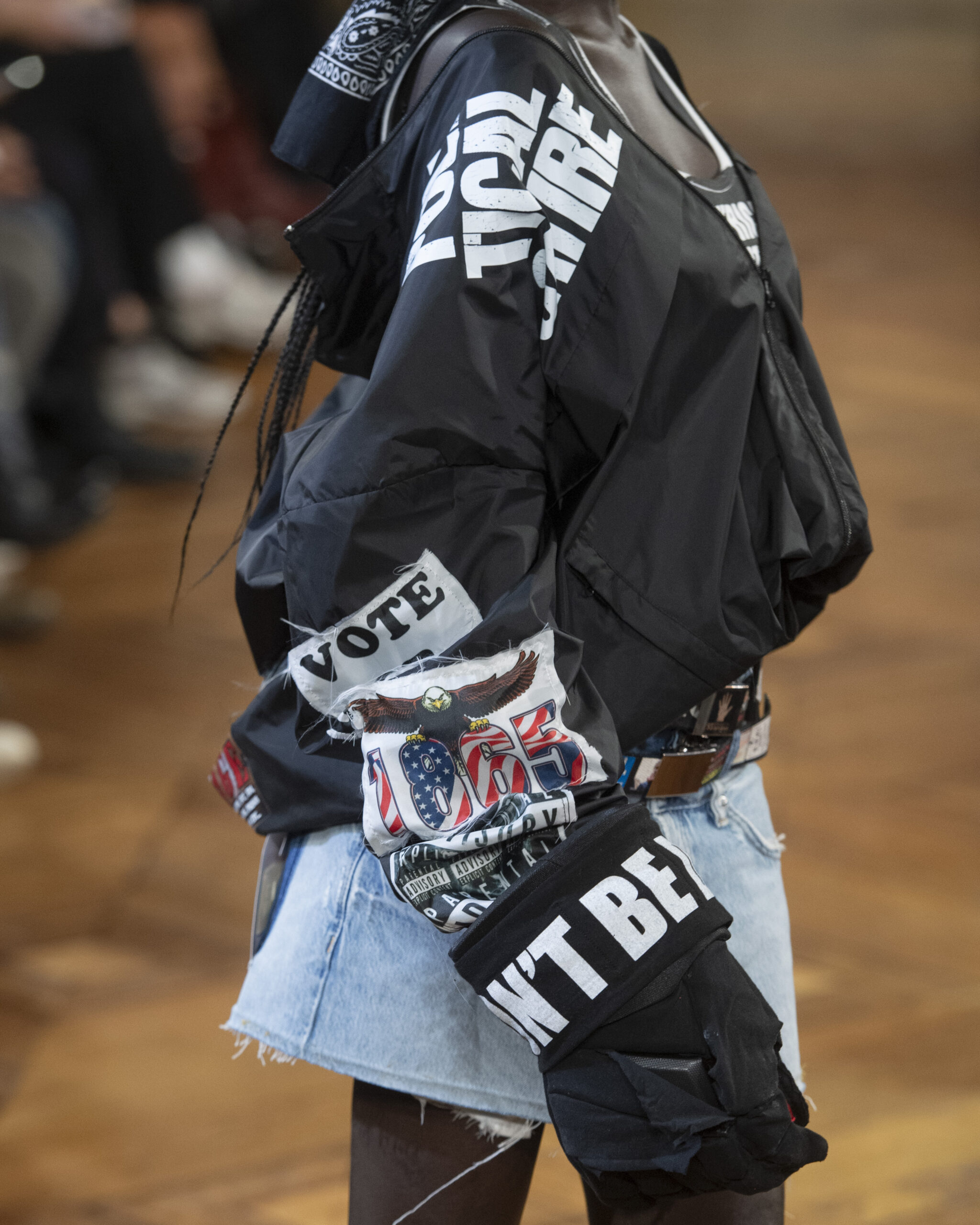 Le décor du défilé, comprenant des sacs poubelles transformés en chaises beanbag issues de la marque de mobilier Hommemade, en collaboration avec Crosby Studios, ajoutait une dimension immersive à cette expérience unique. Le défilé a été rythmé par la bande-son du prochain album d’A$AP Rocky, créant une synergie entre mode et musique.